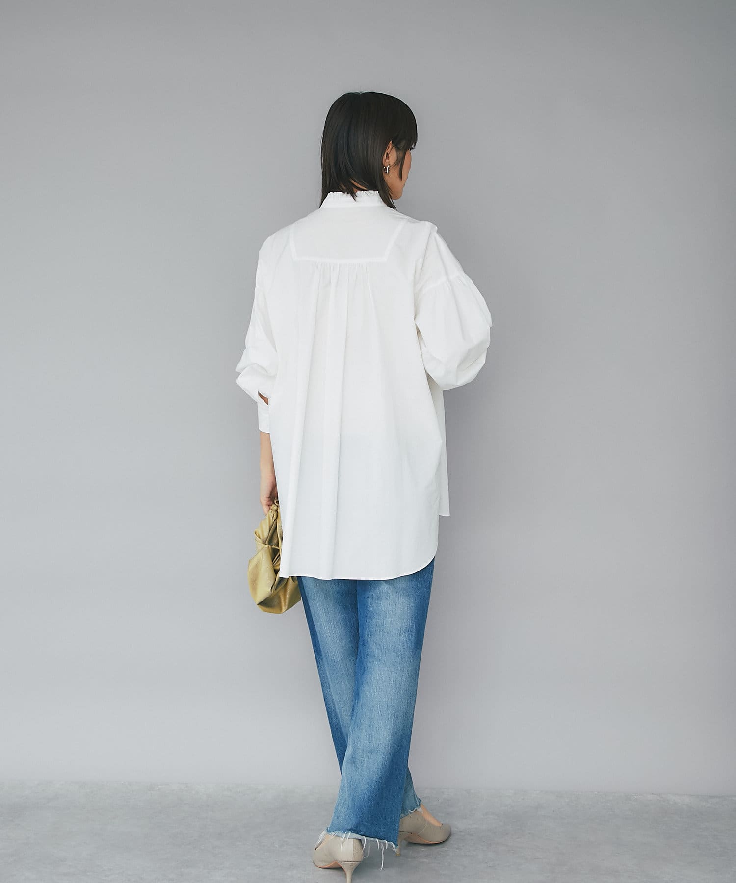 ギャザーをたっぷりあしらったスリーブは今季トレンドのベストとのレイヤードスタイルにも華やかさをプラスしてくれます。