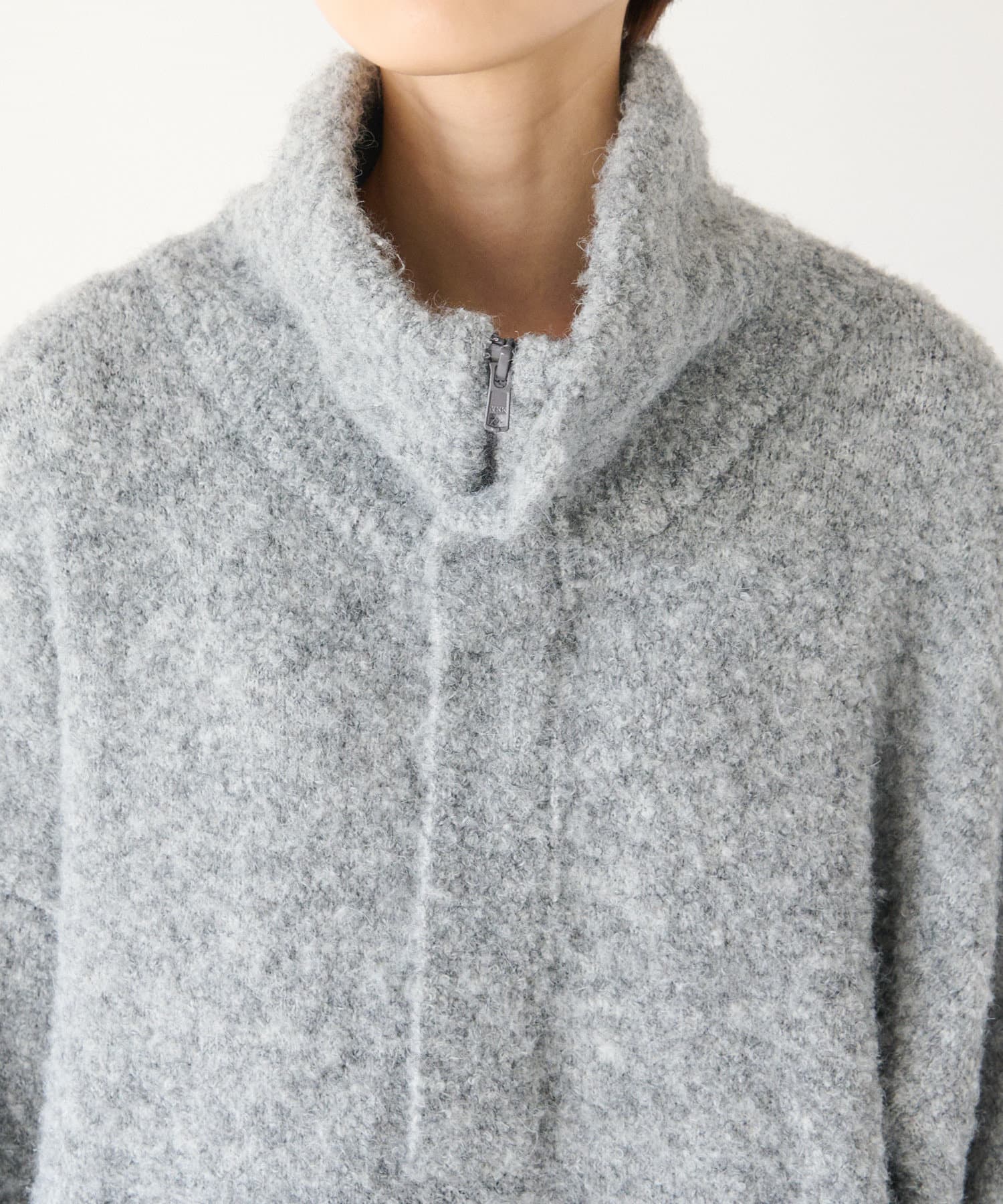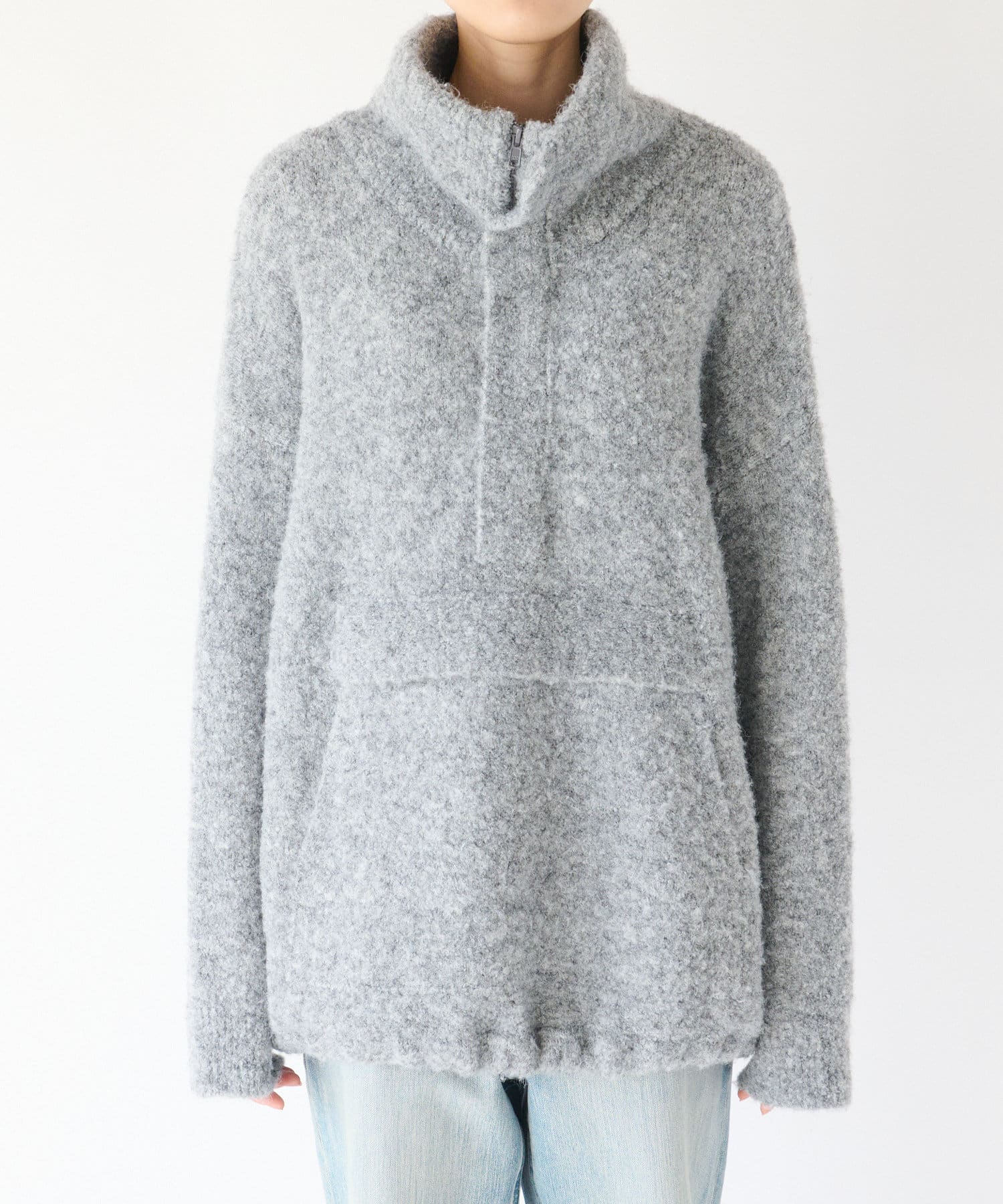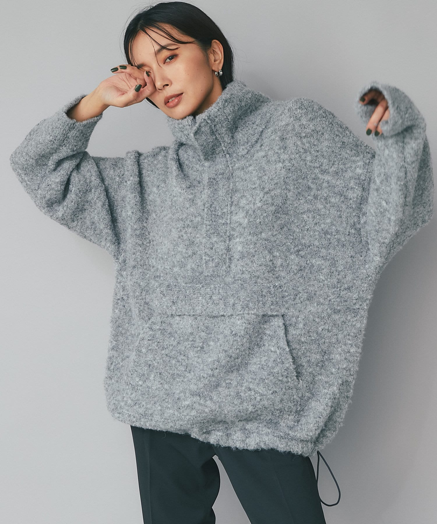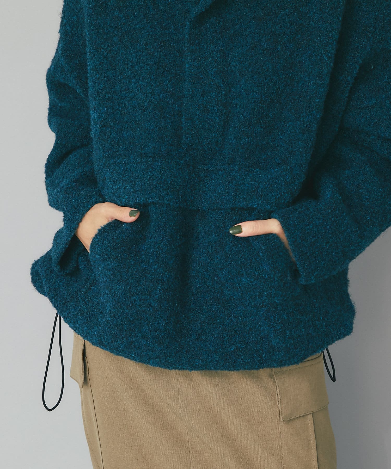 ミックスカラーのブークレーヤーンのクルクルとした素材感がシーズンムードを盛り上げてくれるプルオーバー。                                                                              クラフト感のある素材をオーバーサイズのアノラックにデザインしモードなアイテムに仕上げました。                                                                              ボリュームたっぷりのハーフジップ、BIGサイズのフロントポケット、ドローコード入りのヘムデザインなど本格的なアノラックのディティールを再現したトレンド感溢れる1着は、フィット感のあるタイトシルエットのボトムでメリハリの効いたバランスにまとめるのが今っぽく着こなすポイント。                                                                           メンズライクなカラーも女性らしさを引き立ててくれる、大人の為のニットです。                                                                                                                                 素材とシルエットにボリュームのあるアイテムなのでアウター感覚でも着用していただけます。