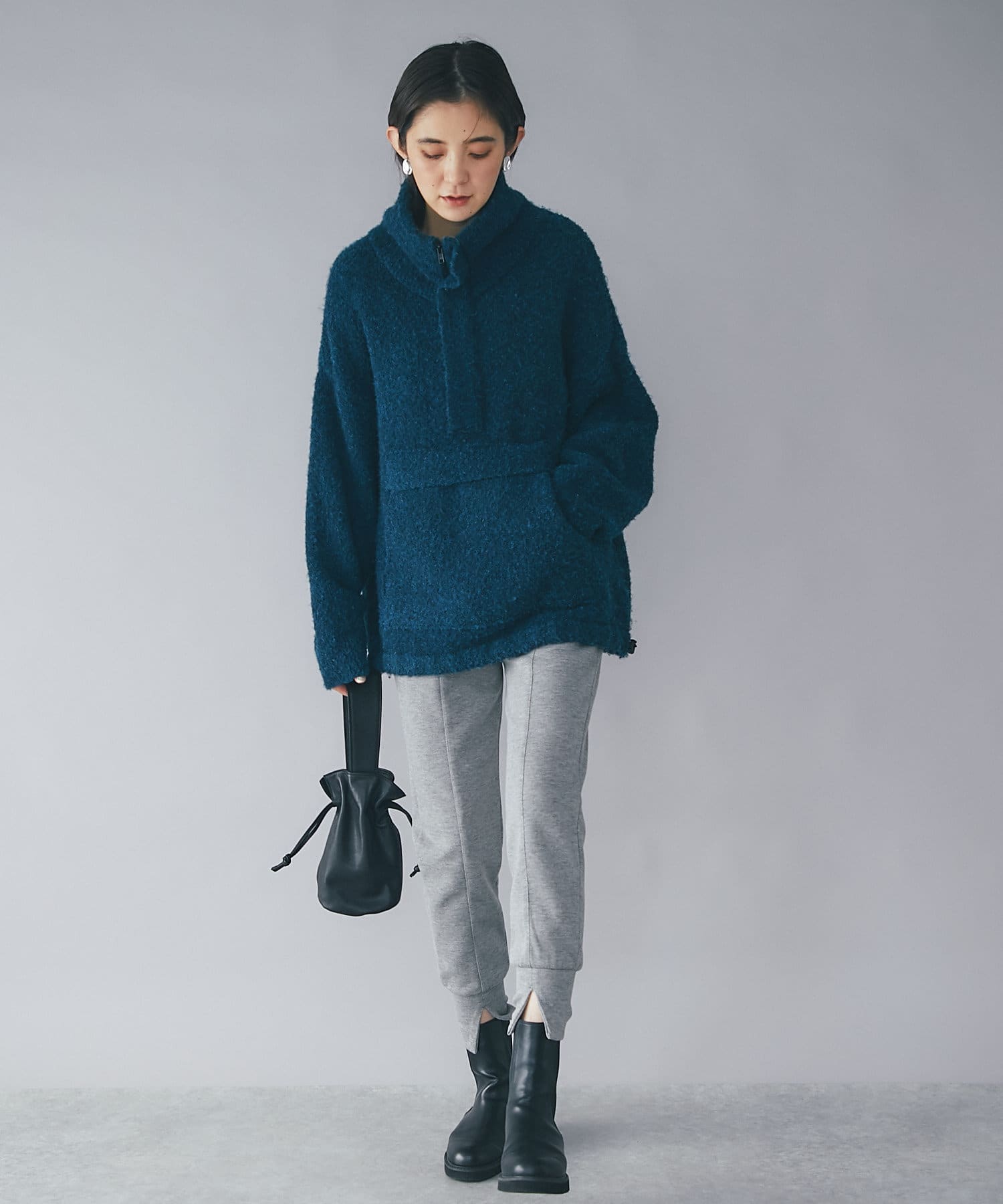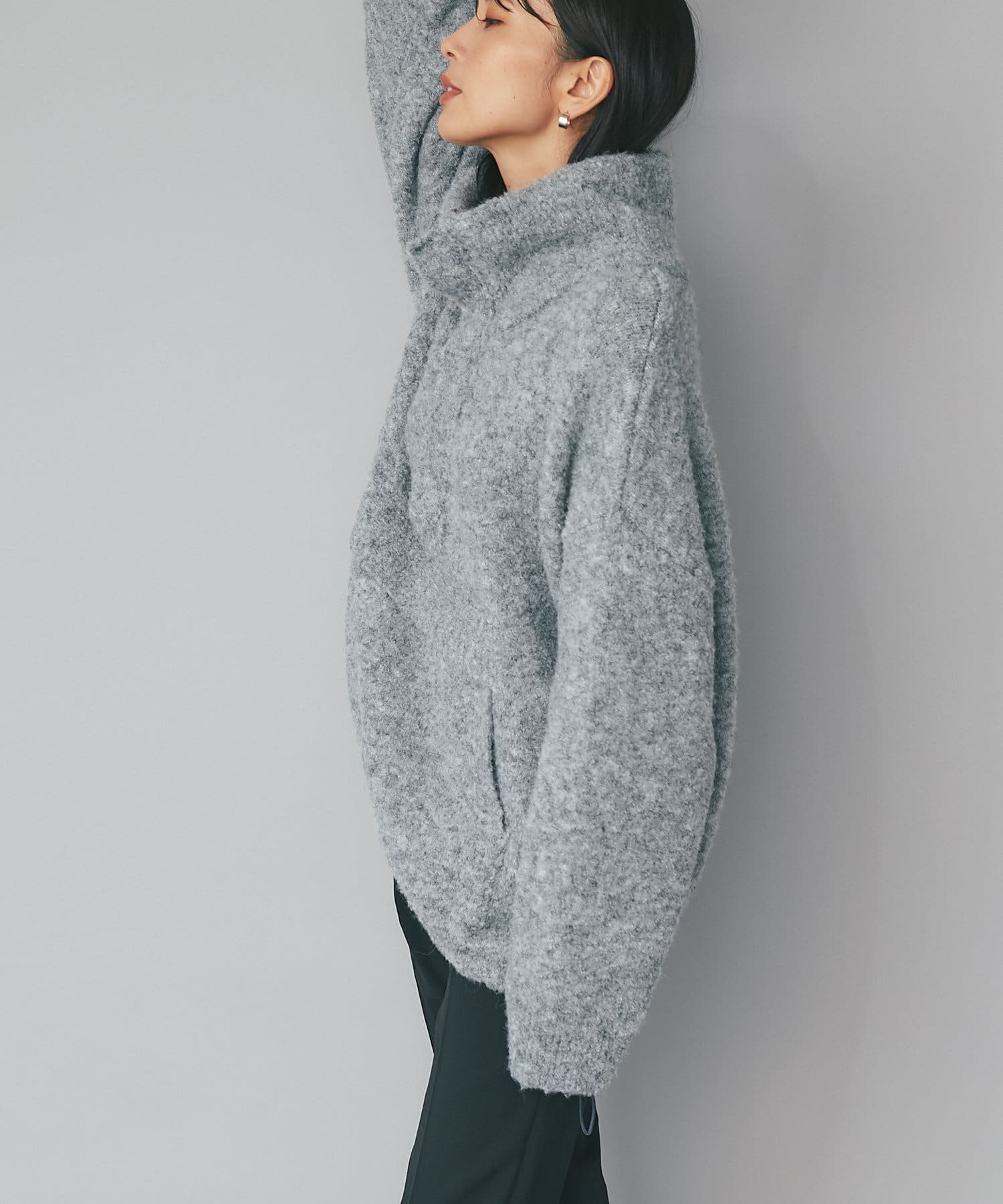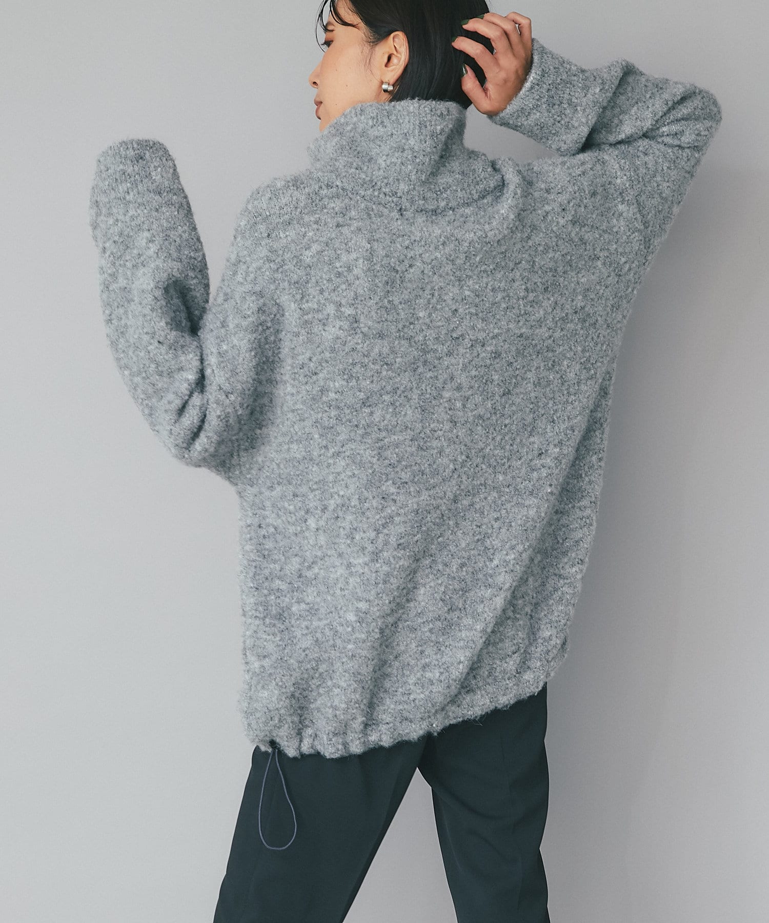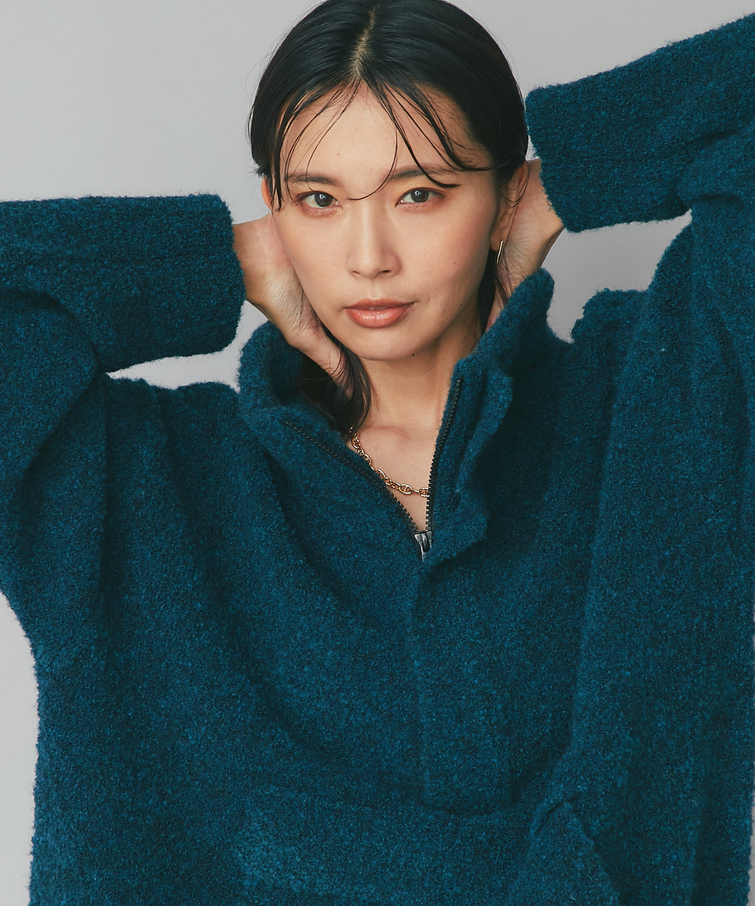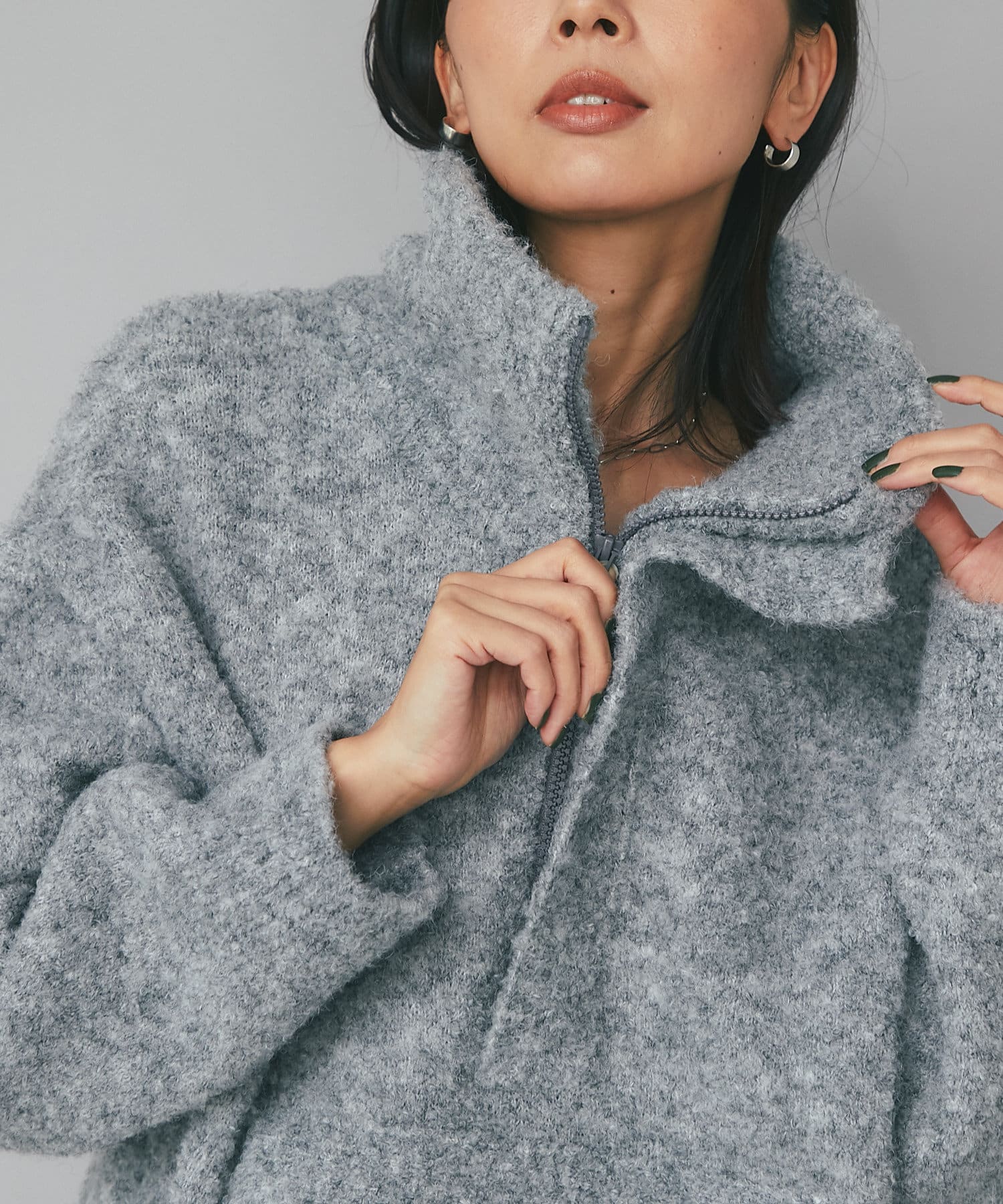 ミックスカラーのブークレーヤーンのクルクルとした素材感がシーズンムードを盛り上げてくれるプルオーバー。                                                                              クラフト感のある素材をオーバーサイズのアノラックにデザインしモードなアイテムに仕上げました。                                                                              ボリュームたっぷりのハーフジップ、BIGサイズのフロントポケット、ドローコード入りのヘムデザインなど本格的なアノラックのディティールを再現したトレンド感溢れる1着は、フィット感のあるタイトシルエットのボトムでメリハリの効いたバランスにまとめるのが今っぽく着こなすポイント。                                                                           メンズライクなカラーも女性らしさを引き立ててくれる、大人の為のニットです。                                                                                                                                 素材とシルエットにボリュームのあるアイテムなのでアウター感覚でも着用していただけます。