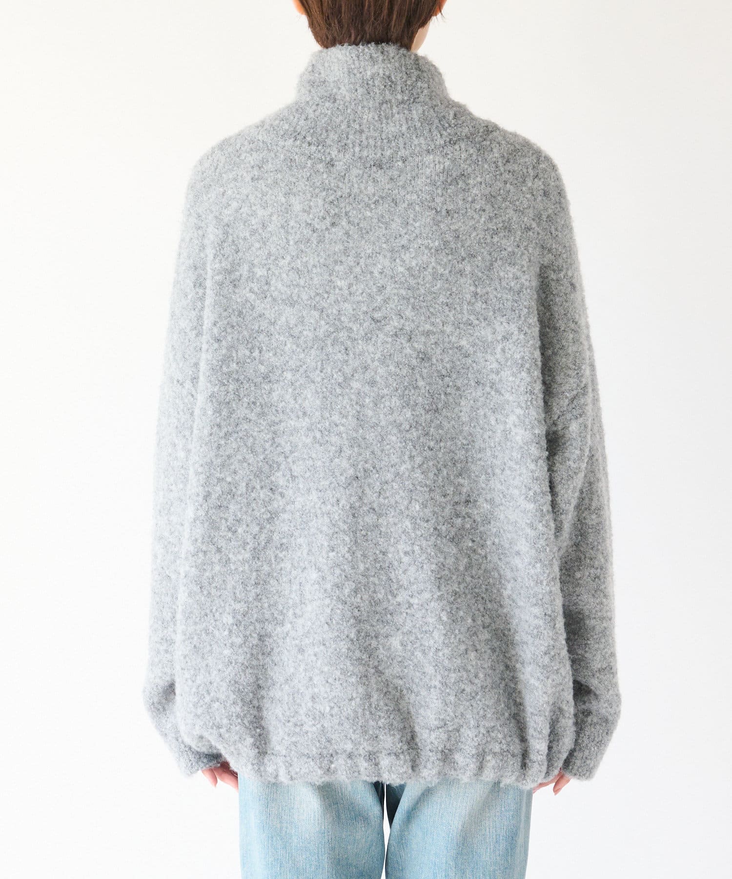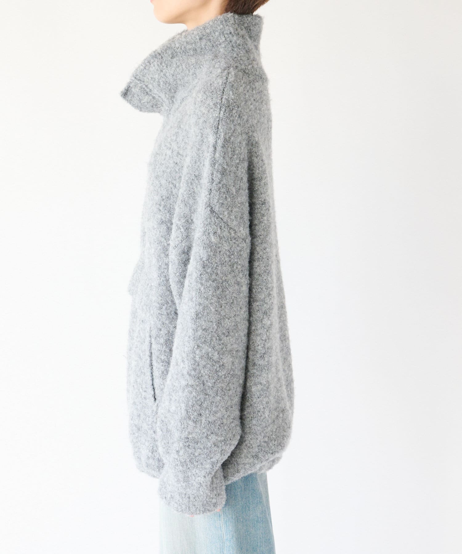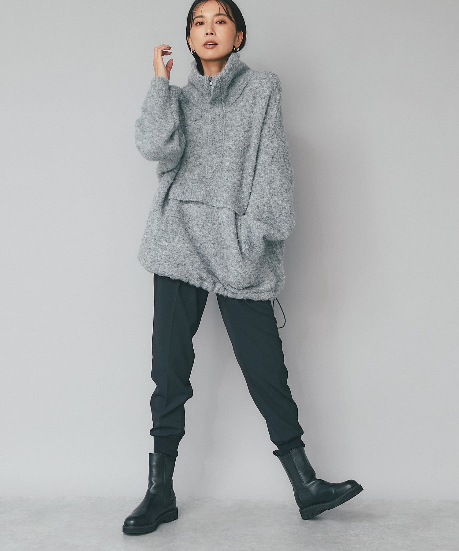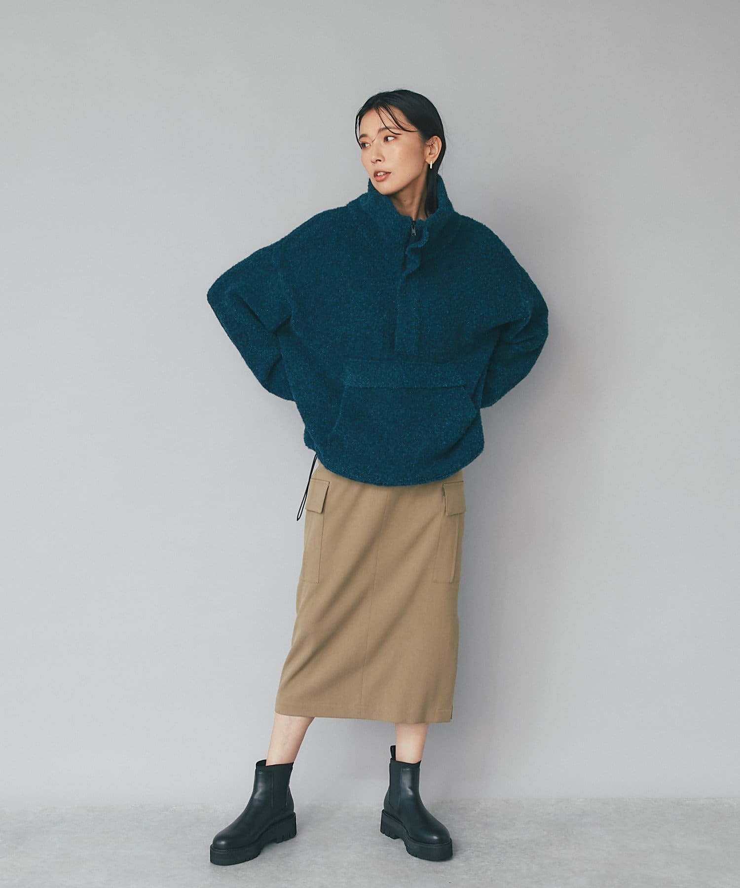 ミックスカラーのブークレーヤーンのクルクルとした素材感がシーズンムードを盛り上げてくれるプルオーバー。                                                                              クラフト感のある素材をオーバーサイズのアノラックにデザインしモードなアイテムに仕上げました。                                                                              ボリュームたっぷりのハーフジップ、BIGサイズのフロントポケット、ドローコード入りのヘムデザインなど本格的なアノラックのディティールを再現したトレンド感溢れる1着は、フィット感のあるタイトシルエットのボトムでメリハリの効いたバランスにまとめるのが今っぽく着こなすポイント。                                                                           メンズライクなカラーも女性らしさを引き立ててくれる、大人の為のニットです。                                                                                                                                 素材とシルエットにボリュームのあるアイテムなのでアウター感覚でも着用していただけます。