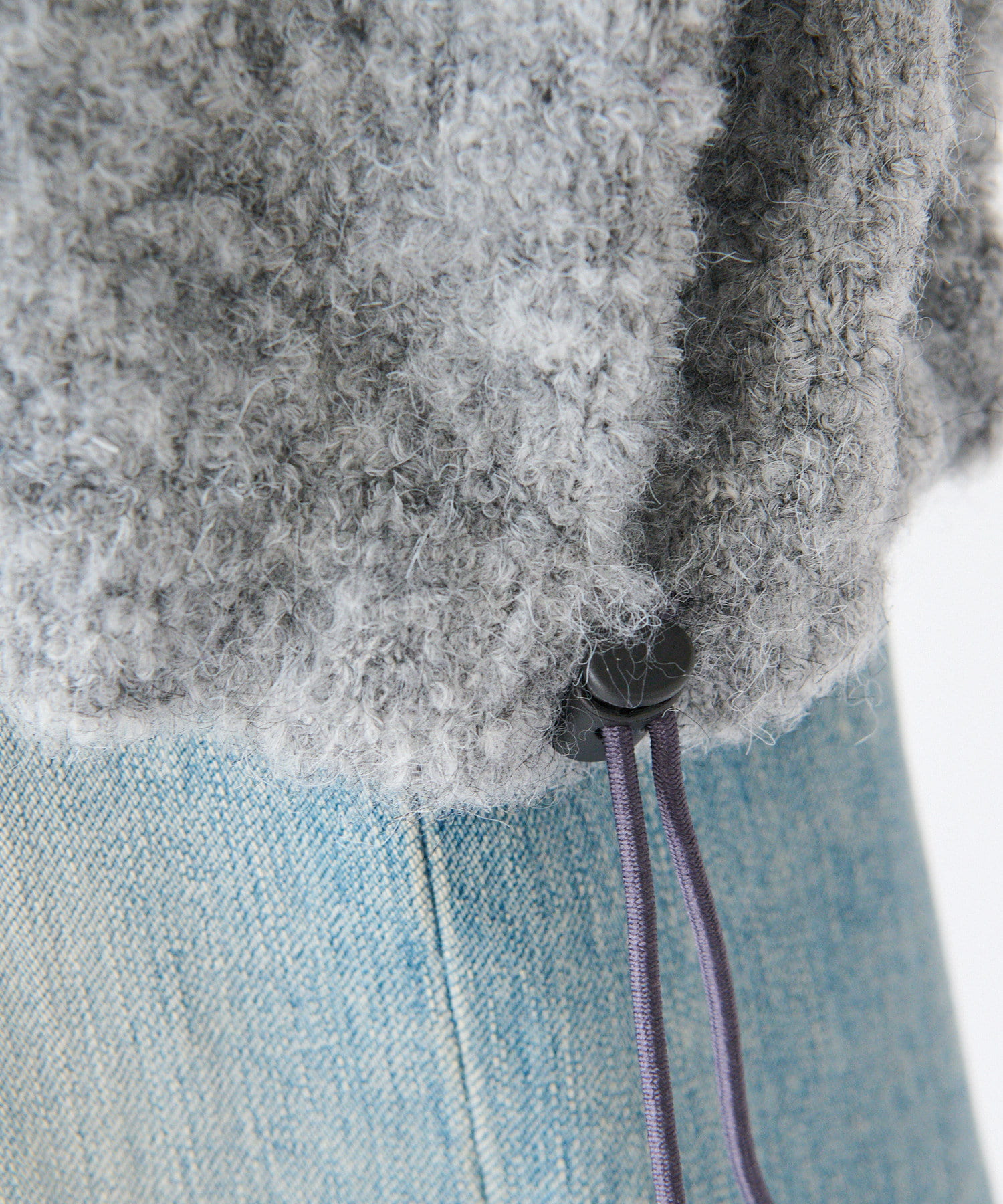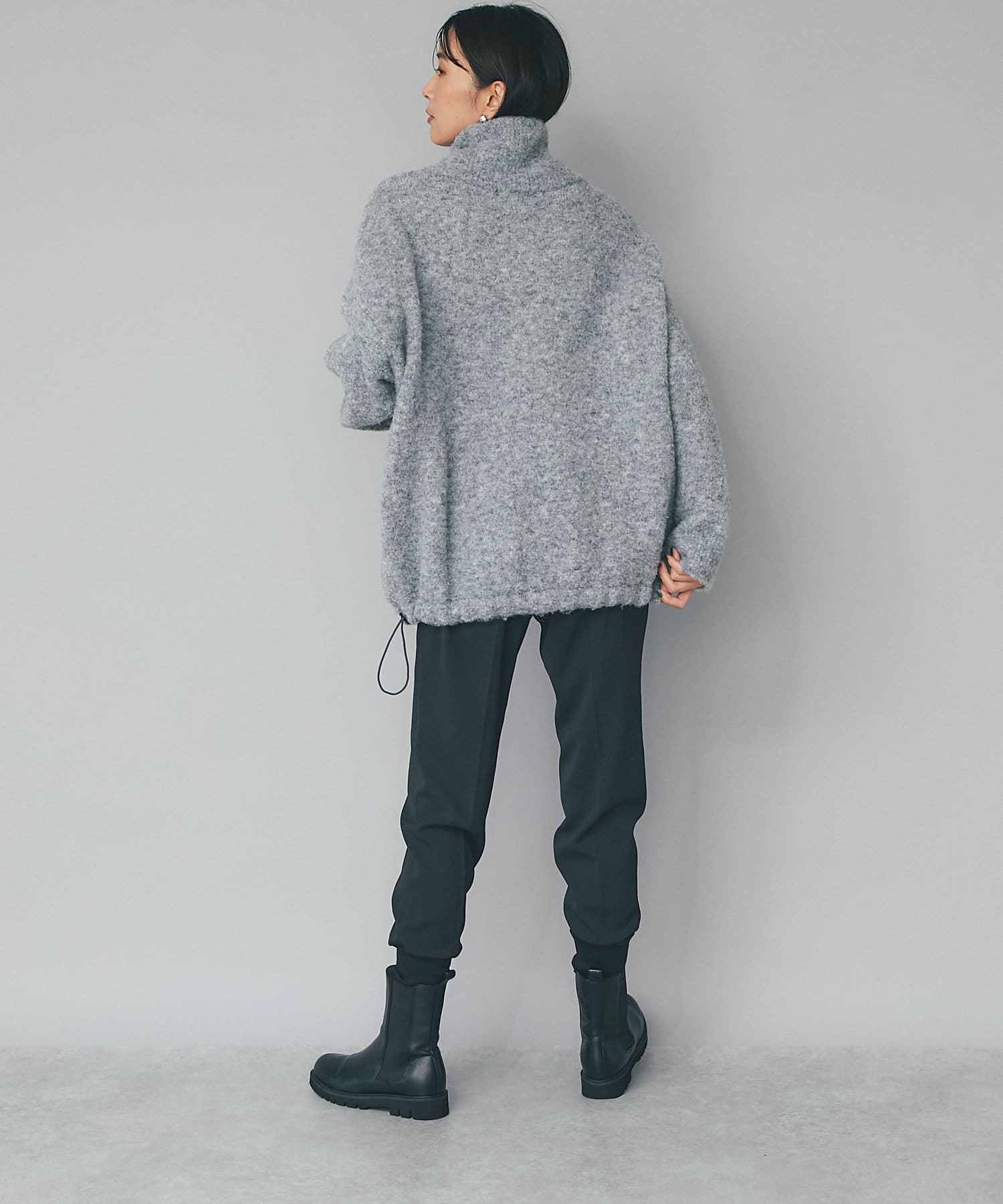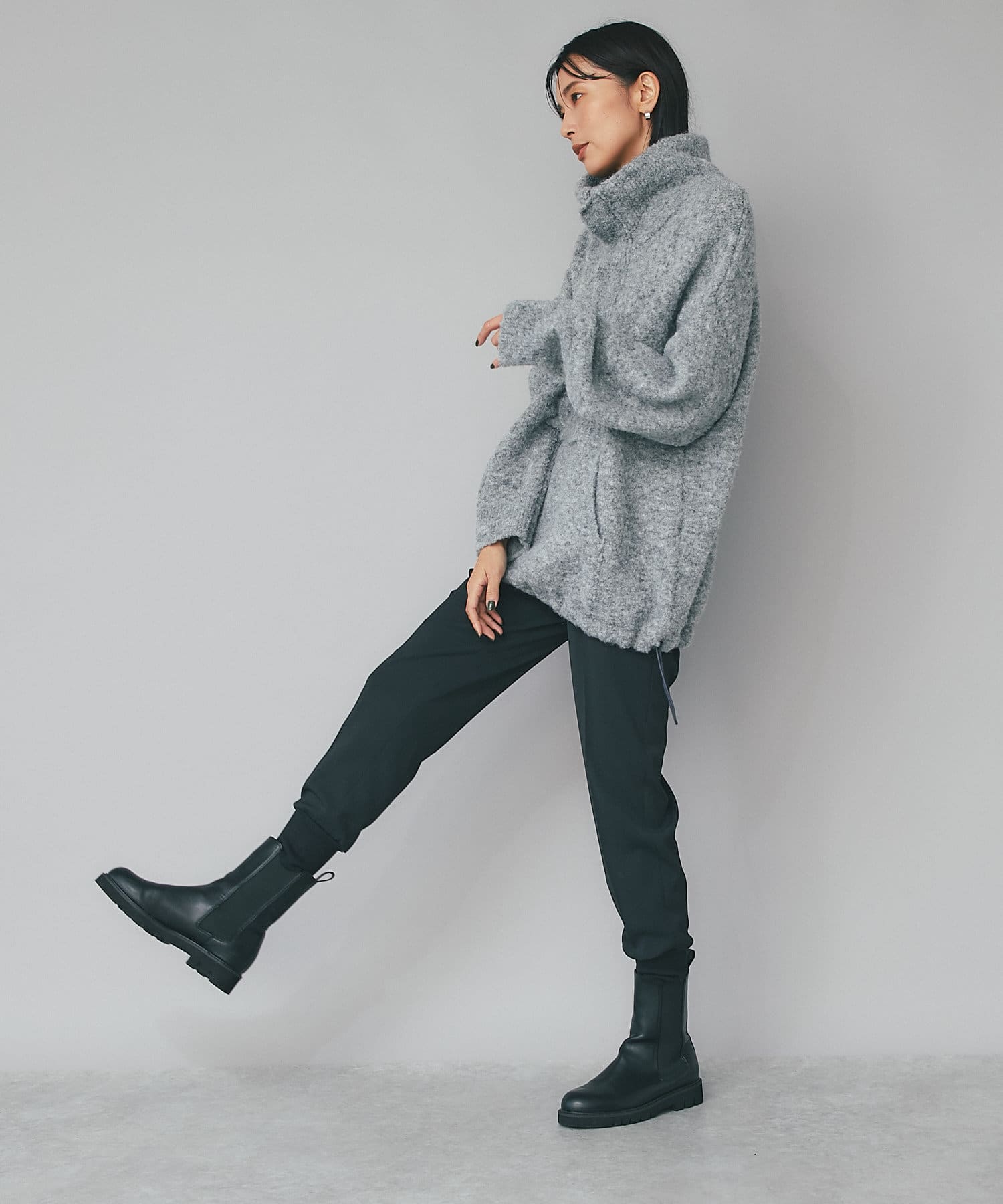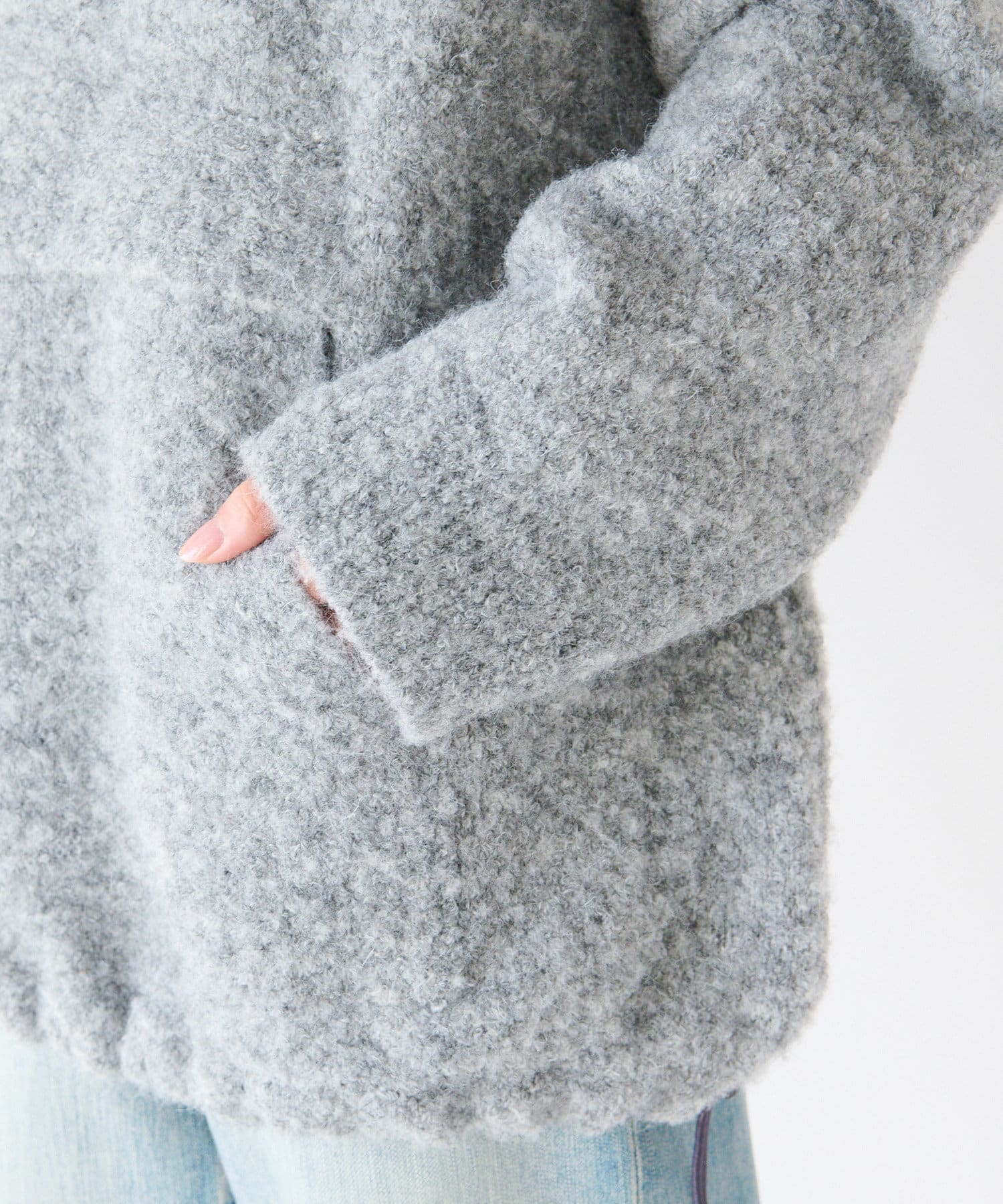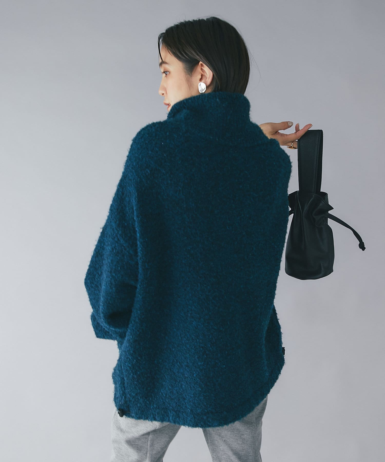 ミックスカラーのブークレーヤーンのクルクルとした素材感がシーズンムードを盛り上げてくれるプルオーバー。                                                                              クラフト感のある素材をオーバーサイズのアノラックにデザインしモードなアイテムに仕上げました。                                                                              ボリュームたっぷりのハーフジップ、BIGサイズのフロントポケット、ドローコード入りのヘムデザインなど本格的なアノラックのディティールを再現したトレンド感溢れる1着は、フィット感のあるタイトシルエットのボトムでメリハリの効いたバランスにまとめるのが今っぽく着こなすポイント。                                                                           メンズライクなカラーも女性らしさを引き立ててくれる、大人の為のニットです。                                                                                                                                 素材とシルエットにボリュームのあるアイテムなのでアウター感覚でも着用していただけます。