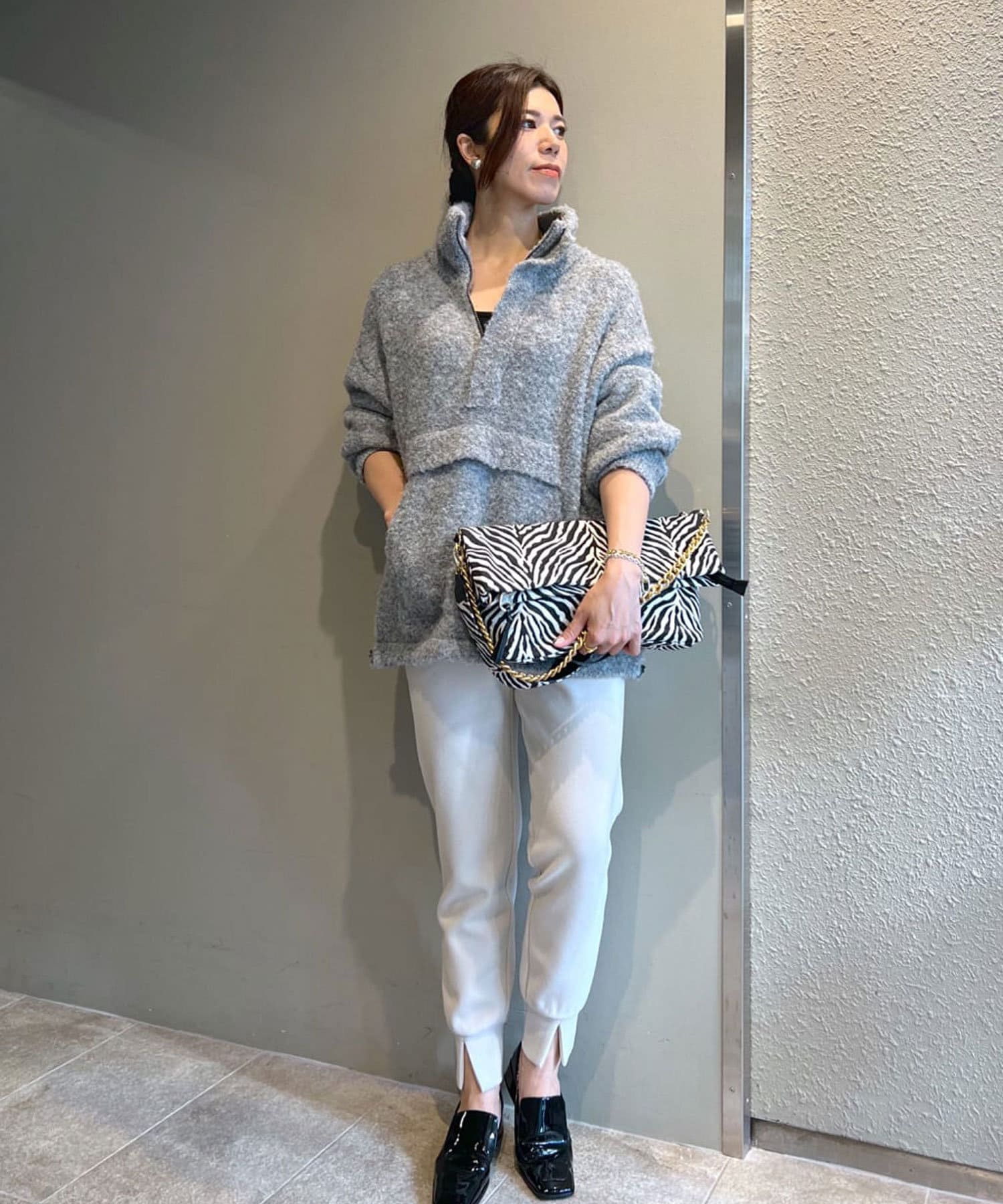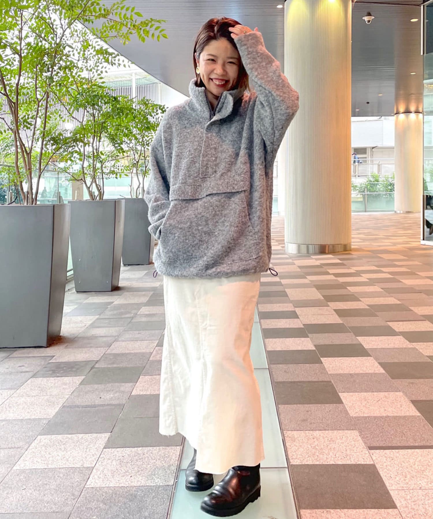 ボリューム感のあるアイテムですが、顔まわりや袖のたくし上げなどちょっとしたヘルシーな肌見せで簡単に抜け感を演出できます。