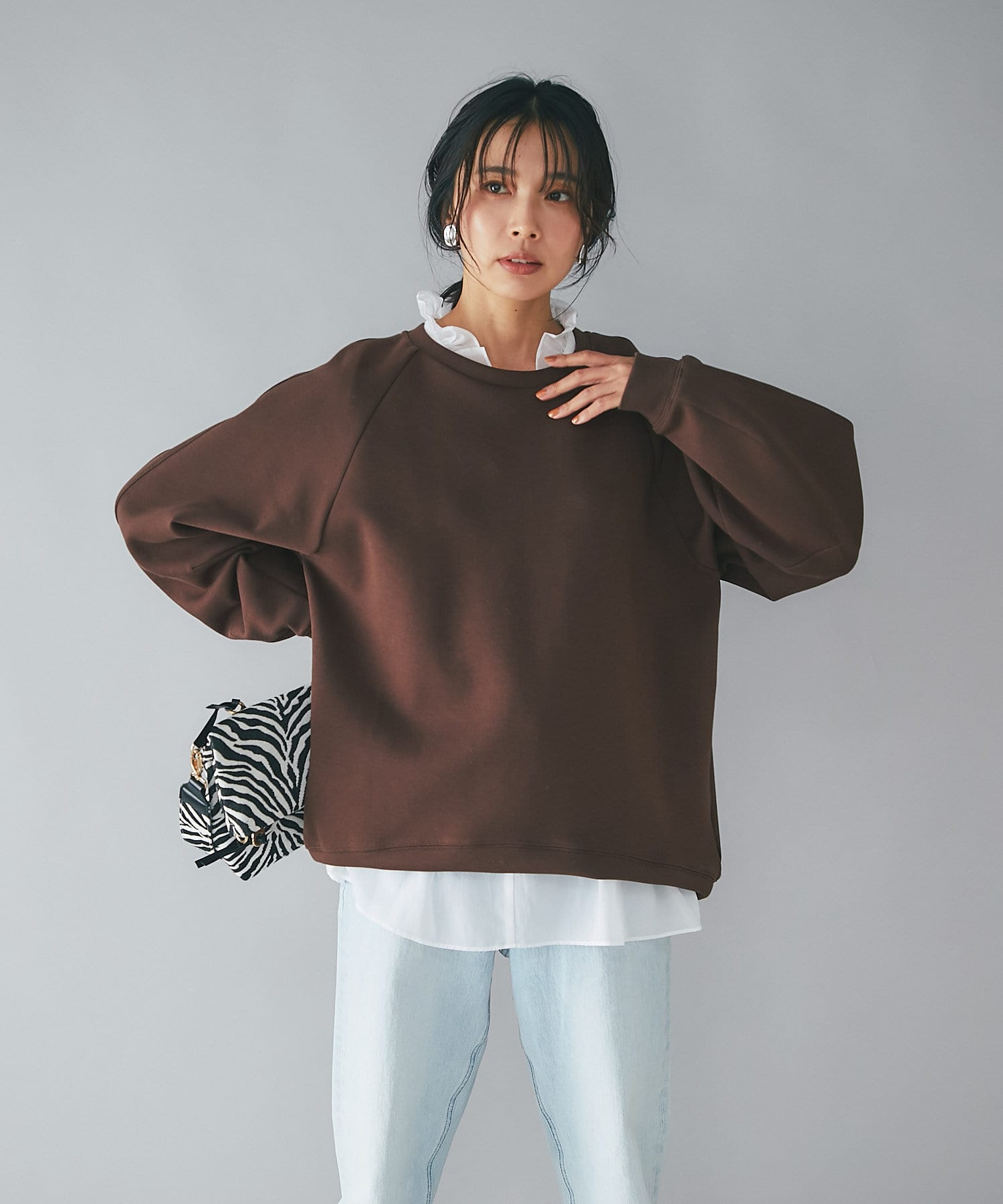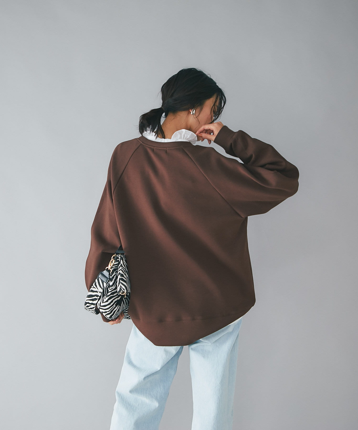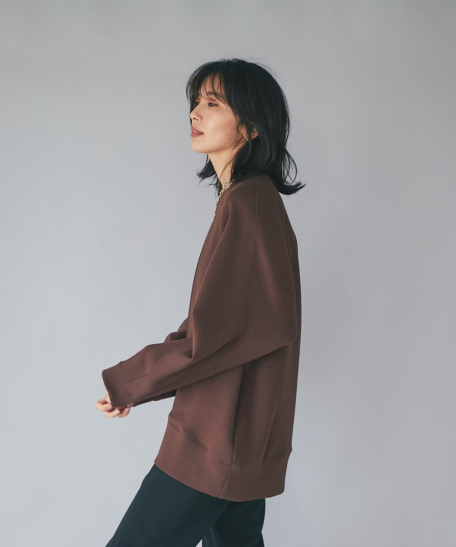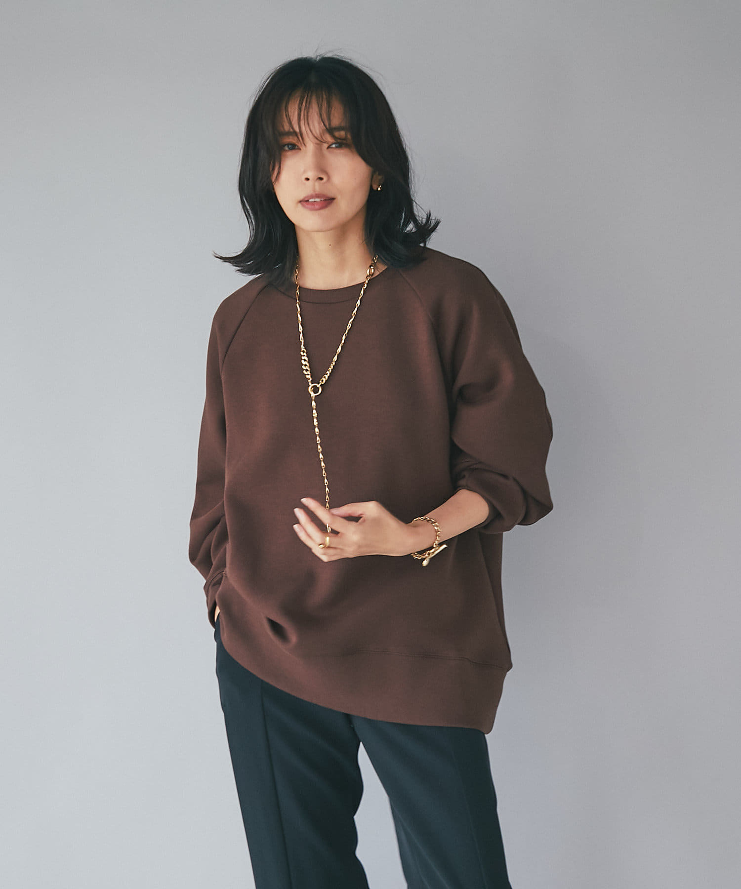 肩の丸みが出るラグランスリーブで、メンズライクながらも女性らしく着こなせます。