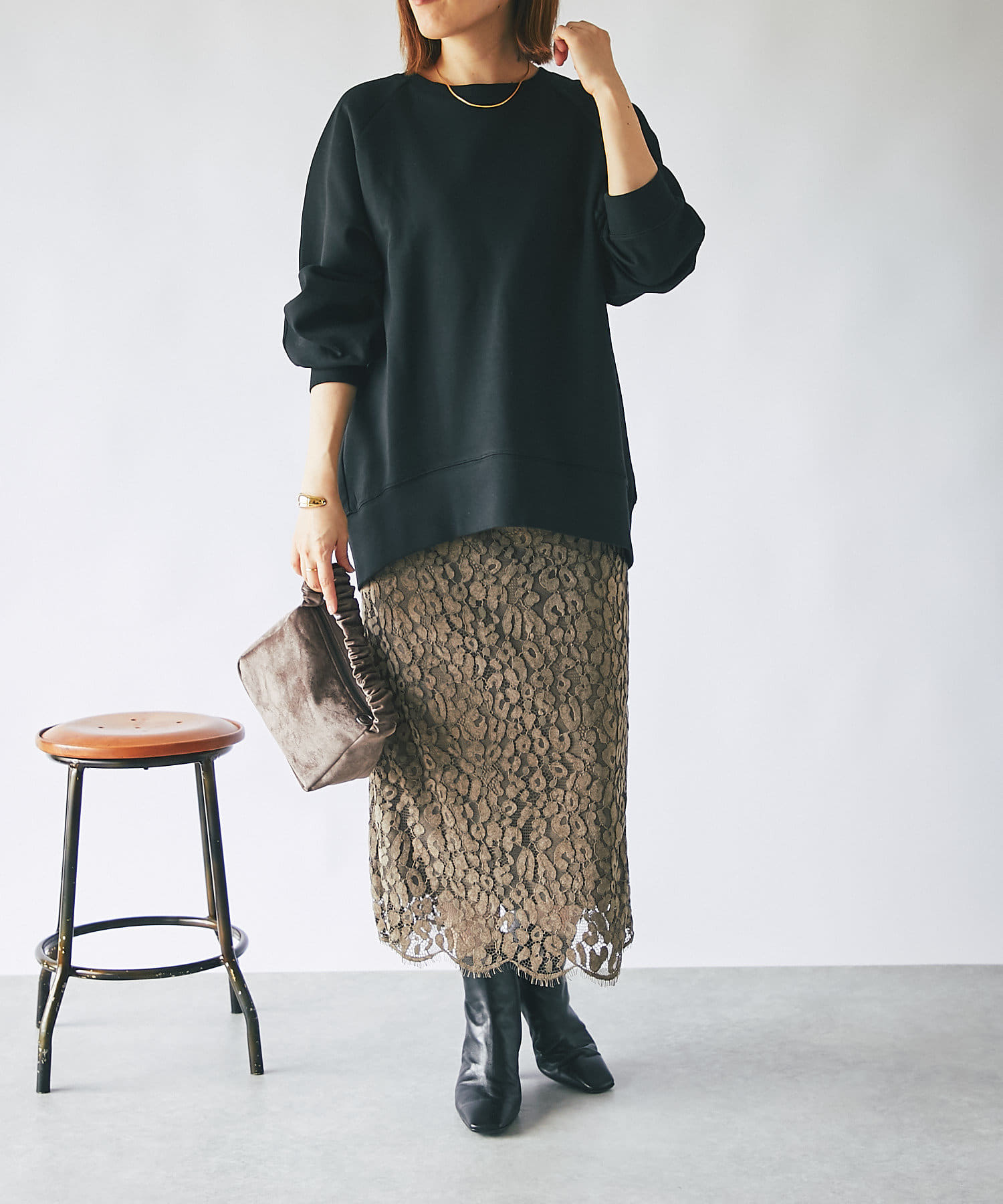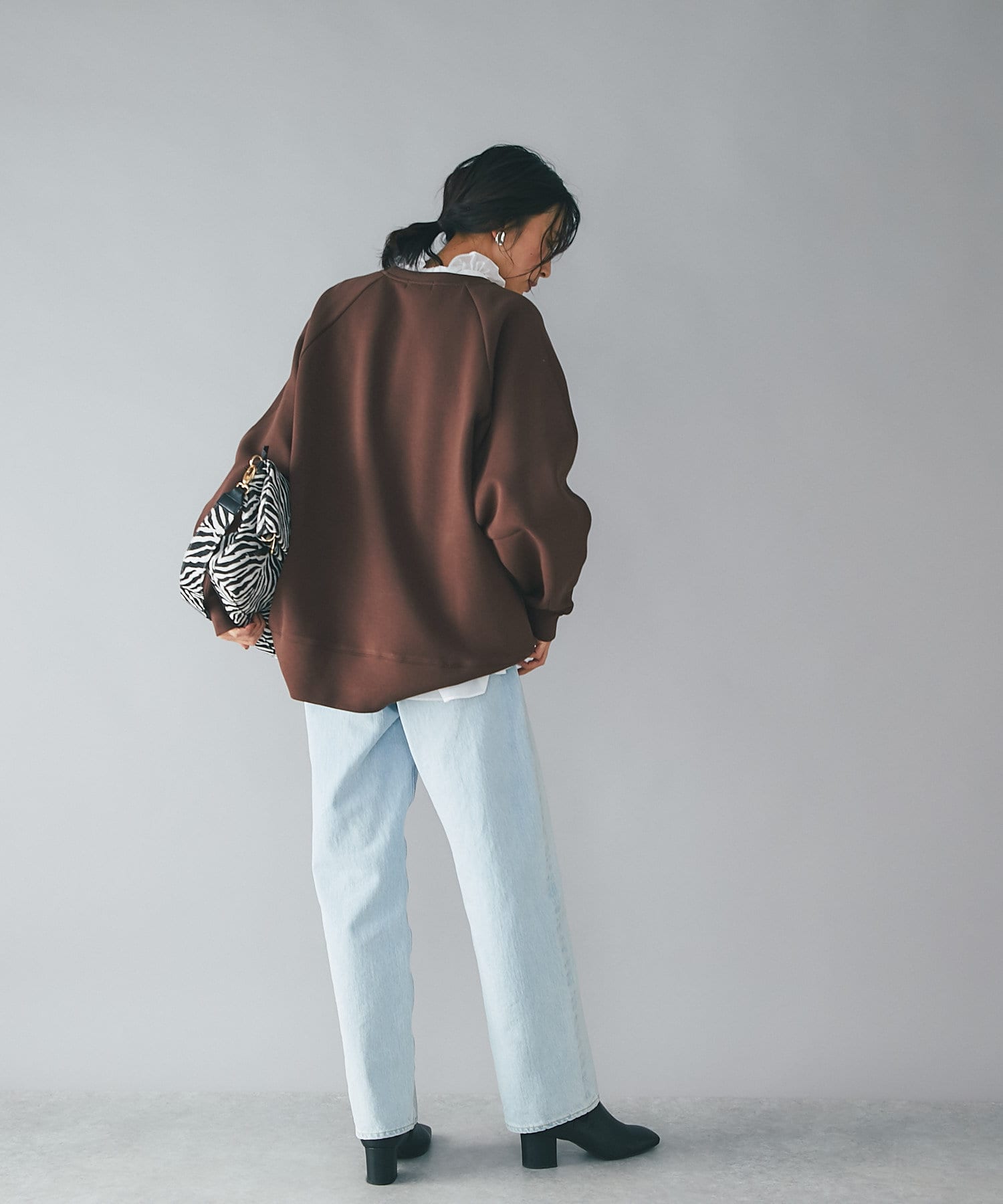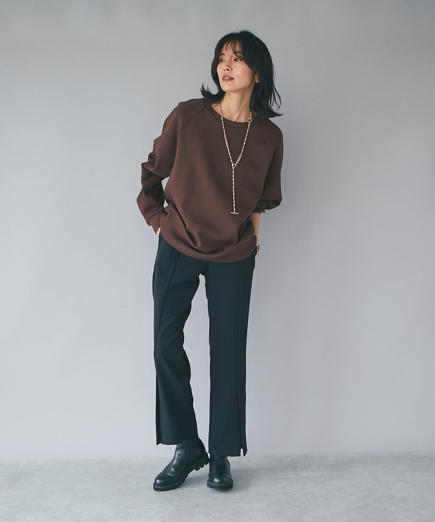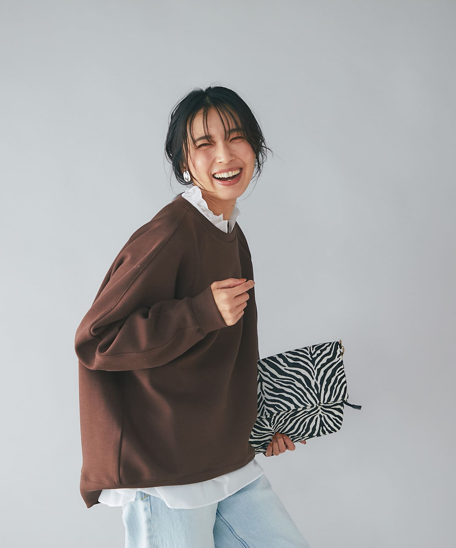 肩の丸みが出るラグランスリーブで、メンズライクながらも女性らしく着こなせます。