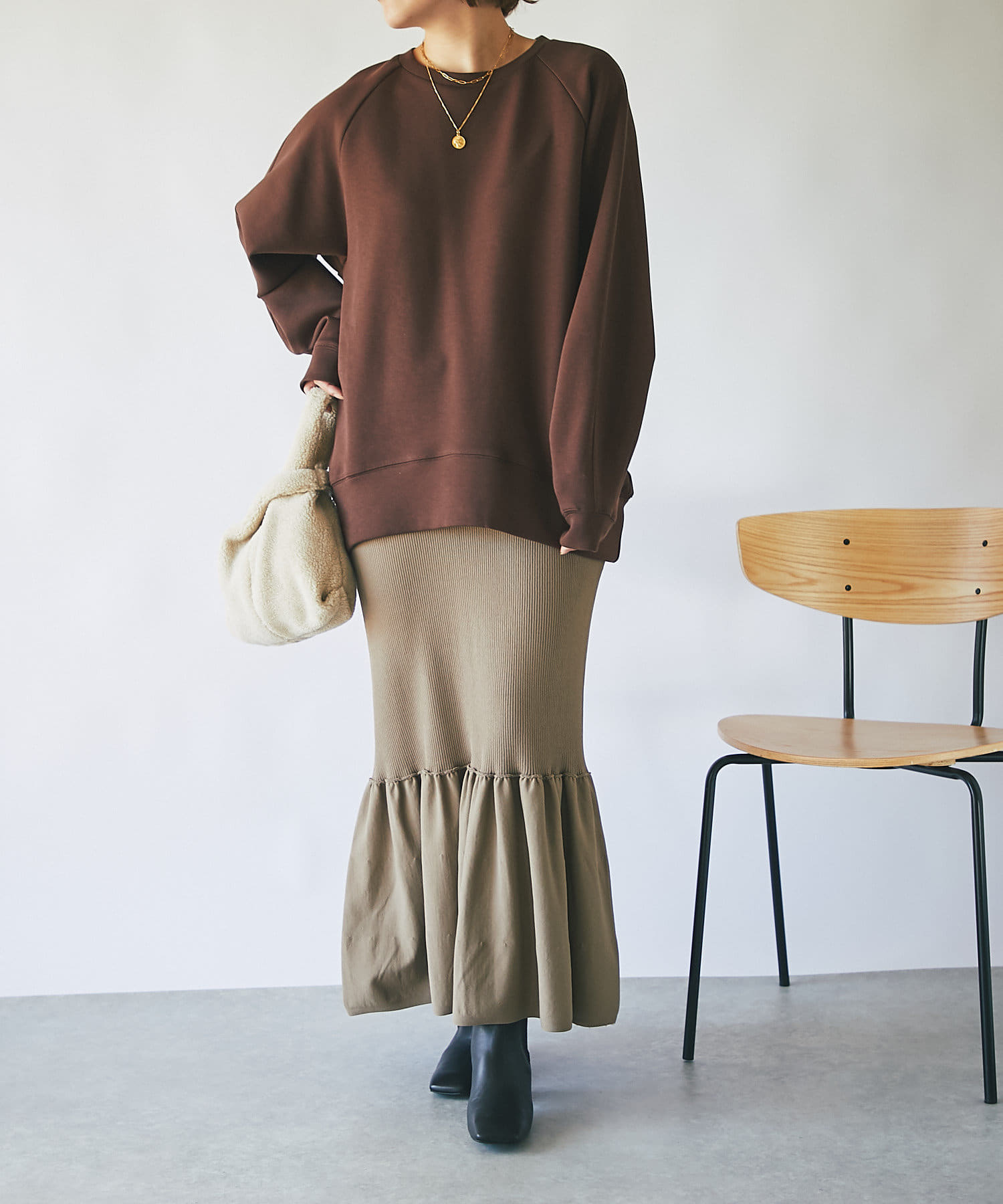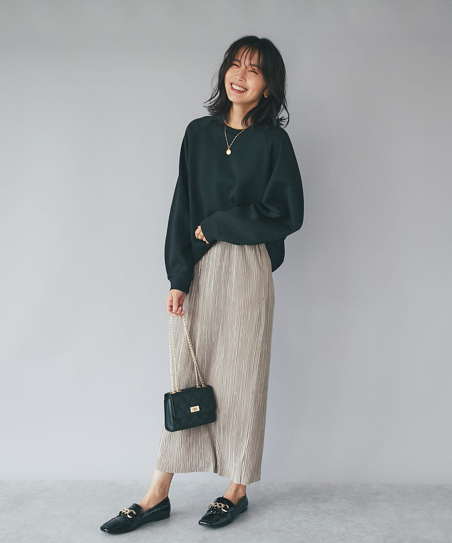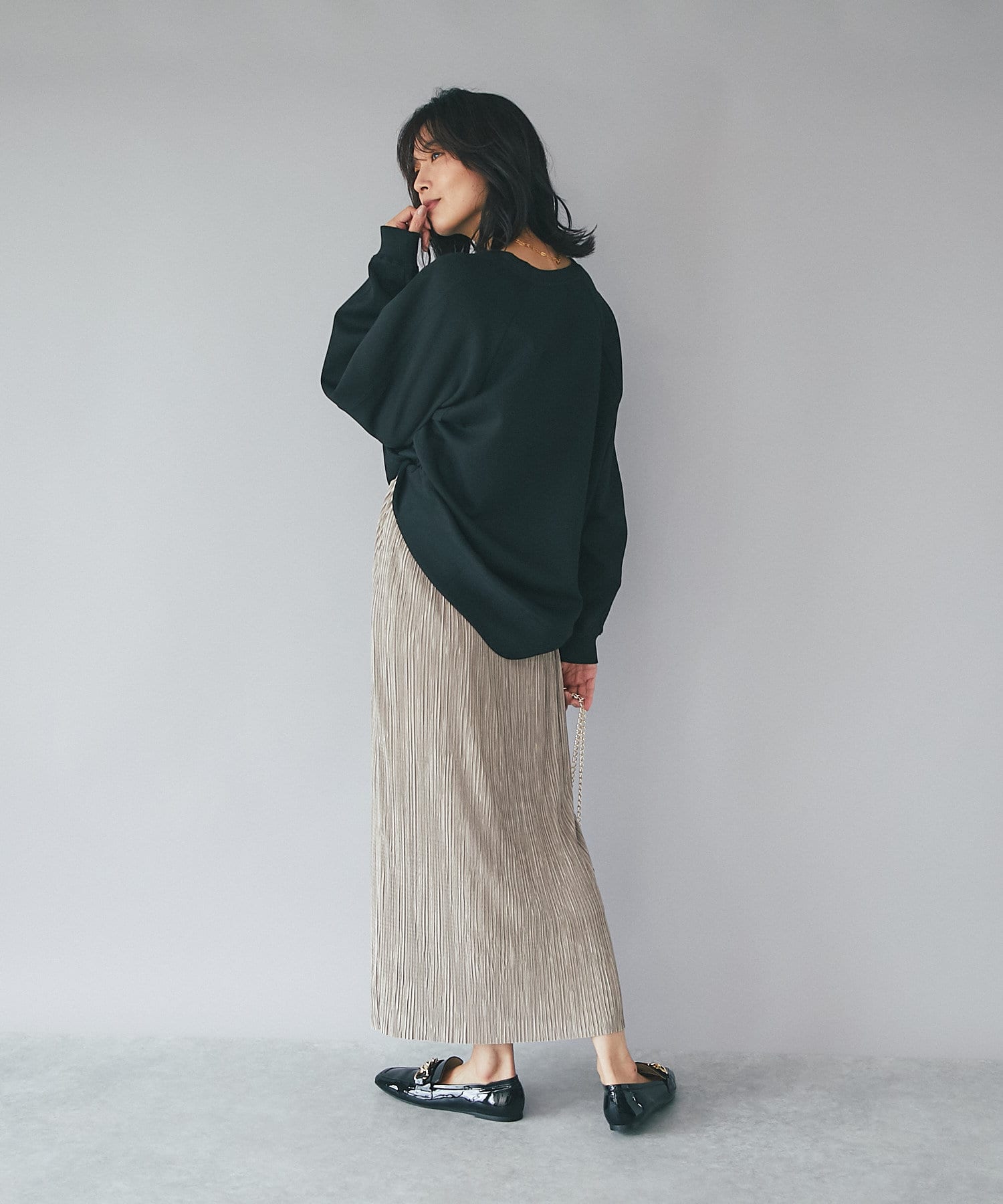 マキシスカートと合わせたルーズなコーディネートも女性らしい着こなしに仕上がります◎