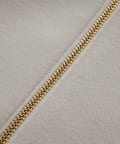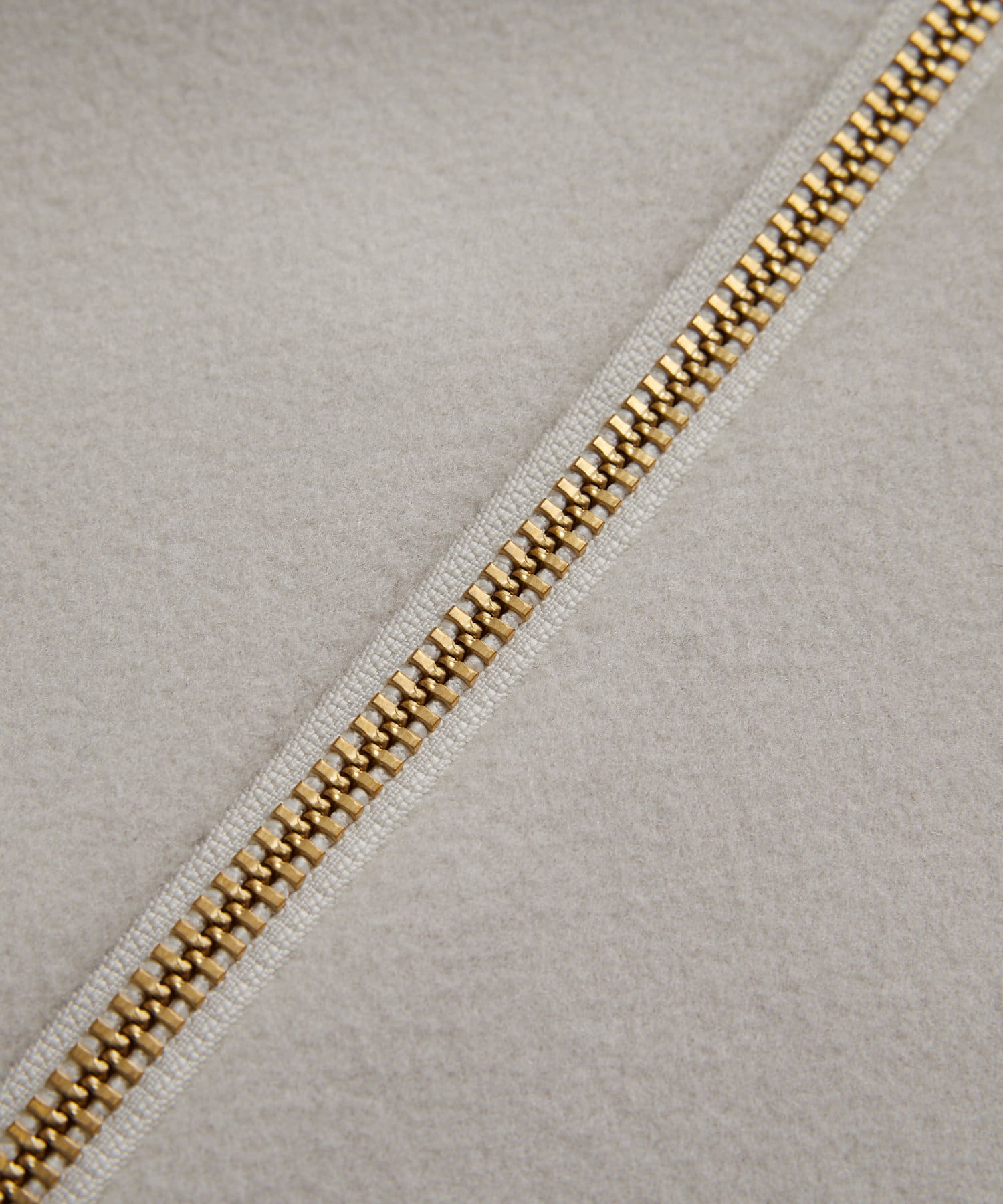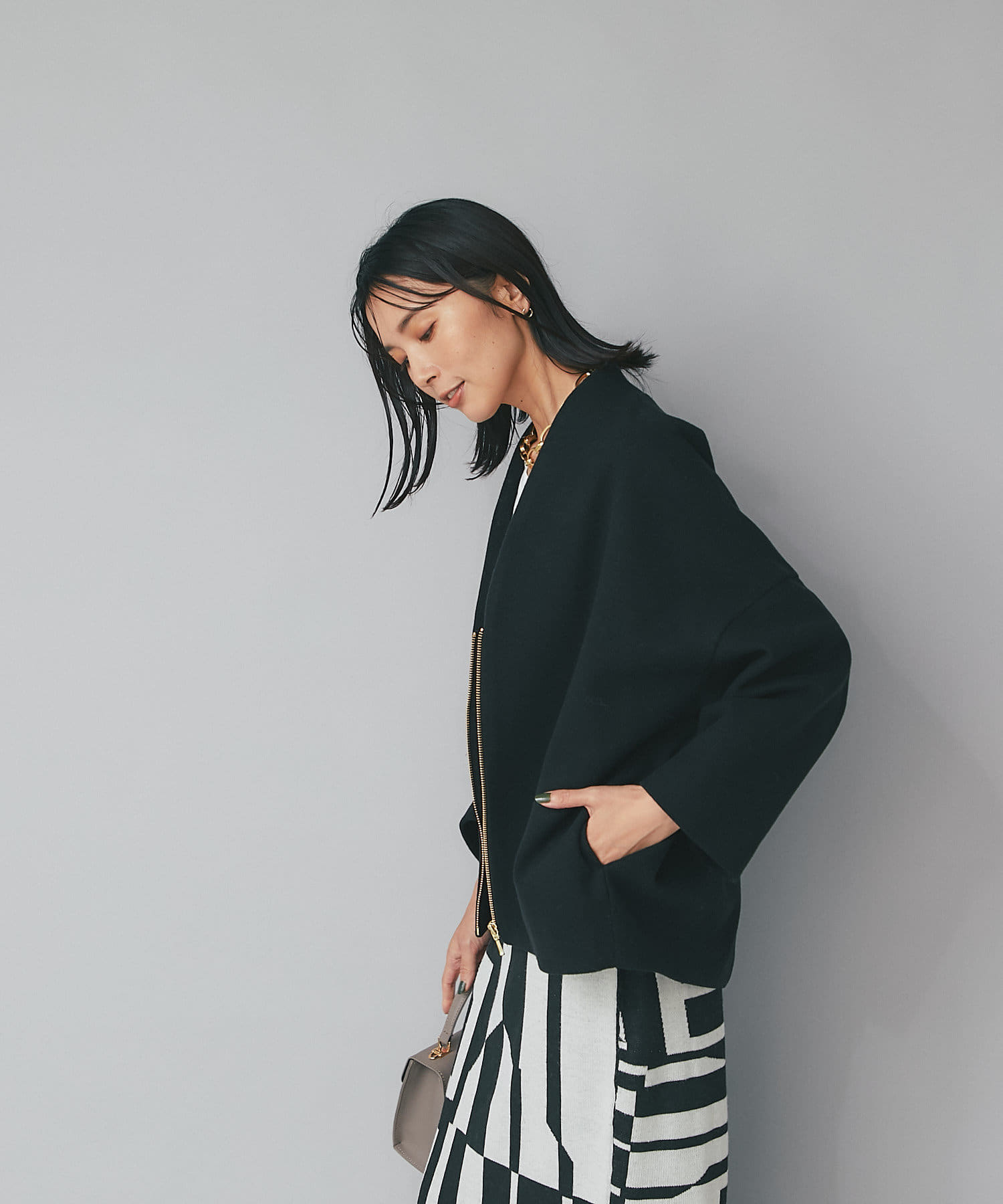 スッキリとしたVネックで女性らしさを演出し、ゴールドZIPがスタイリングにアクセントをプラスします。