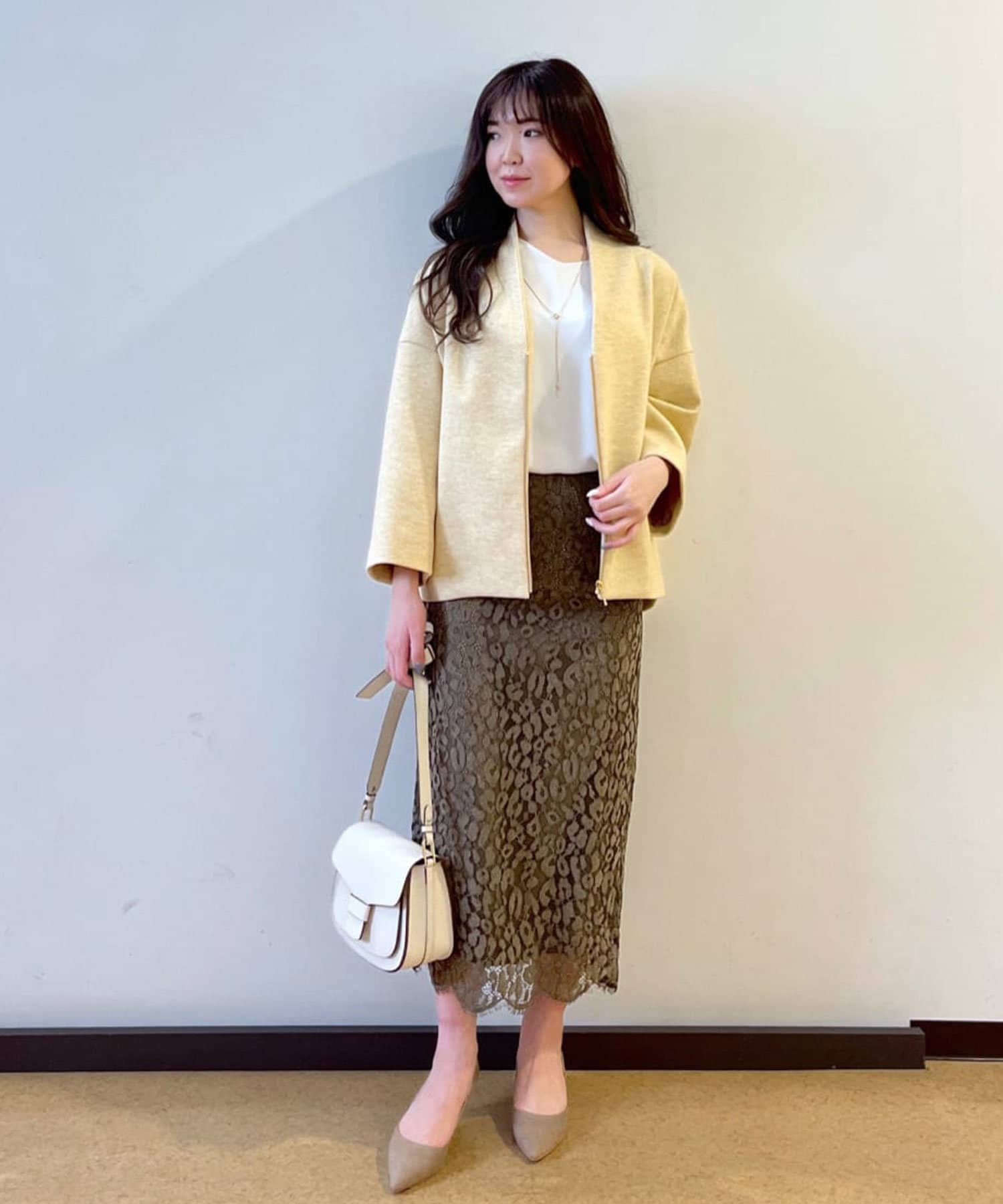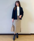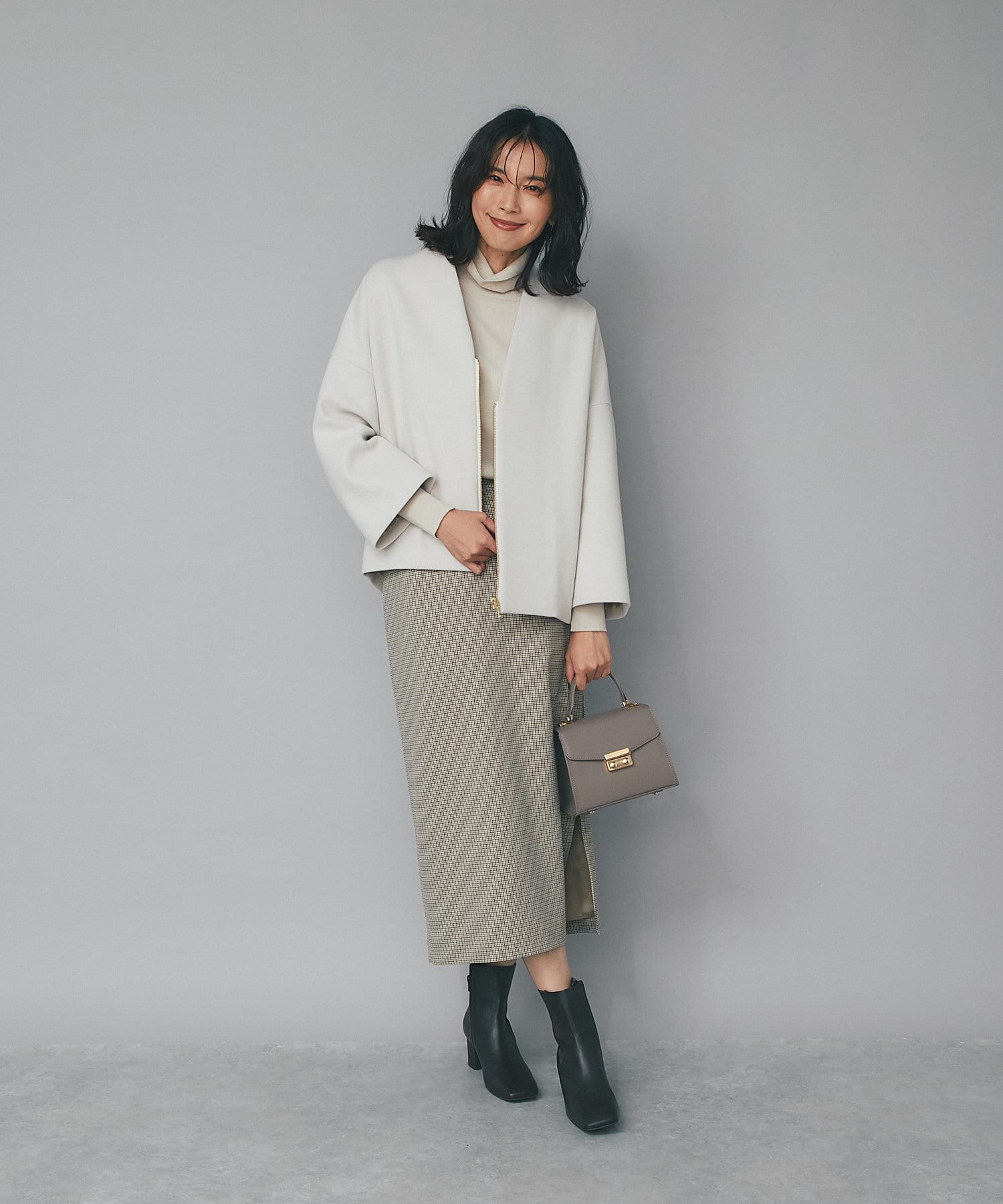 キレイめスタイルには、スッキリとしたシルエットのニットとIラインのタイトスカートで合わせた、上品カジュアルな着こなしに。