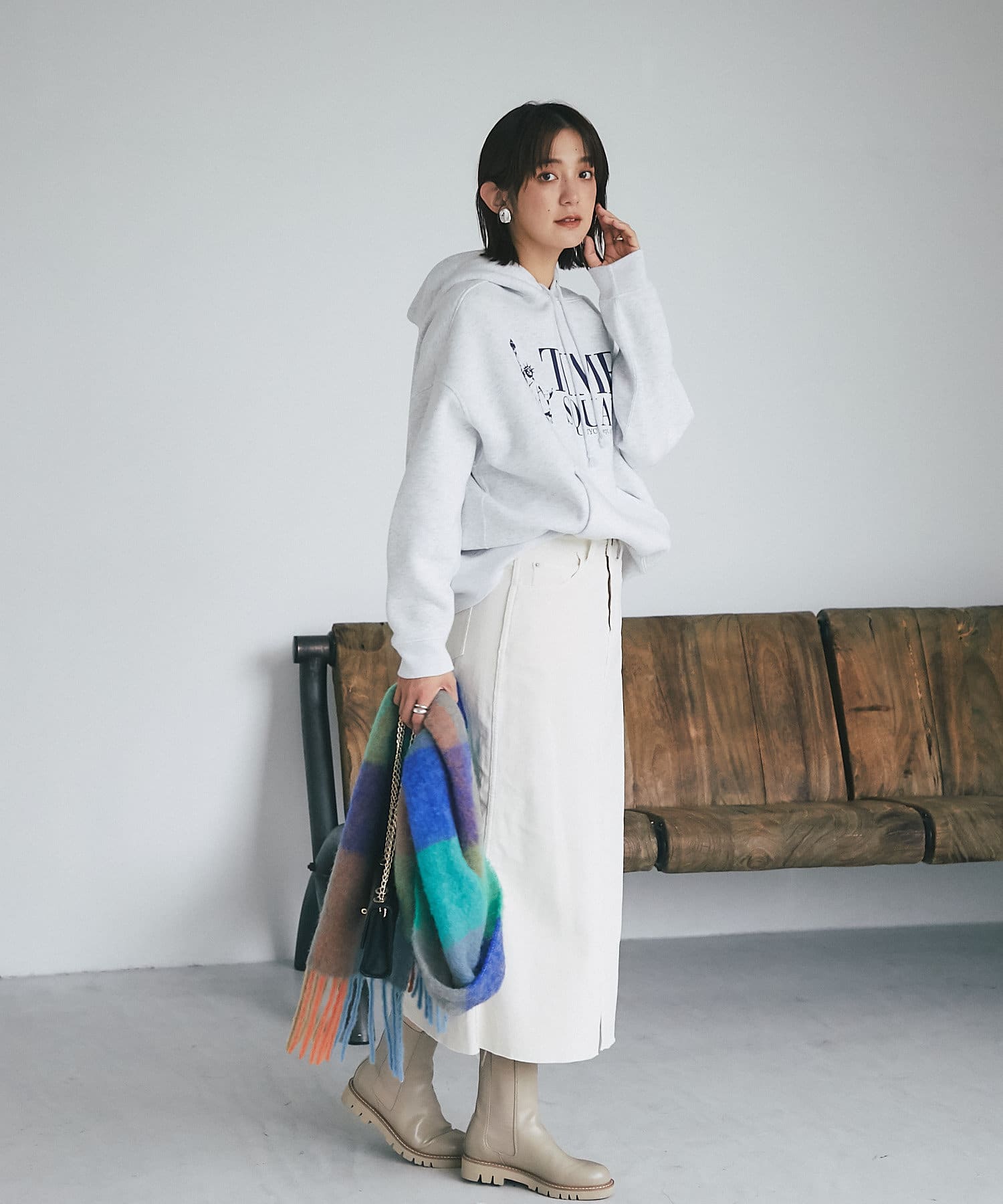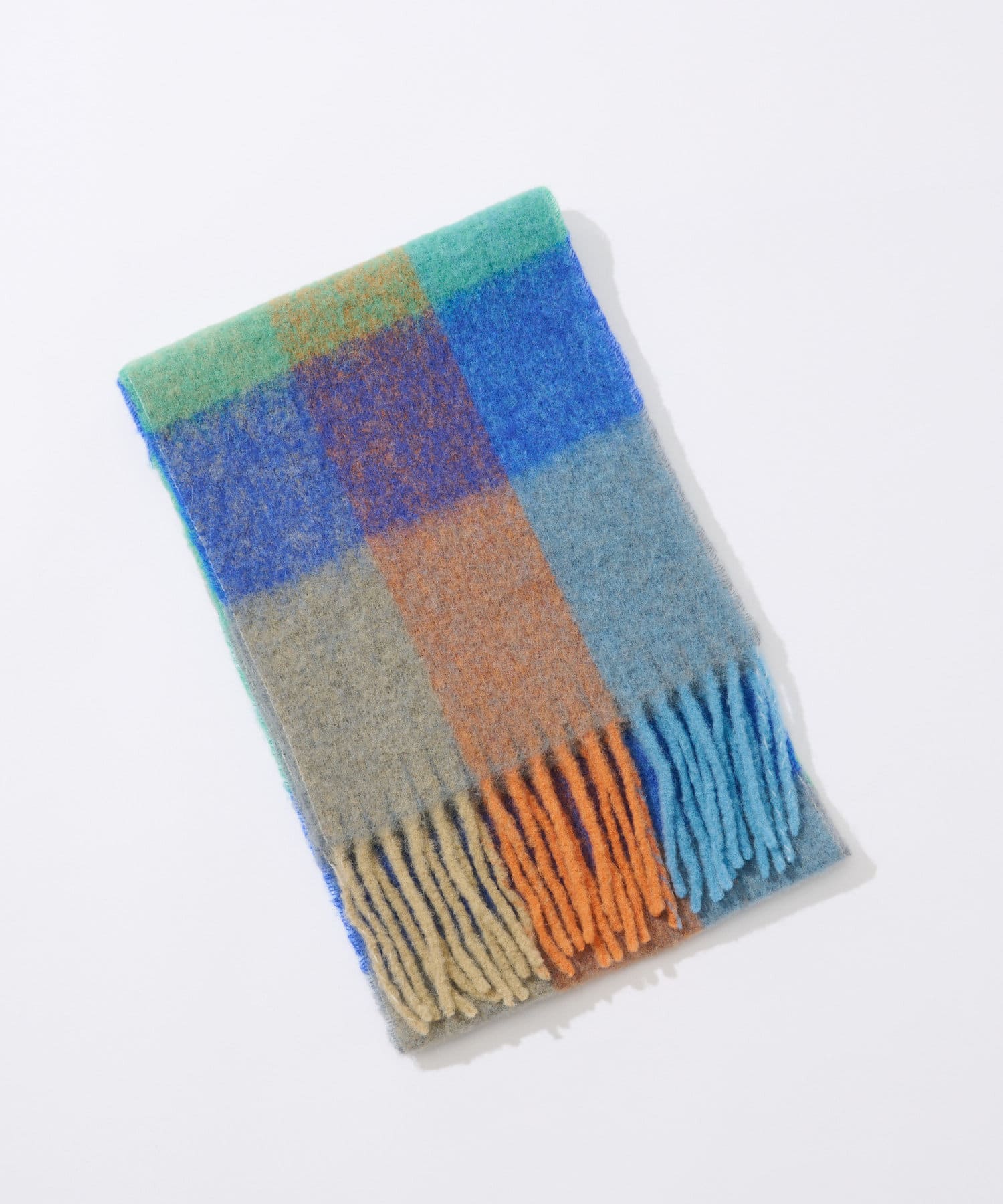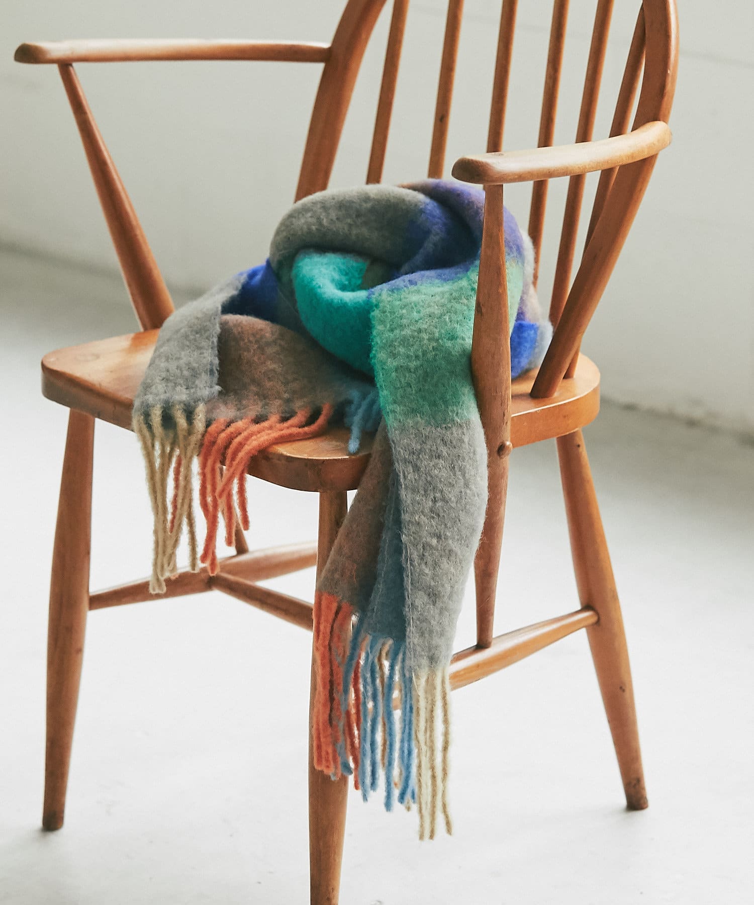 起毛感のあるフワフワとした素材感と配色がポイントのウールストール。