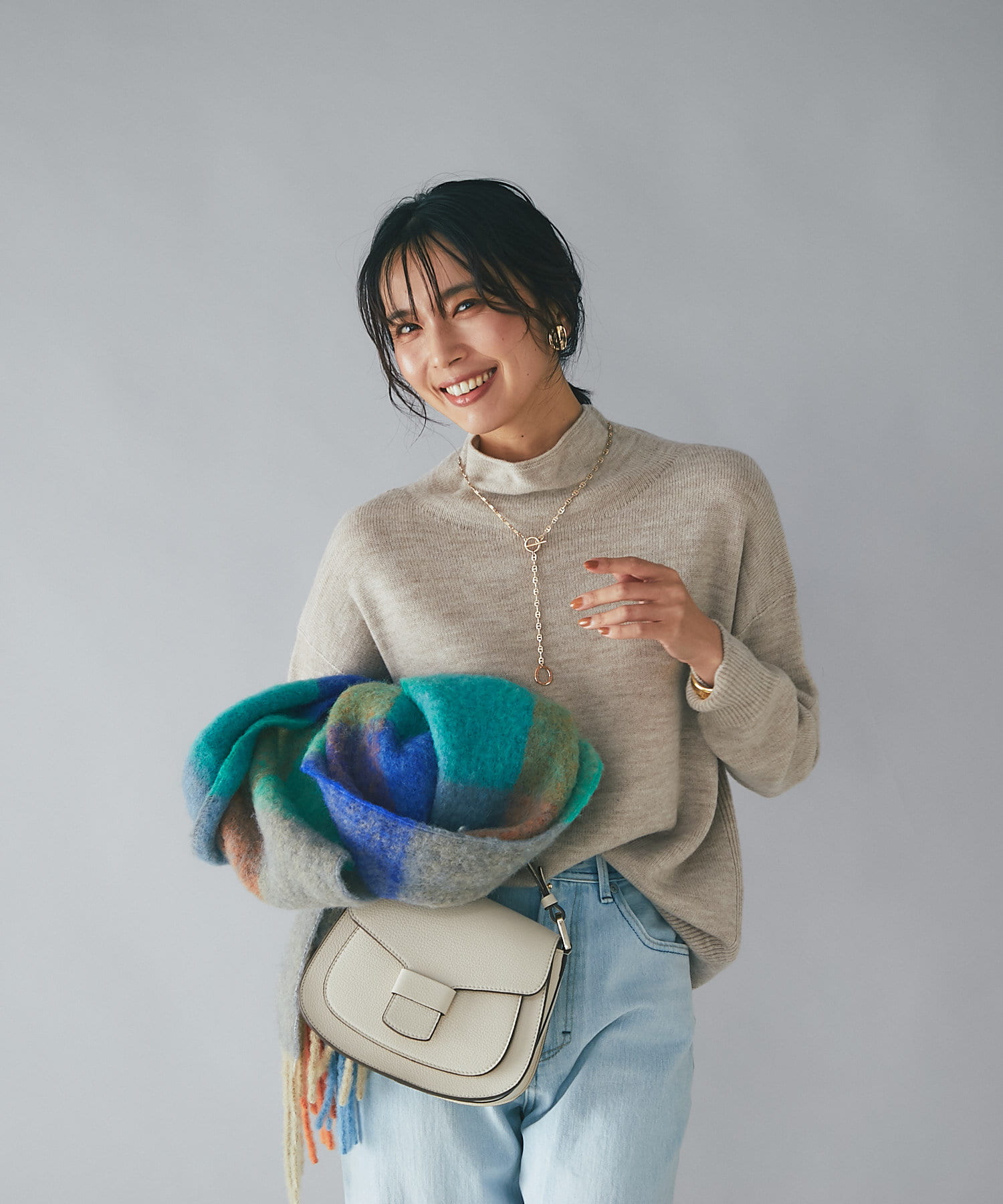 エアリーでとても軽く、長さもあるので、ボリュームを出して巻いて頂け、顔周りを華やかに演出できます。