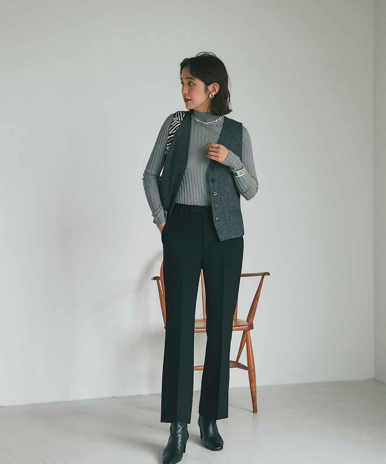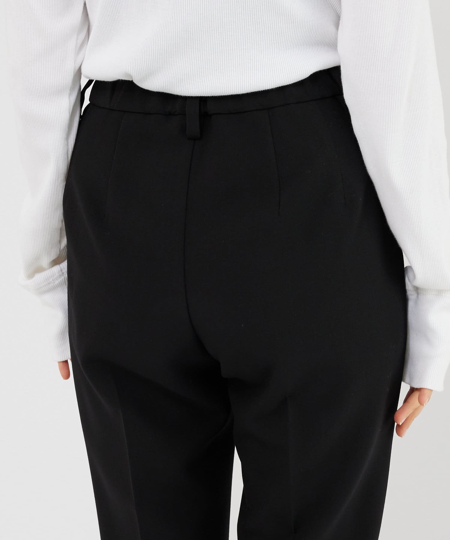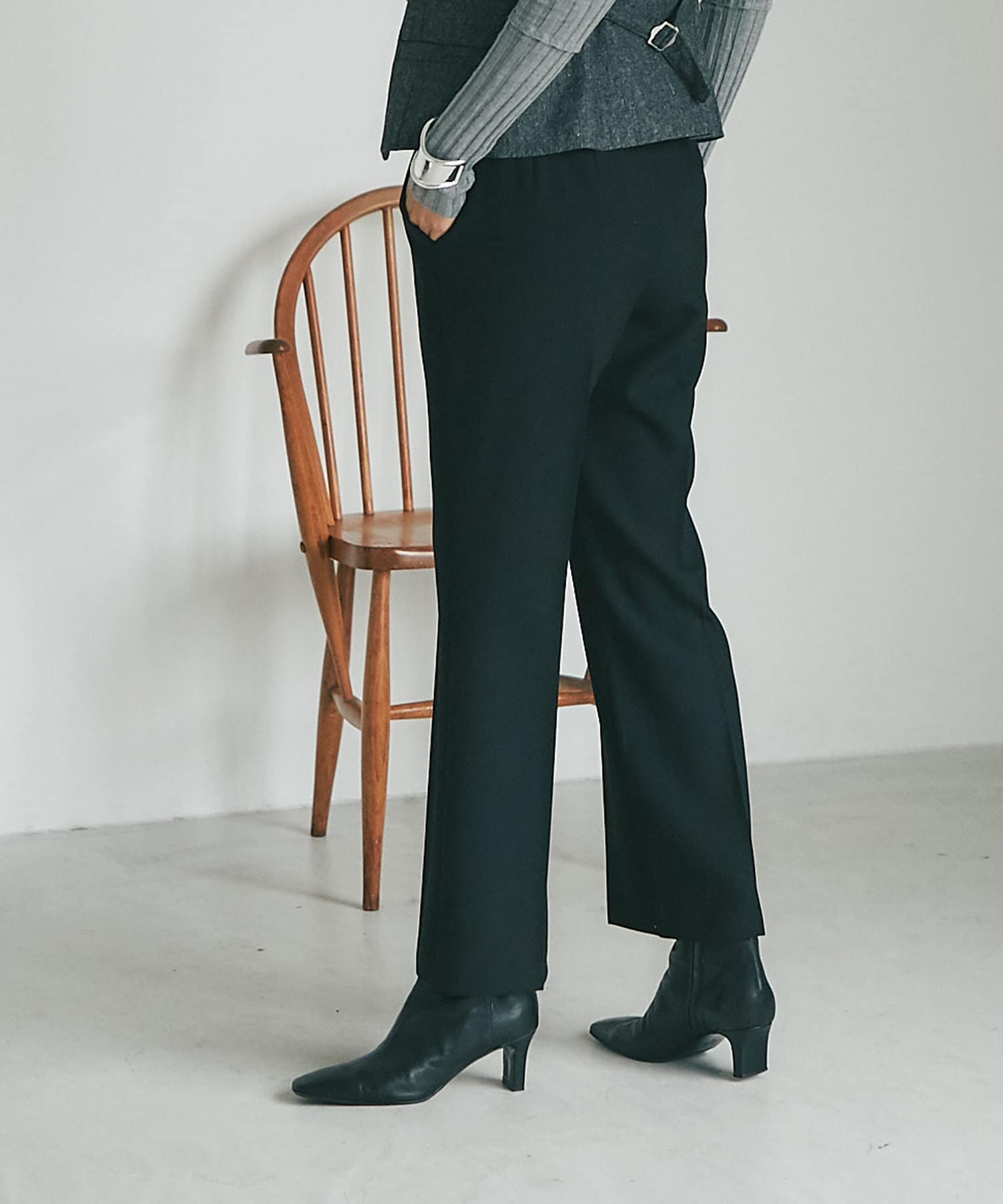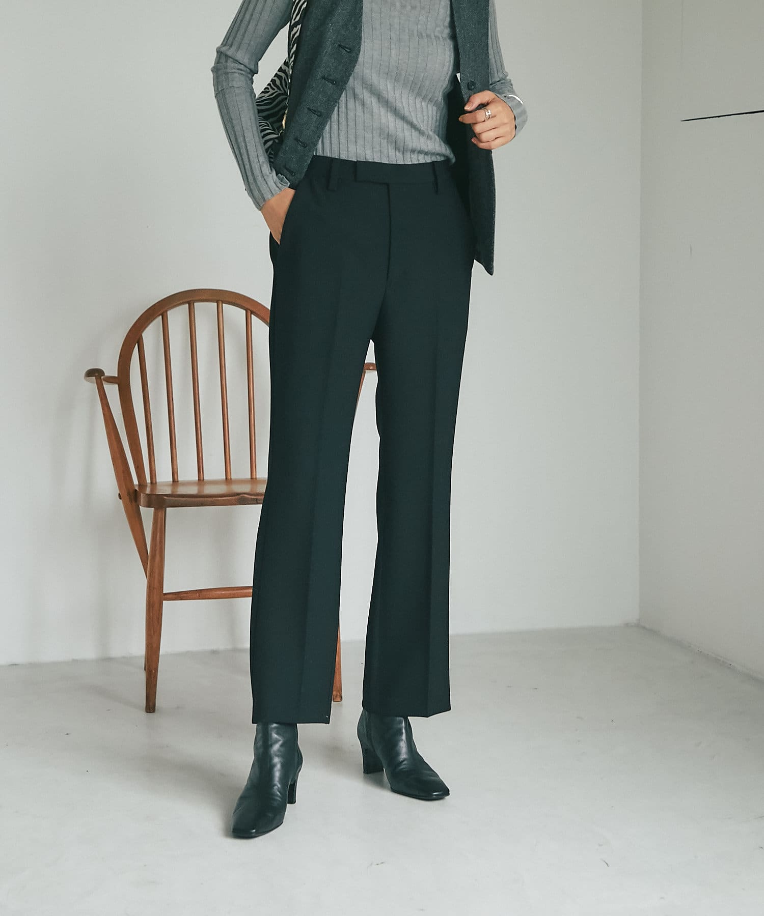 裾に向けて自然に広がるスッキリしたシルエットにセンタープレスを施し縦長シルエットを強調。