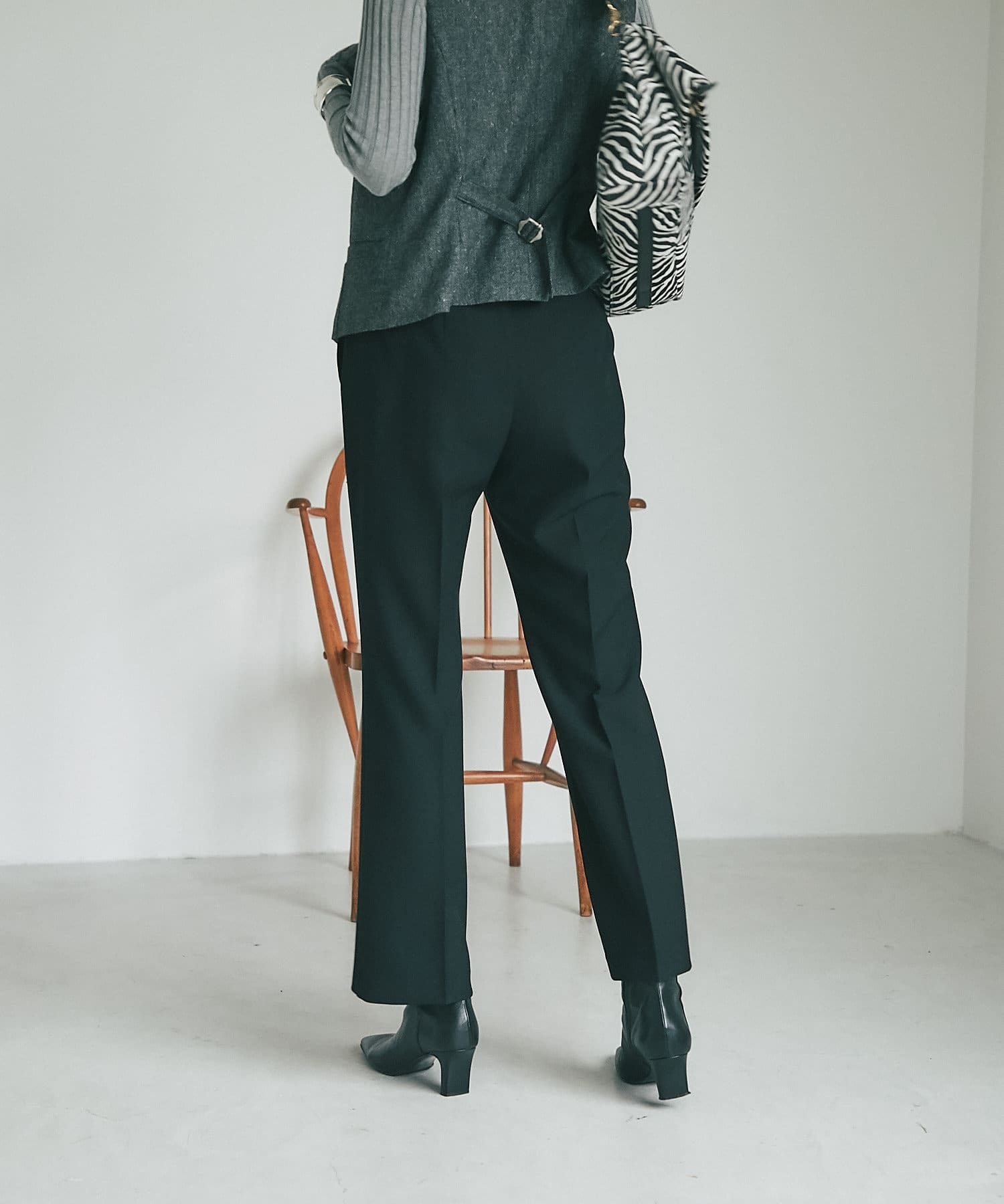 滑らかな手触りと、光沢感が上品なダブルクロスを使用したセミフレアパンツ。
