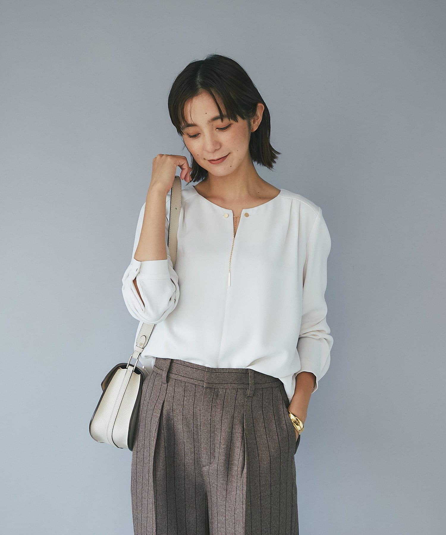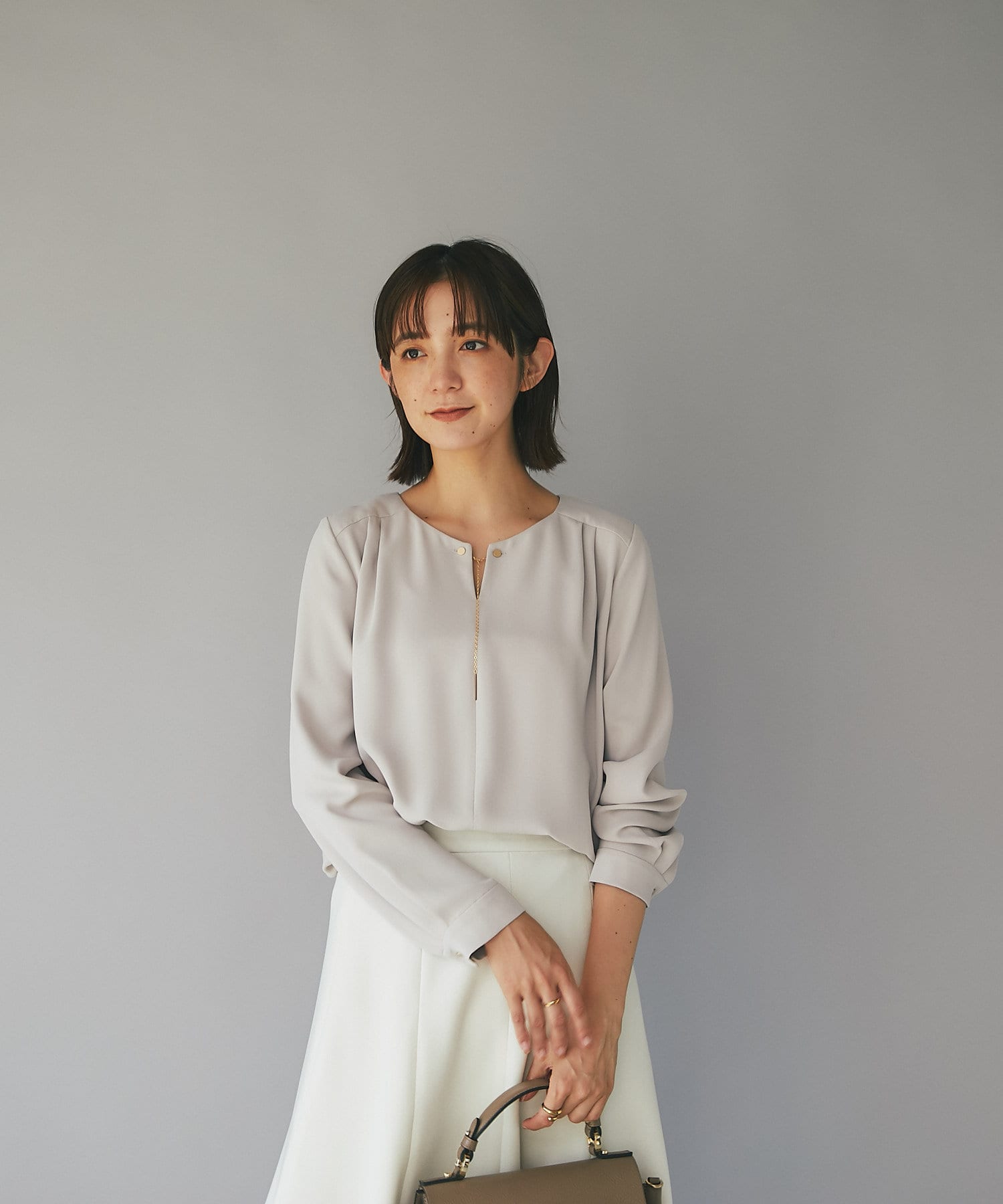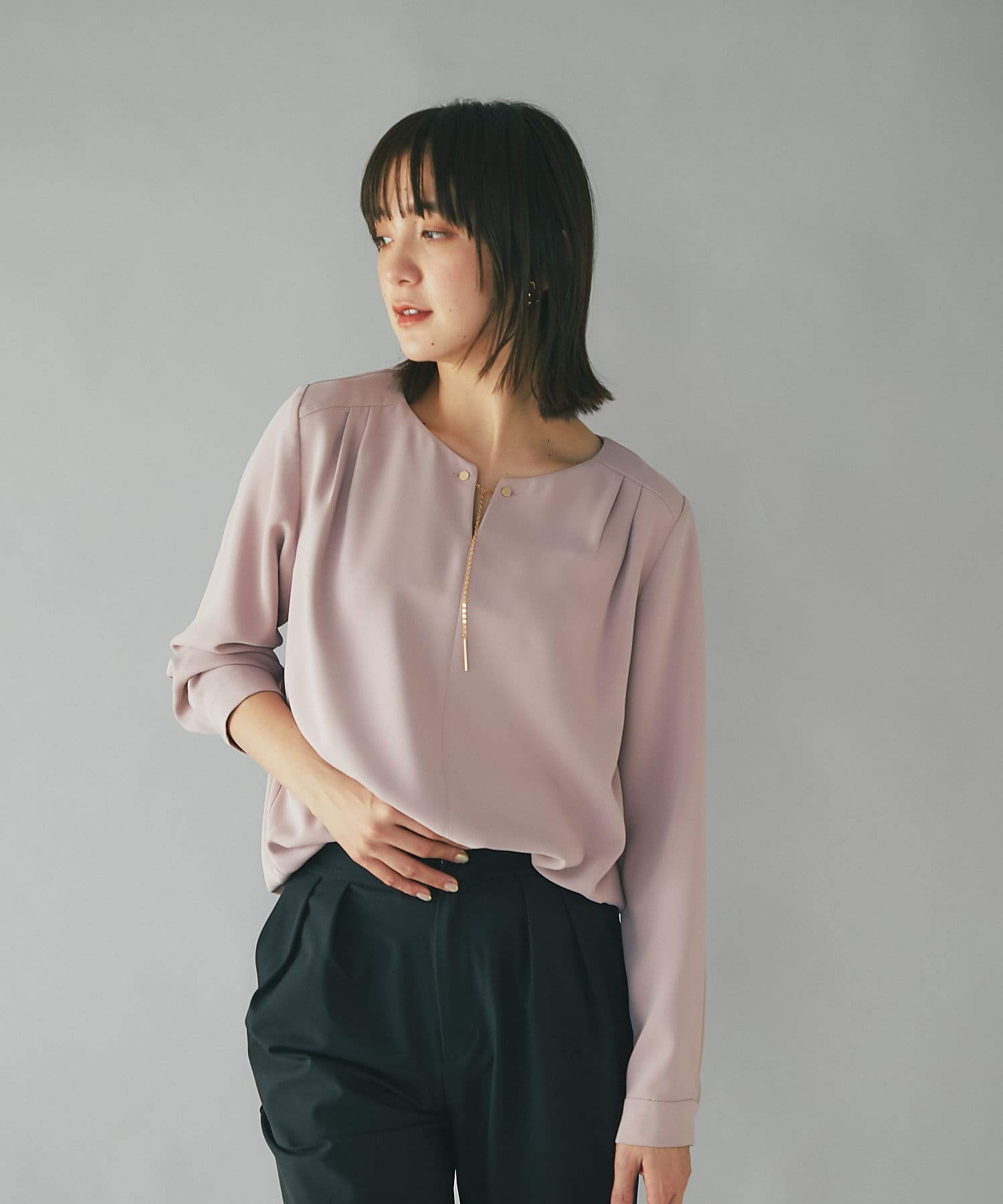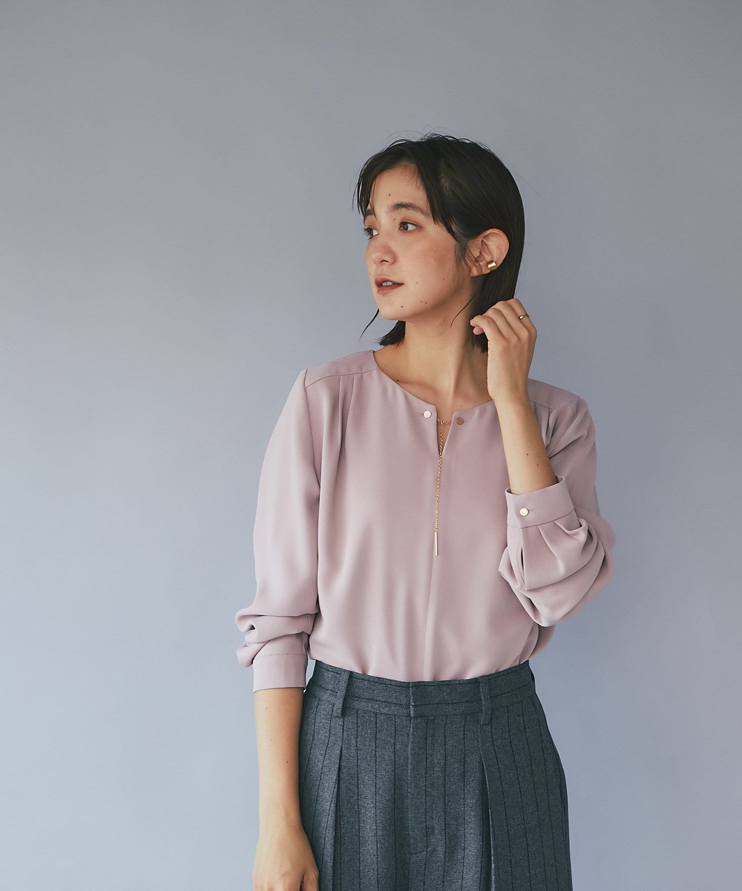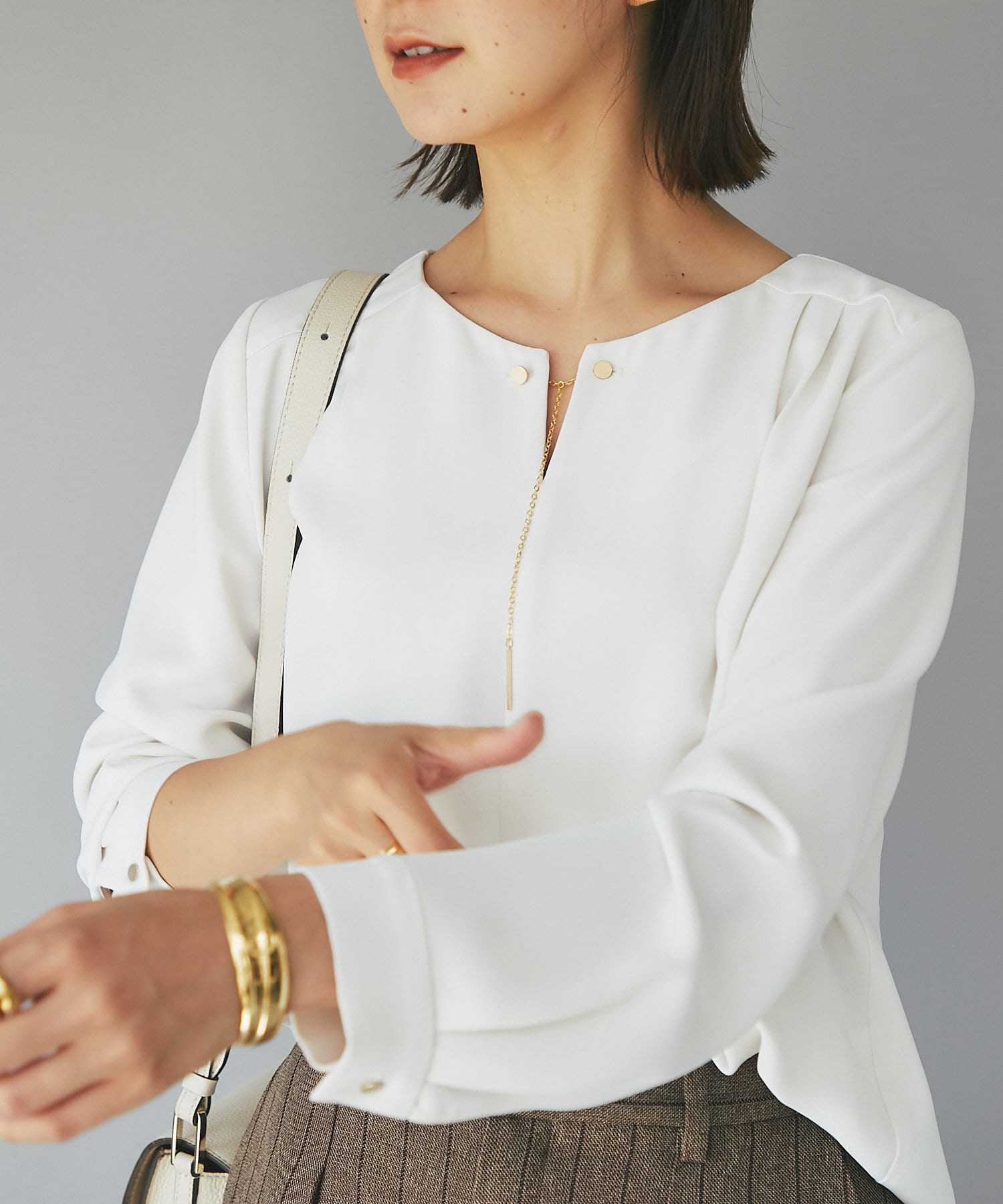 抜け感のあるスリットネックと揺れ感のあるY字パーツを胸元にあしらった綺麗めブラウス。