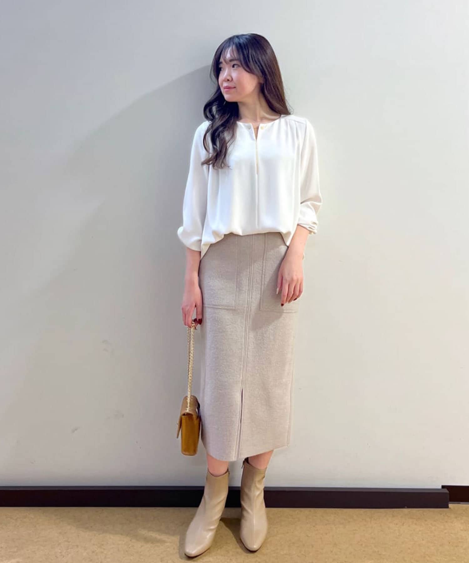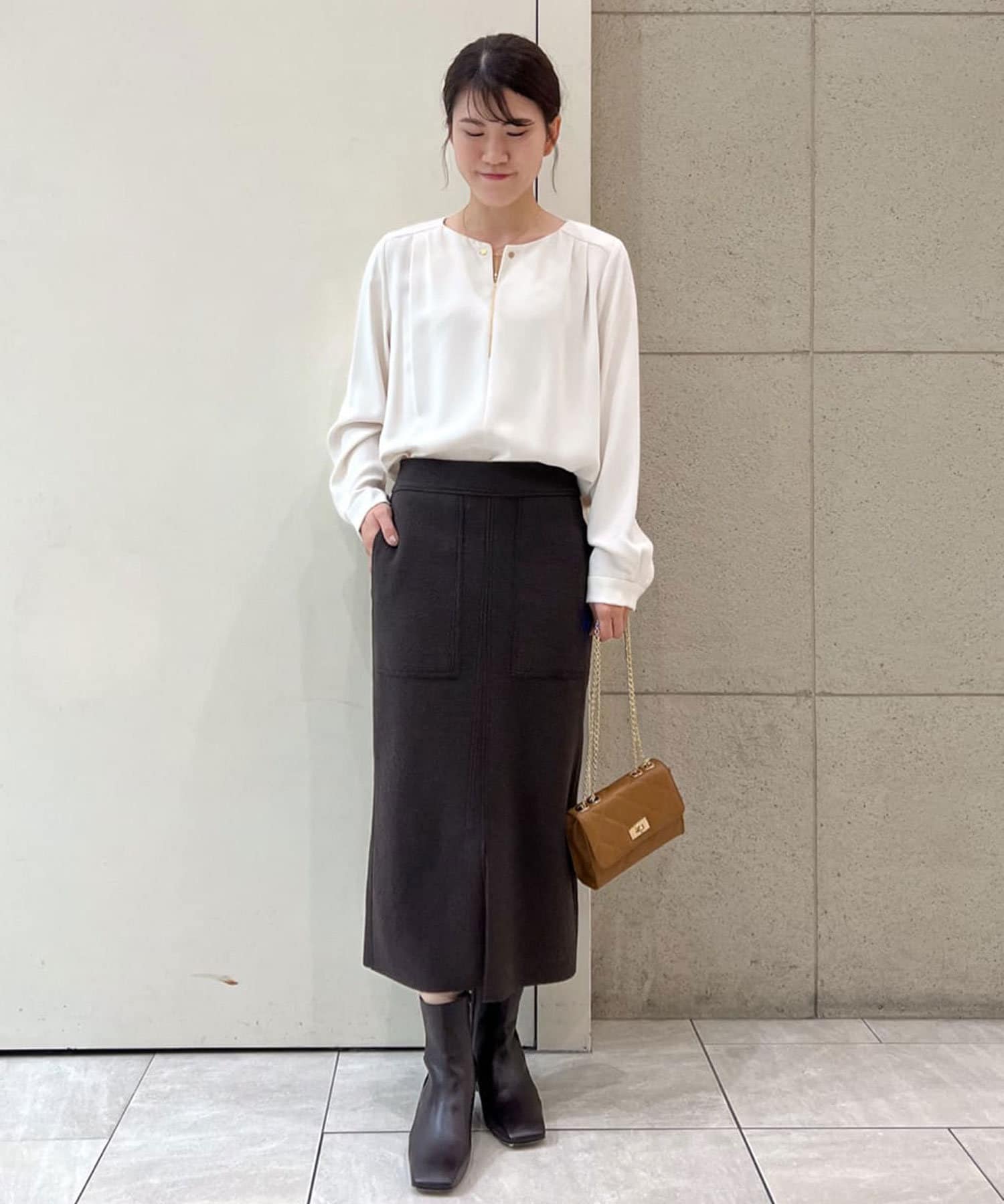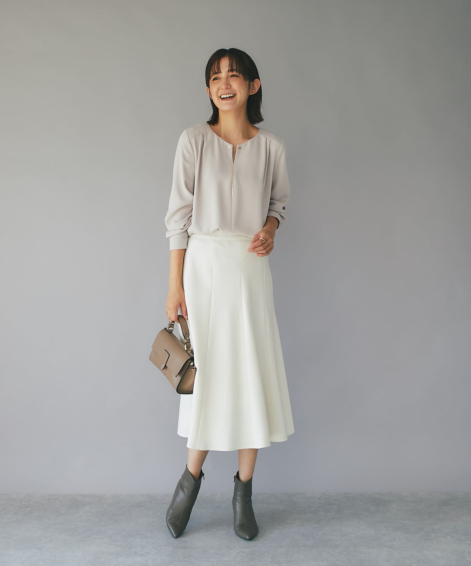 ⇒着丈が長すぎることなく、すっきりしたシルエットになるので、すそを入れなくてもバランスよく着ていただけます。スカートにもパンツにも合わせやすく、小柄さんもバランスがとりやすいアイテムです。