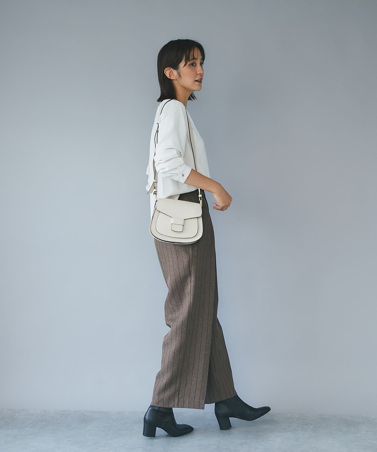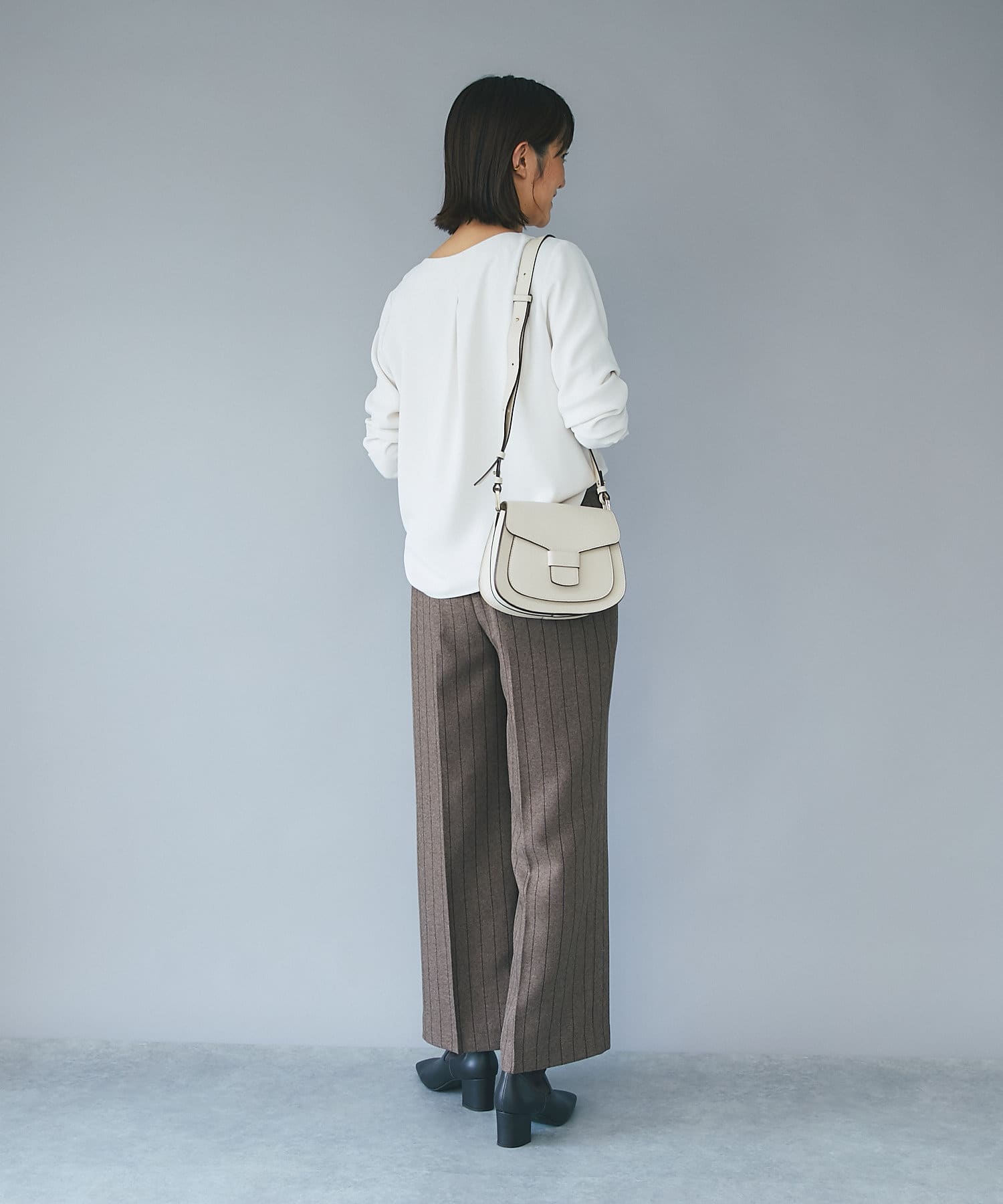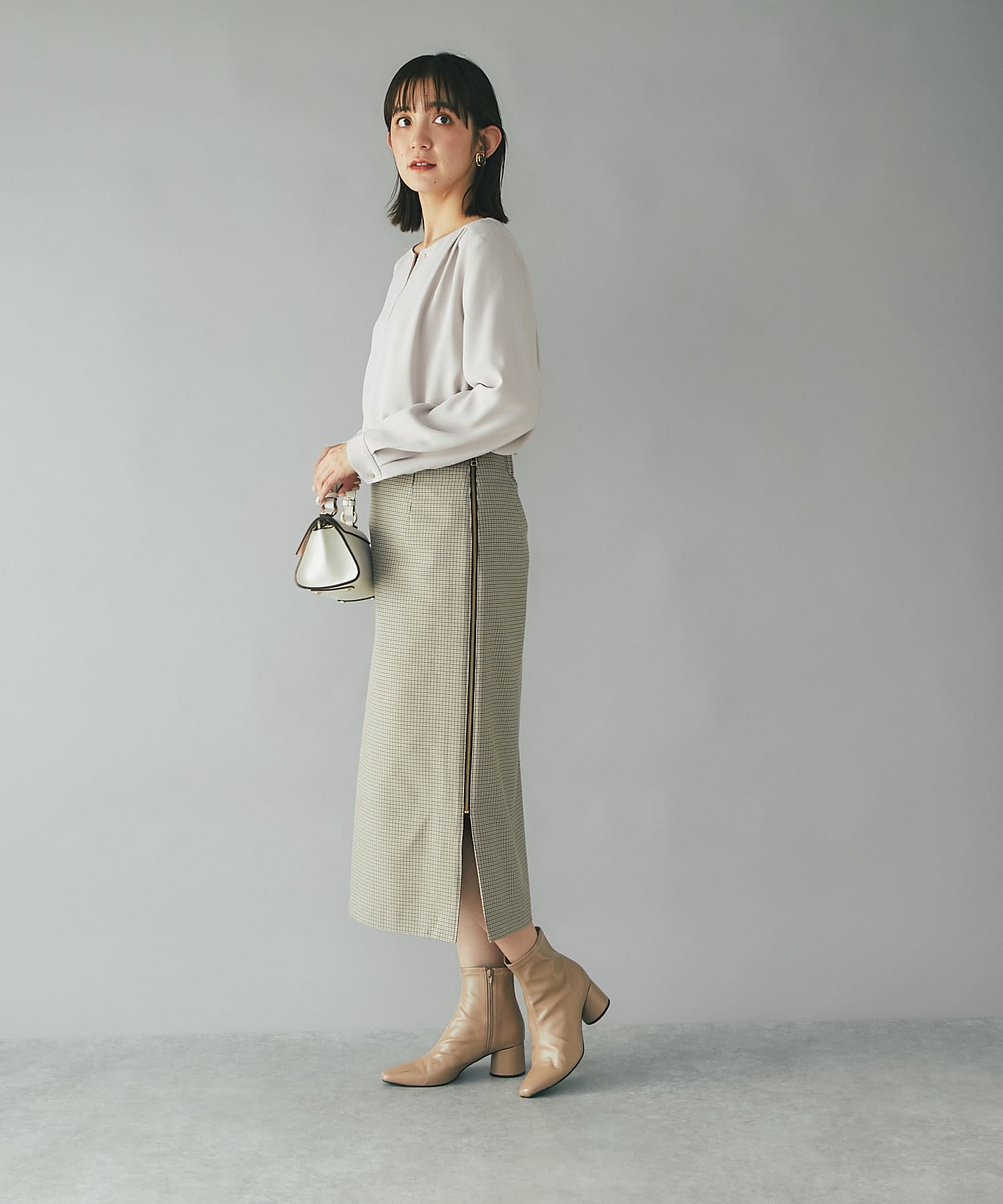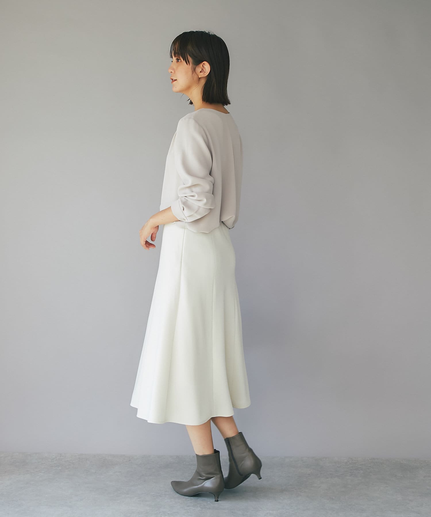 ⇒着丈が長すぎることなく、すっきりしたシルエットになるので、すそを入れなくてもバランスよく着ていただけます。スカートにもパンツにも合わせやすく、小柄さんもバランスがとりやすいアイテムです。