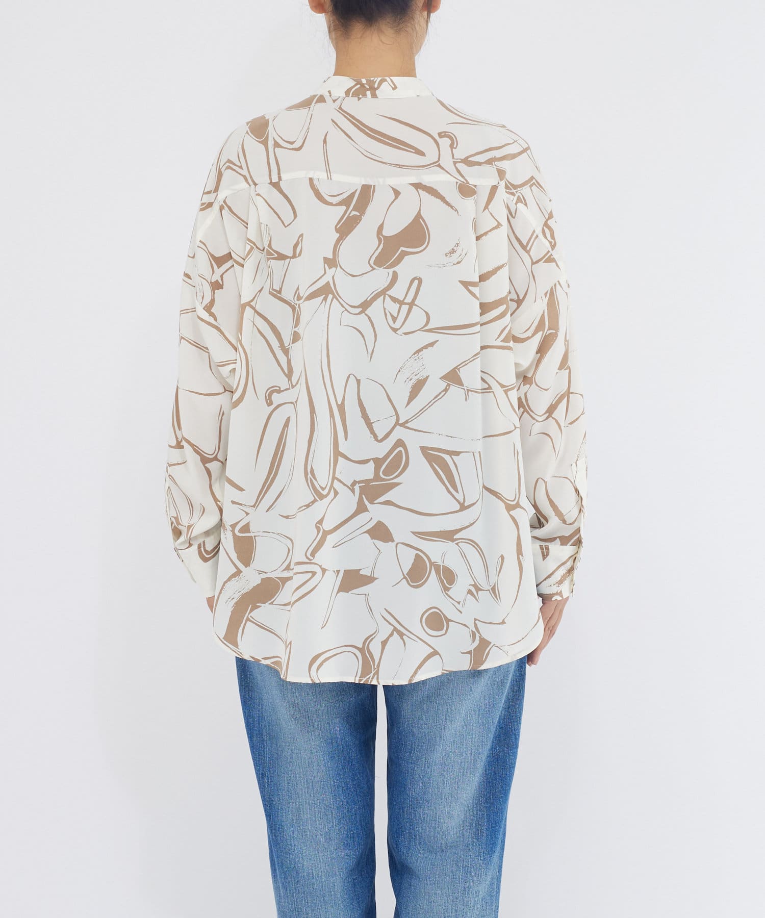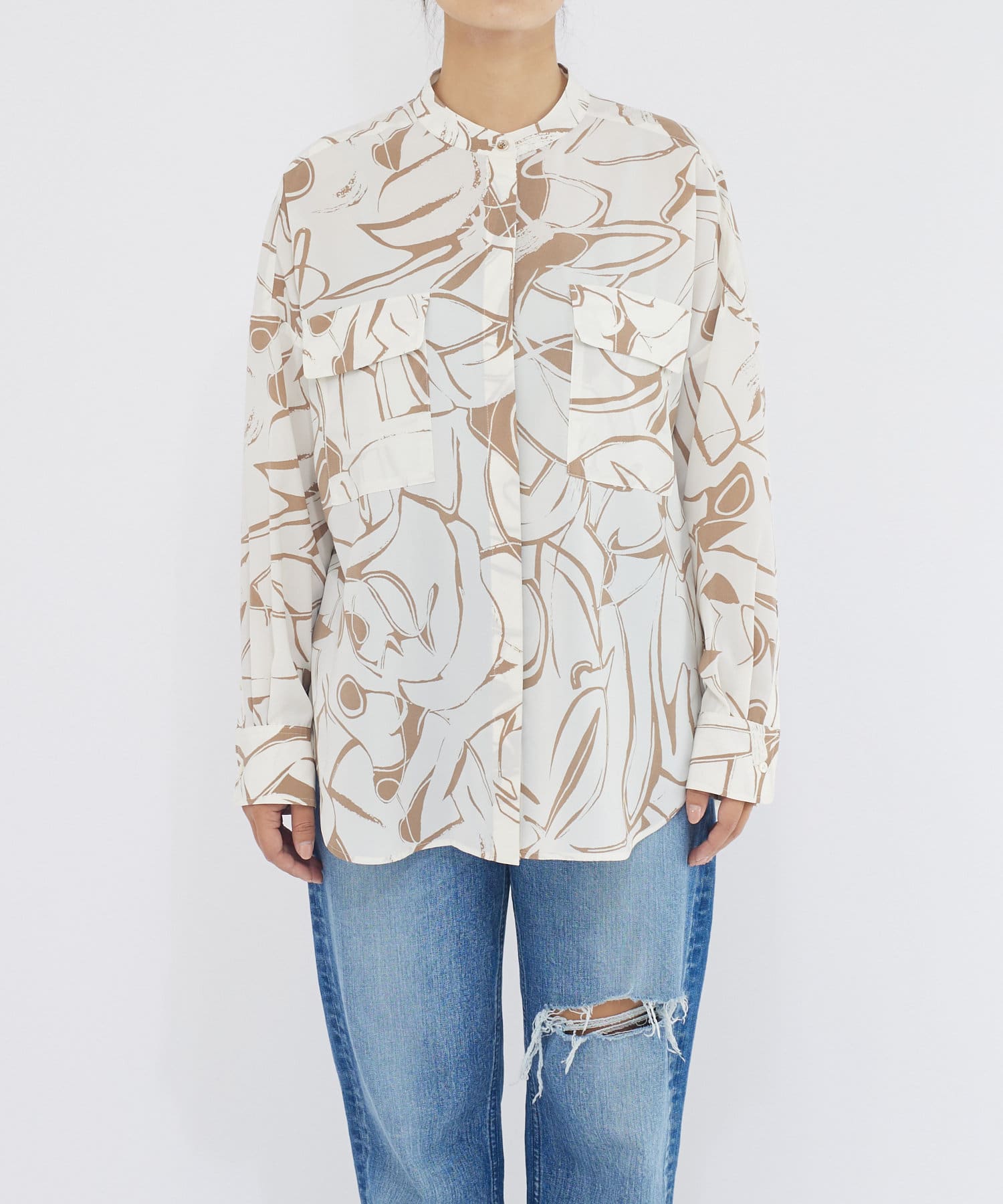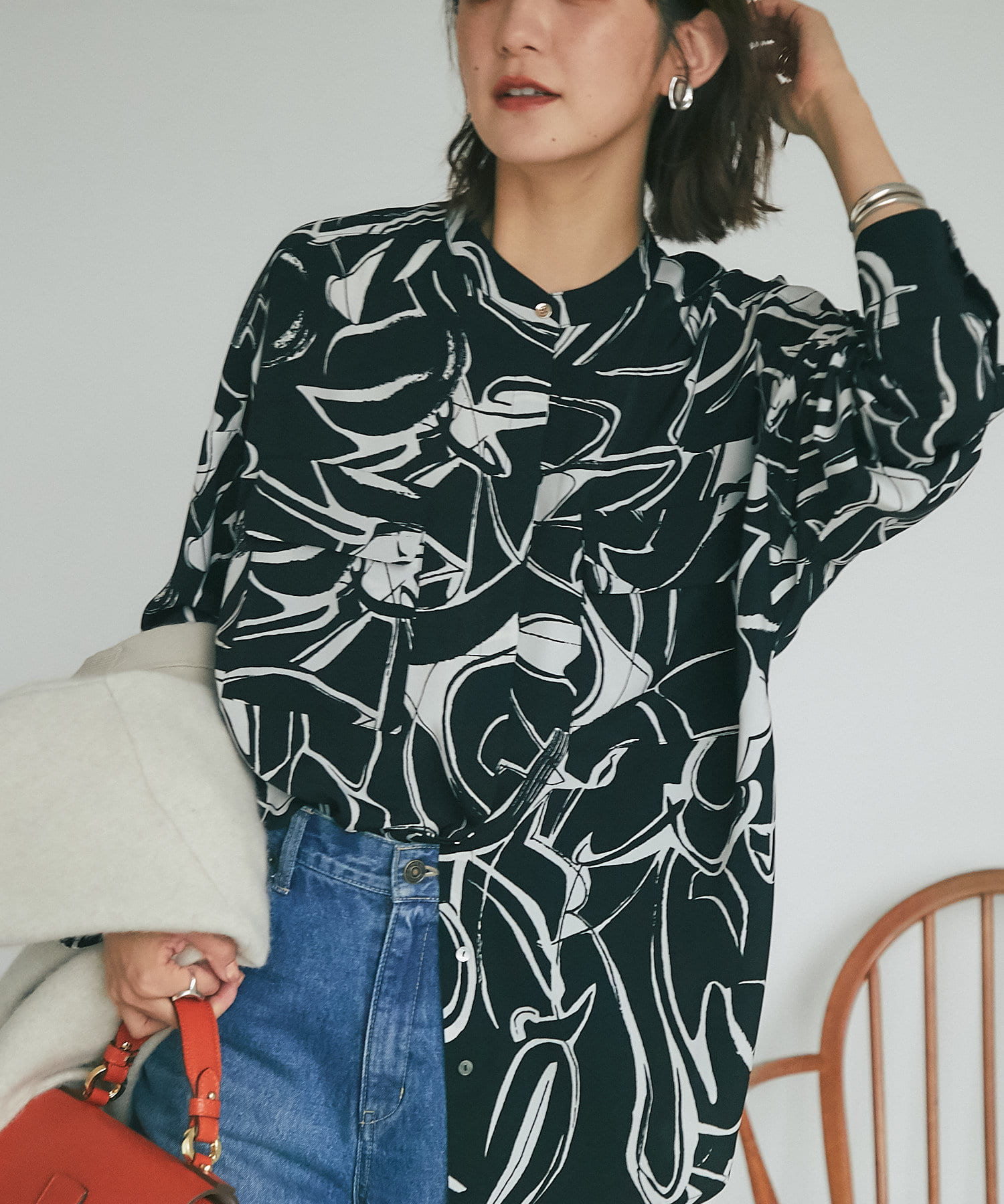 大胆に施されたデシンプリントがスタイリングを華やかにするデザインシャツ。