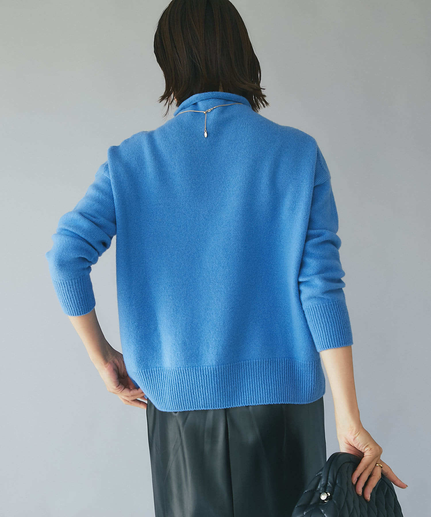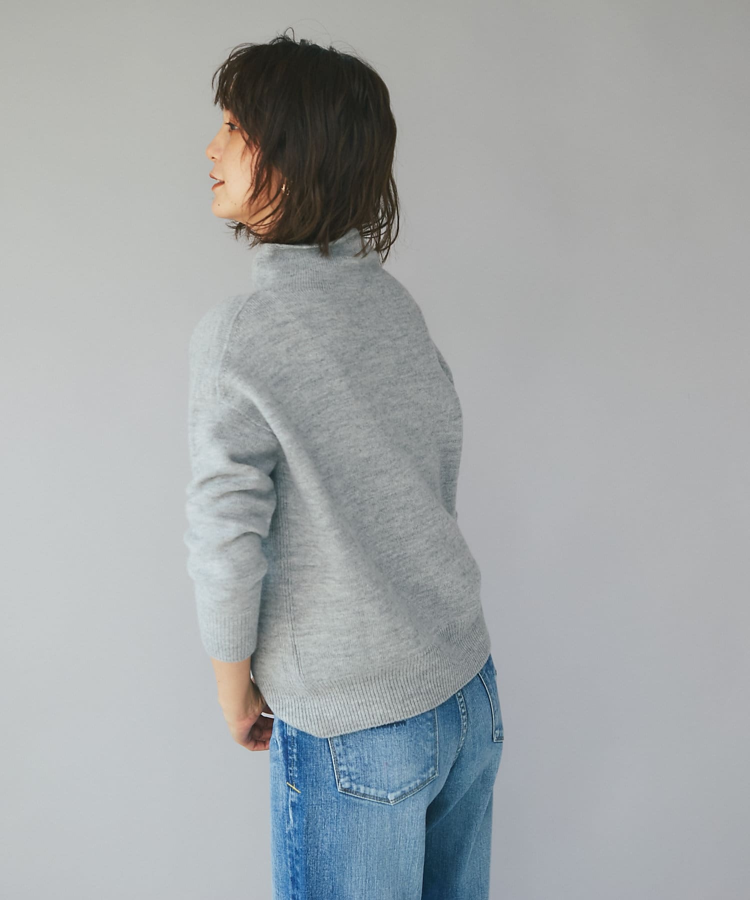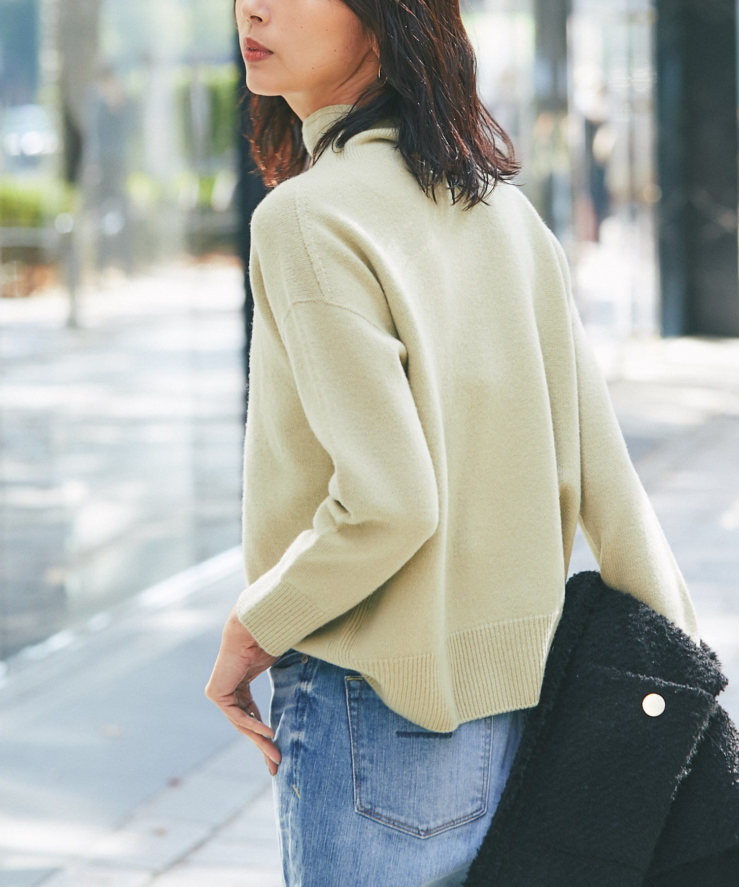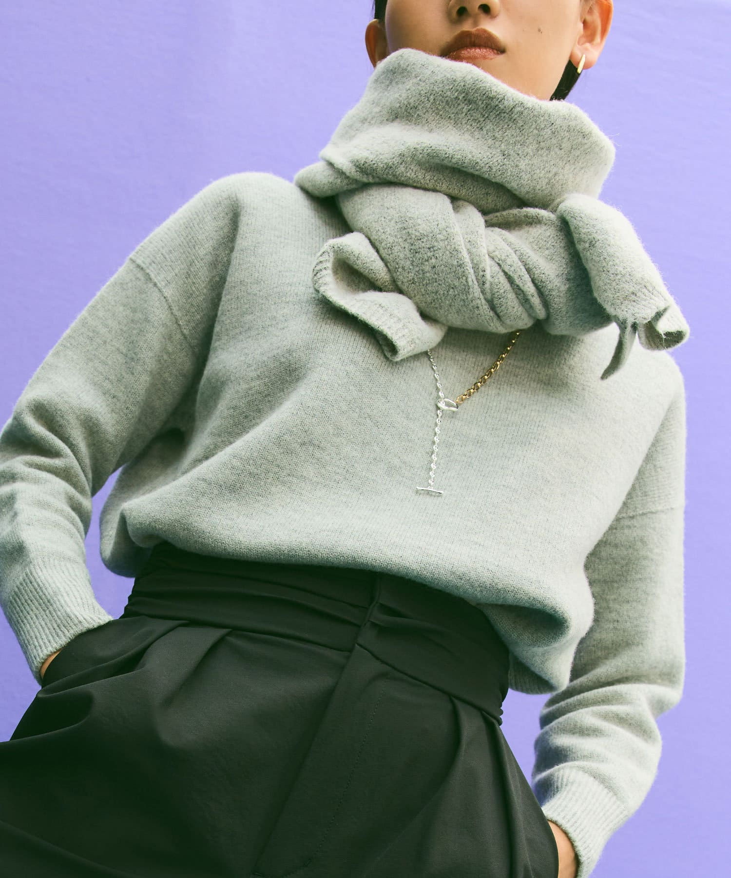 包まれるような柔らかなウールの素材感と定番のボトルネックは一枚着でもコートのインナーにしても顔周りを華やかに着用して頂けます。