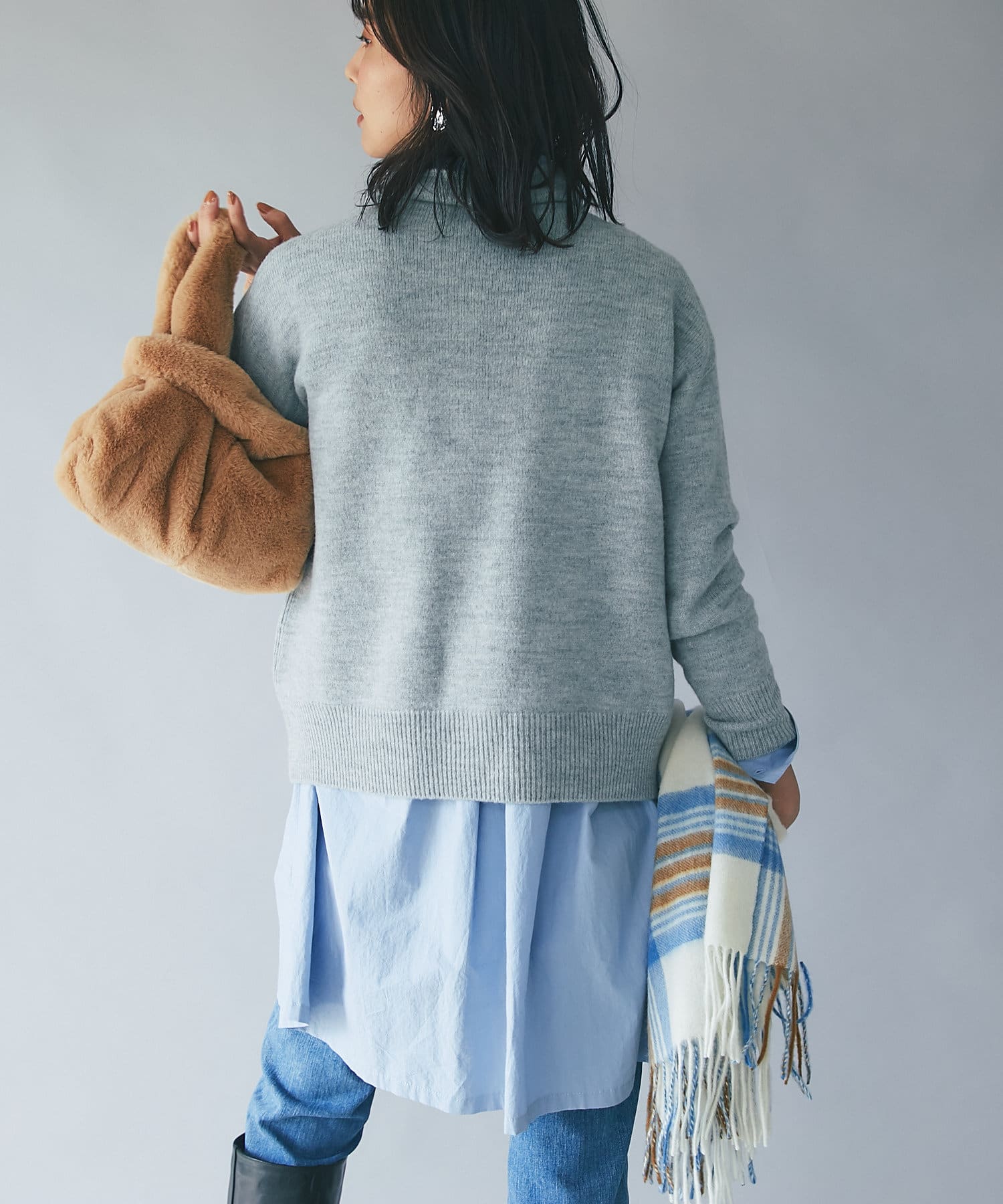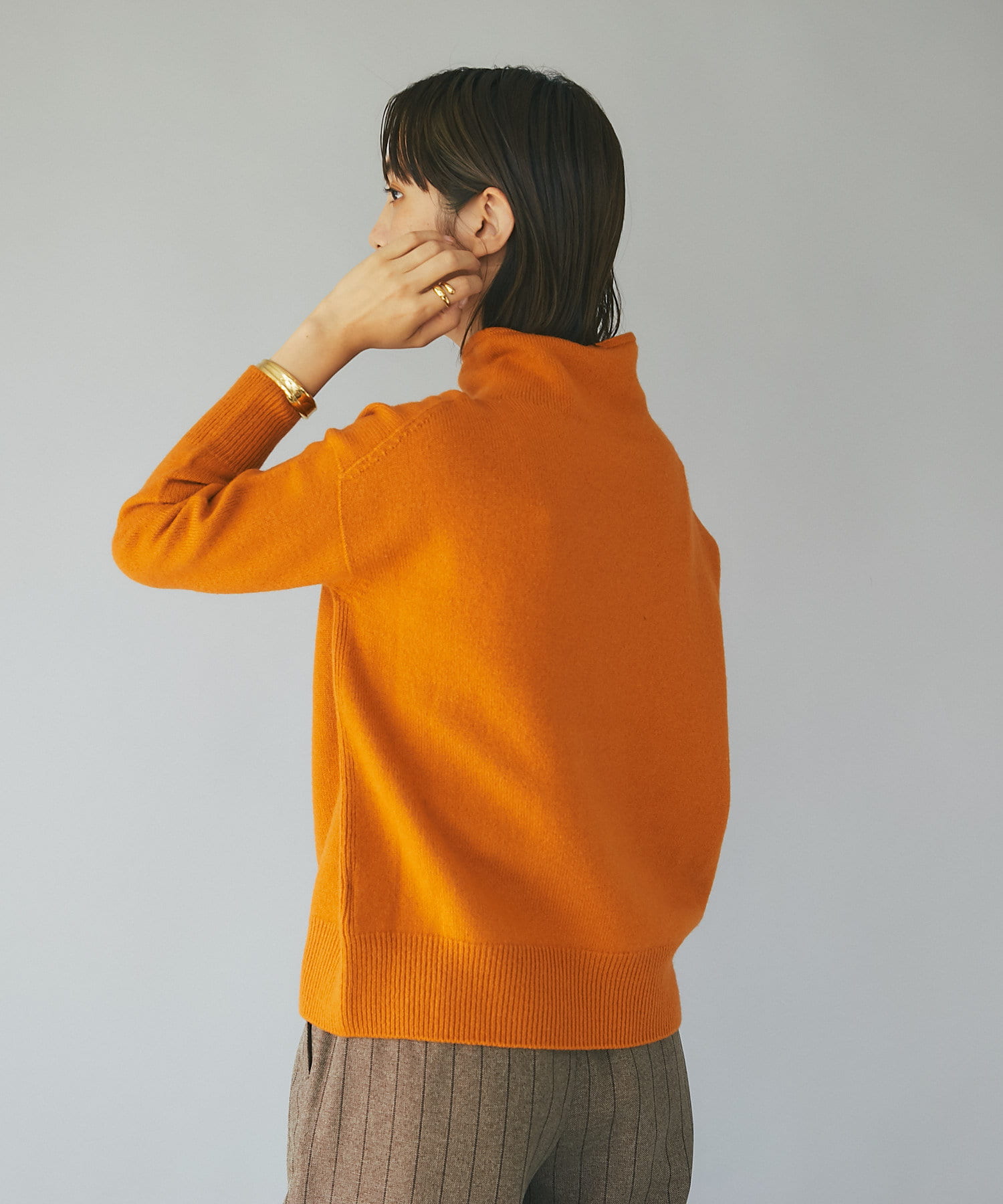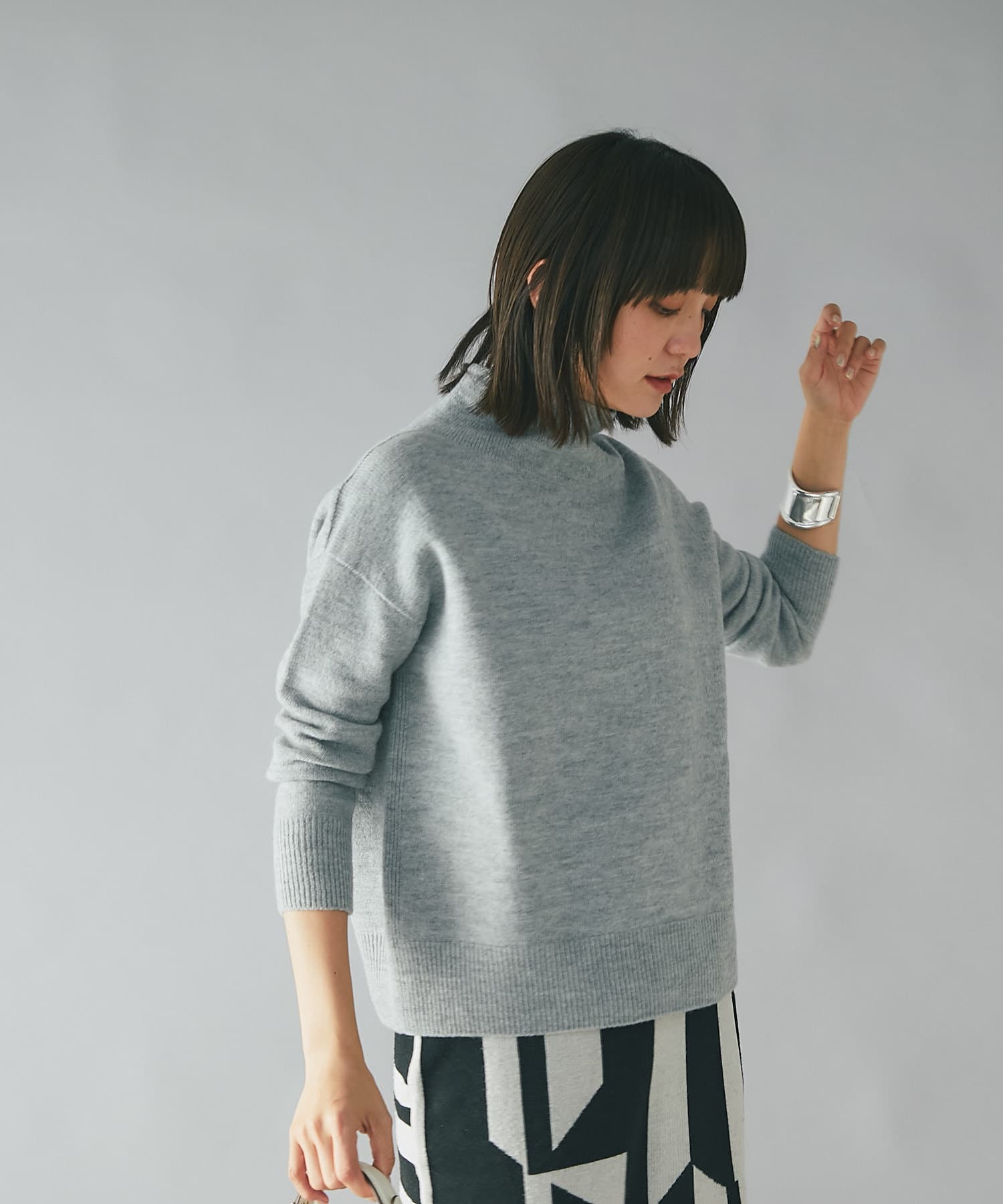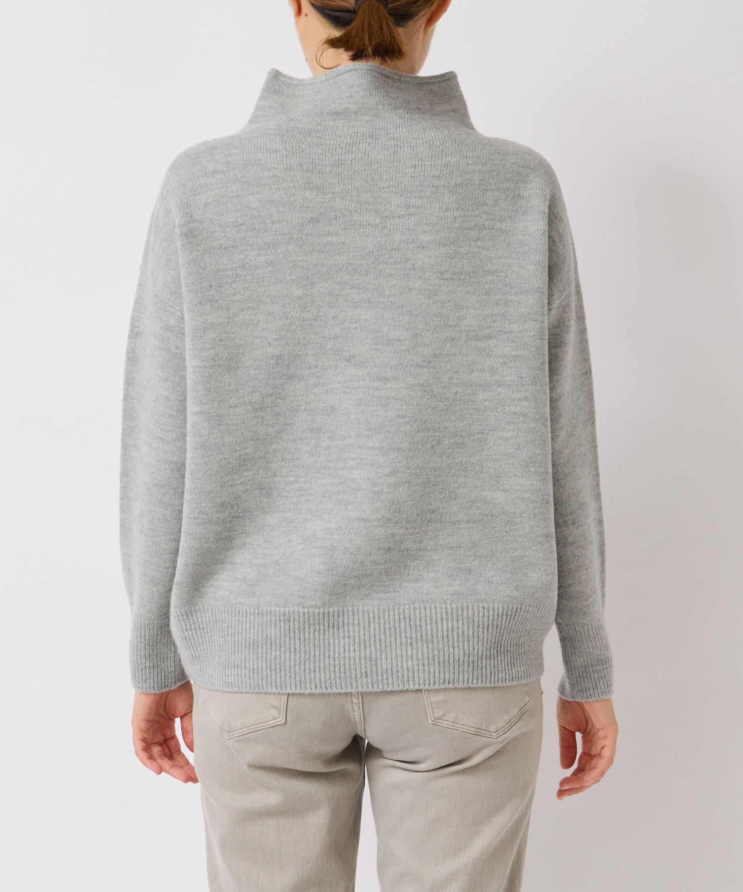 包まれるような柔らかなウールの素材感と定番のボトルネックは一枚着でもコートのインナーにしても顔周りを華やかに着用して頂けます。