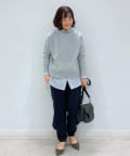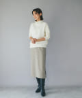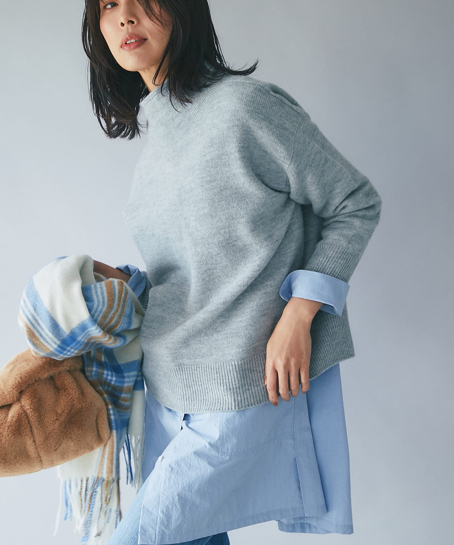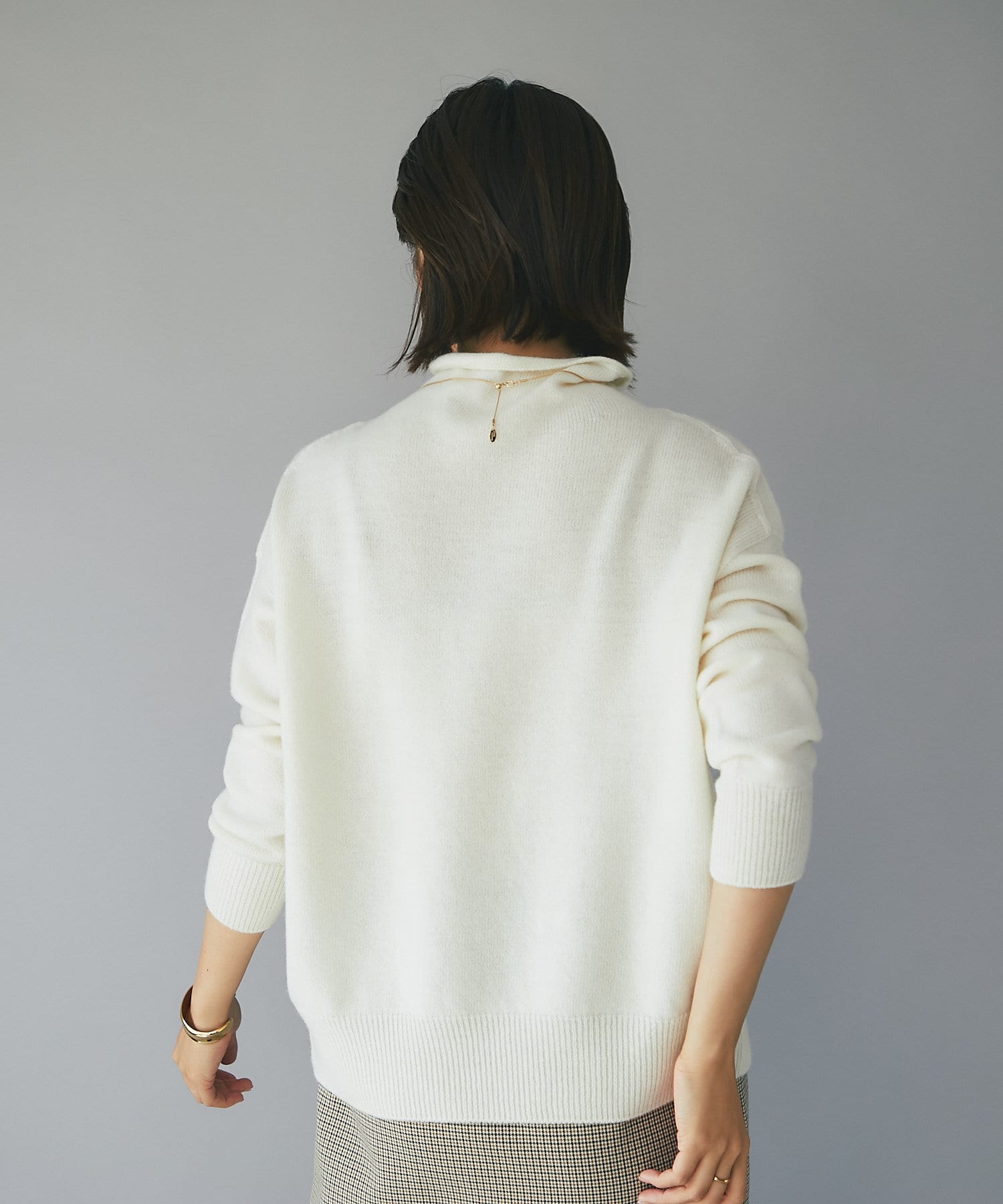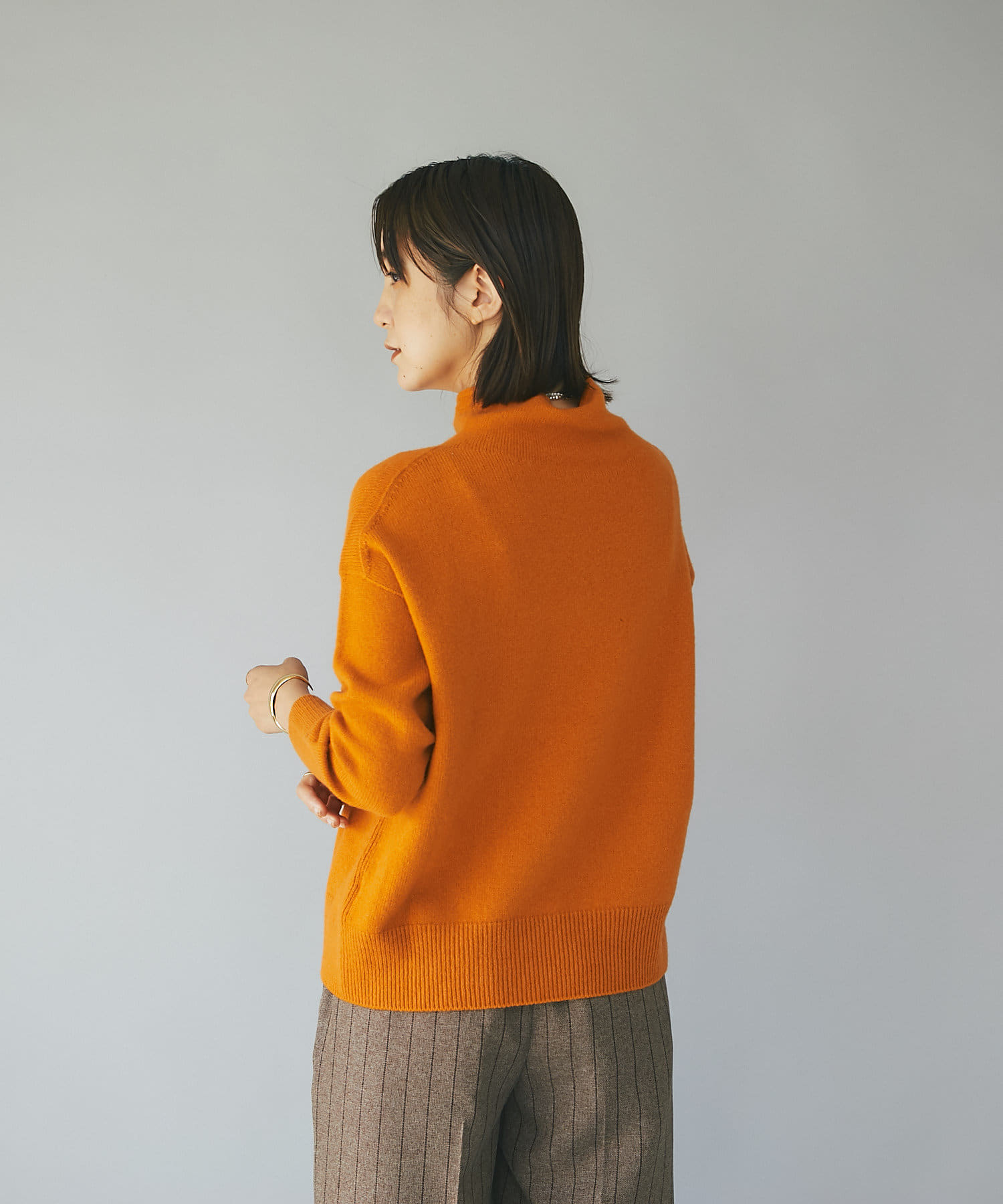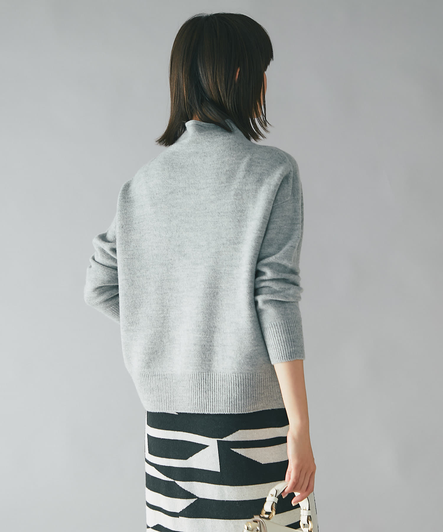 包まれるような柔らかなウールの素材感と定番のボトルネックは一枚着でもコートのインナーにしても顔周りを華やかに着用して頂けます。