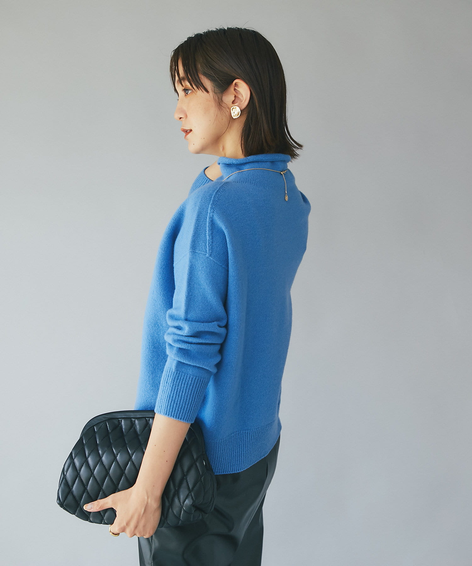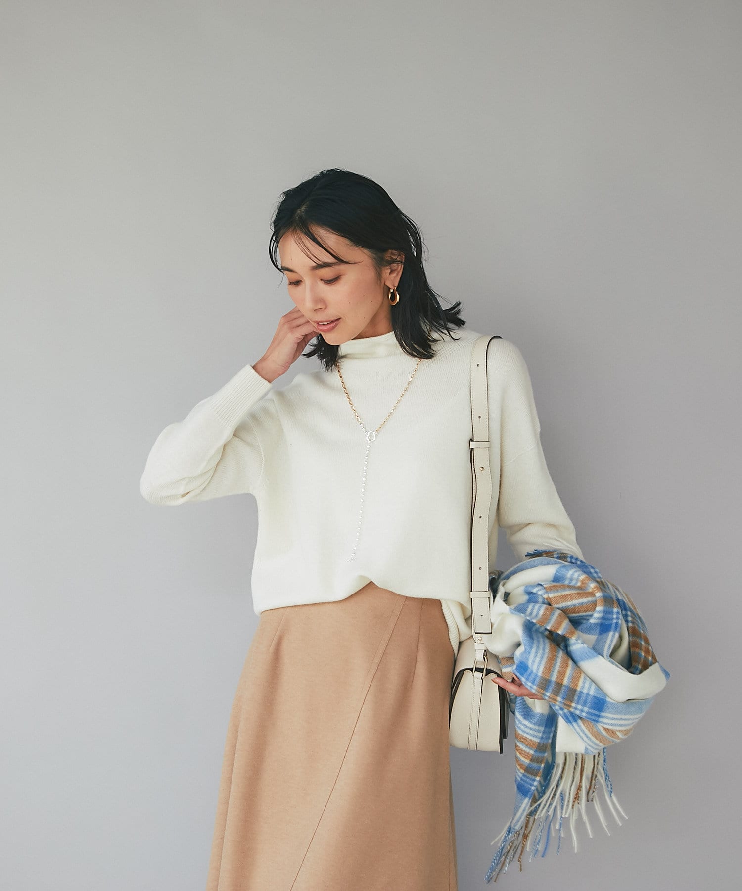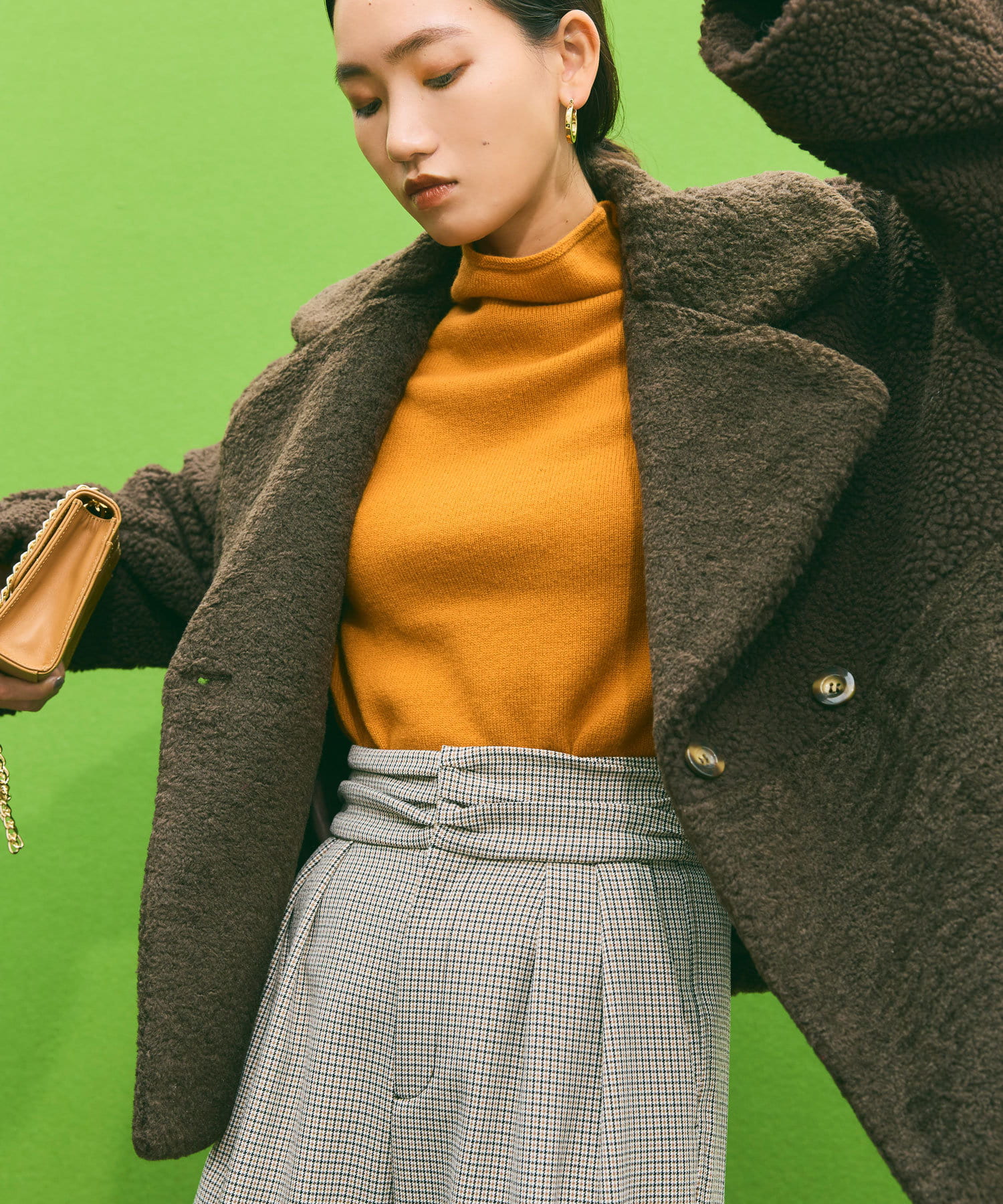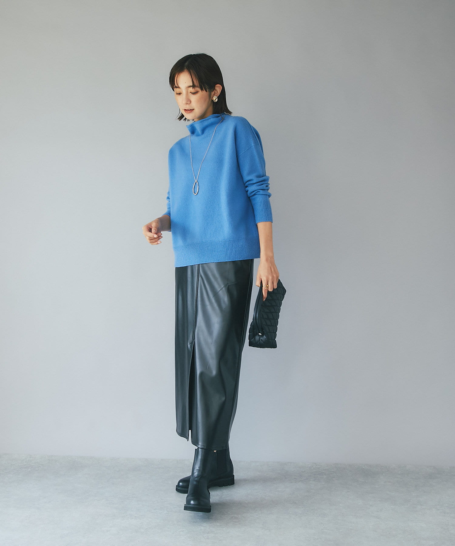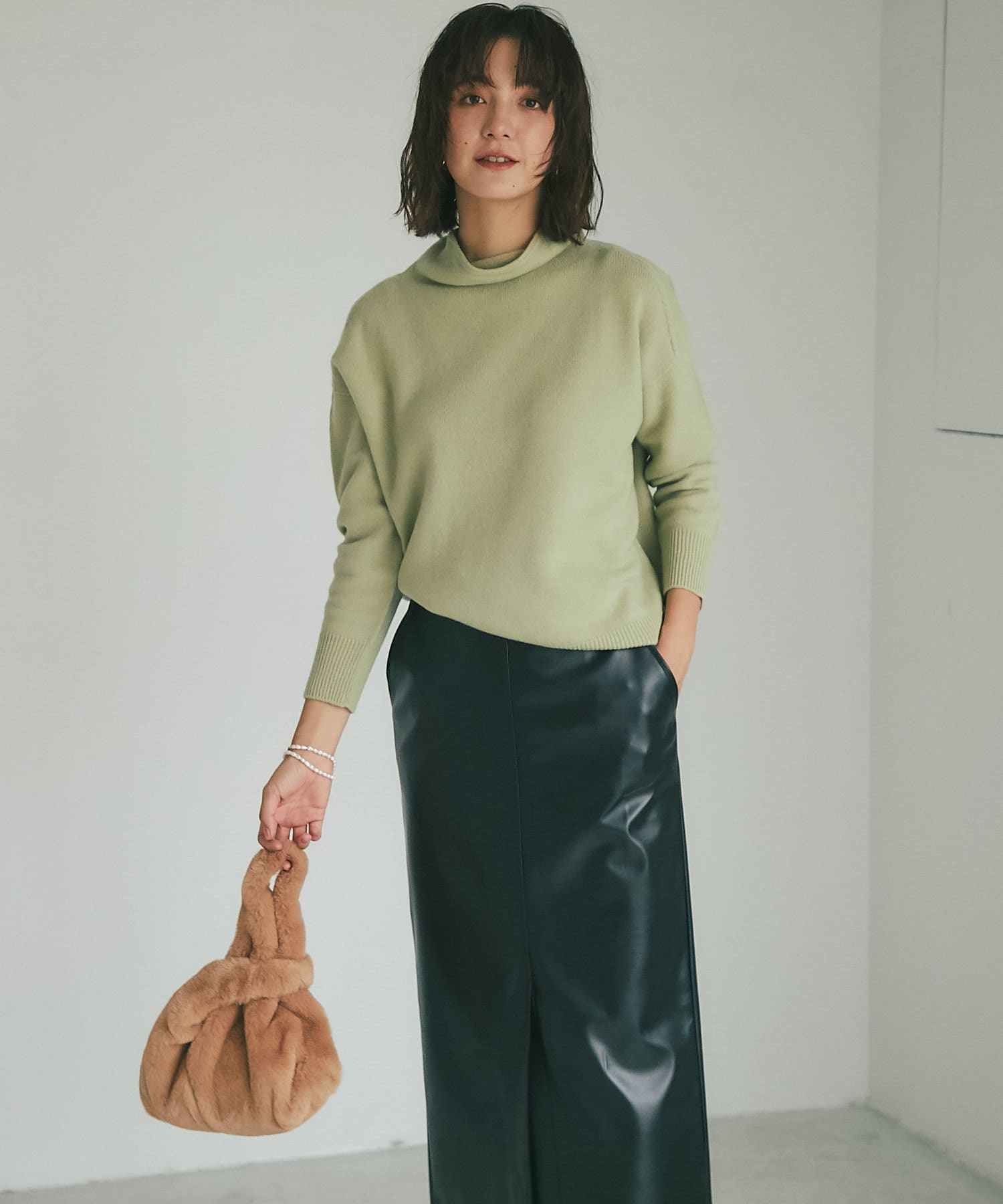 定番のボトルネックは、程良い高さで顔周りを華やかに見せてくれるシルエット。