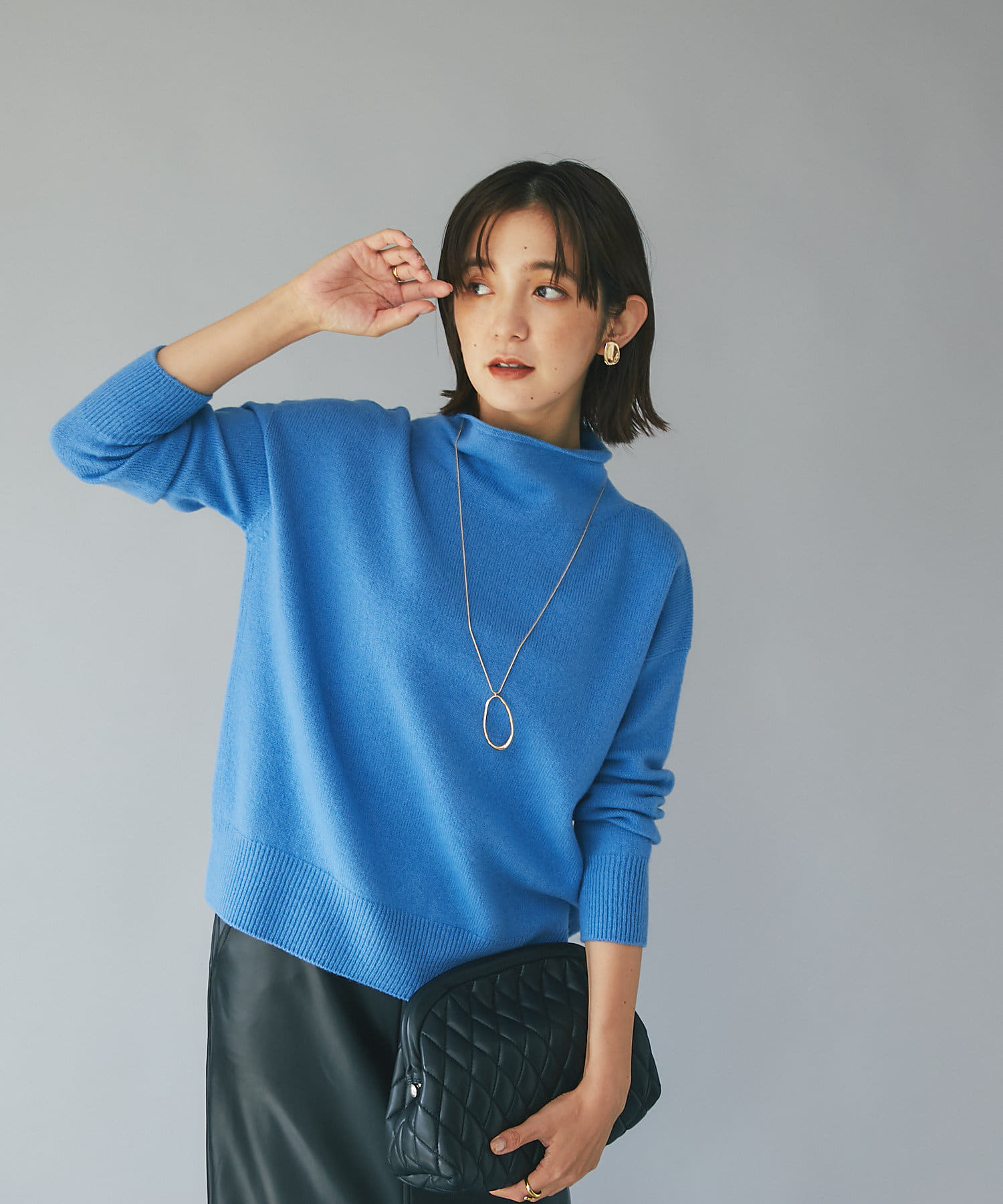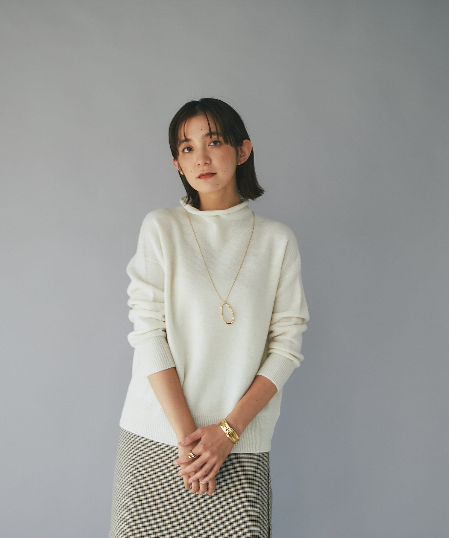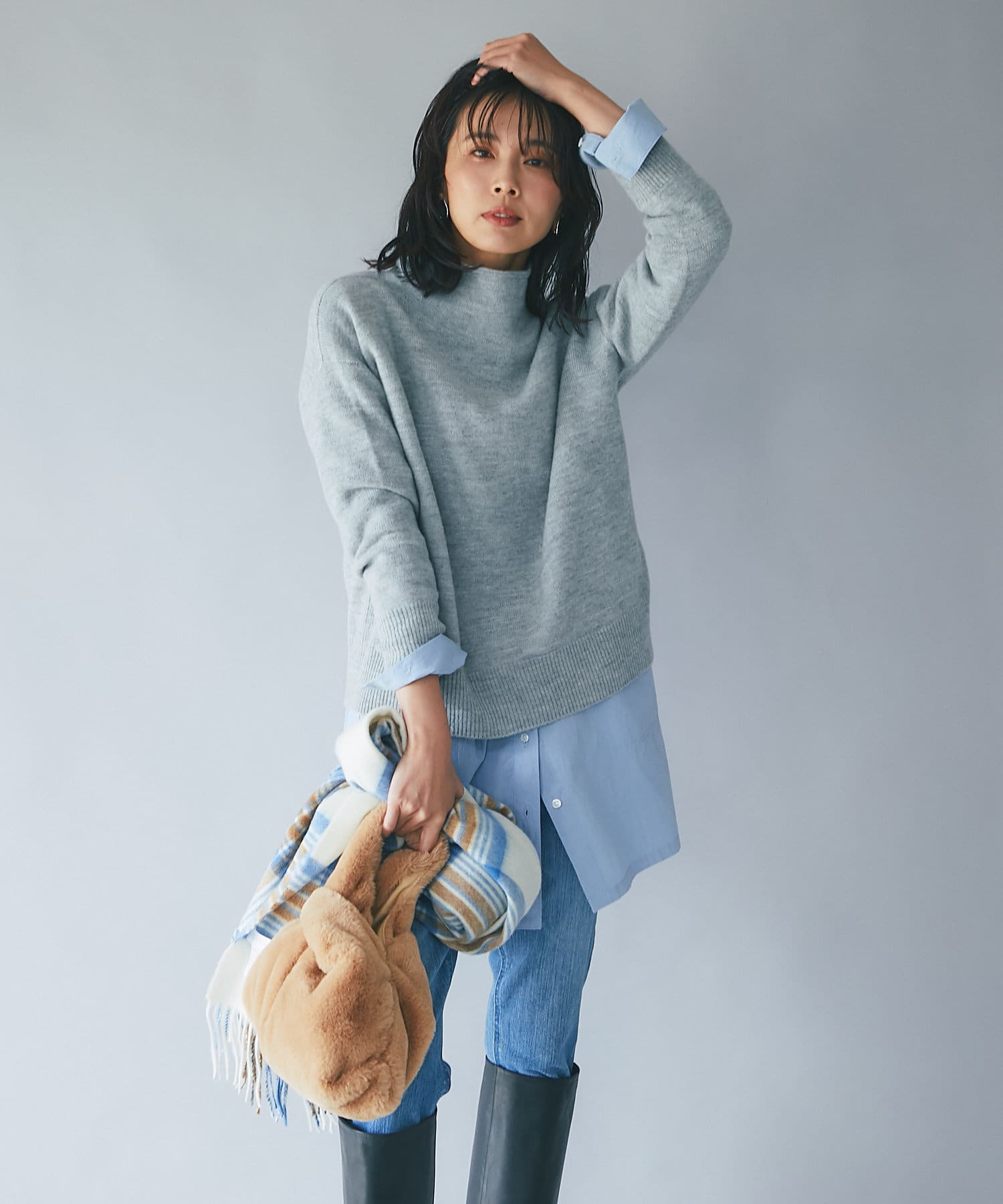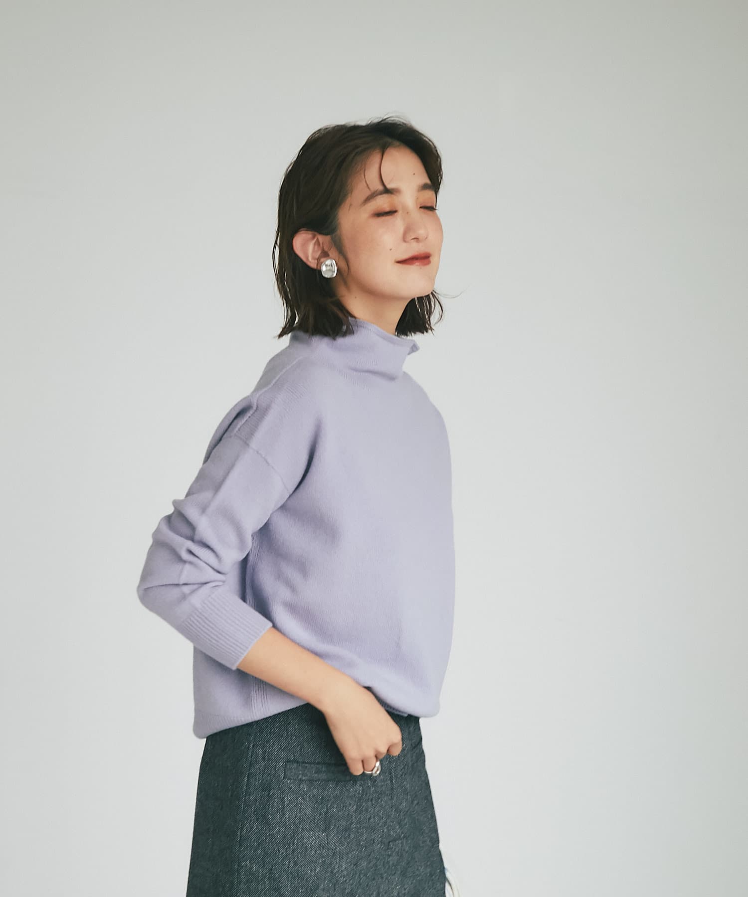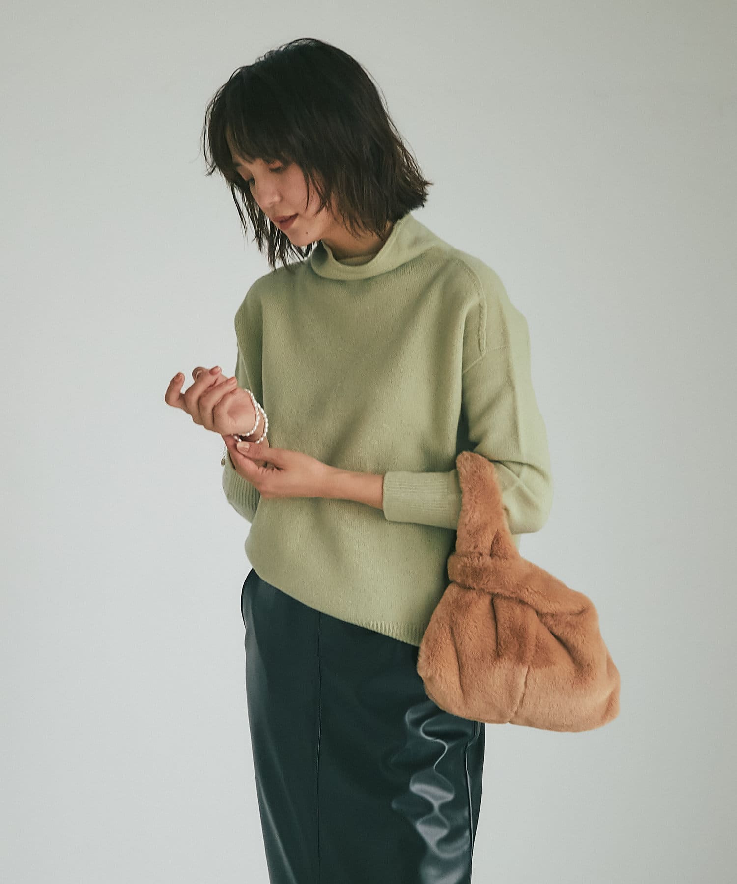 定番のボトルネックは、程良い高さで顔周りを華やかに見せてくれるシルエット。