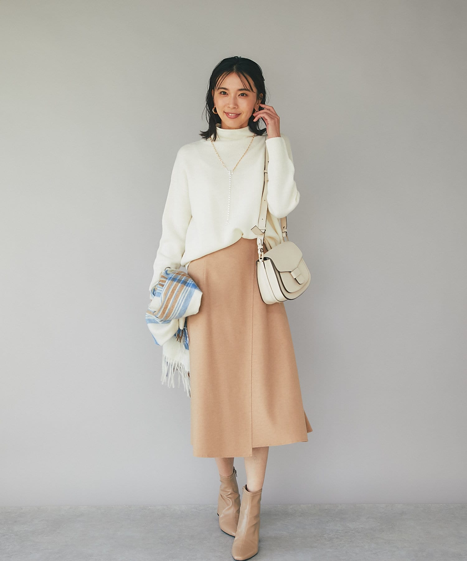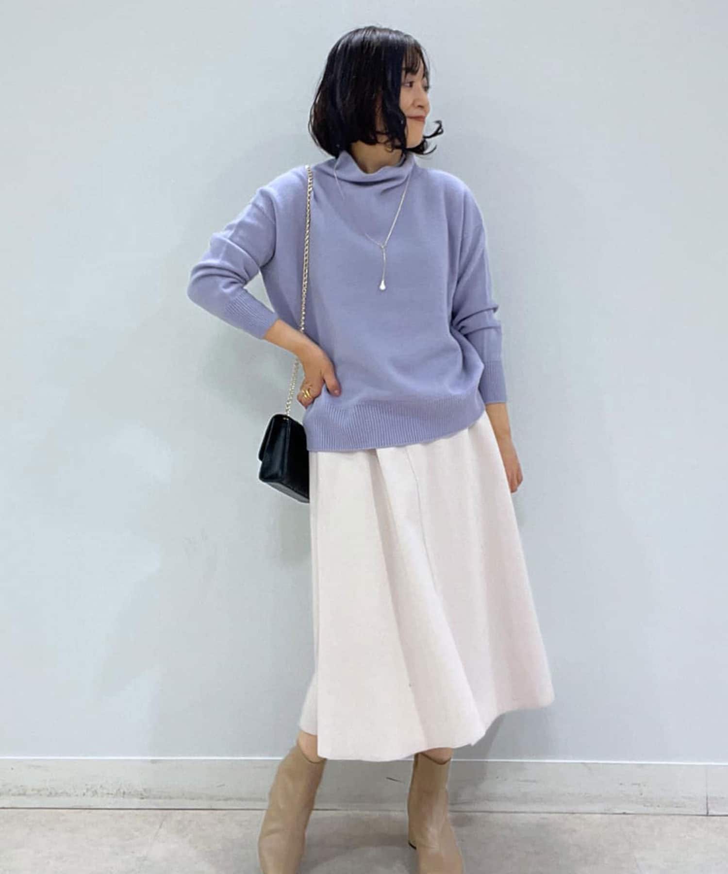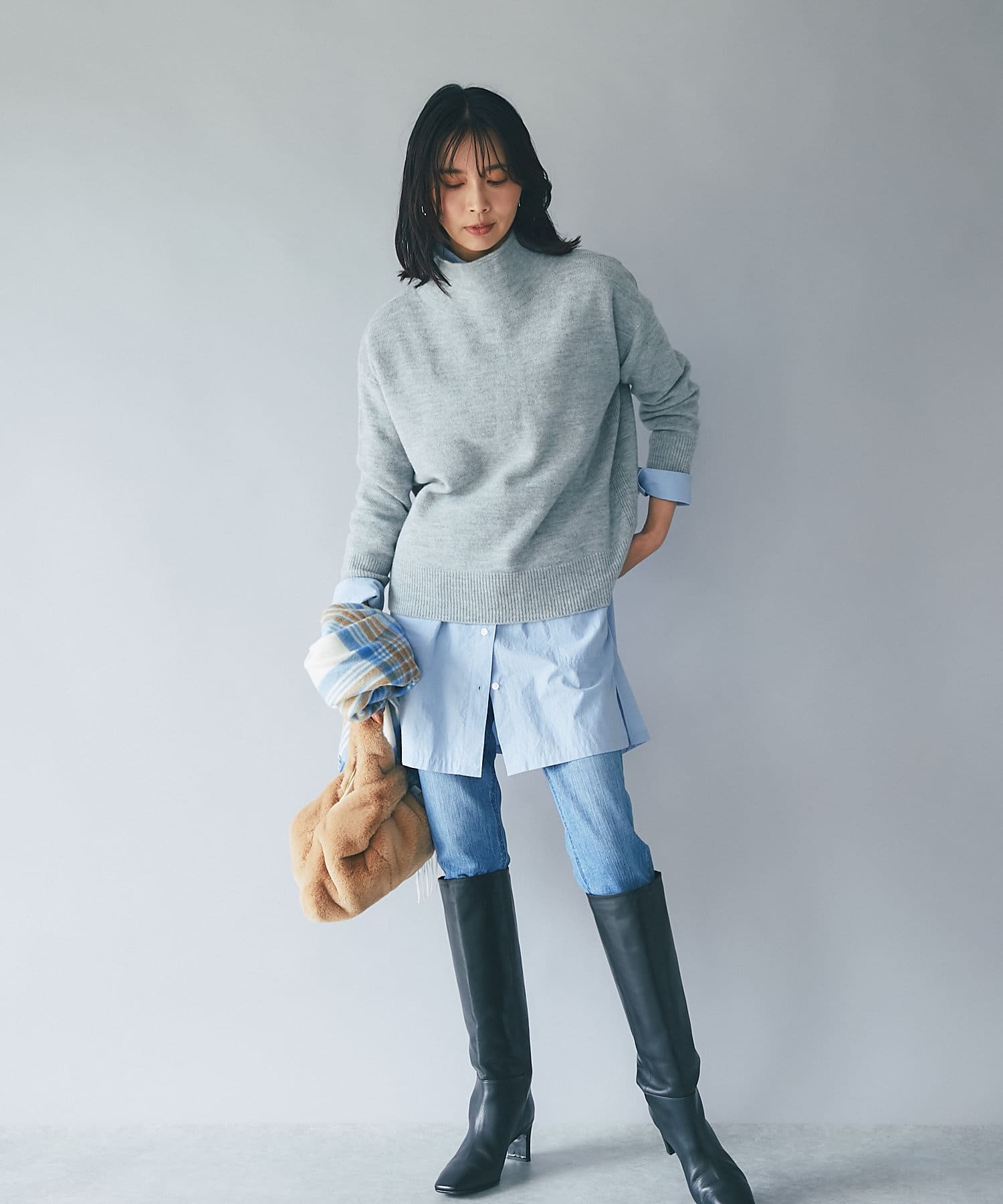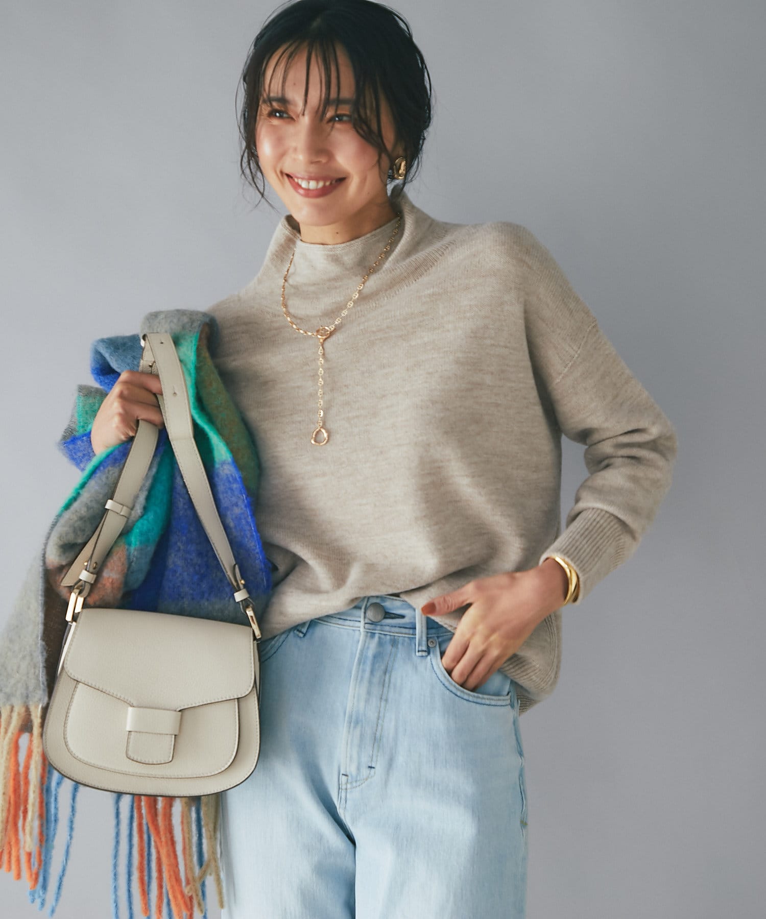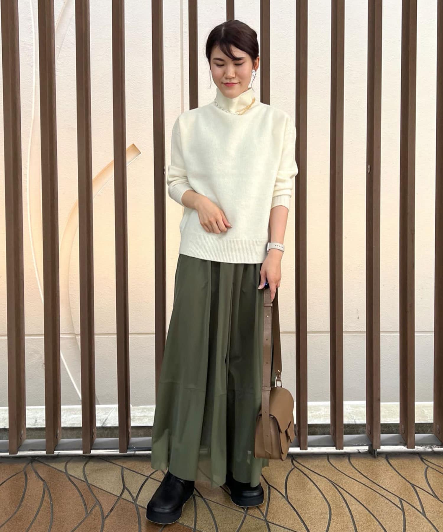 定番のボトルネックは、程良い高さで顔周りを華やかに見せてくれるシルエット。