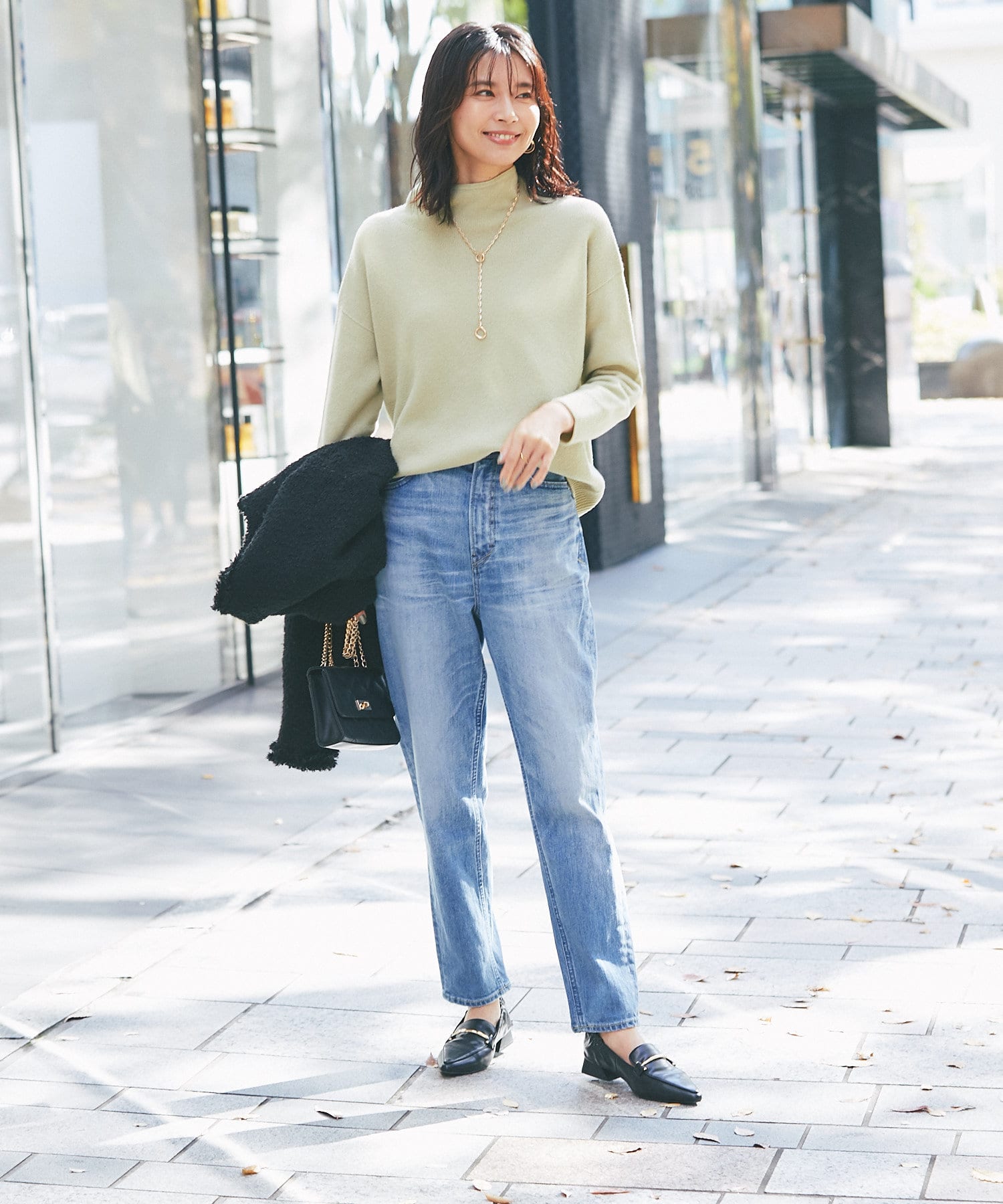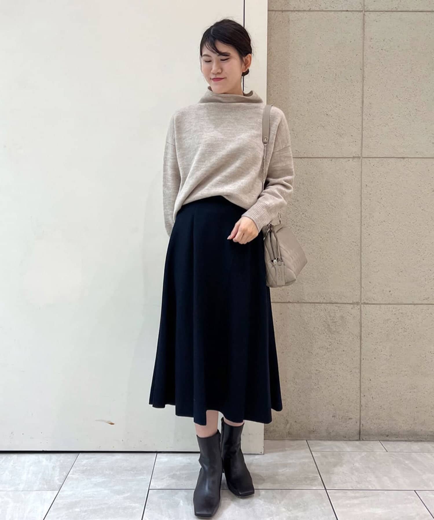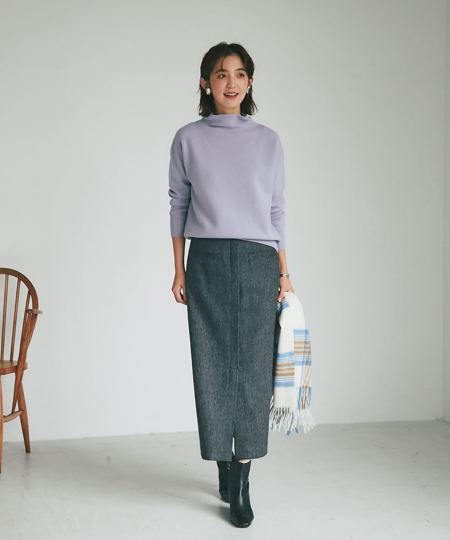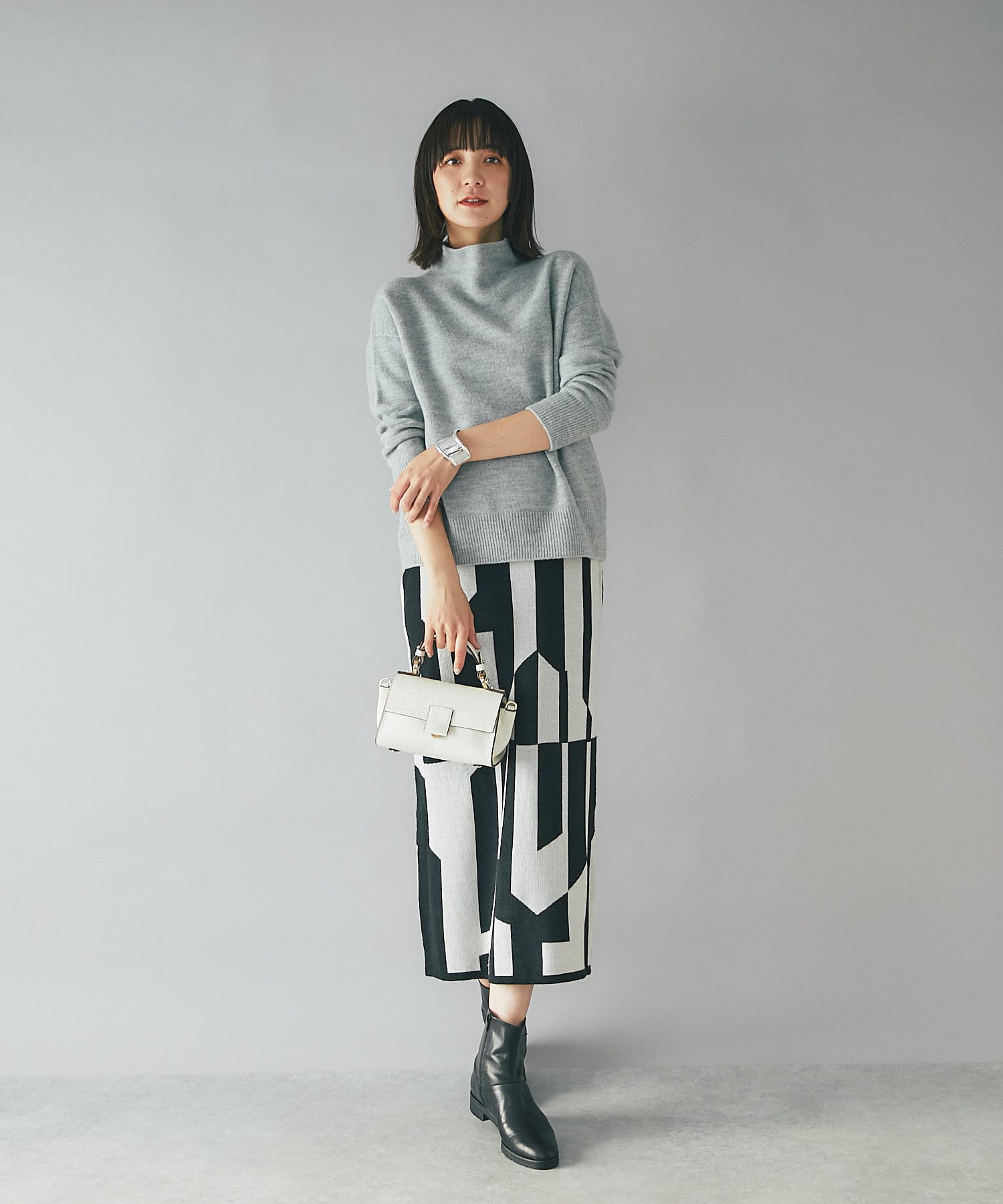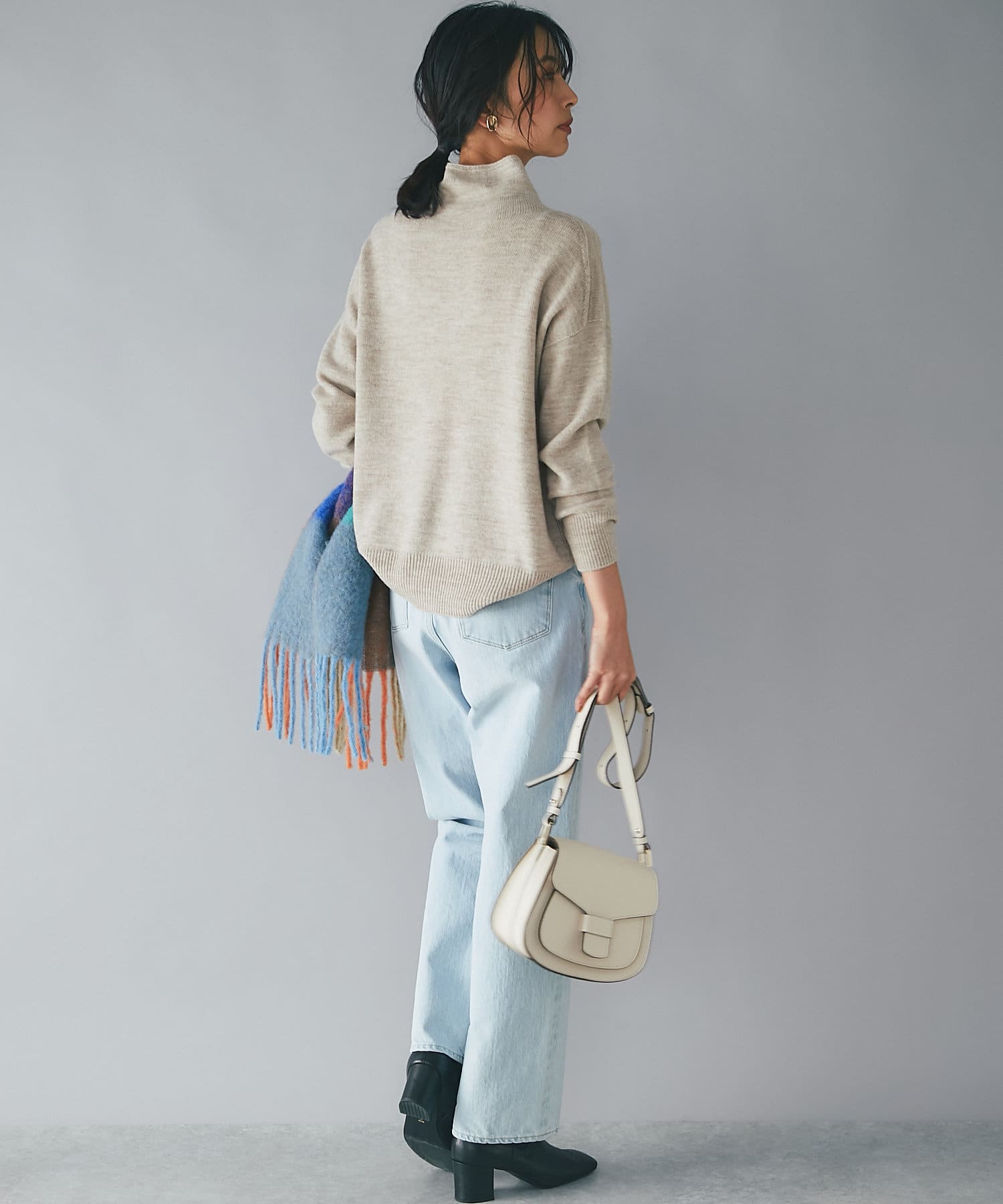 定番のボトルネックは、程良い高さで顔周りを華やかに見せてくれるシルエット。