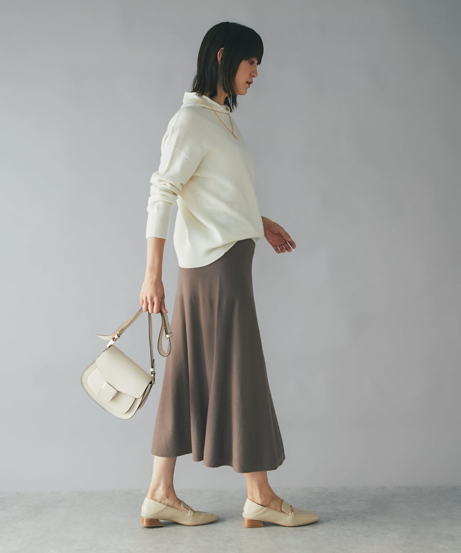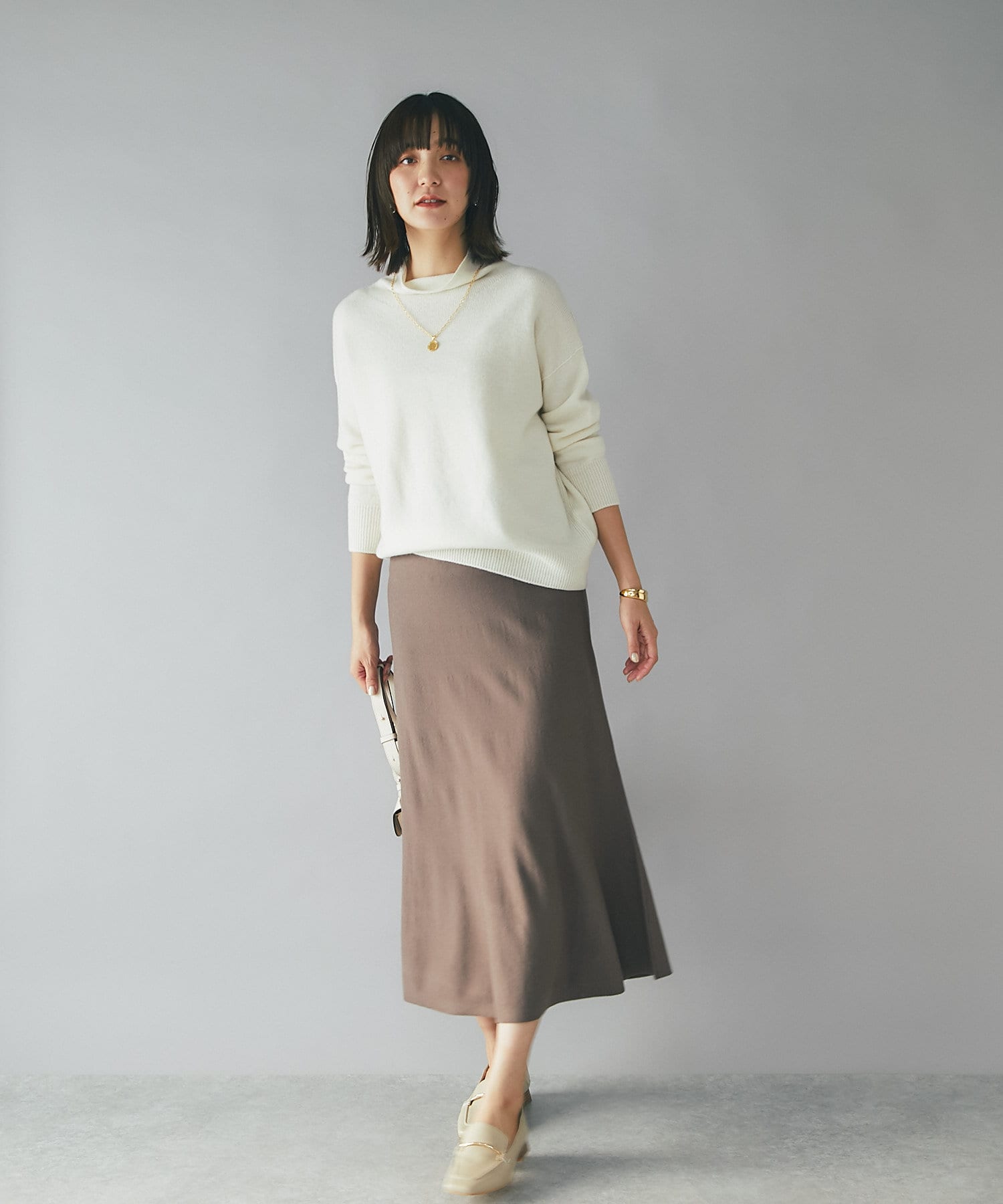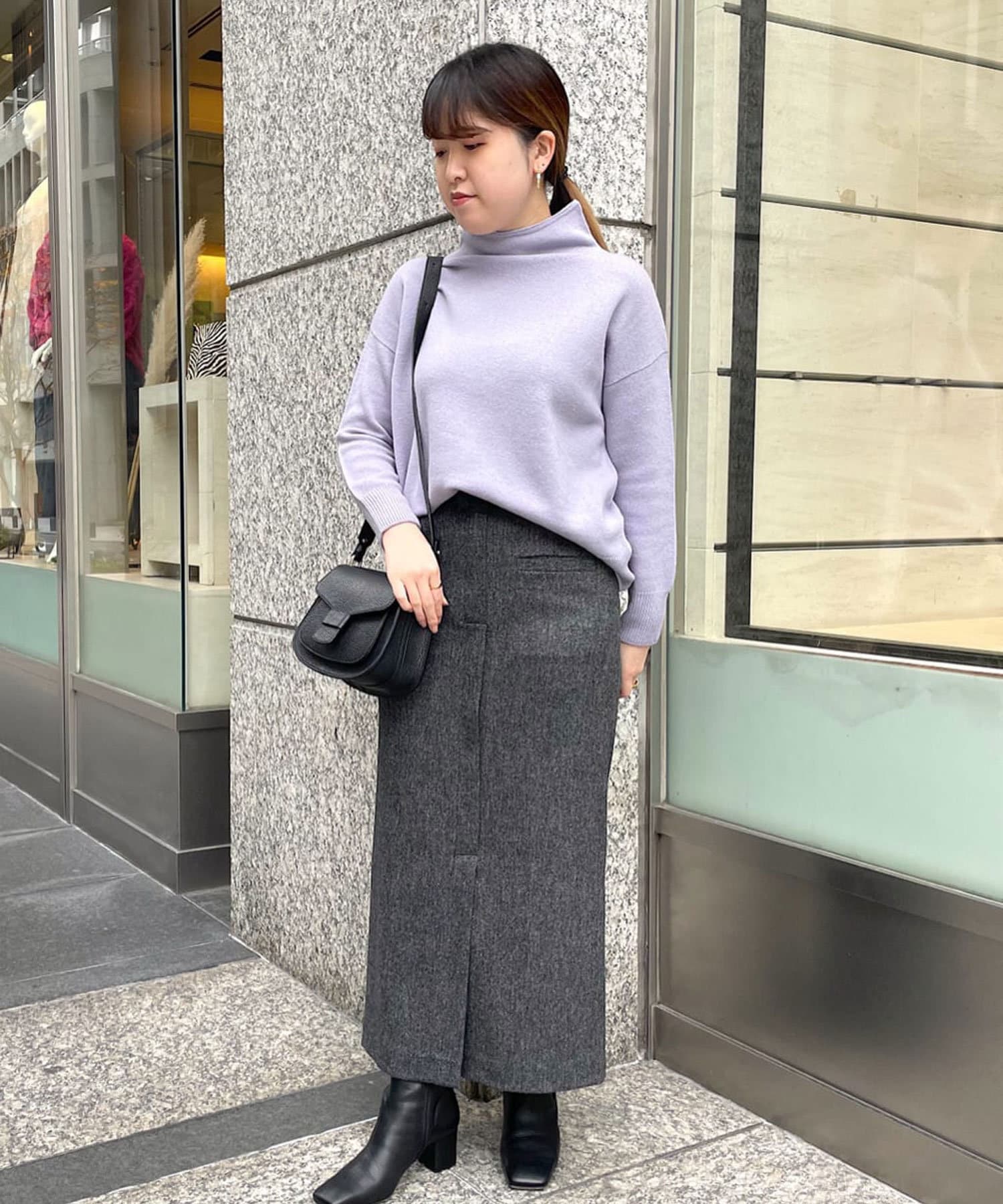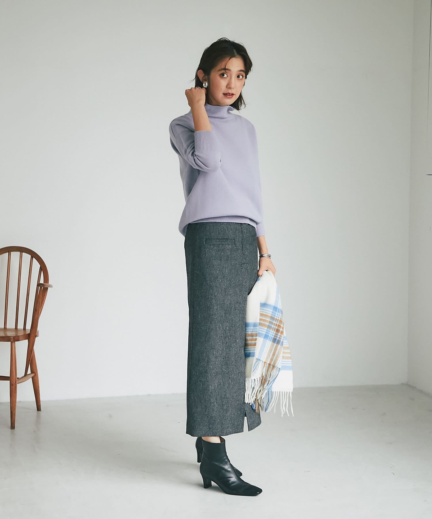定番のボトルネックは、程良い高さで顔周りを華やかに見せてくれるシルエット。