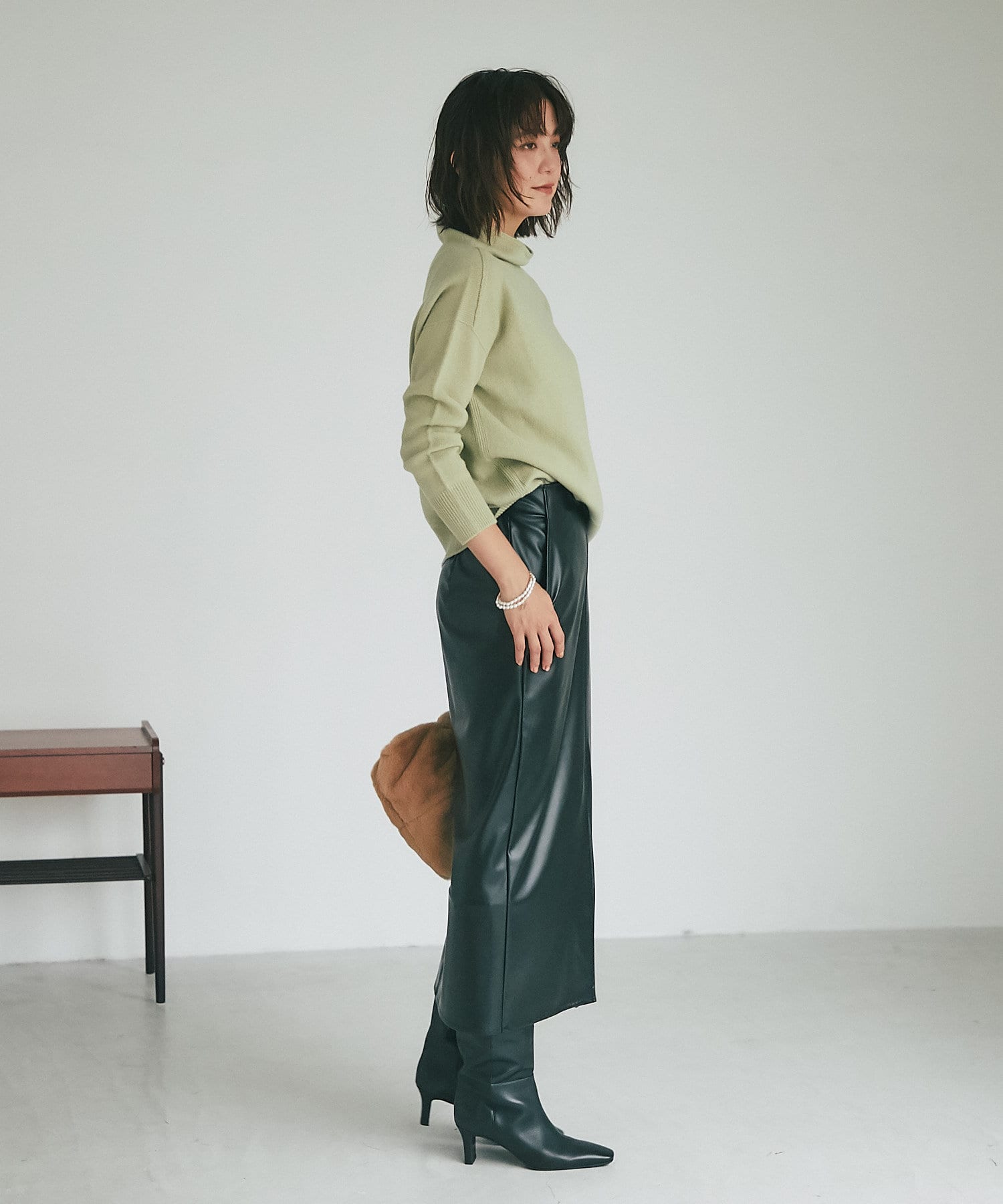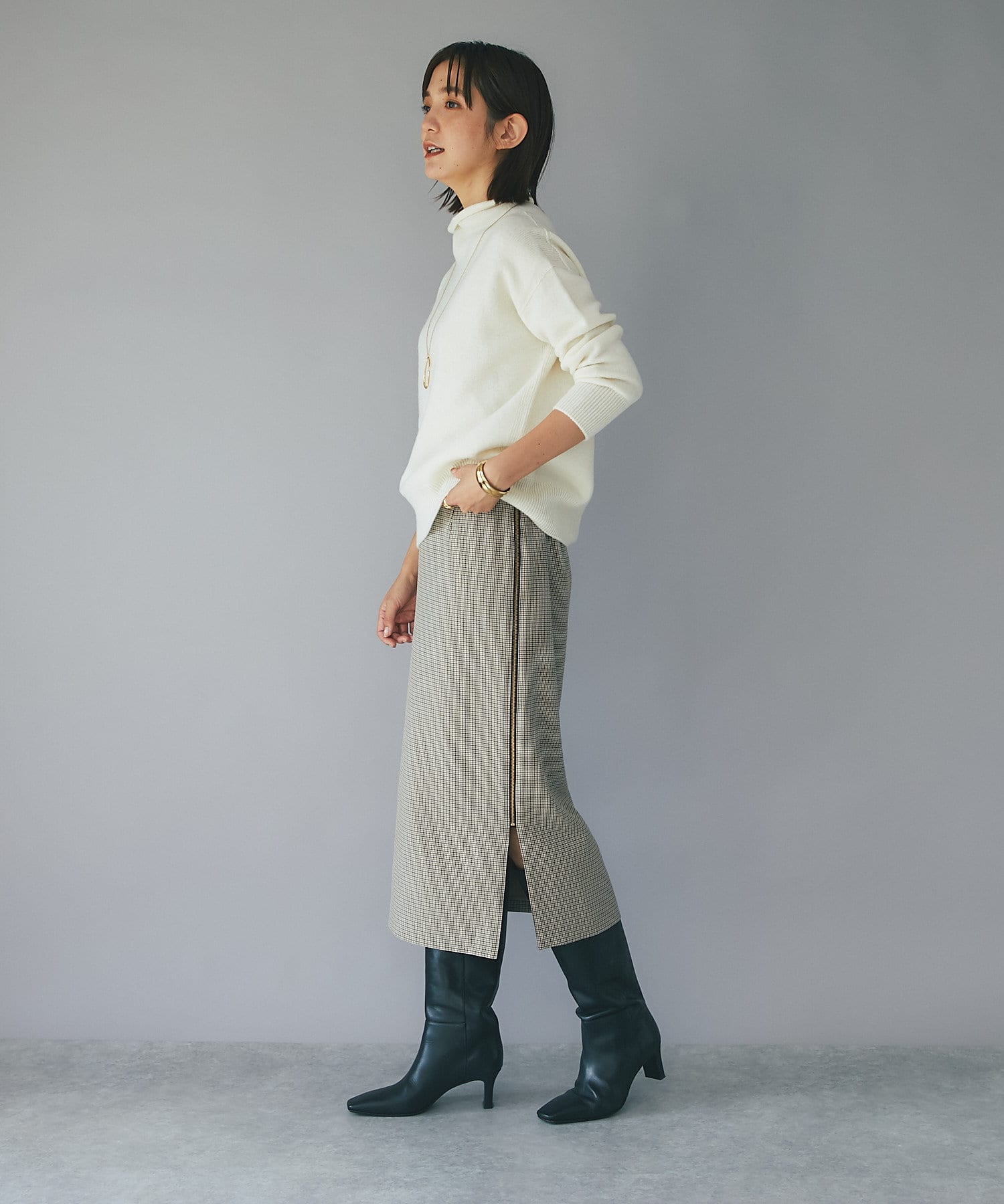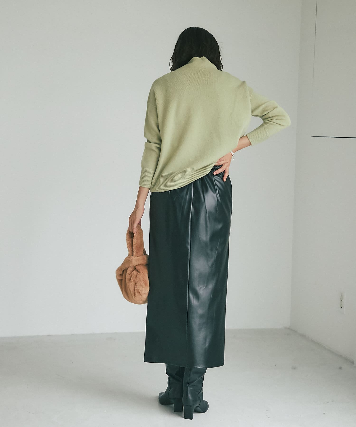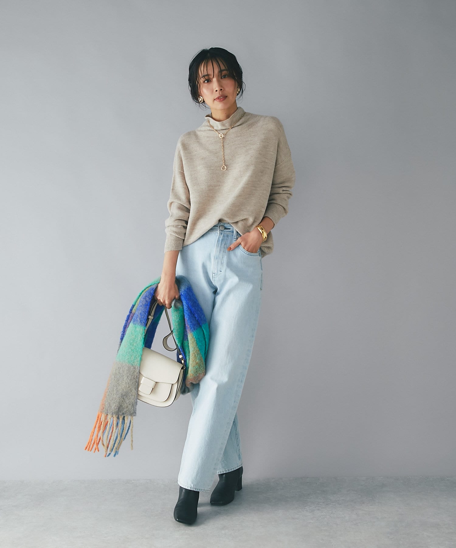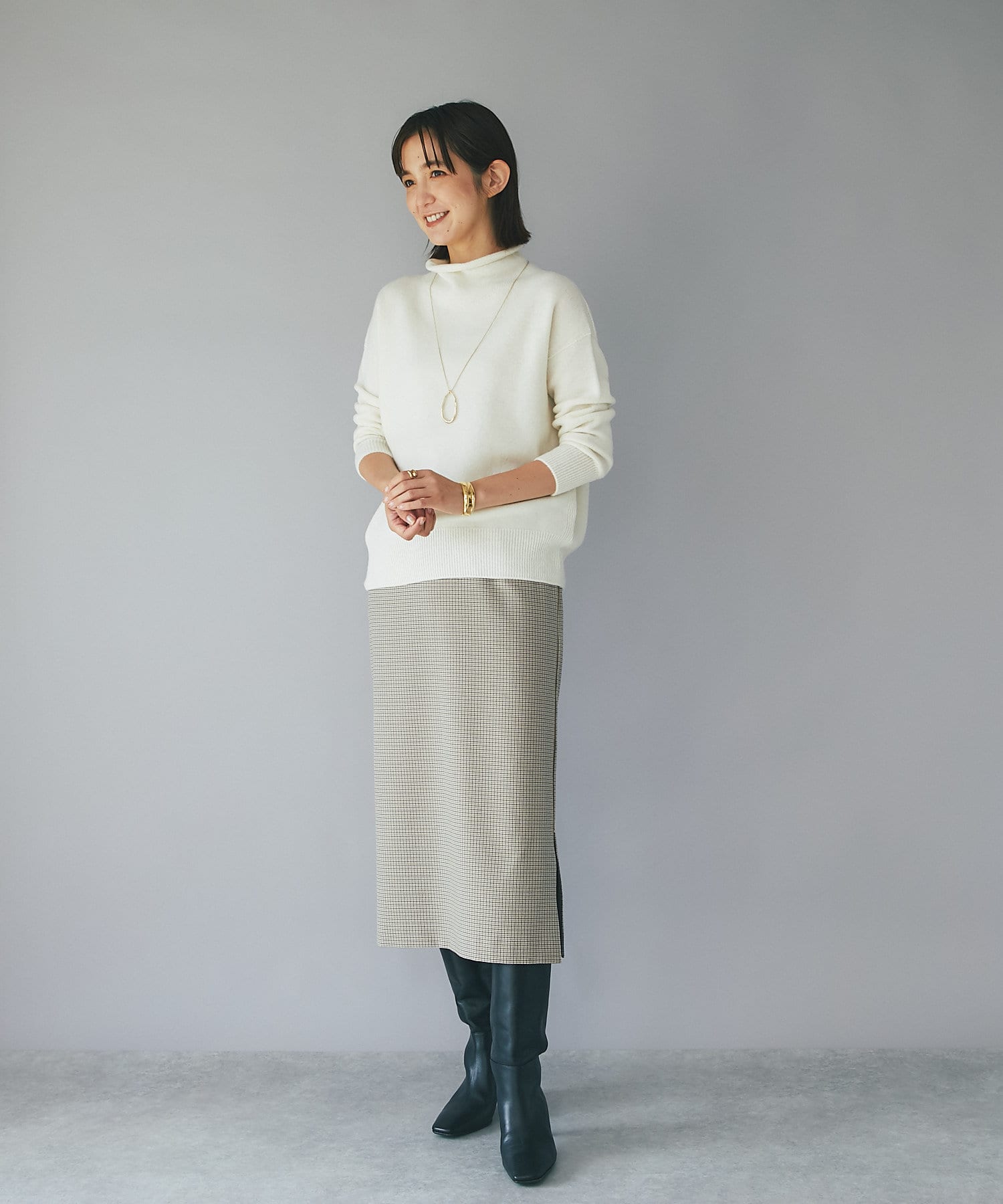 定番のボトルネックは、程良い高さで顔周りを華やかに見せてくれるシルエット。