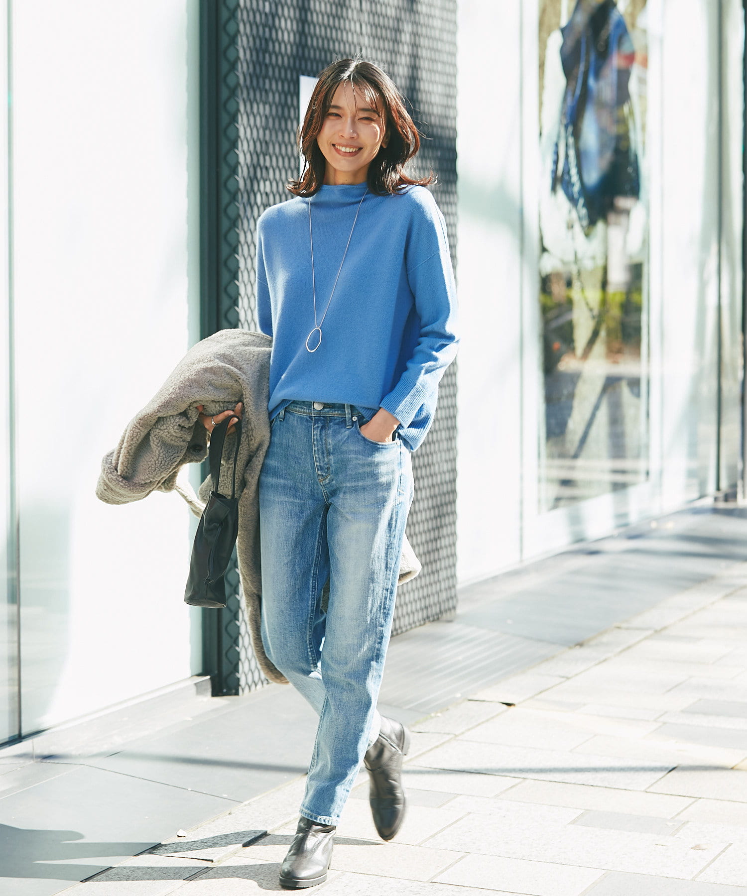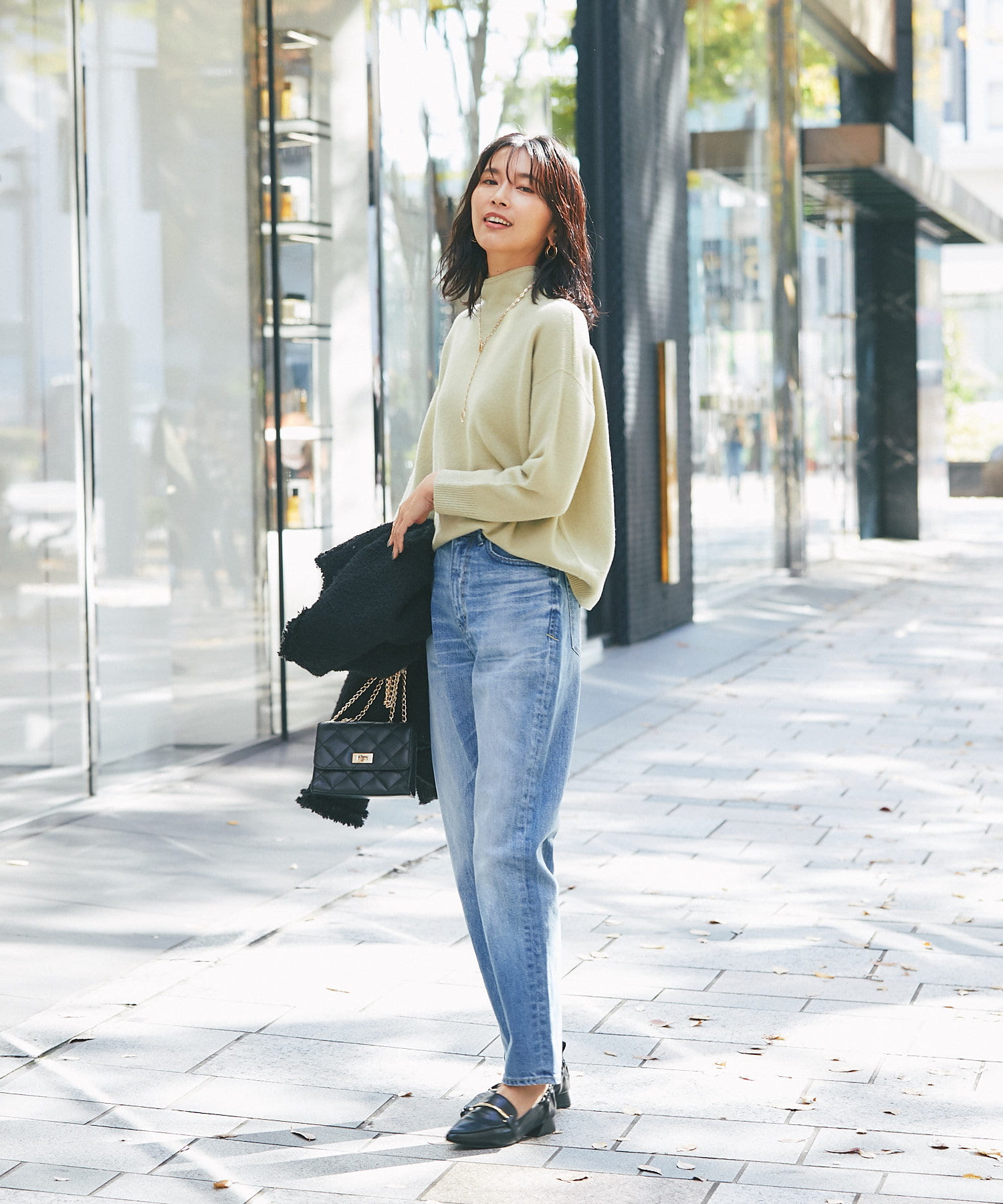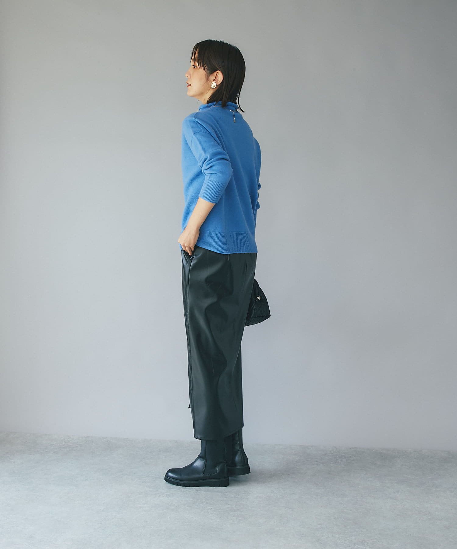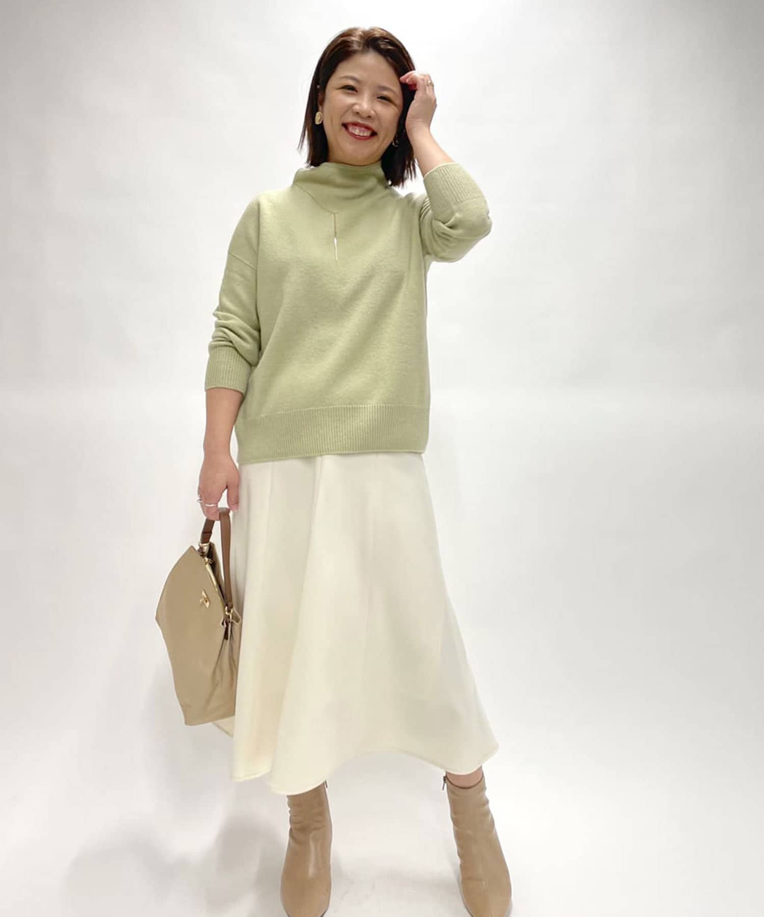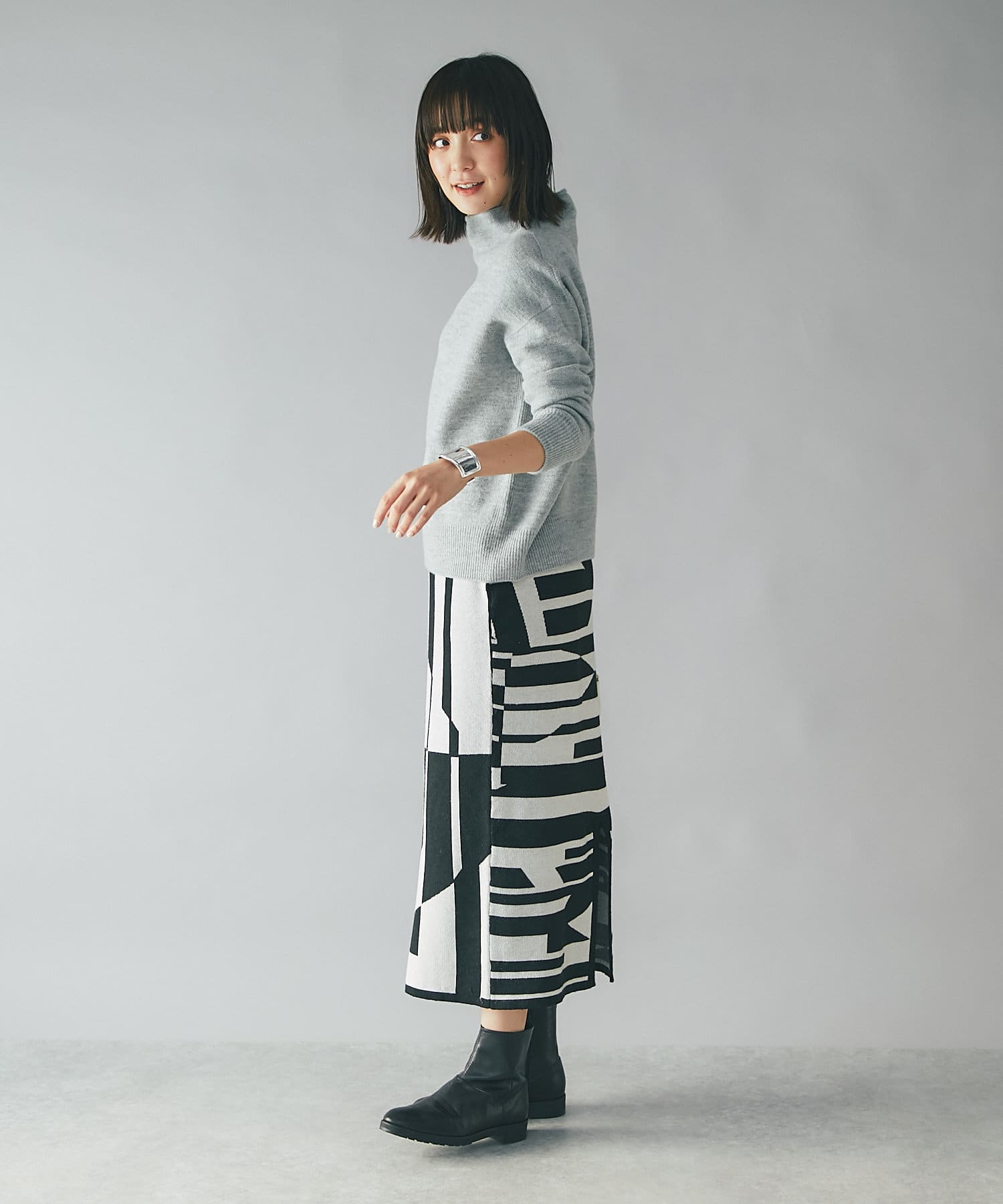 定番のボトルネックは、程良い高さで顔周りを華やかに見せてくれるシルエット。
