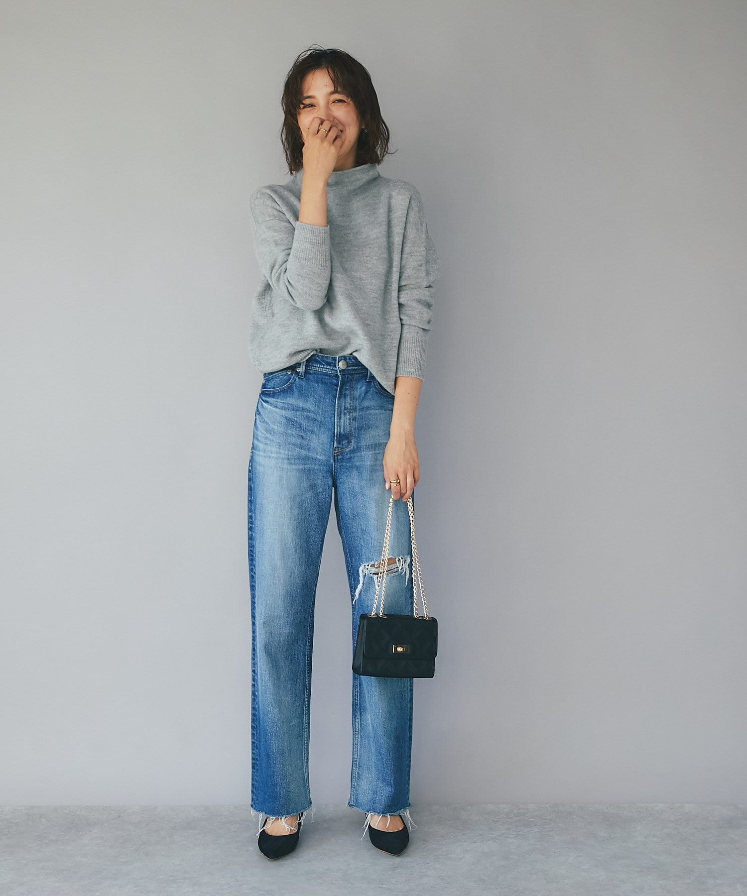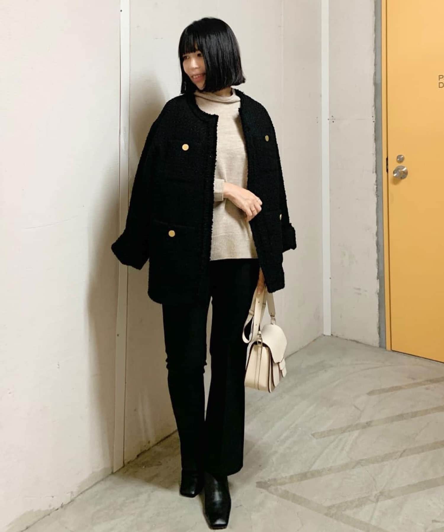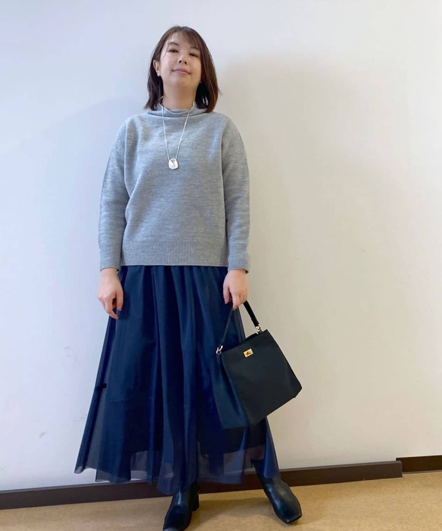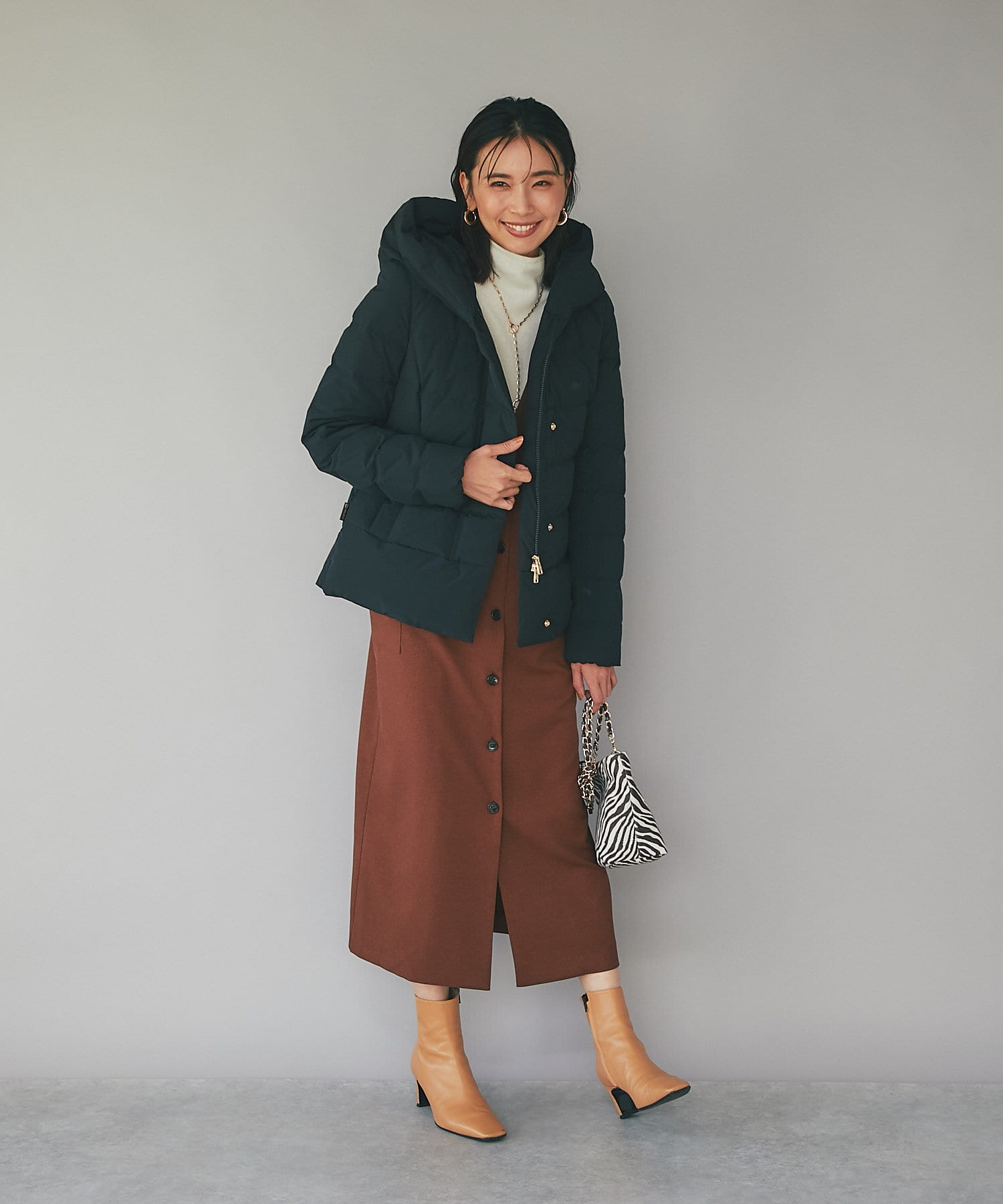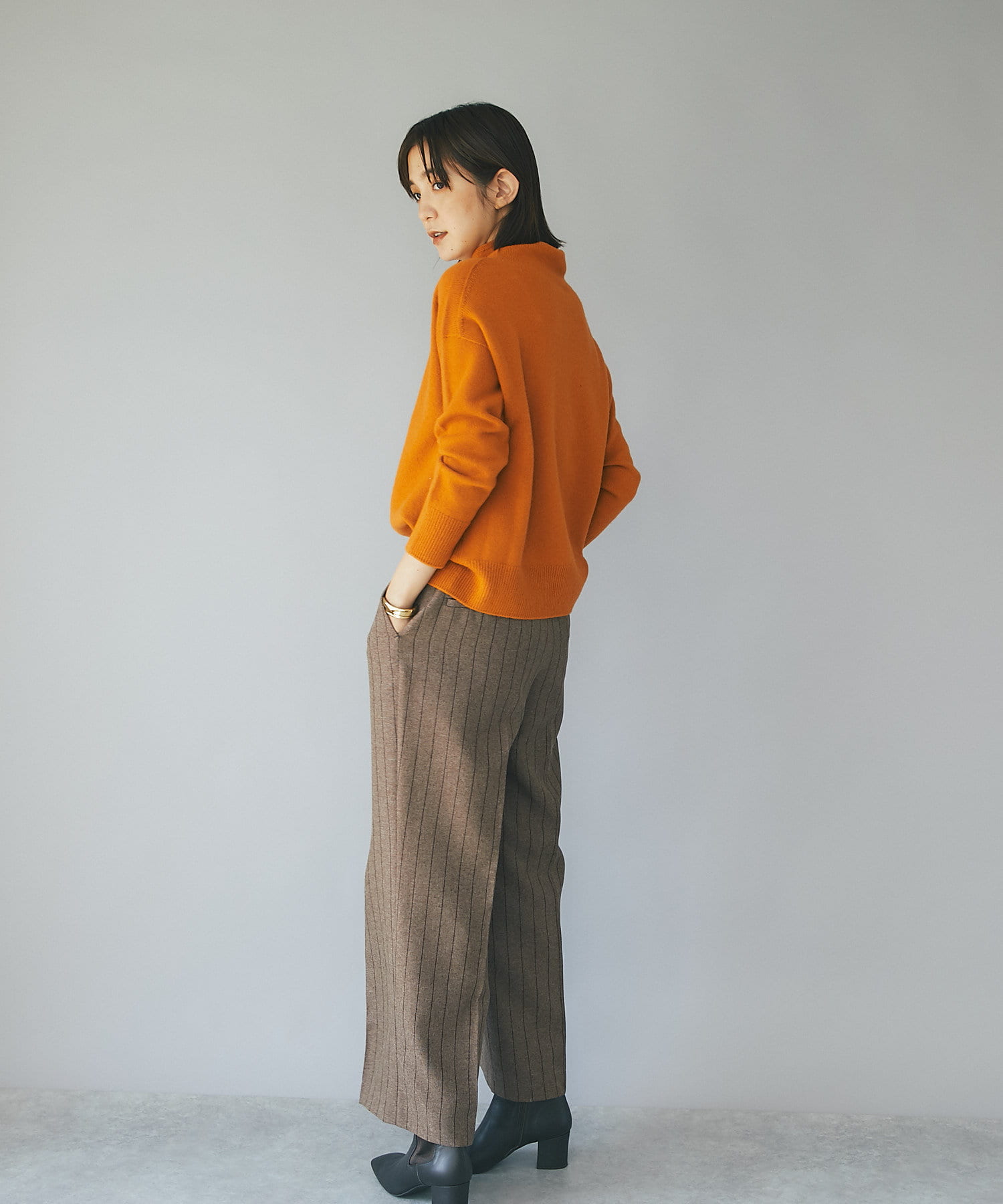 定番のボトルネックは、程良い高さで顔周りを華やかに見せてくれるシルエット。