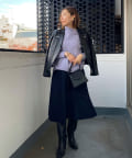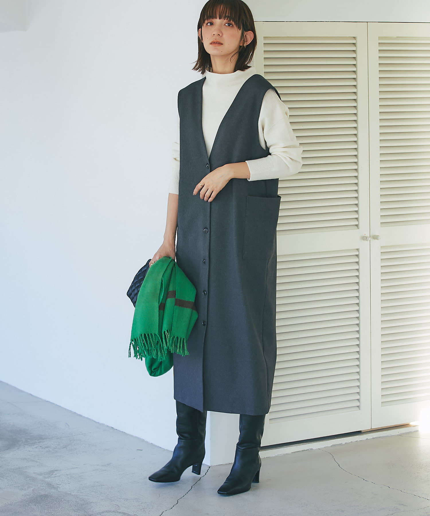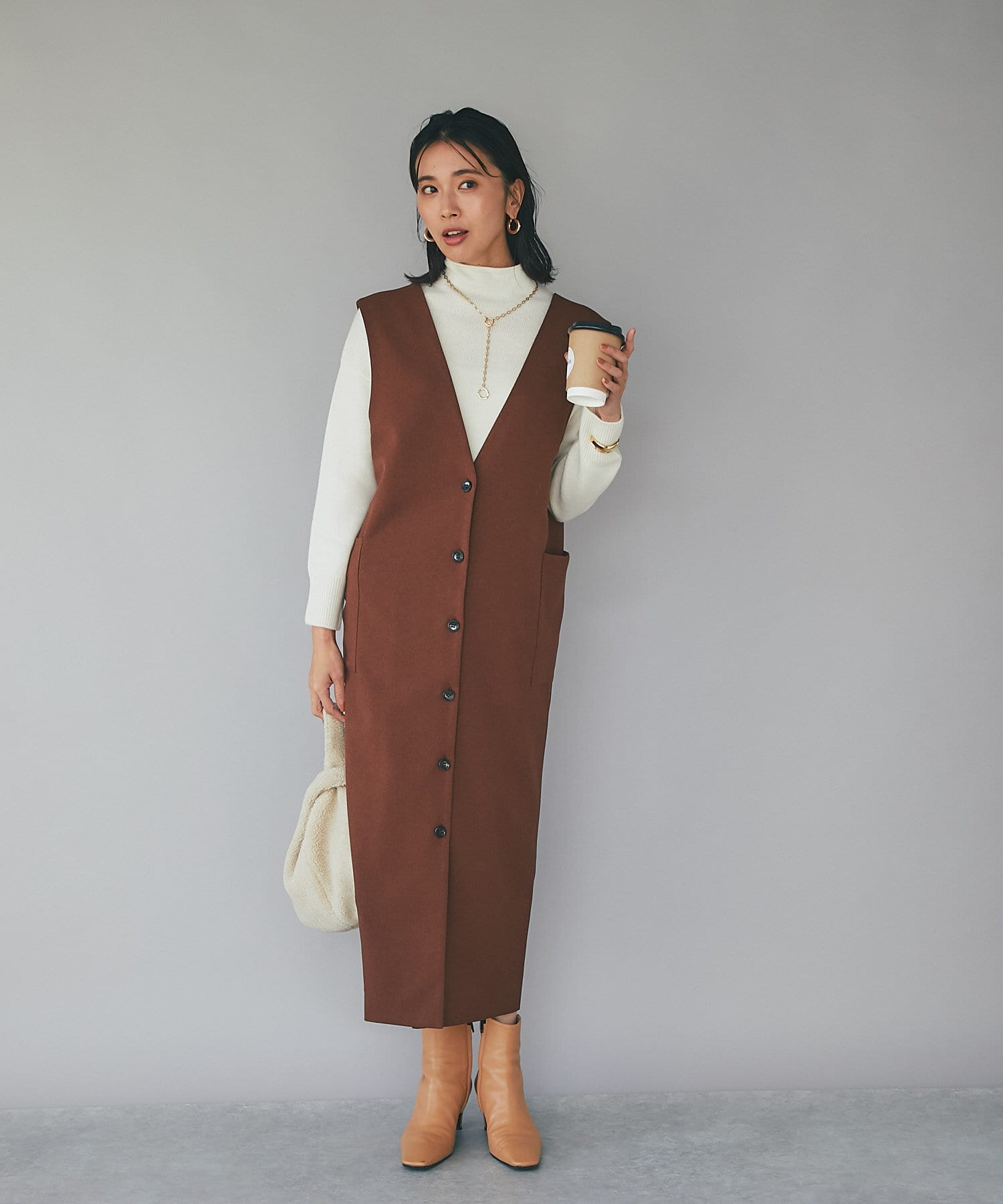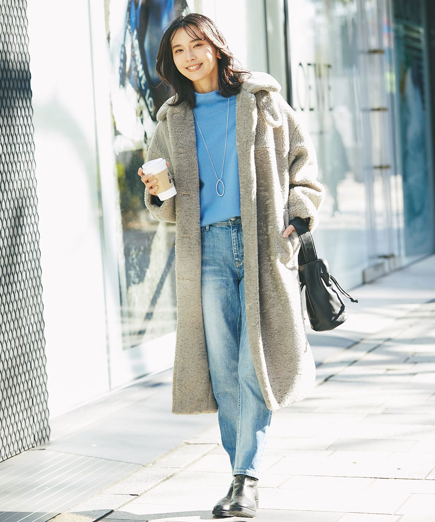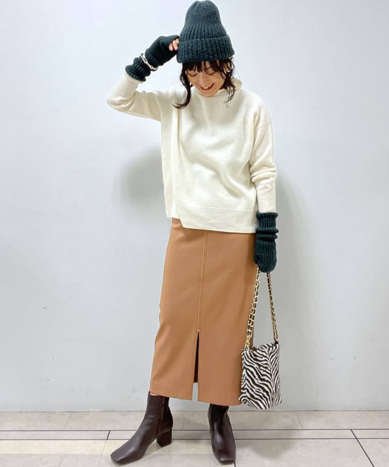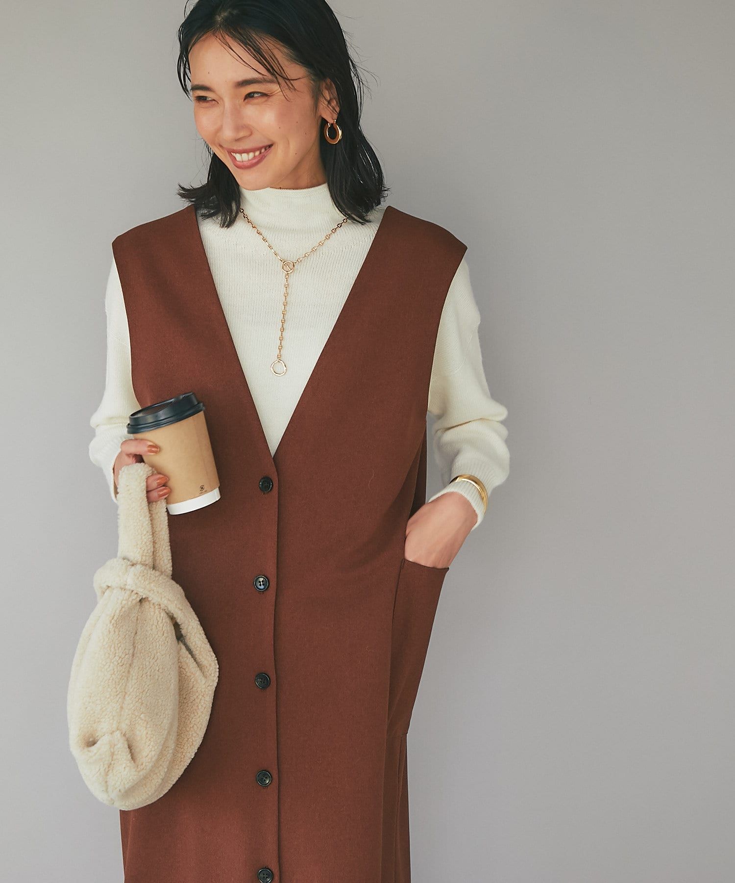 定番のボトルネックは、程良い高さで顔周りを華やかに見せてくれるシルエット。