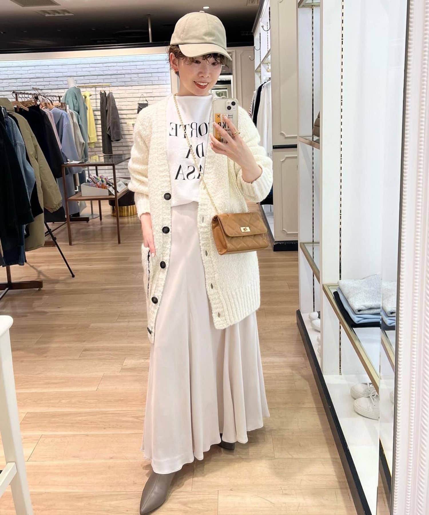 ⇒少し厚みのある素材のため、暑がりな方や室内で過ごす時間が長い方は冬場でも快適に着ていただけるかと思います。ゆったりしたシルエットで中にも着込めるため、シアーカットソーや薄手のタートルネックセーターなどを重ねたレイヤードスタイルもおすすめです。