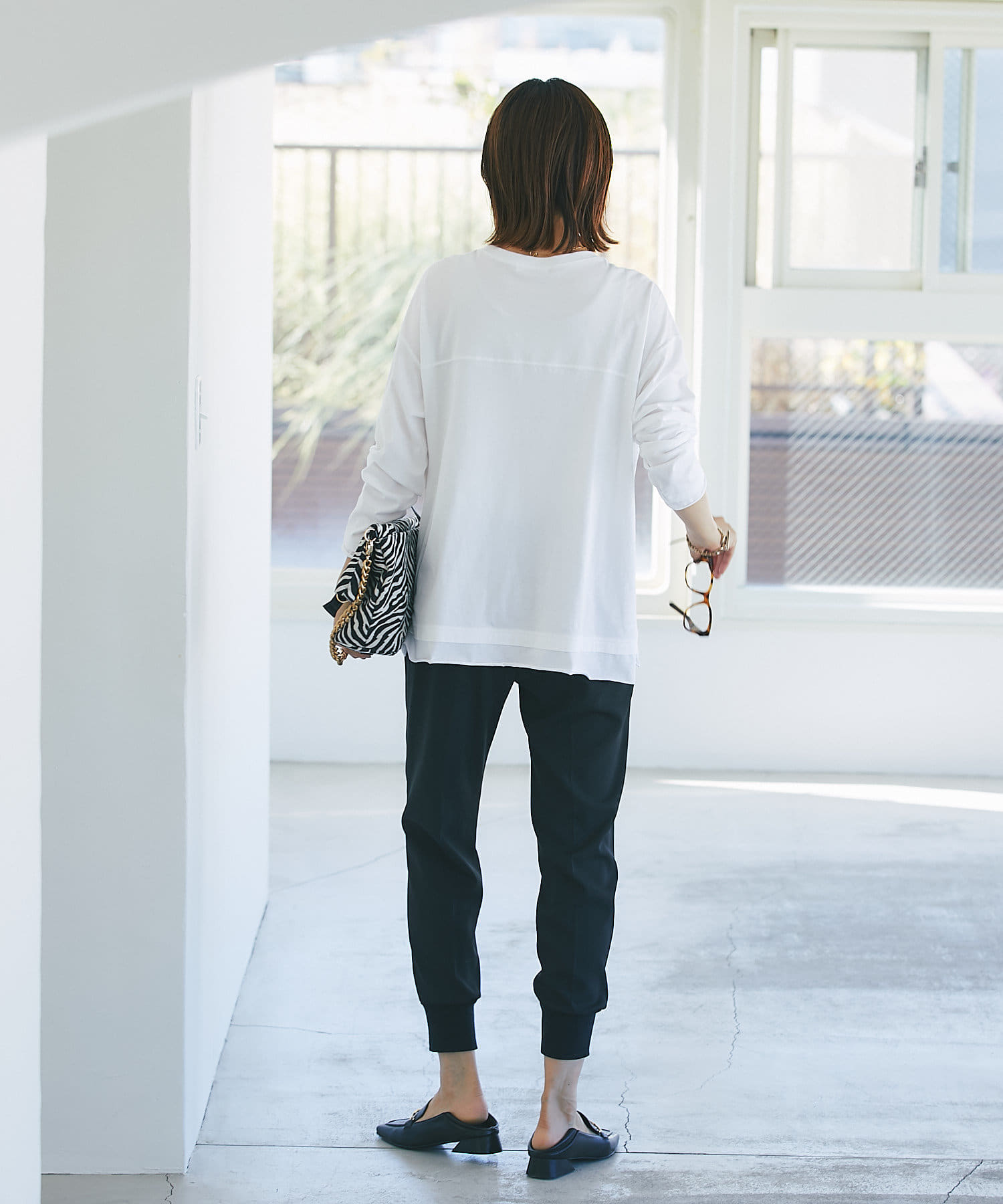 バックスタイルはヨークデザインで1枚でも素敵に着られます。程良い厚みで柔らかく、通年着られる生地感となっております。