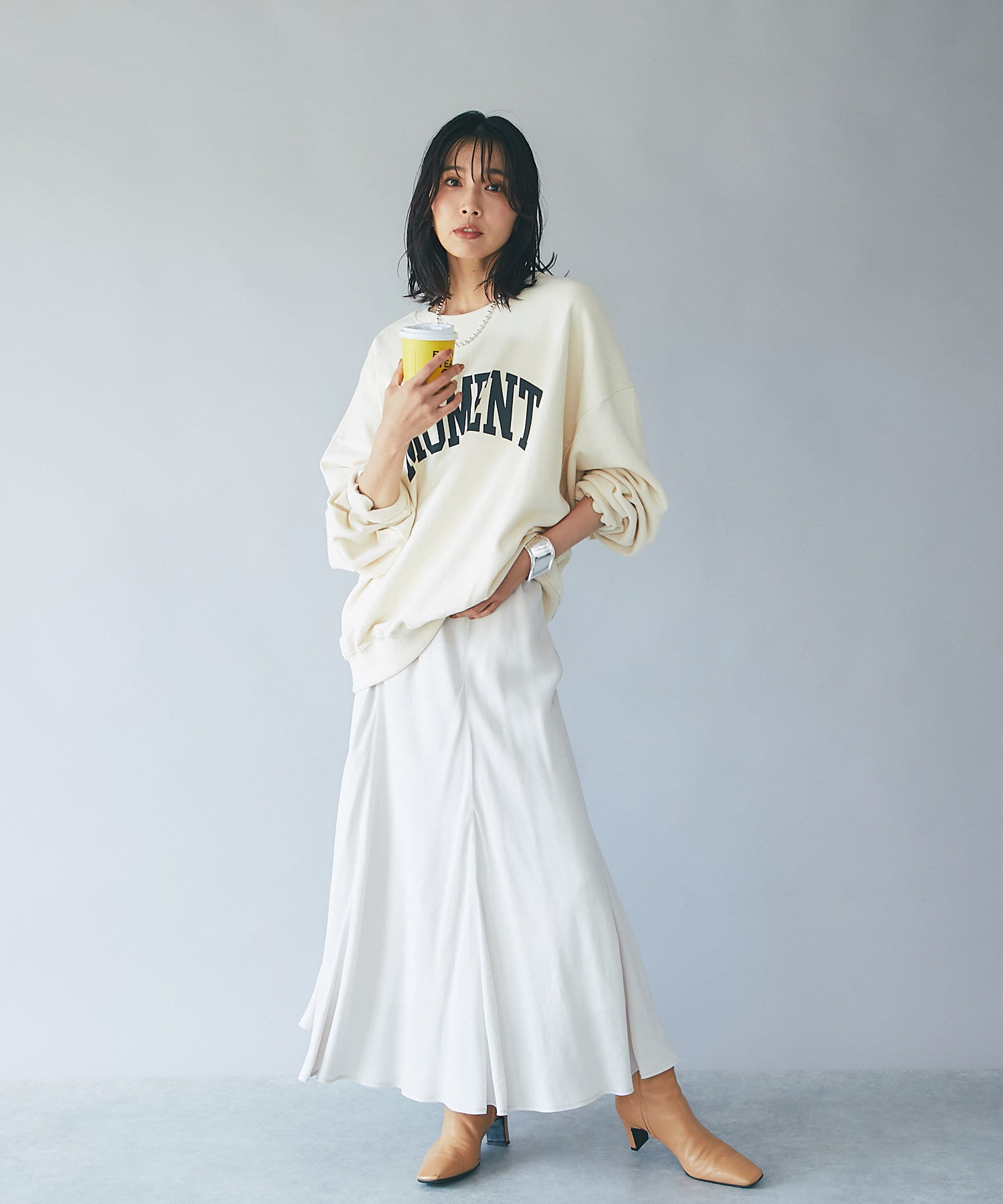 また、今季らしい、シャツやカットソーなどを裾からチラリと見せたレイヤードスタイルにもオススメ。