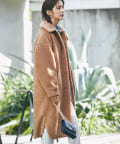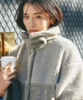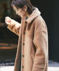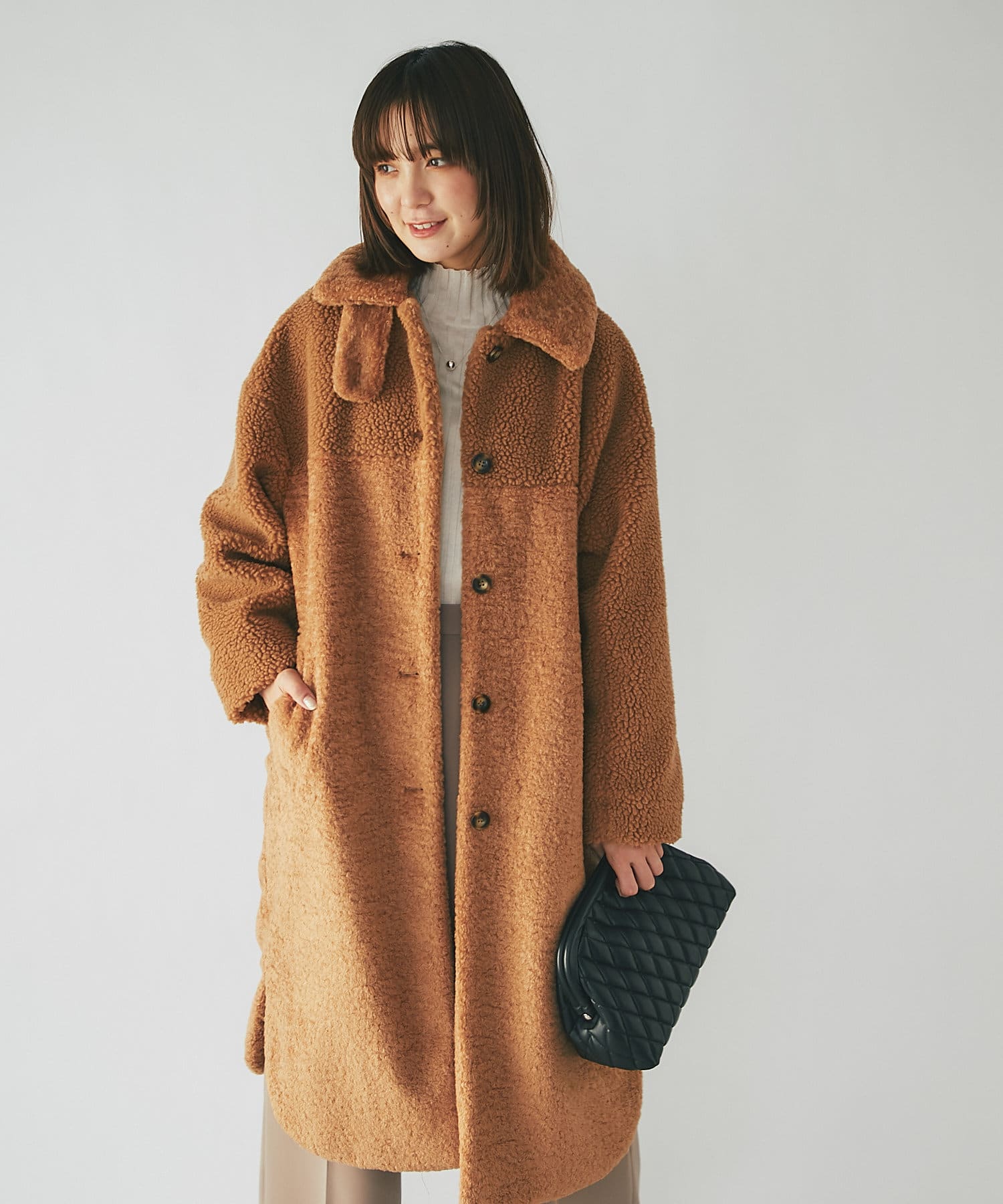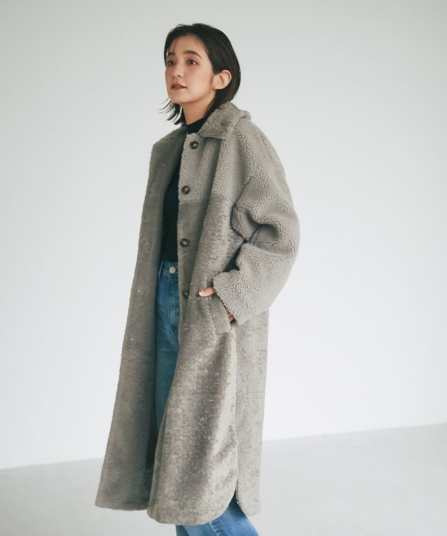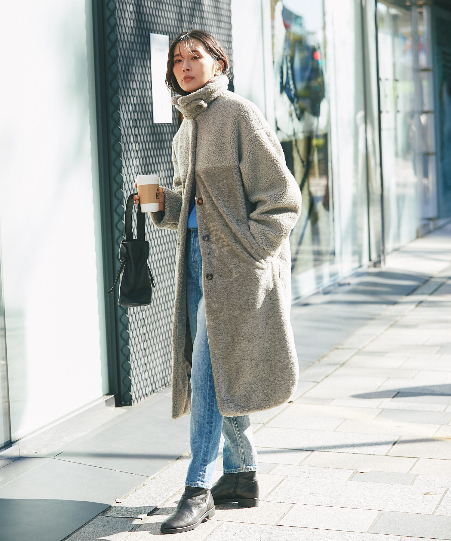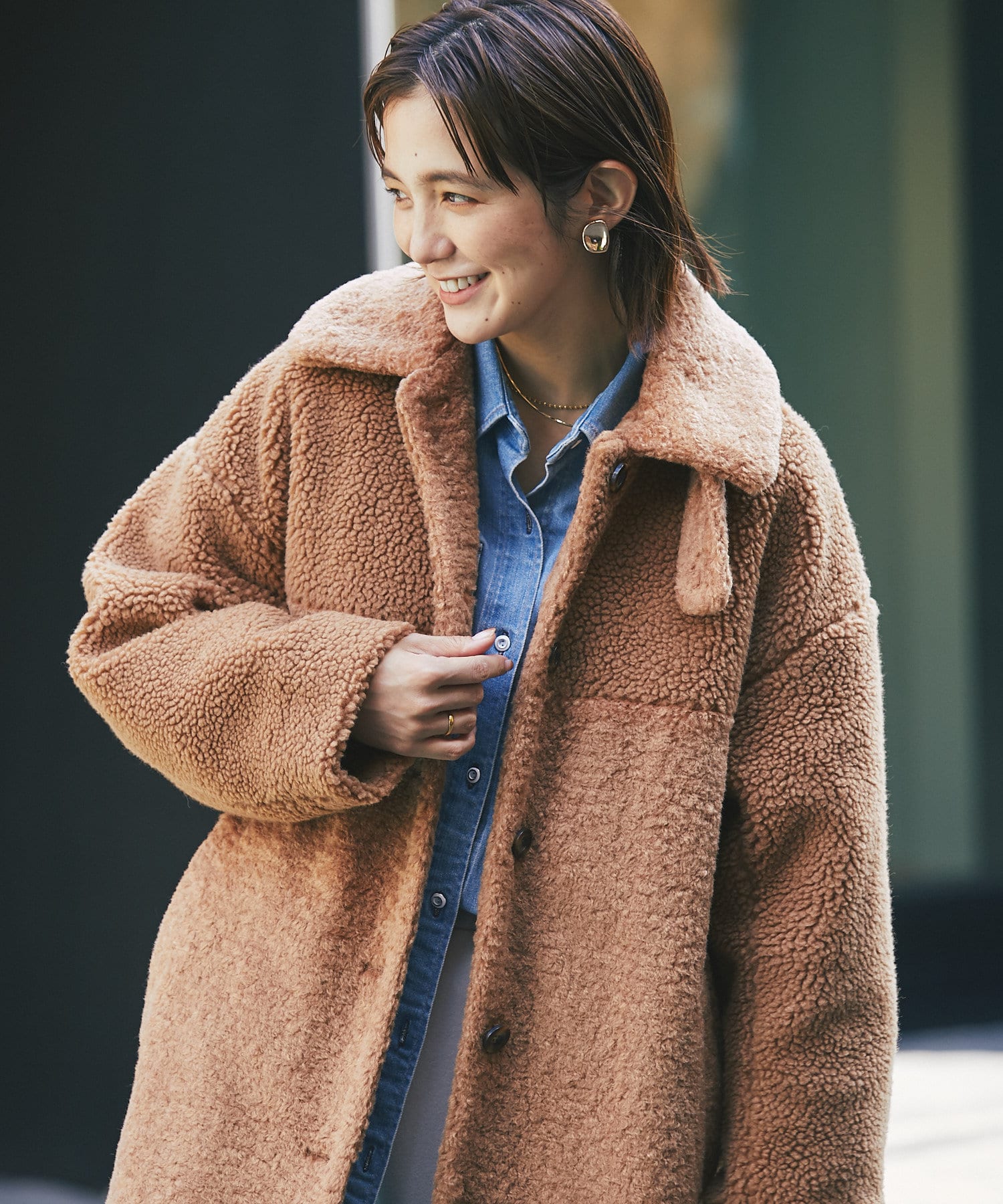洗練された大人カジュアルを演出するボア素材のステンカラーコート。