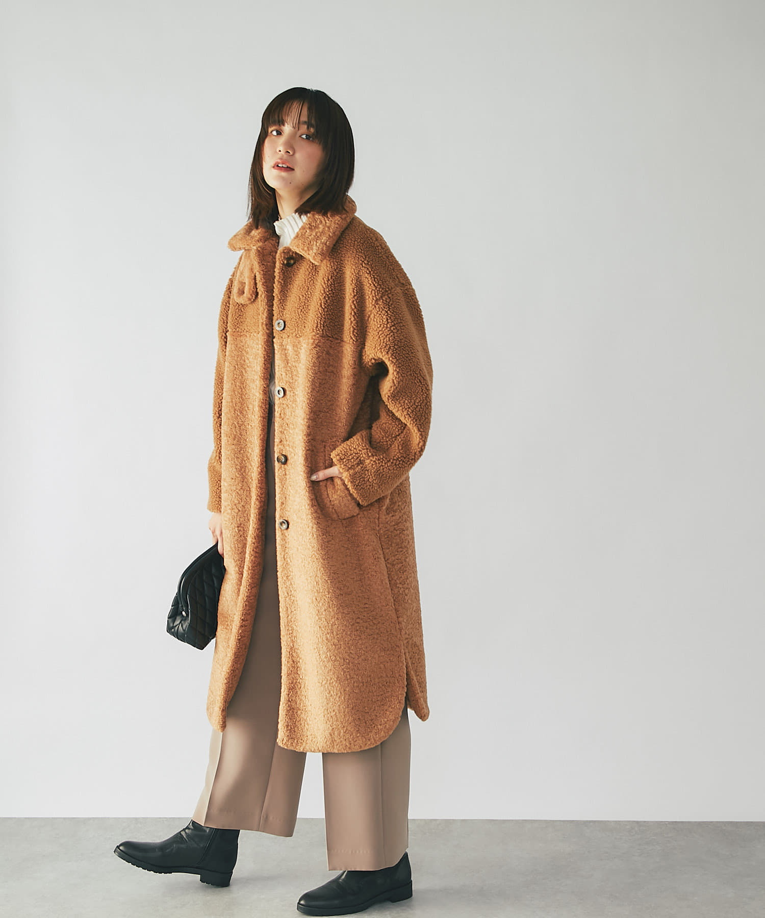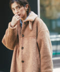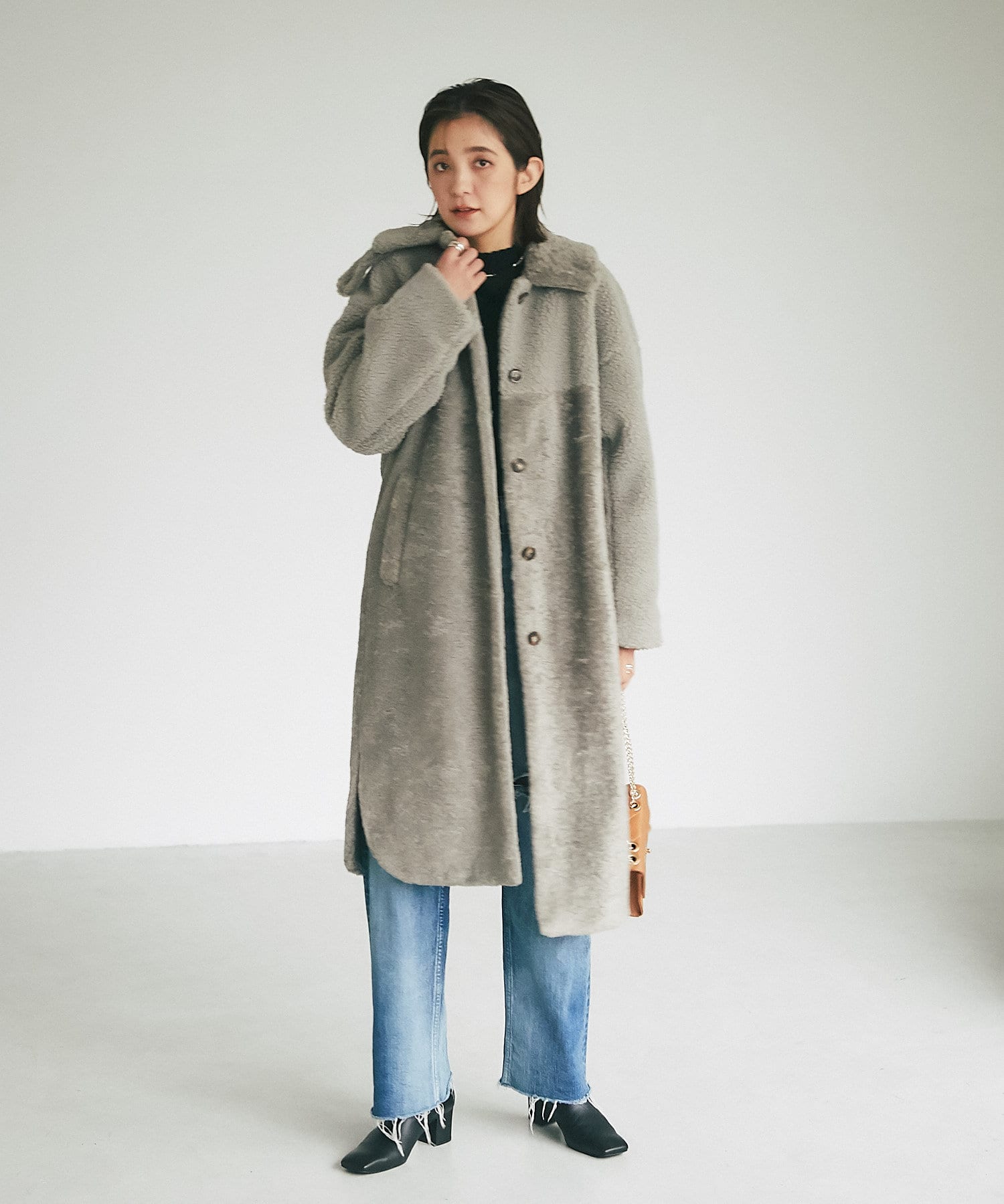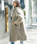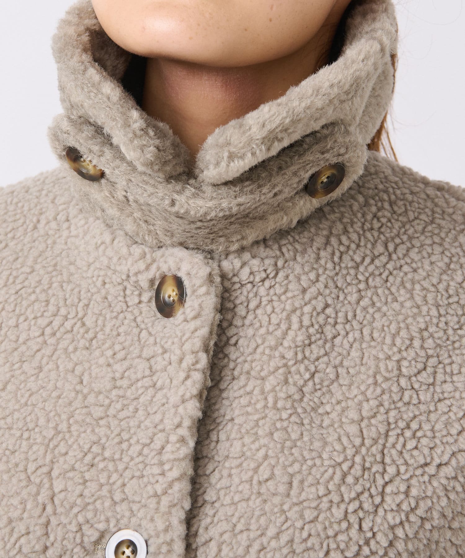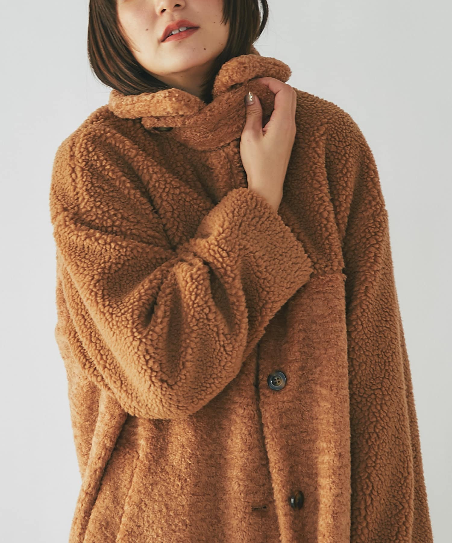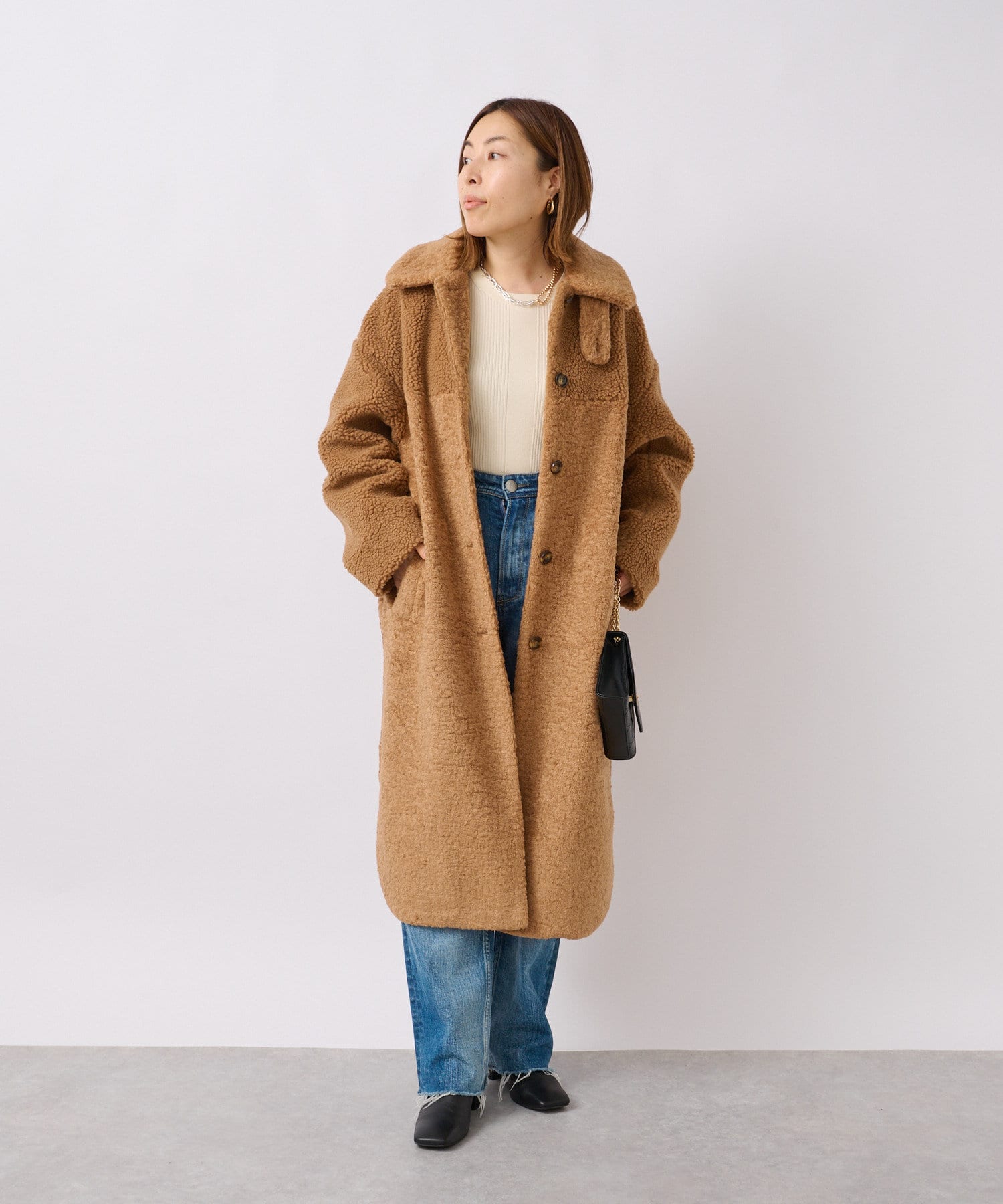 洗練された大人カジュアルを演出するボア素材のステンカラーコート。