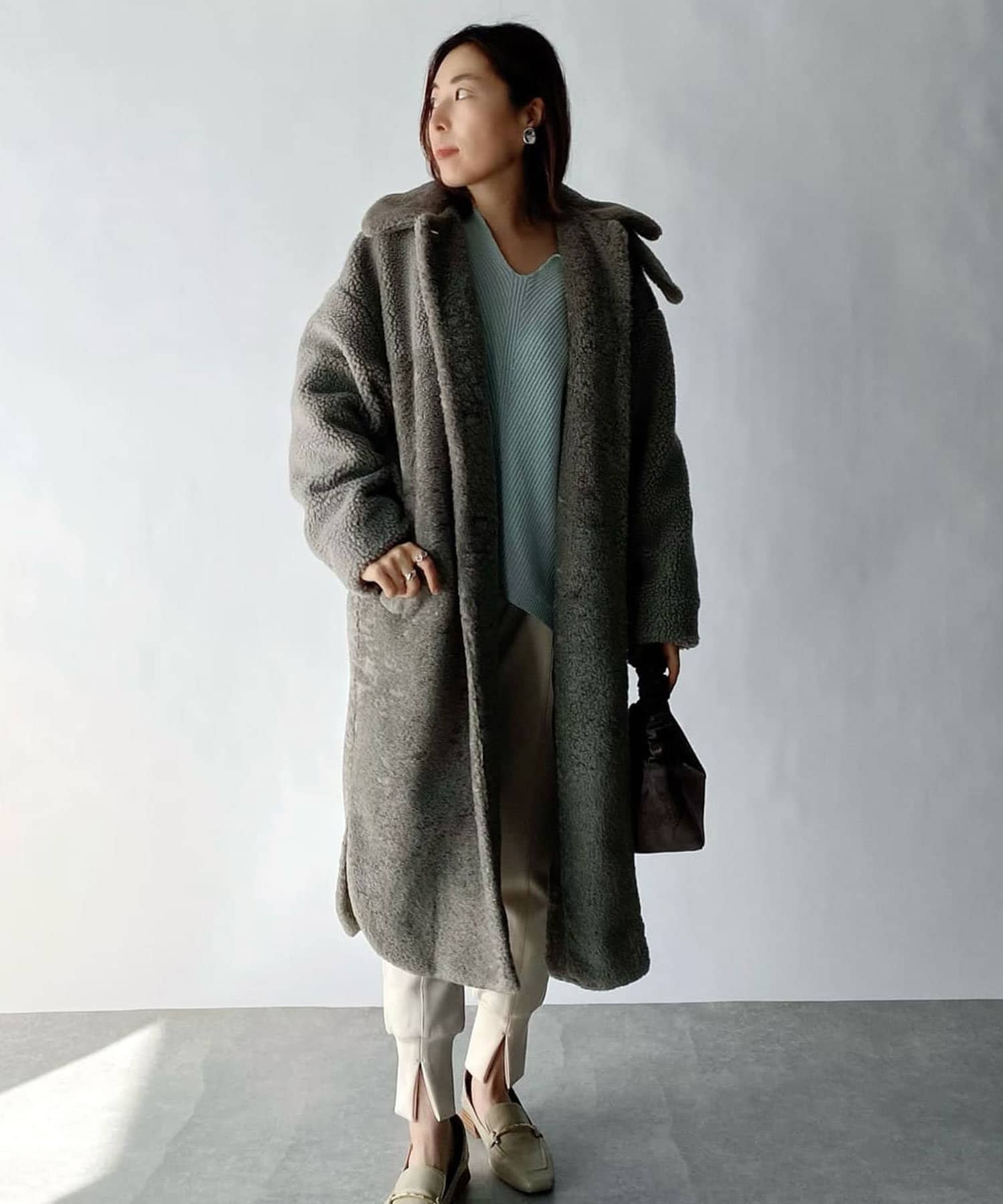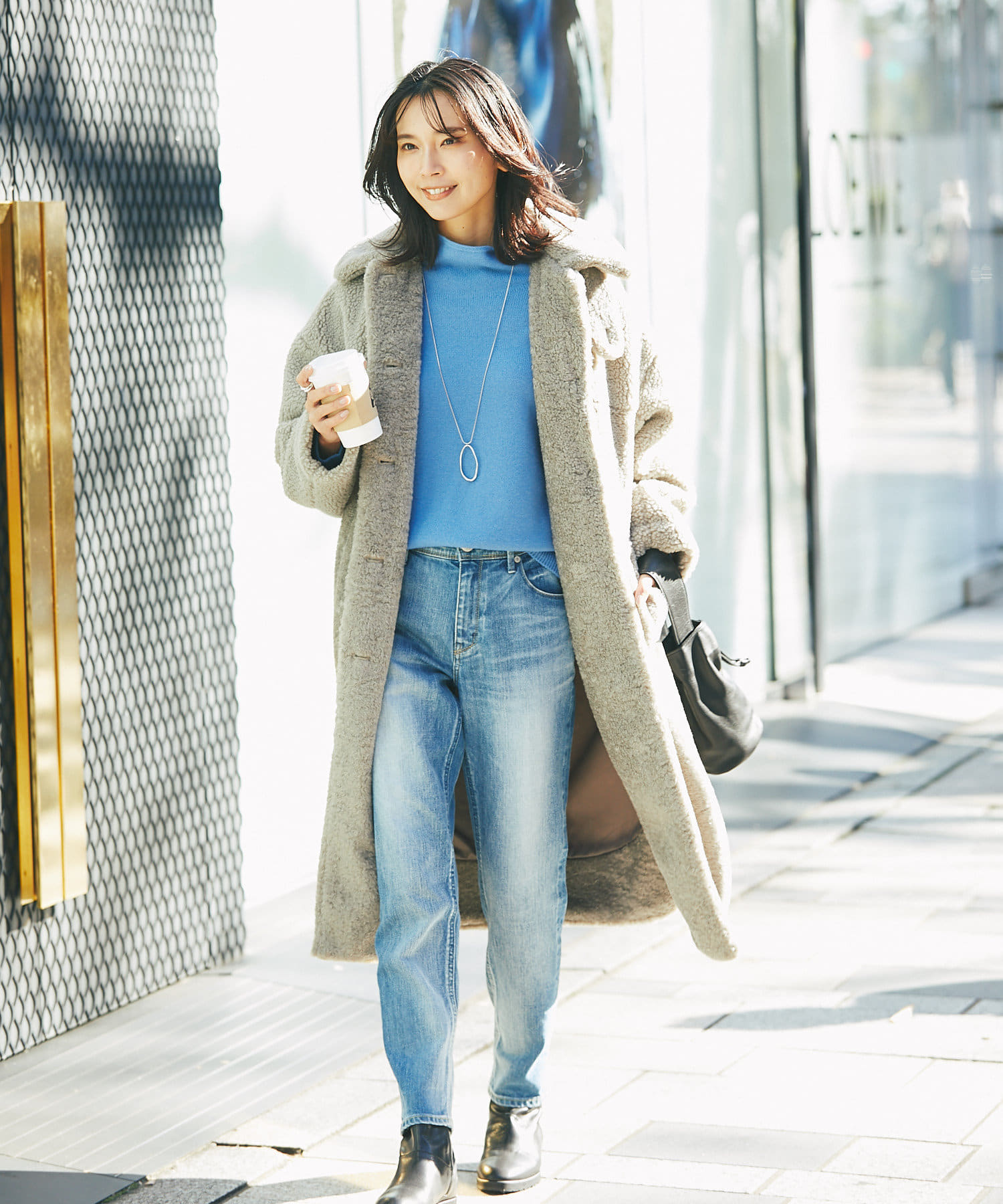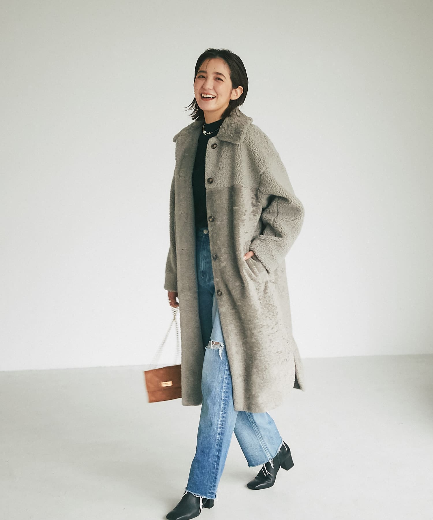 ⇒ボアコートはボリューム感がある分、その他の服をシンプルなものでまとめるとコーディネートにメリハリがついて大人の女性らしさを残したキレイめコーデになります。シンプルなタートルネックや細身のデニムとの相性も良いため、大人カジュアルに着ていただけます。