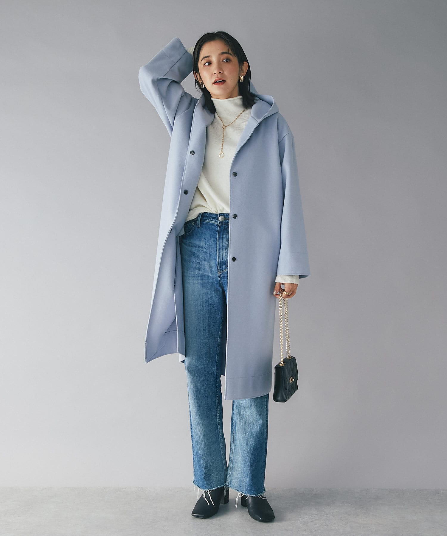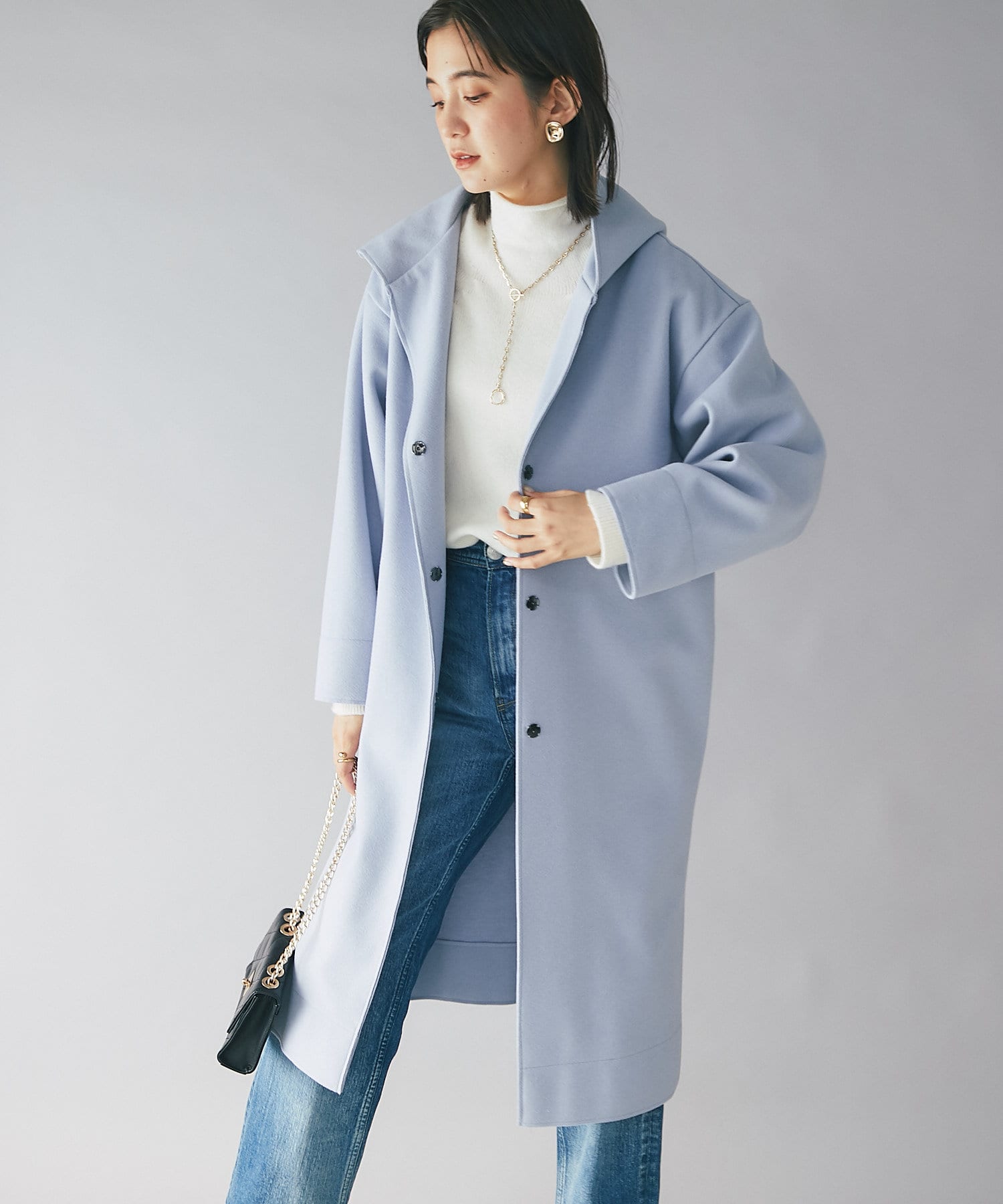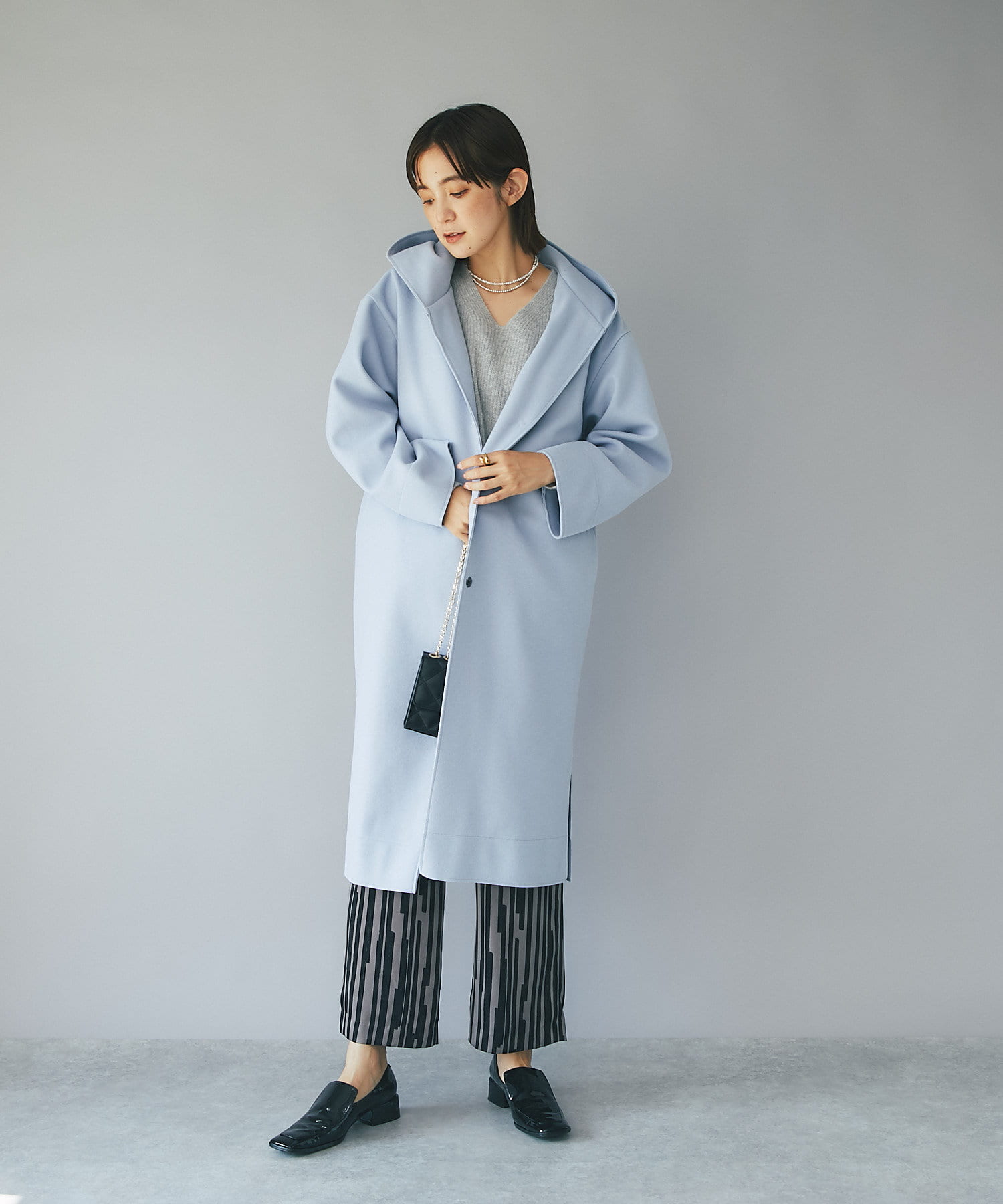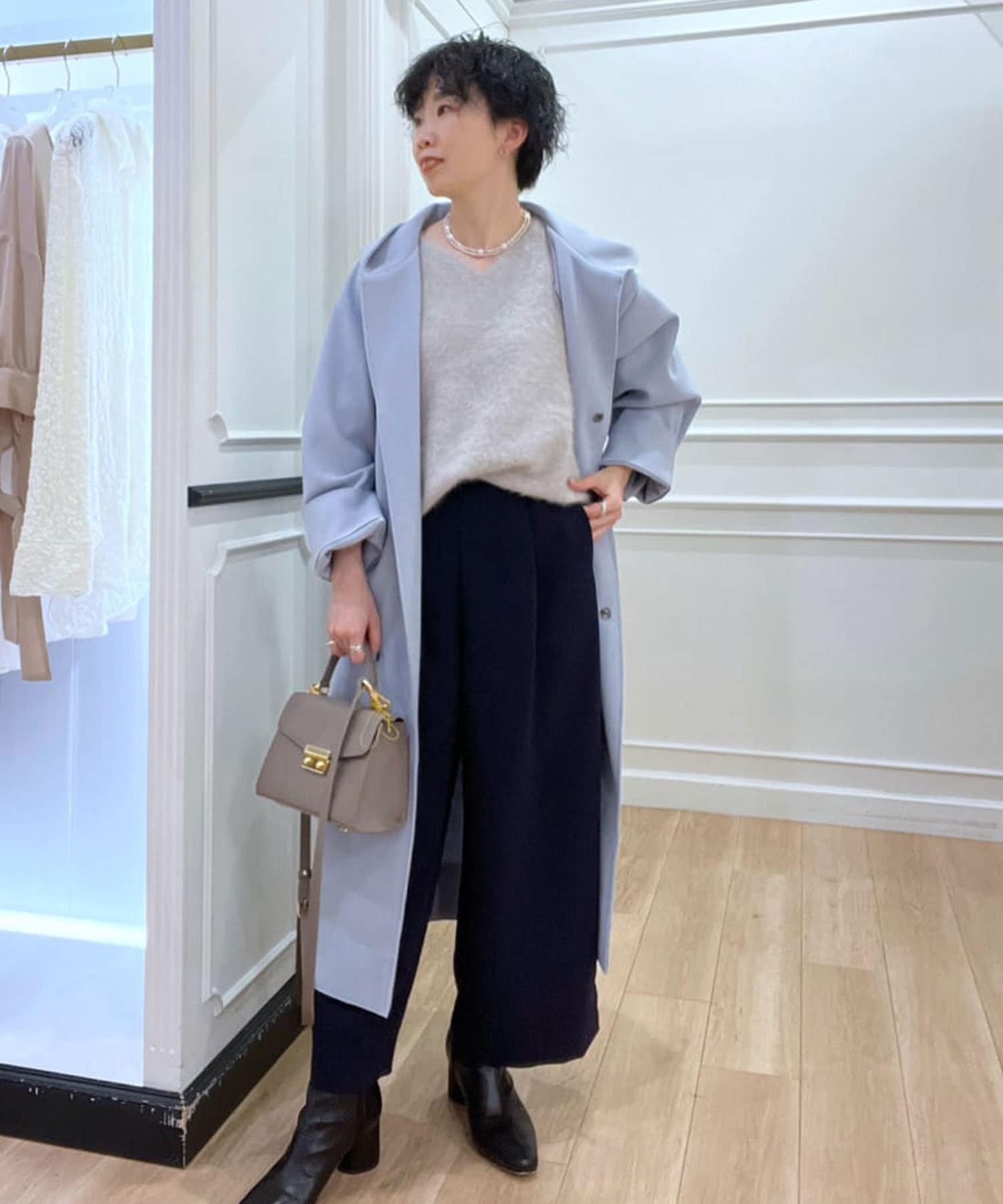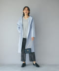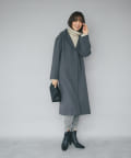 ⇒ノーカラーのものと比べるとカジュアルに見えますが、滑らかな素材感とすとんと落ちるシルエットになりますの綺麗めなスタイリングにもマッチします。