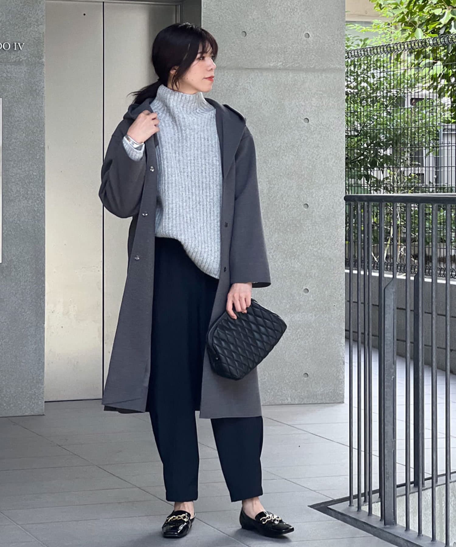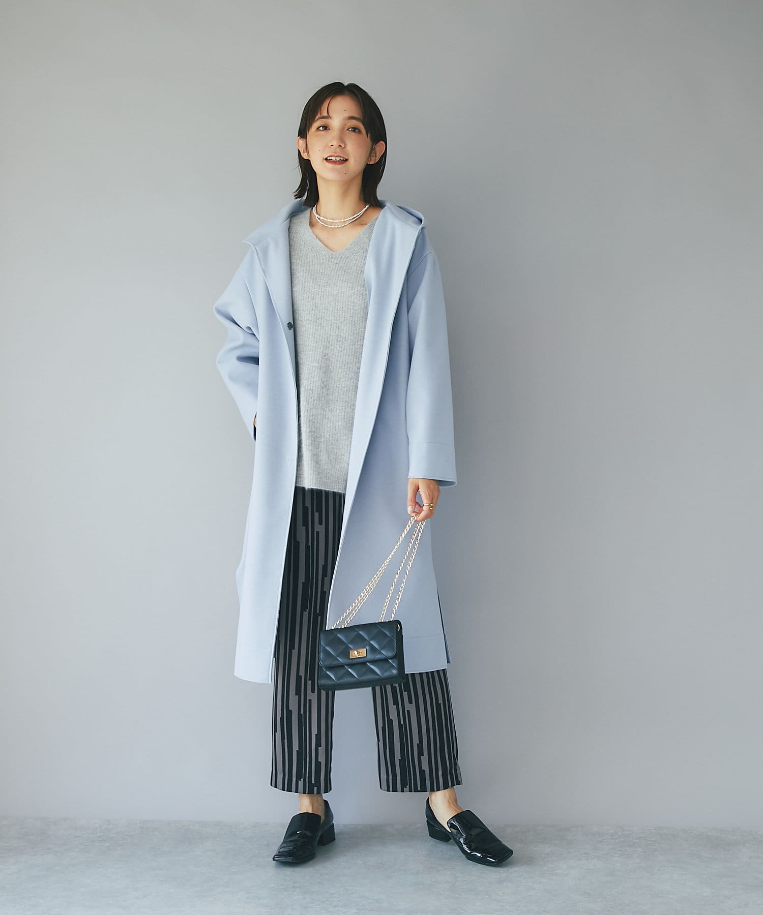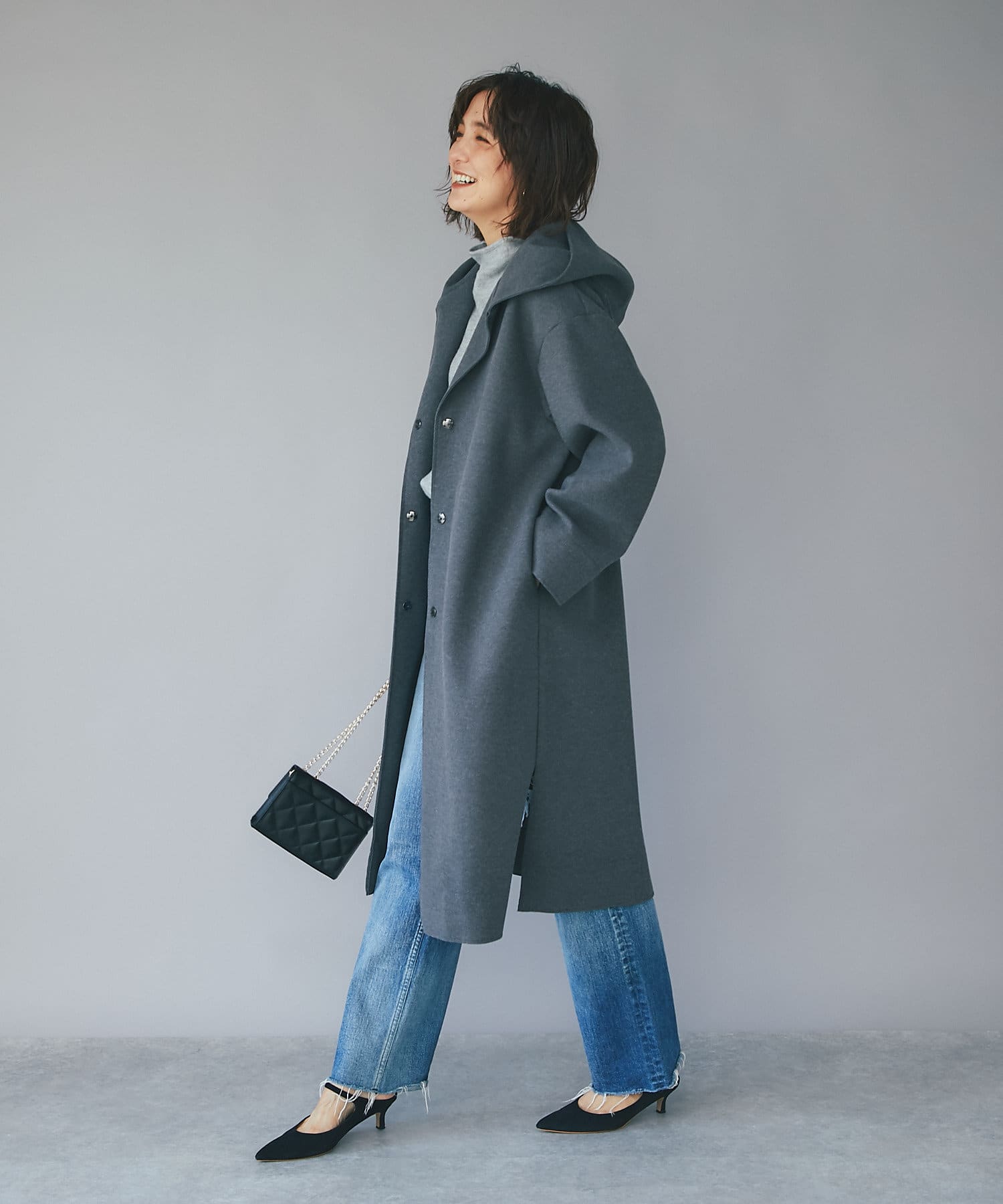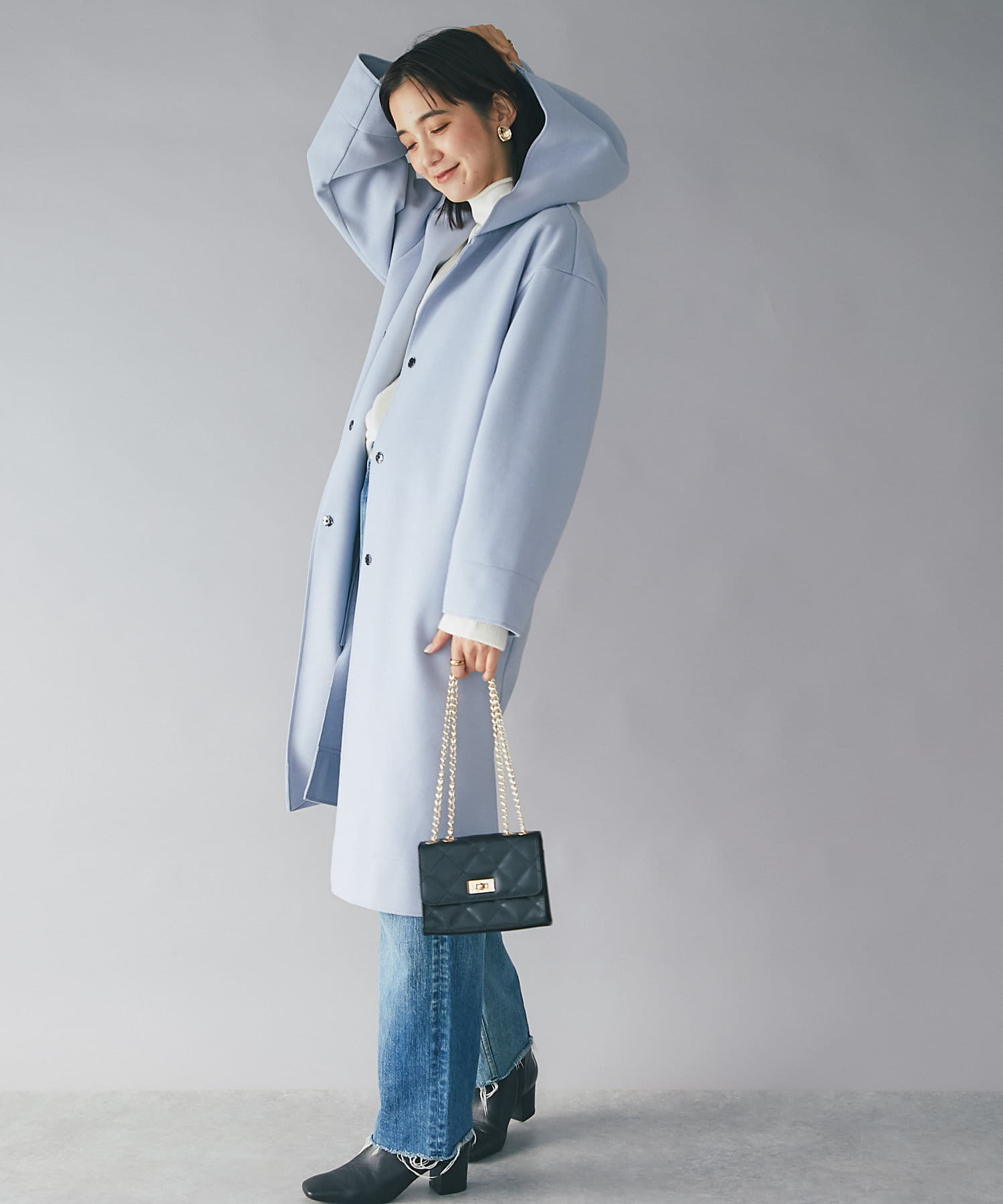 ⇒ノーカラーのものと比べるとカジュアルに見えますが、滑らかな素材感とすとんと落ちるシルエットになりますの綺麗めなスタイリングにもマッチします。