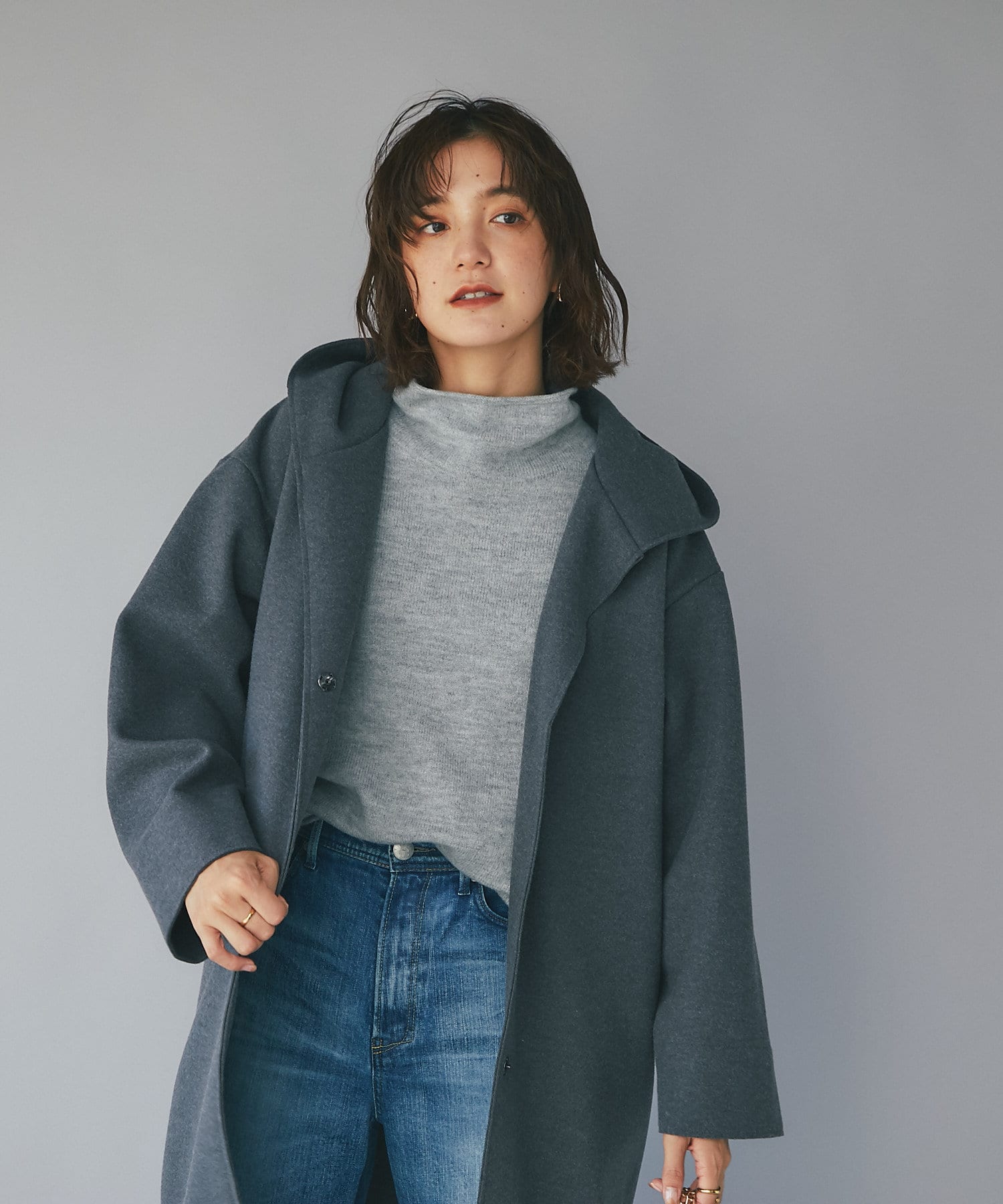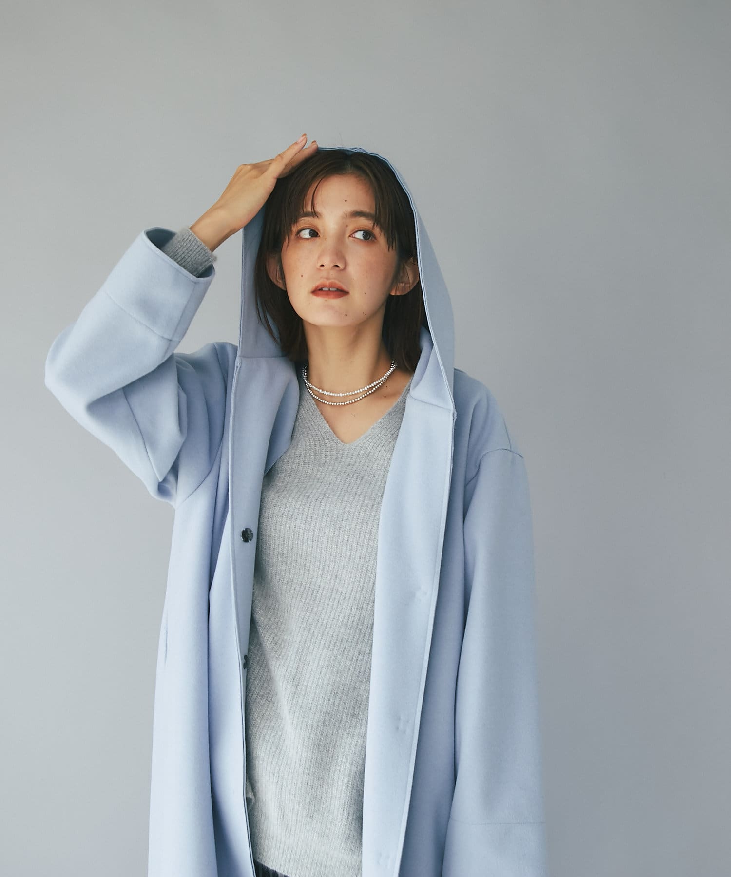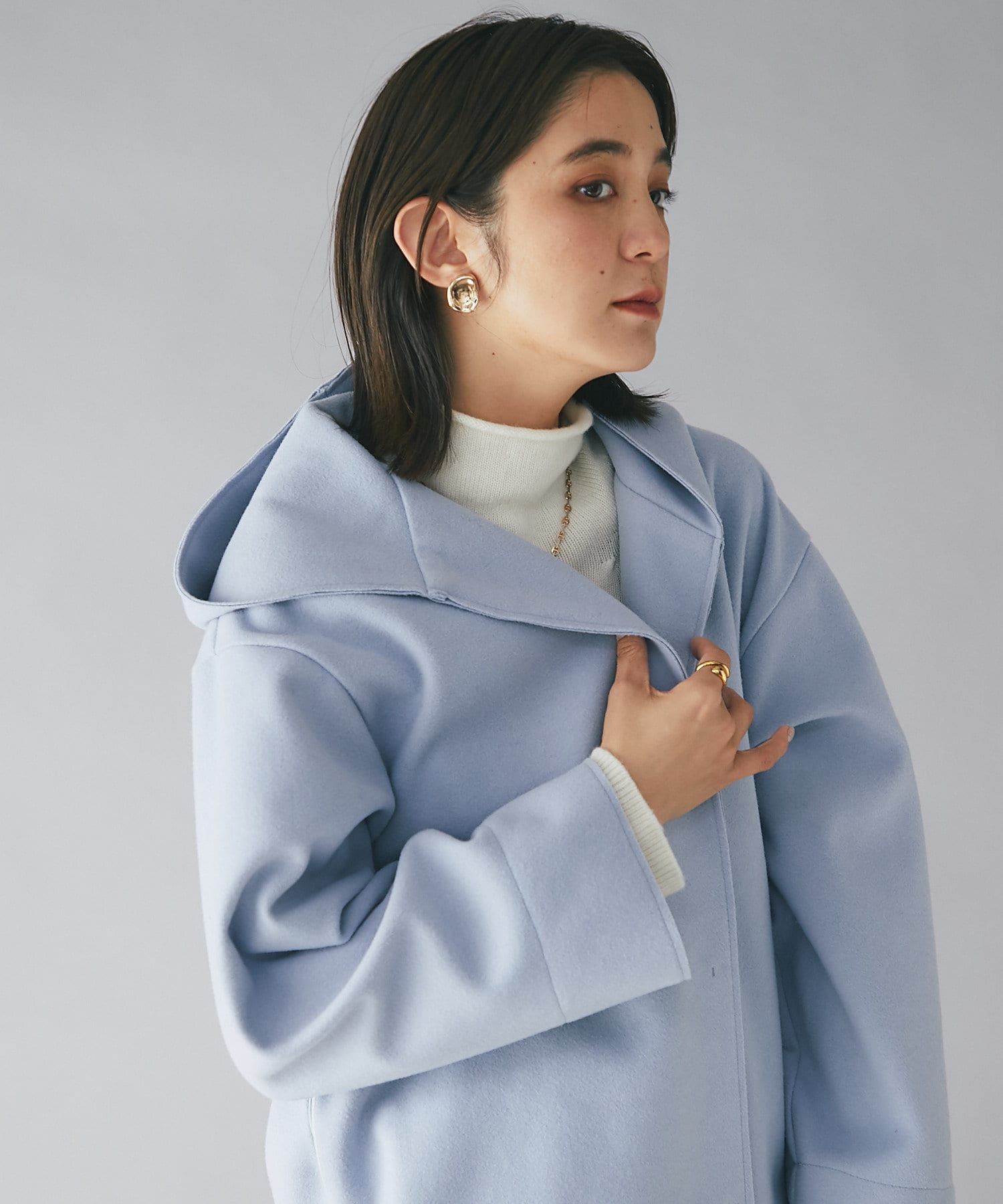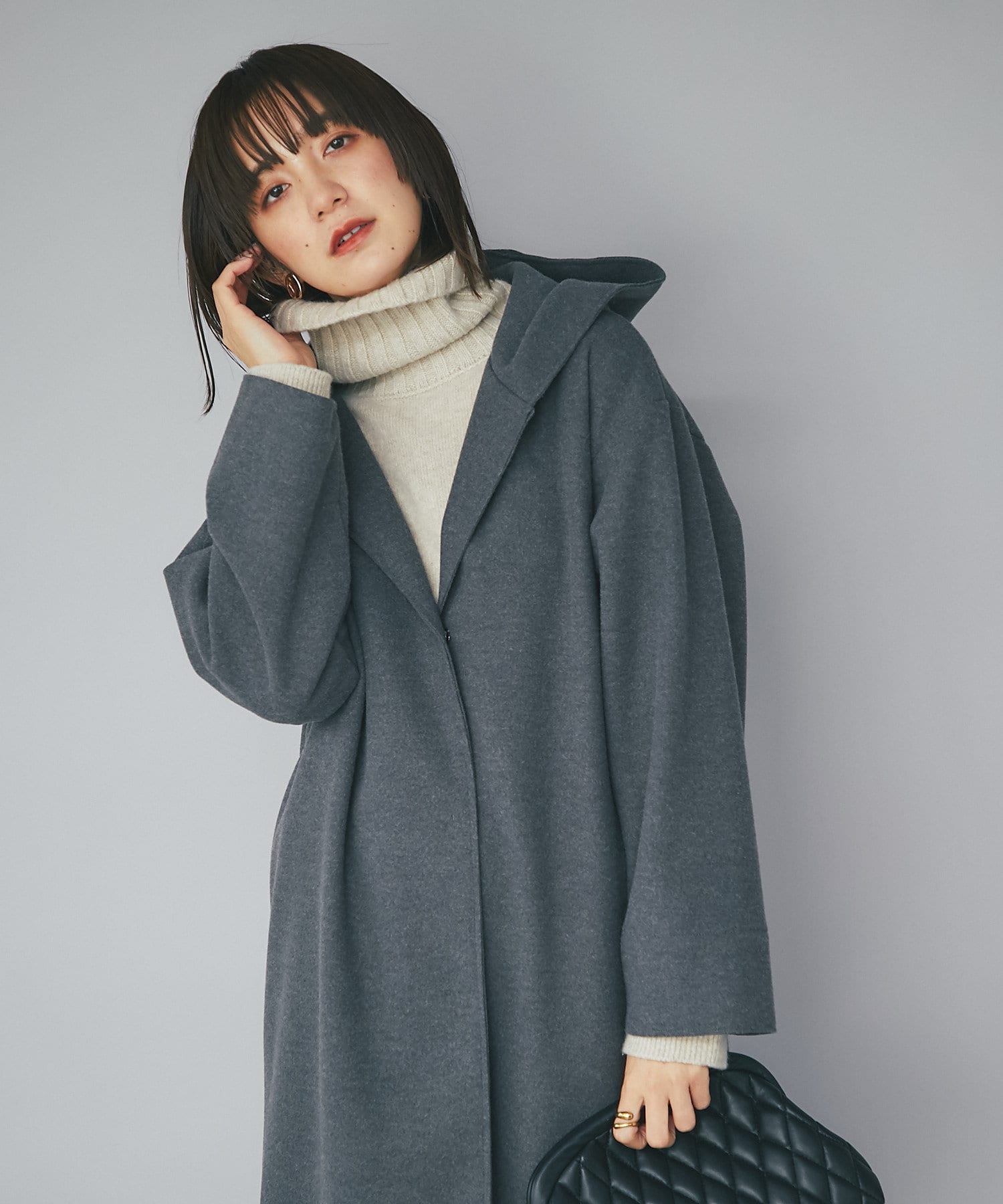 【フードデザインで顔周り華やか】ウールライクフードガウン