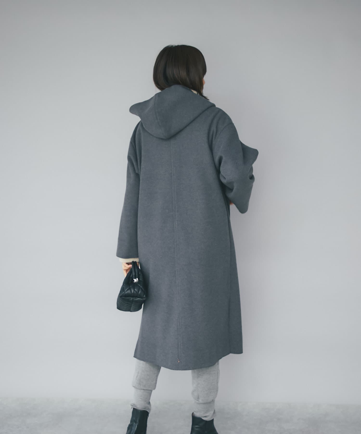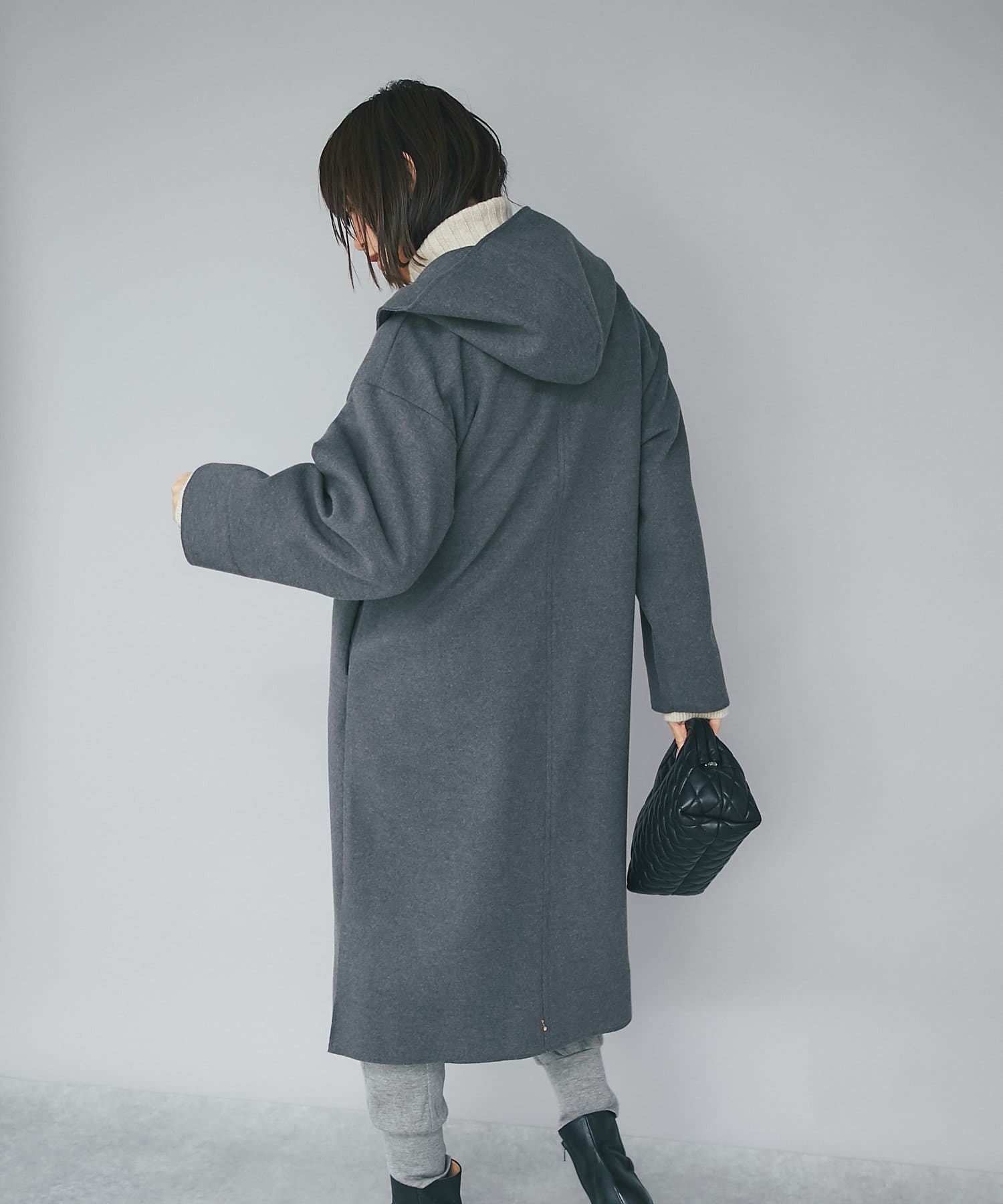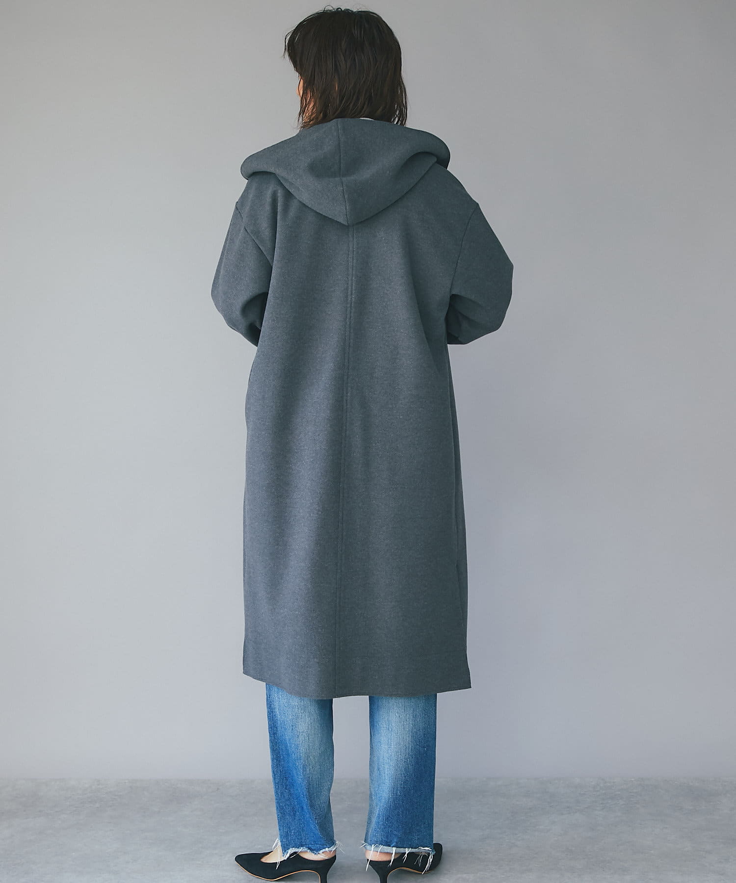 ポリエステルなどの素材を使用しながら、圧縮ウールのような見た目を実現したフードガウンコート。