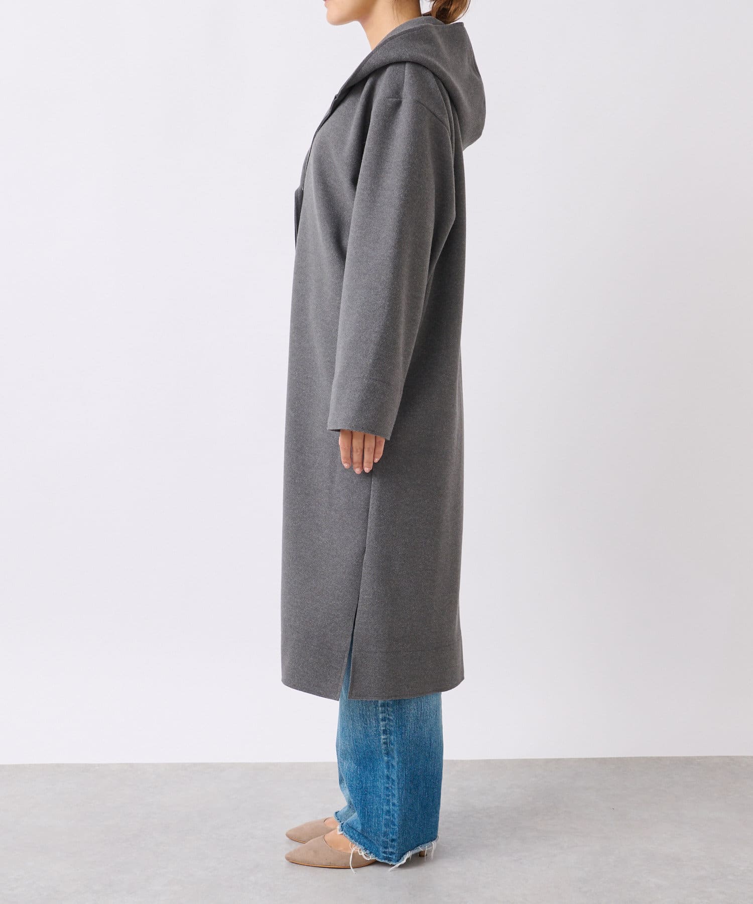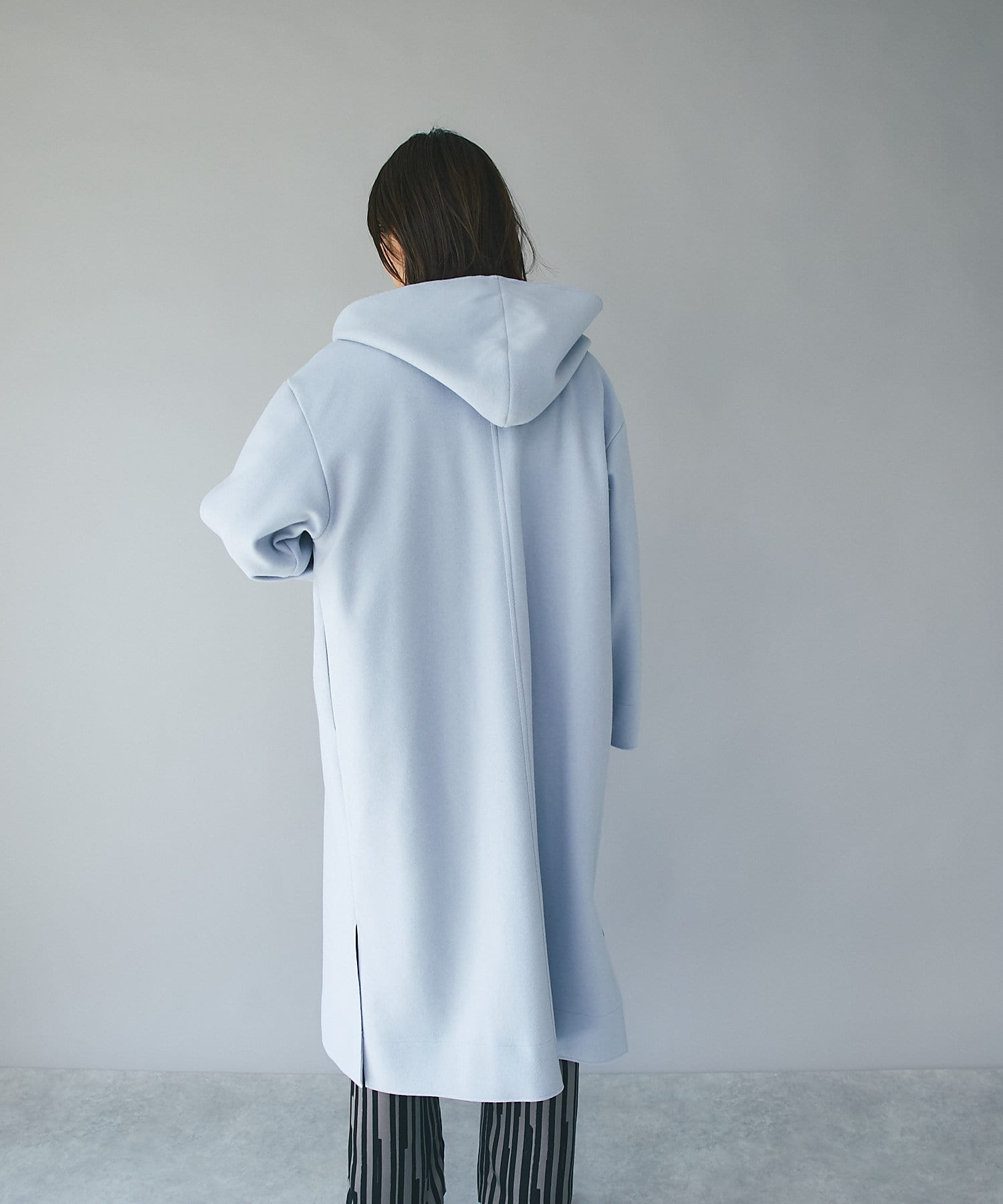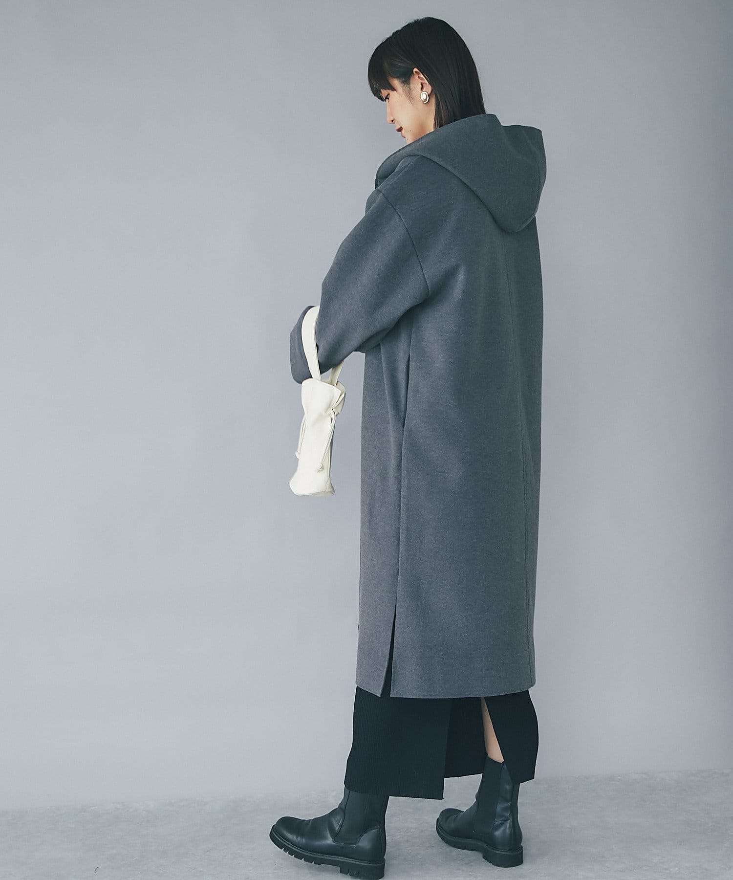 ポリエステルなどの素材を使用しながら、圧縮ウールのような見た目を実現したフードガウンコート。
