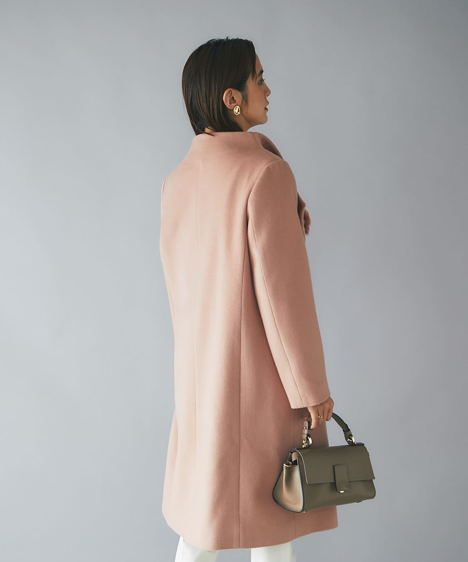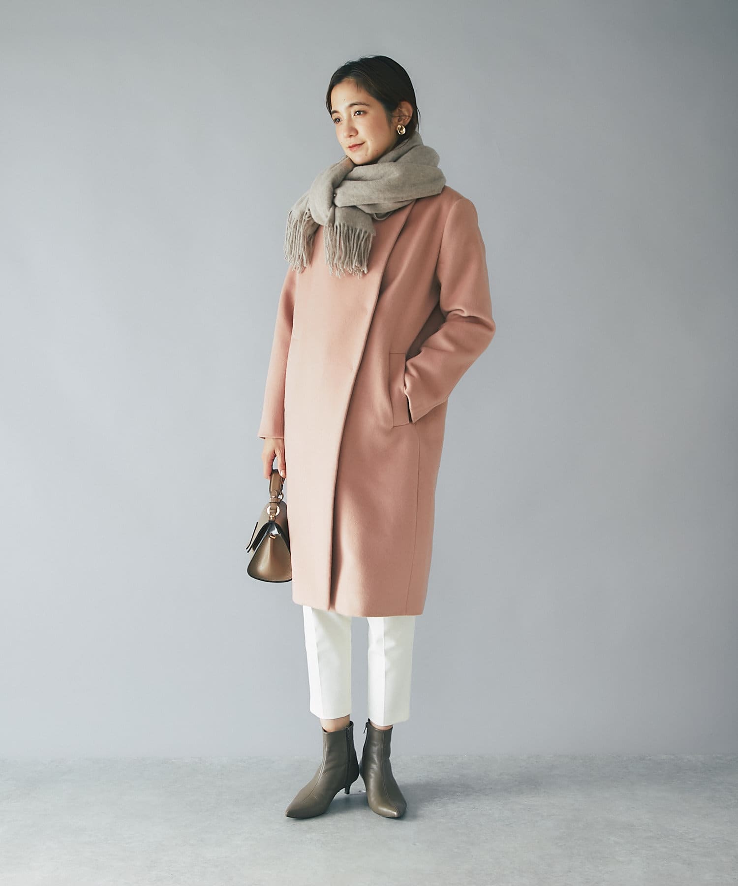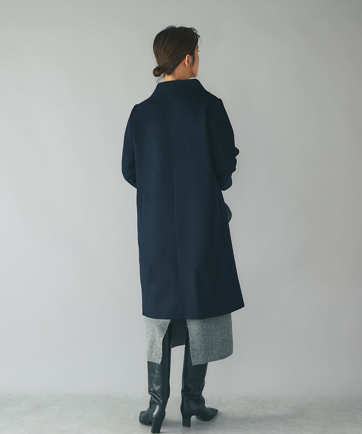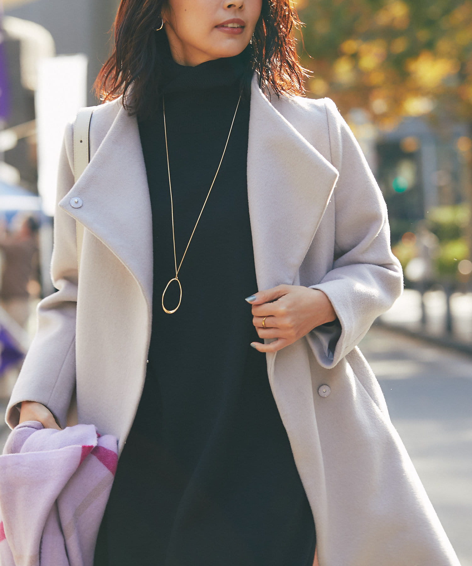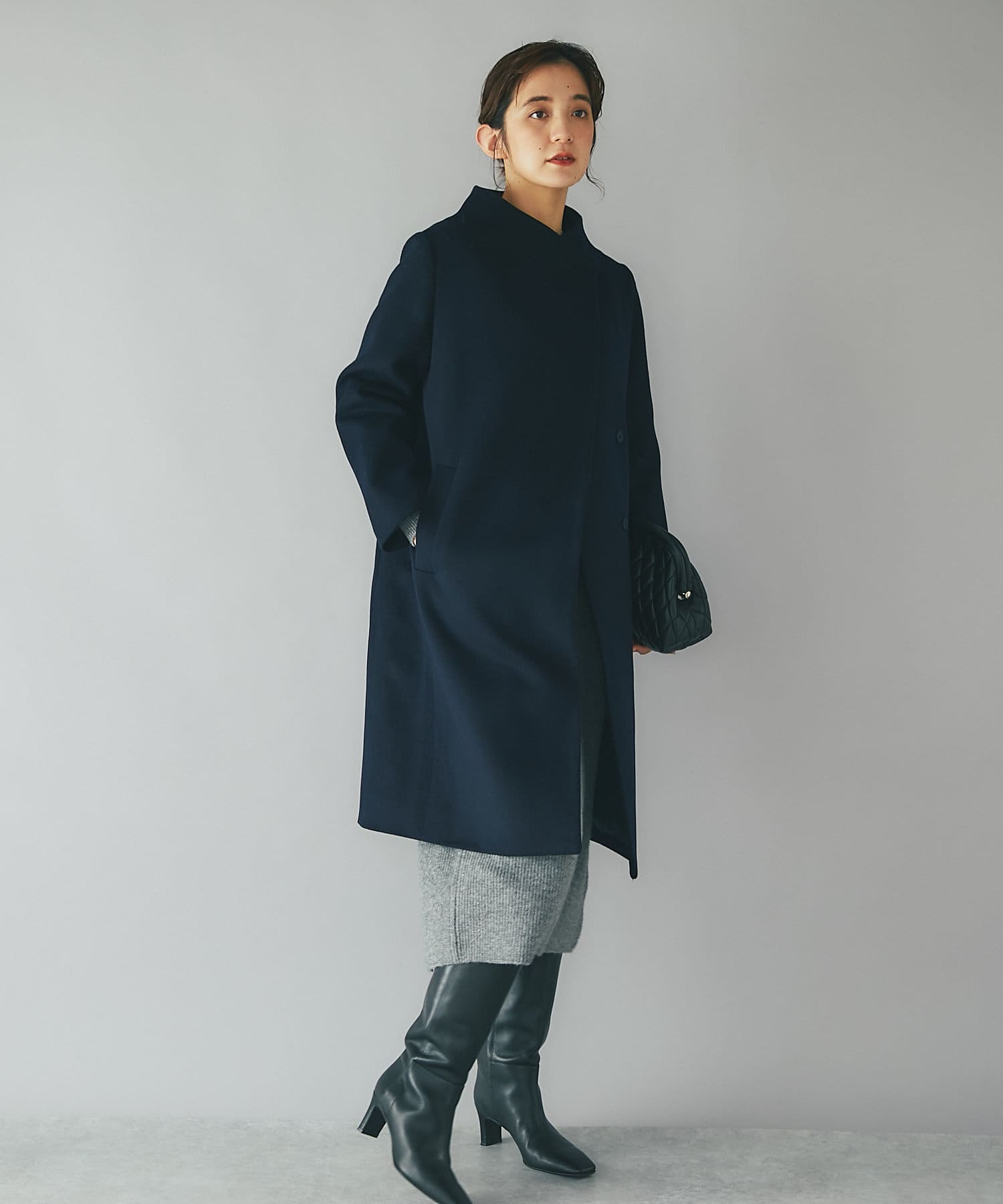 ノーカラーコートだと中はタートルネック一択のイメージですが、こちらはボトルネックなので首元を気にせず何でも着られそうです。