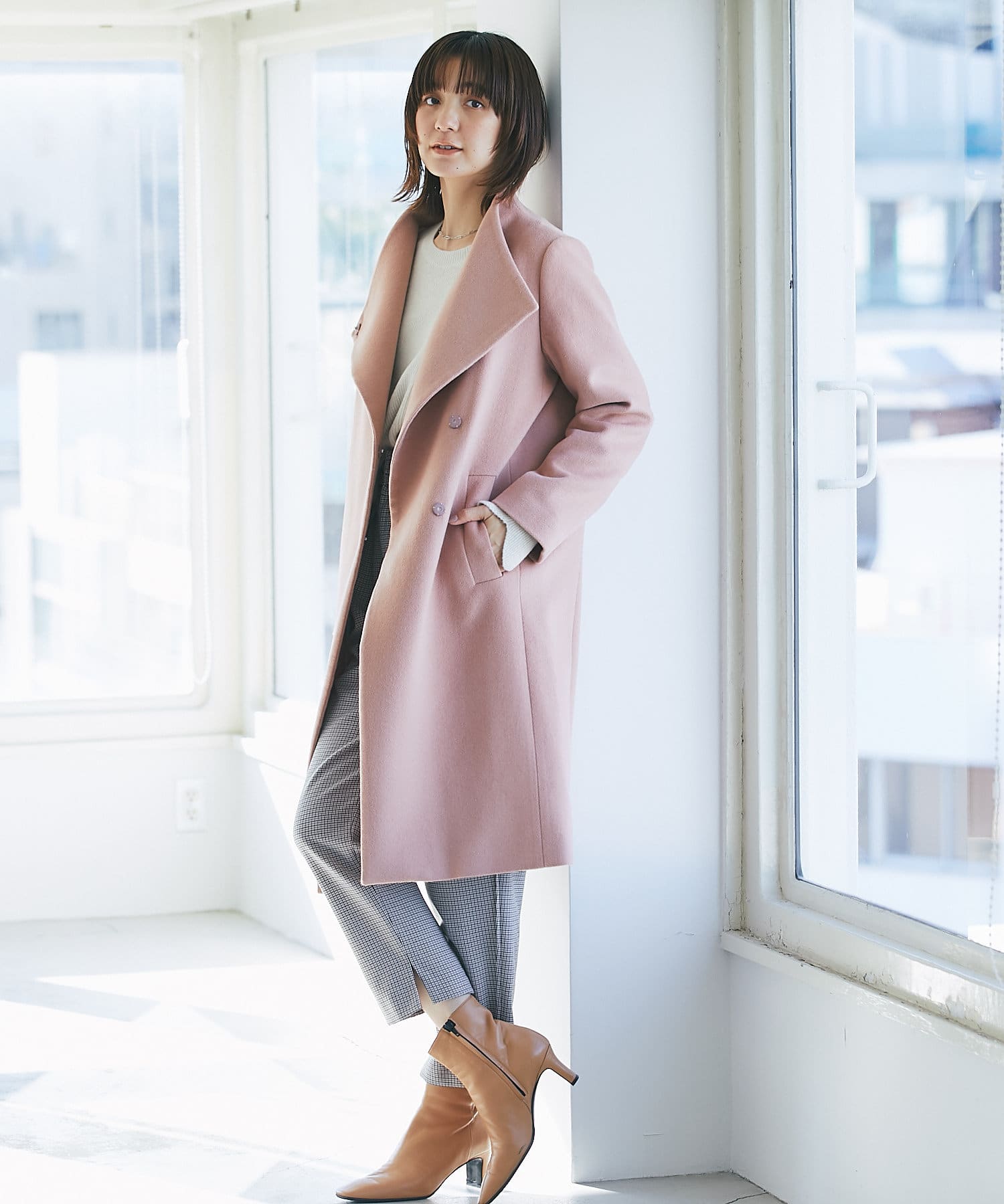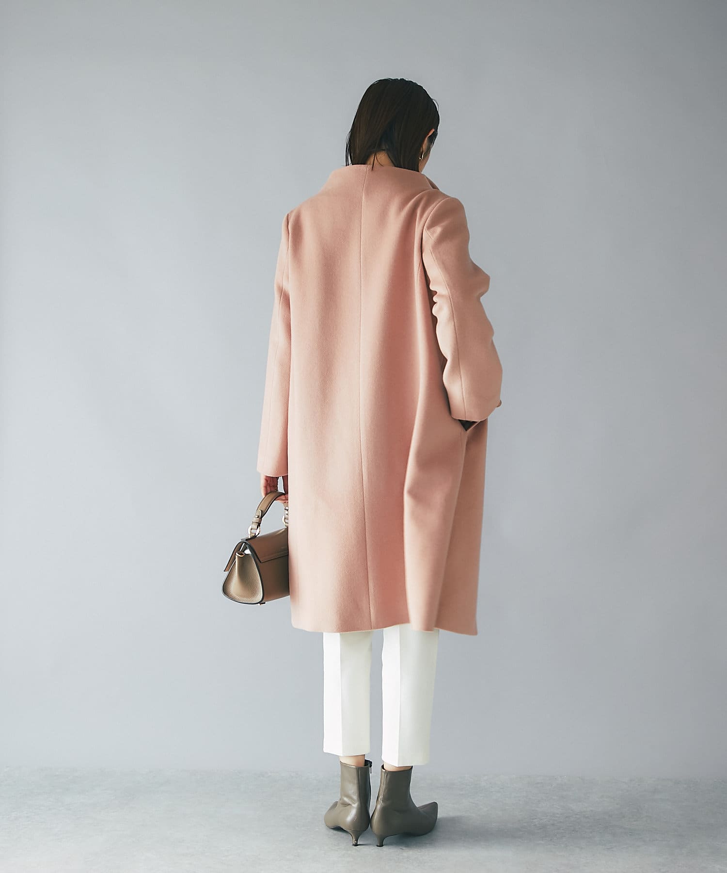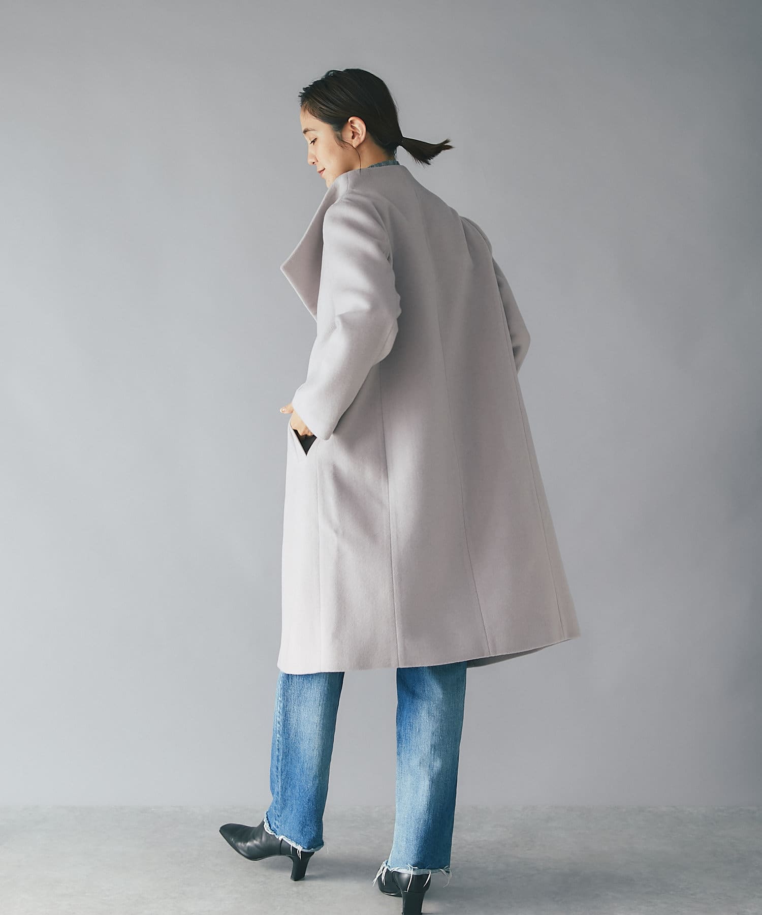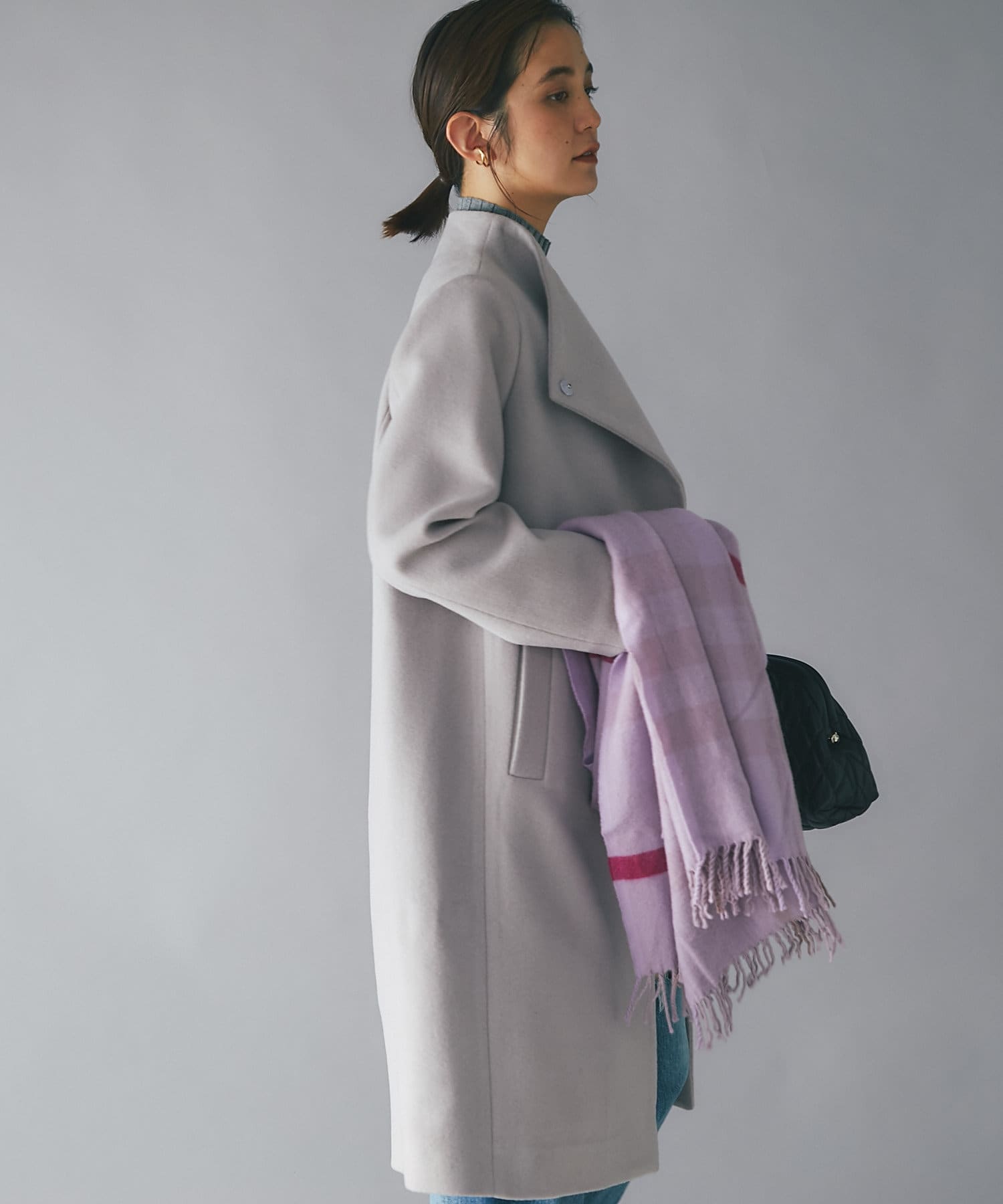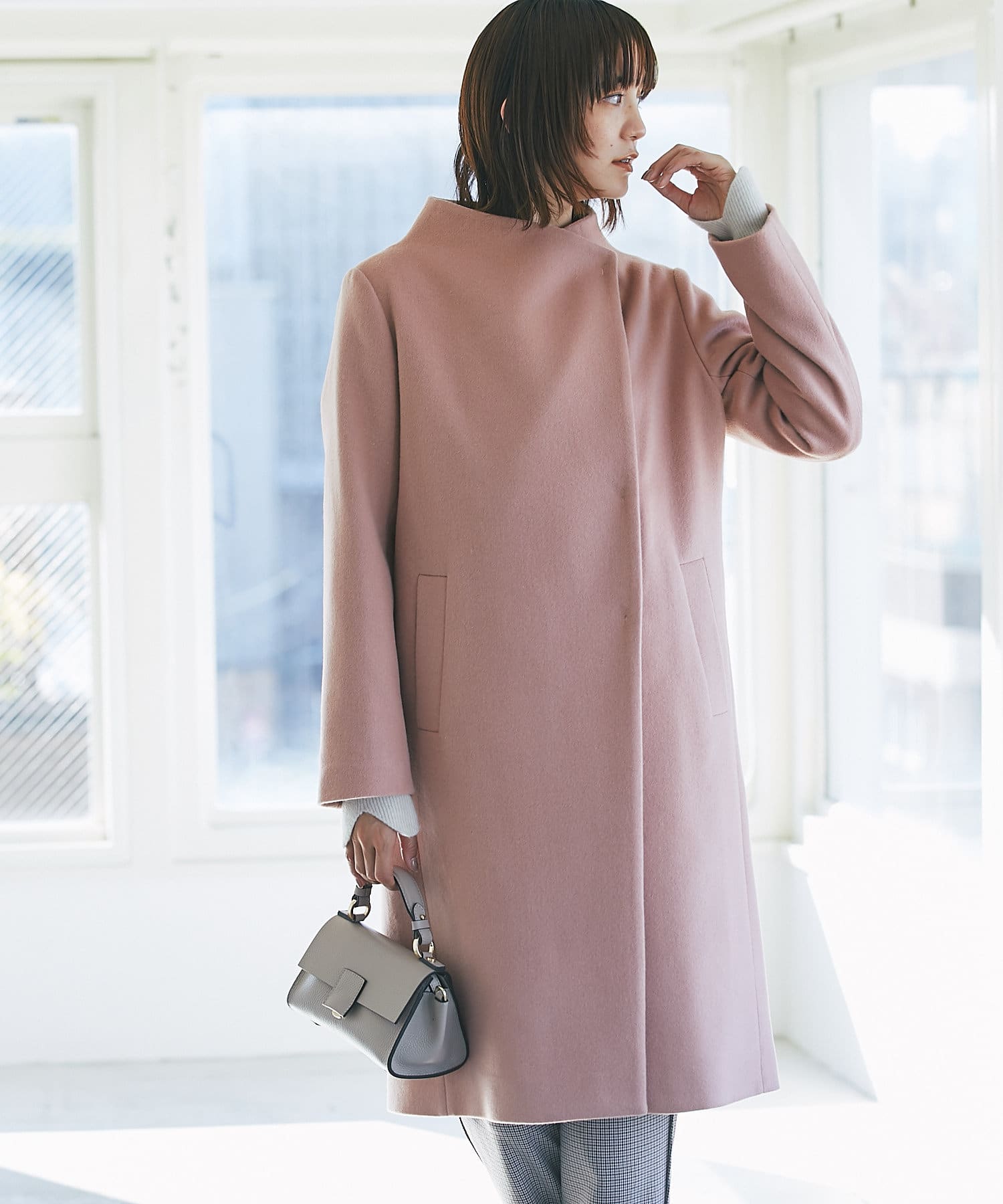 ノーカラーコートだと中はタートルネック一択のイメージですが、こちらはボトルネックなので首元を気にせず何でも着られそうです。