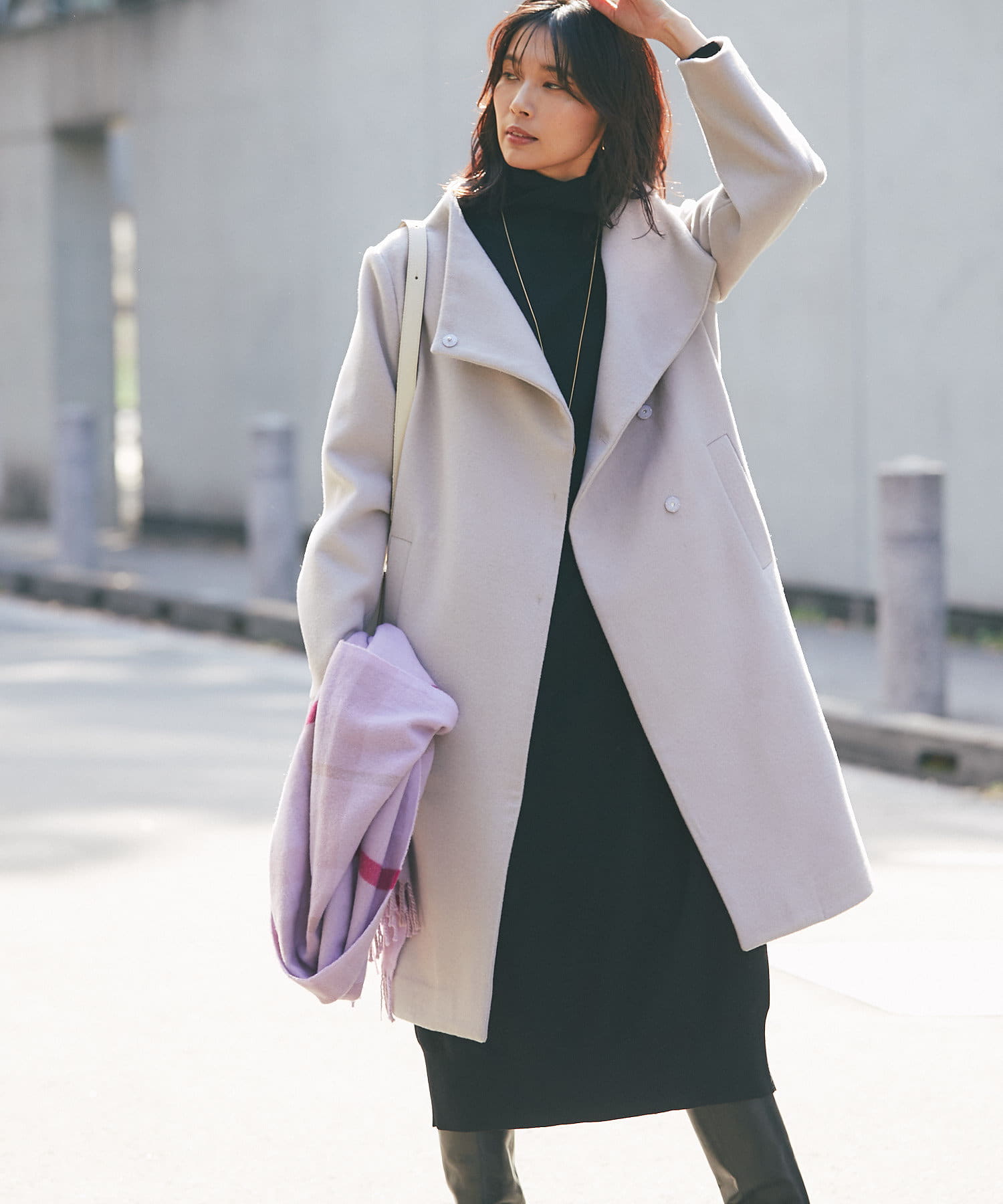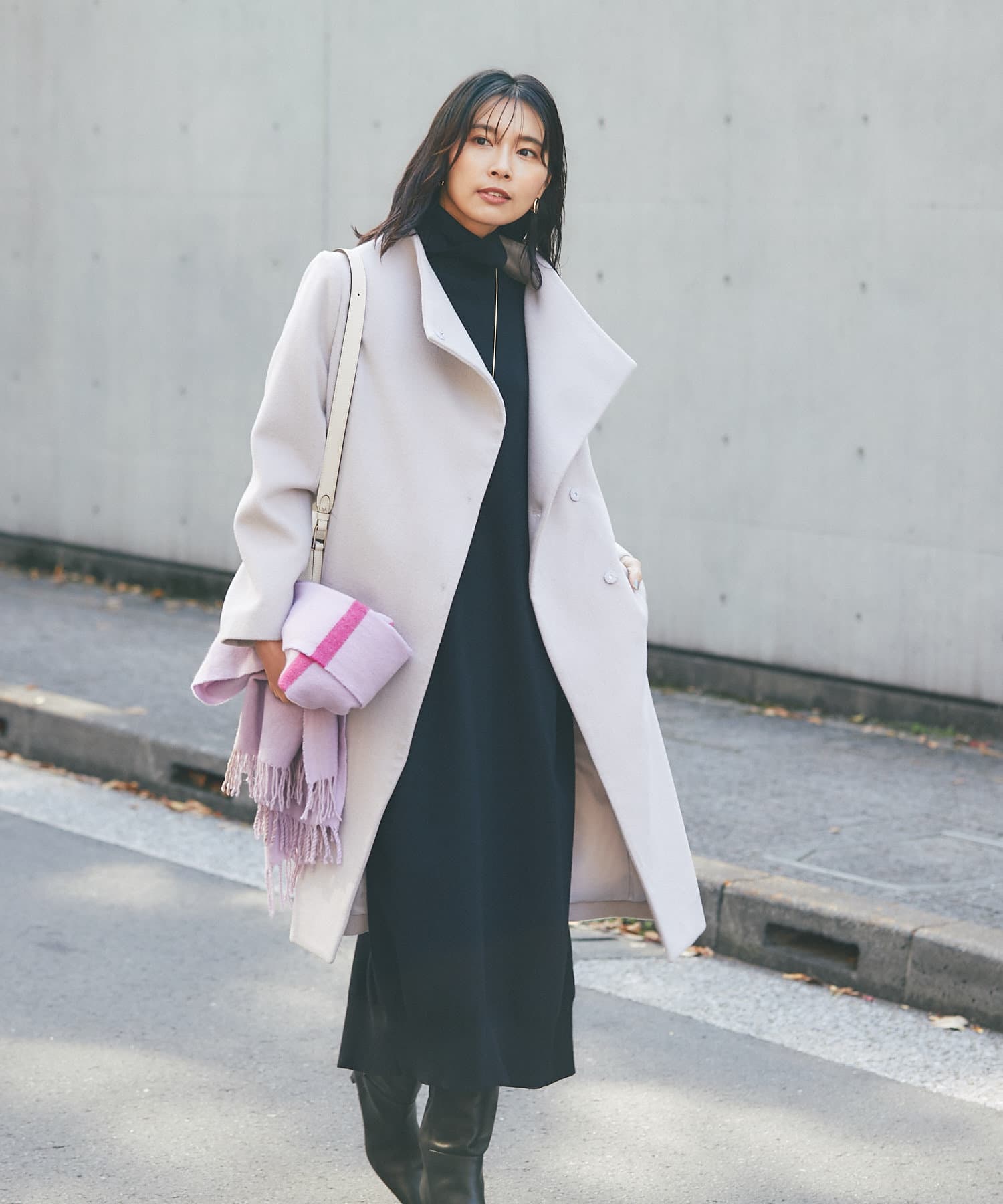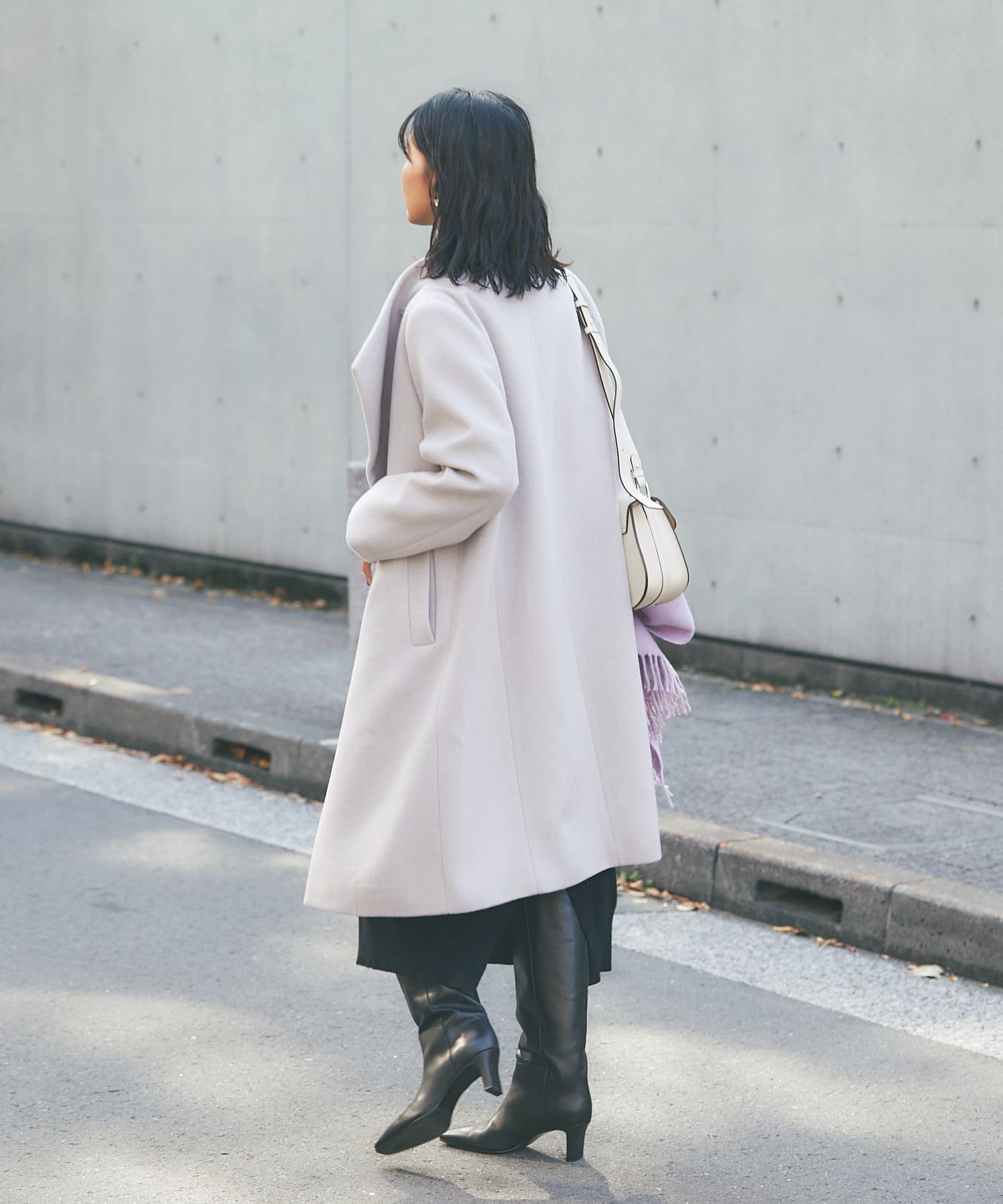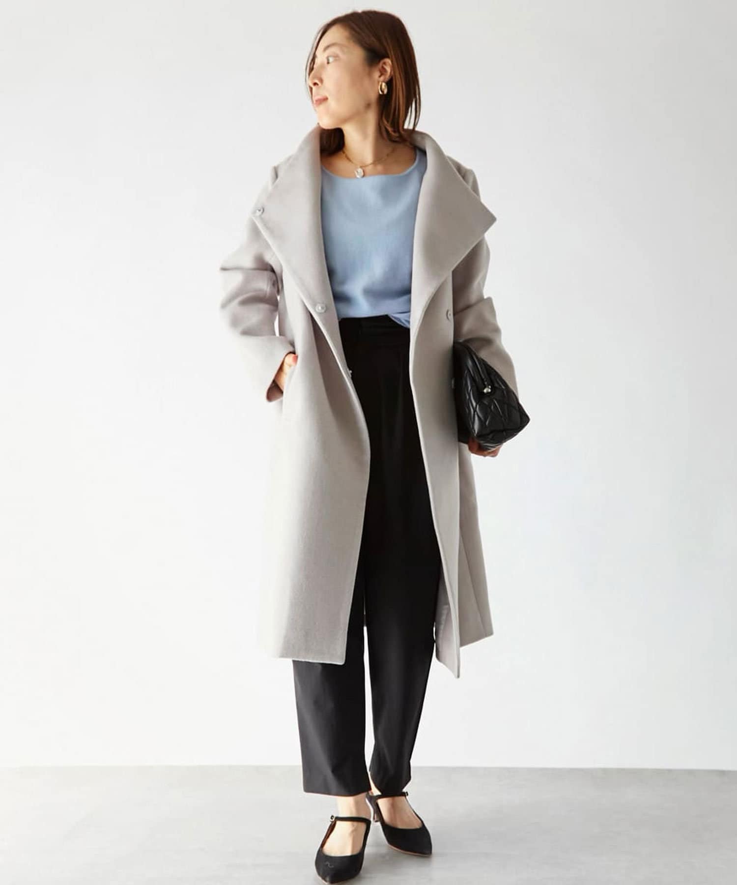 ⇒そんな方におすすめしたいのがこちらのコート。膝裏あたりの丈感で長すぎず、防寒もしっかりできる絶妙な長さが魅力。すっきりしたシルエットでオケージョンスタイルにも合わせられ、普段使いももちろんOK!小柄さんにもおすすめのアイテムです。