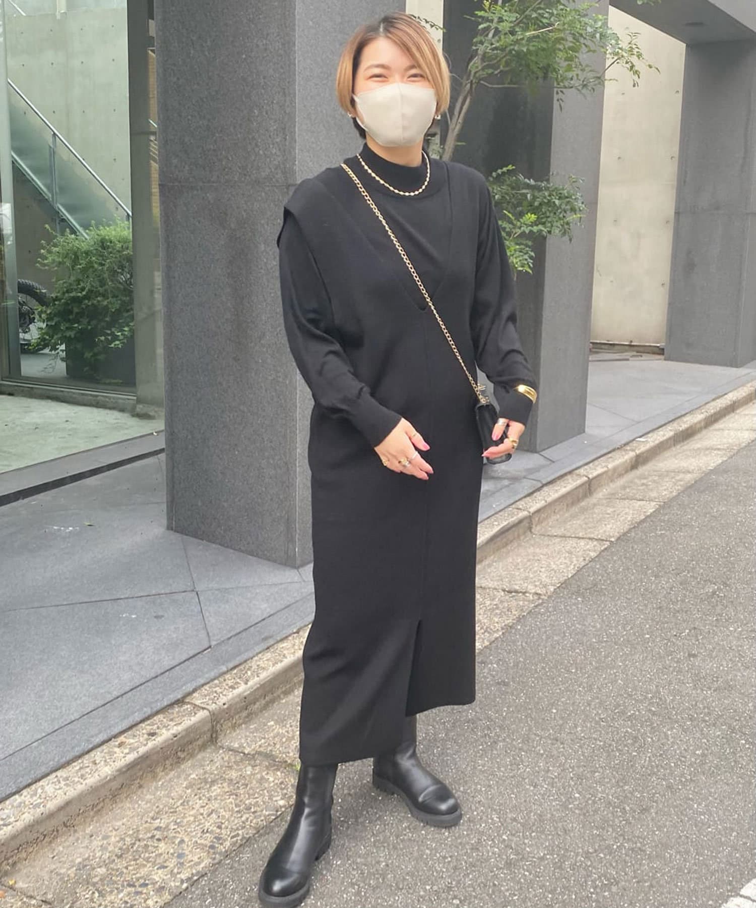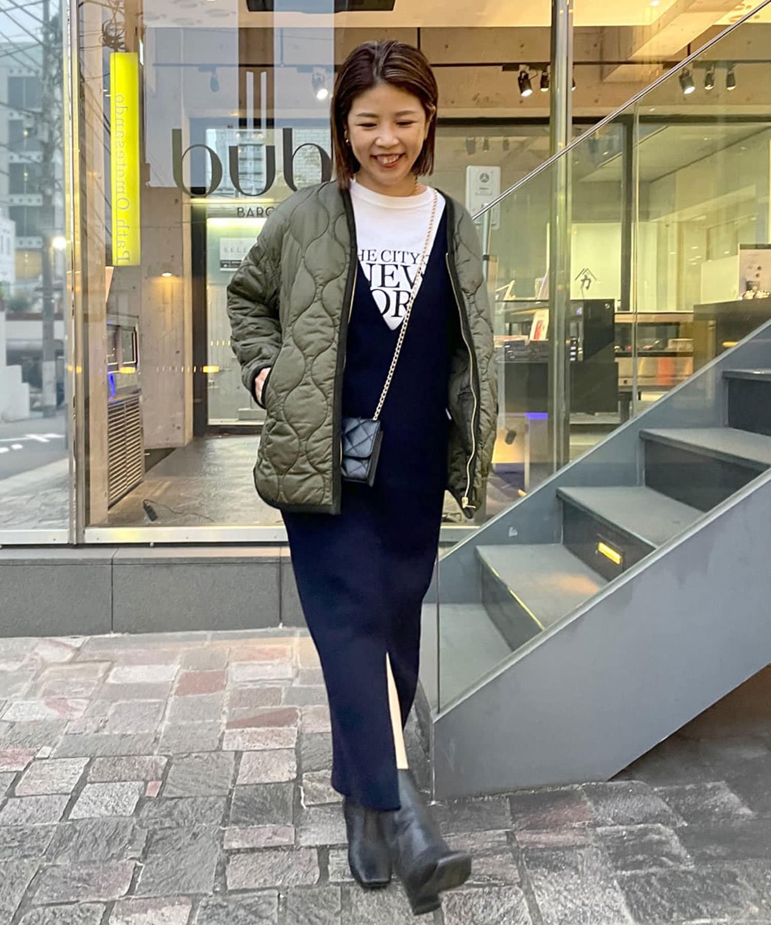 ジャンスカはインナーのシルエットやカラーで雰囲気が変わりますので、シアータートルカットソーなどでカジュアルに合わせて頂くのも◎