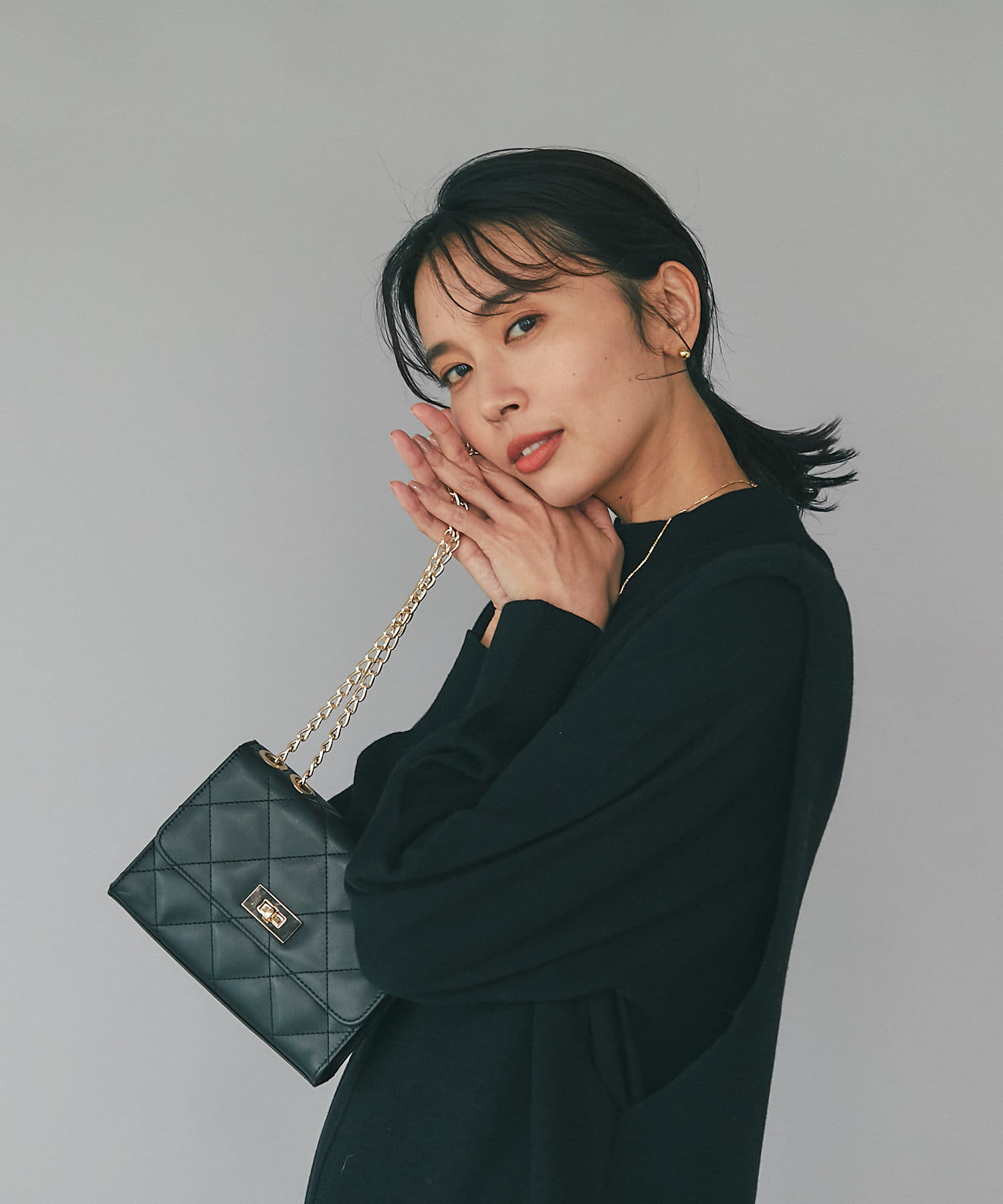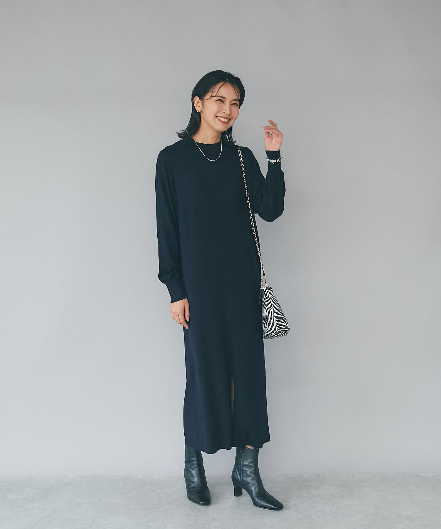 安心感のあるトップスはパンツやタイトスカートなどのIラインシルエットの急緩を付けたコーディネートがオススメ。