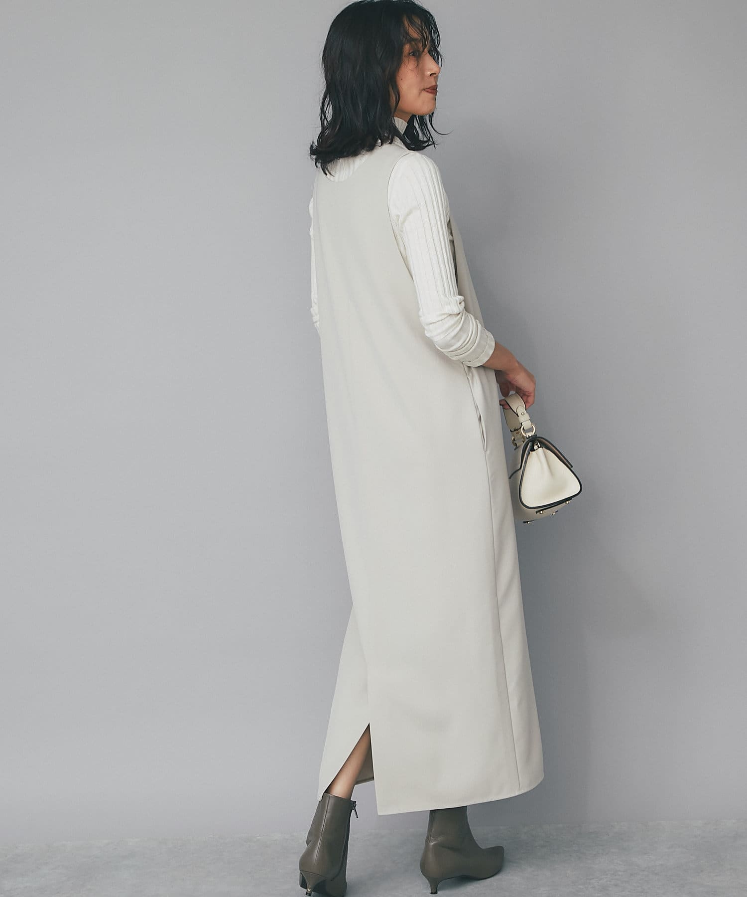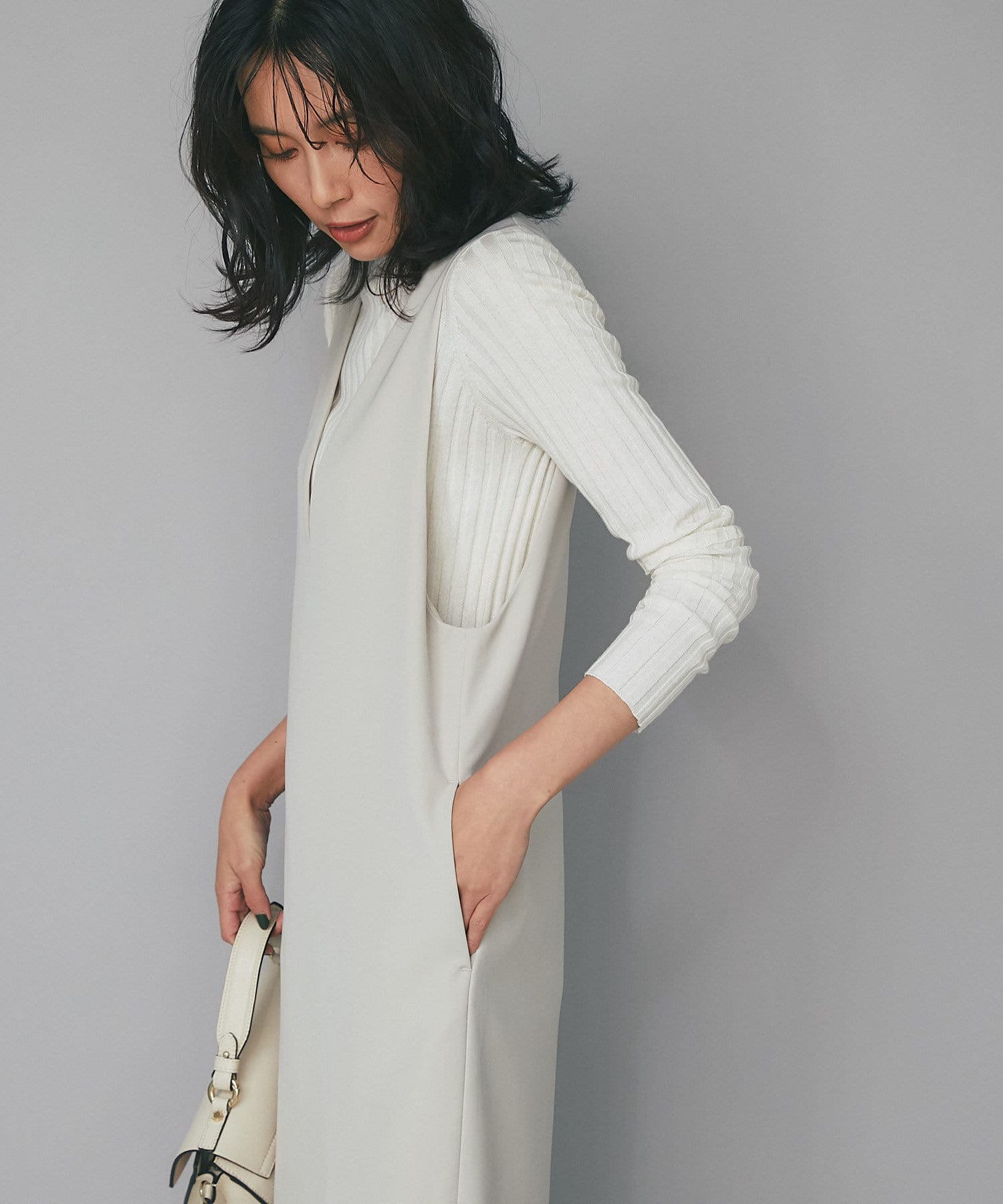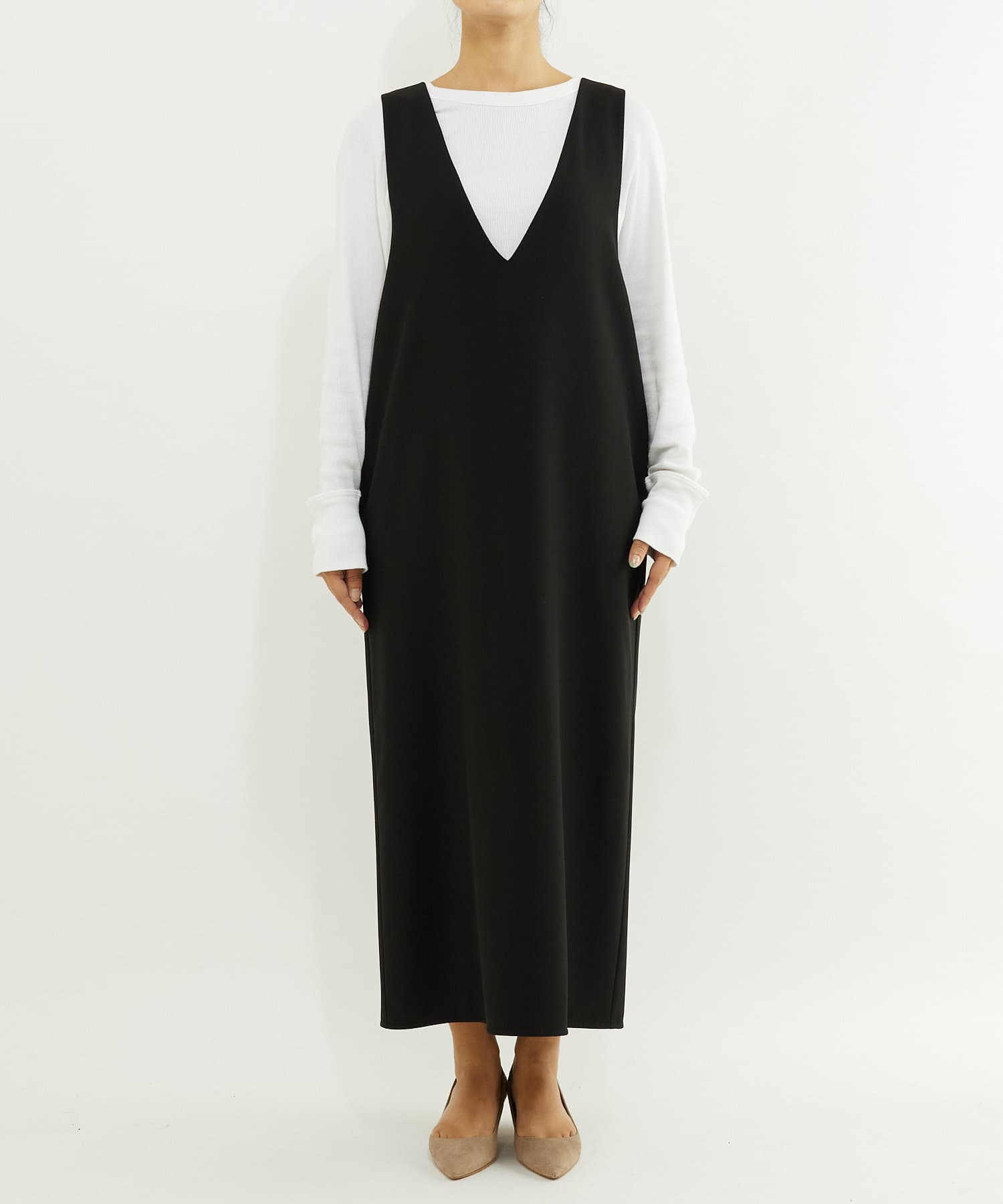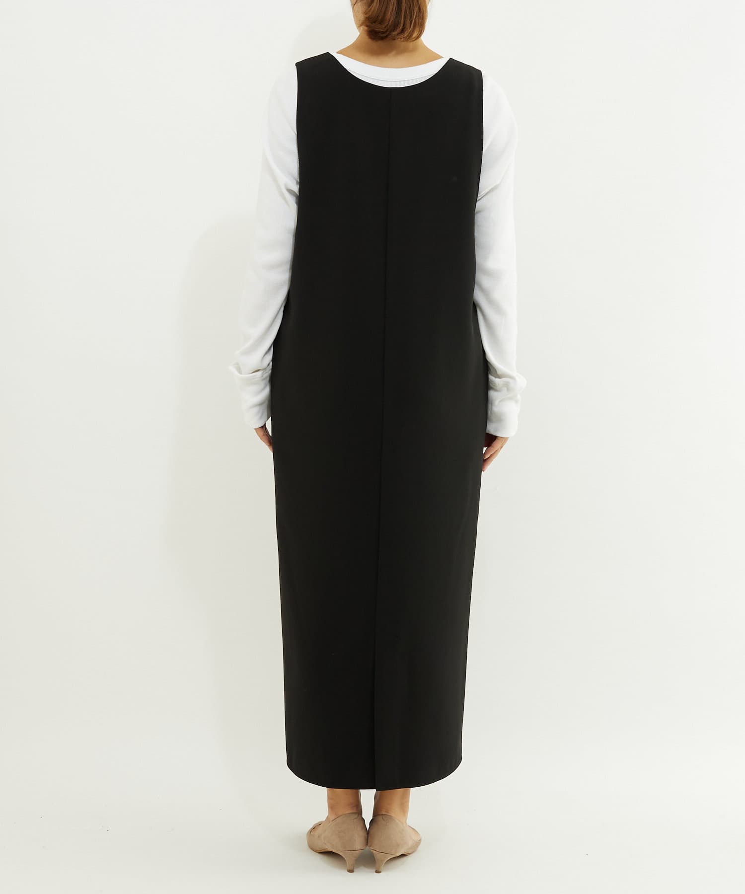 Iラインシルエットとシャープなネックラインのバランスがキレイなマキシ丈ワンピース。 ディープカットされたネックデザインが着こなしにモードなエッセンスをプラスしてくれる1着です。 膝下まで切れ込んだバックスリットで足捌きもよく、後姿に女性らしい抜け感をプラスしました。 スリット上までの裏地付きで滑りもよく、さらっと軽い着心地。 ご自宅で手洗いしていただけるシーズンレスで重宝するアイテムです。