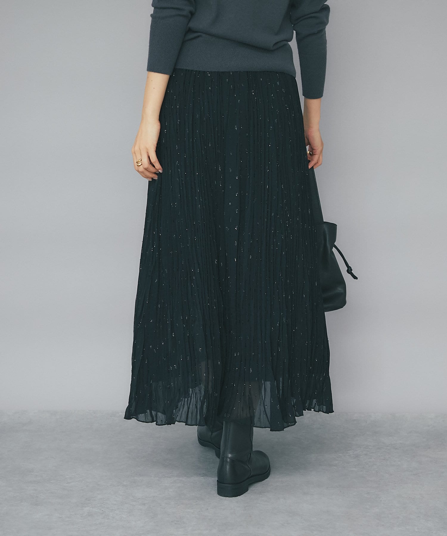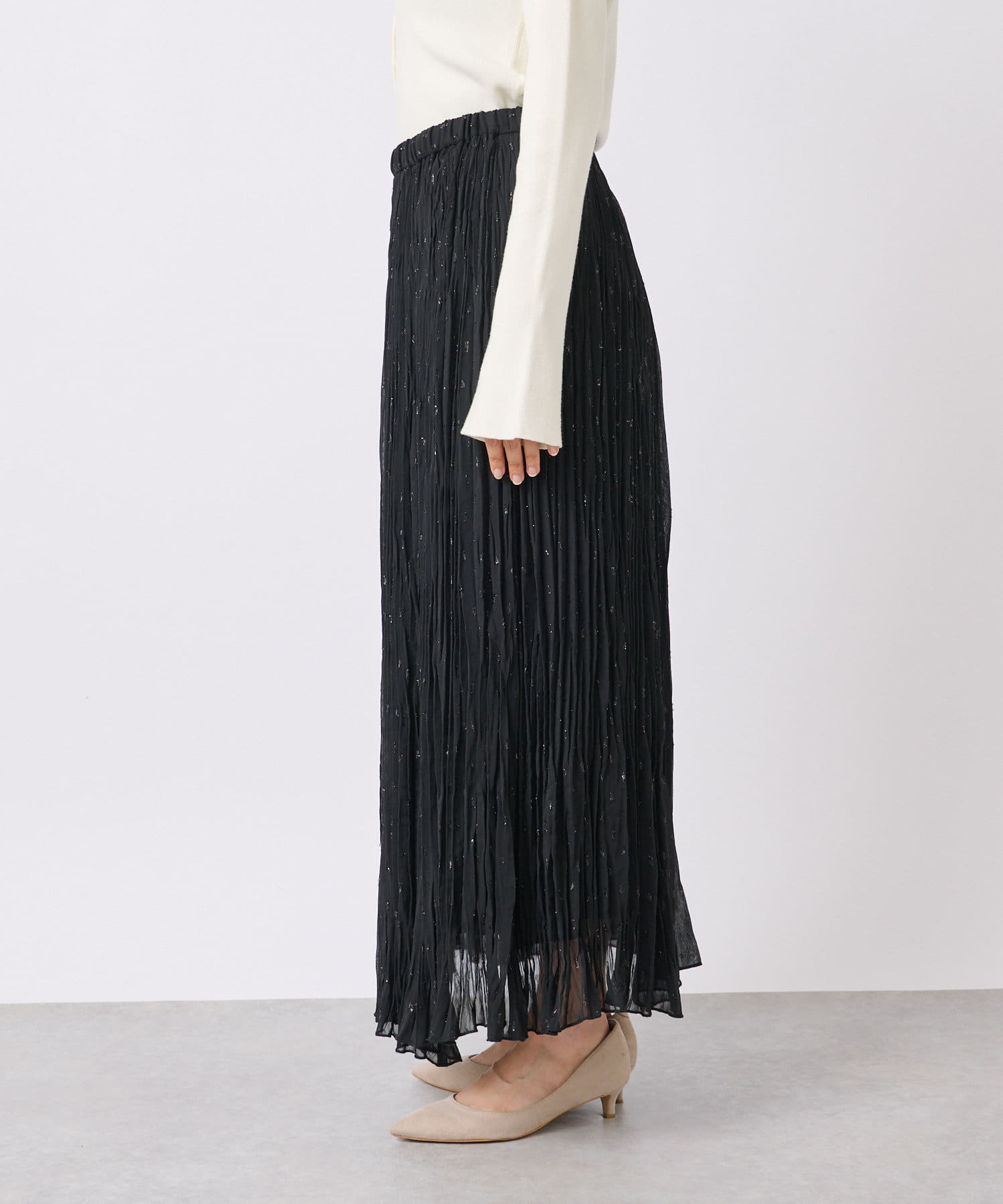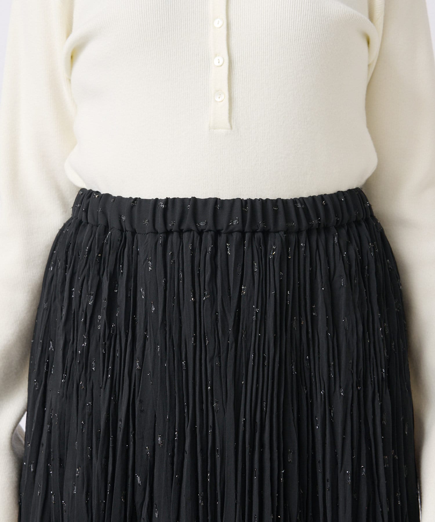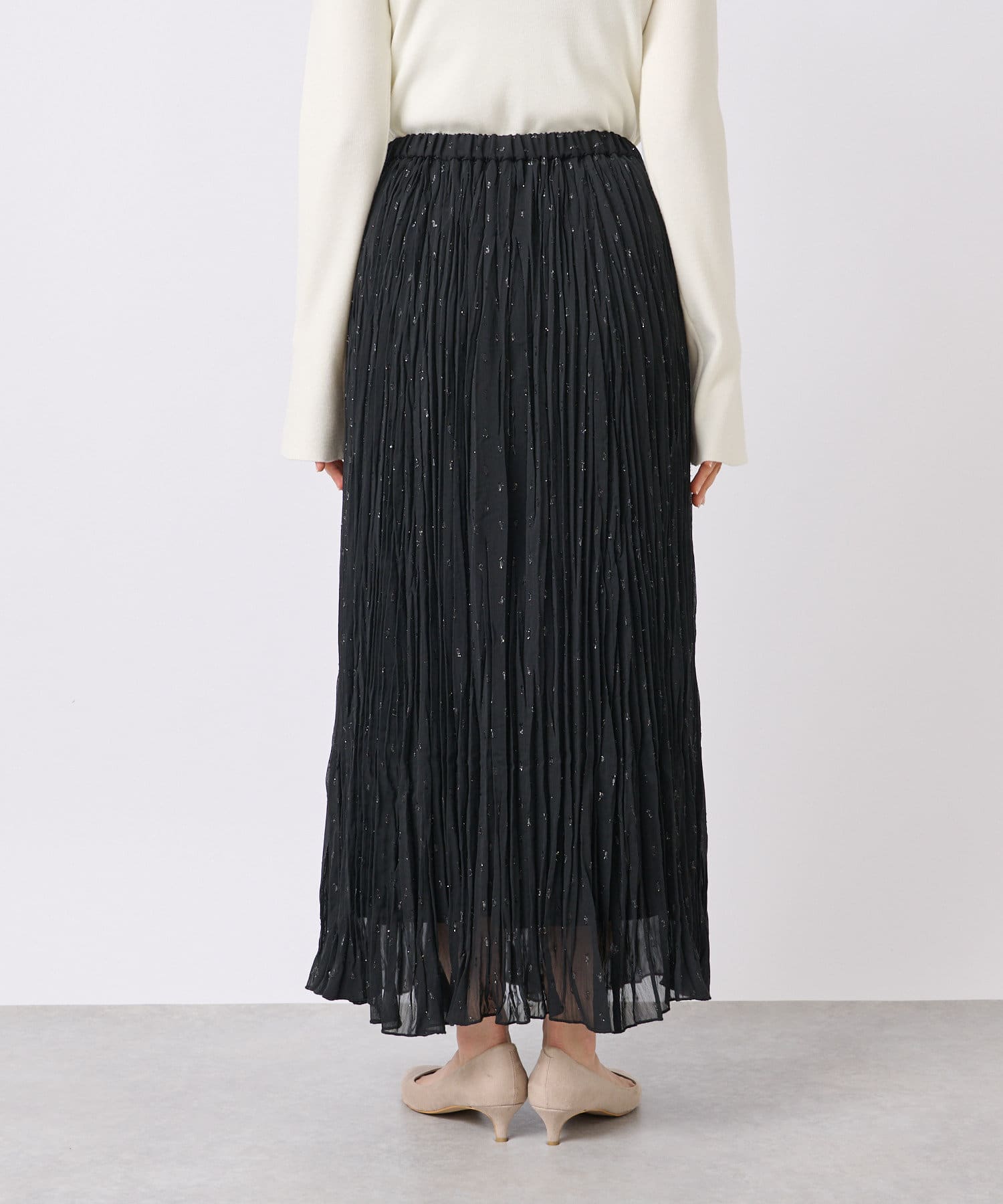 キラキラ輝くラメ糸が織り込まれた着映えスカート。                                                                                                        シアー素材全体にワッシャープリーツを施したリラックスムードと華やかさを兼ねたデザインで、幅広いスタイルにマッチする1枚です。