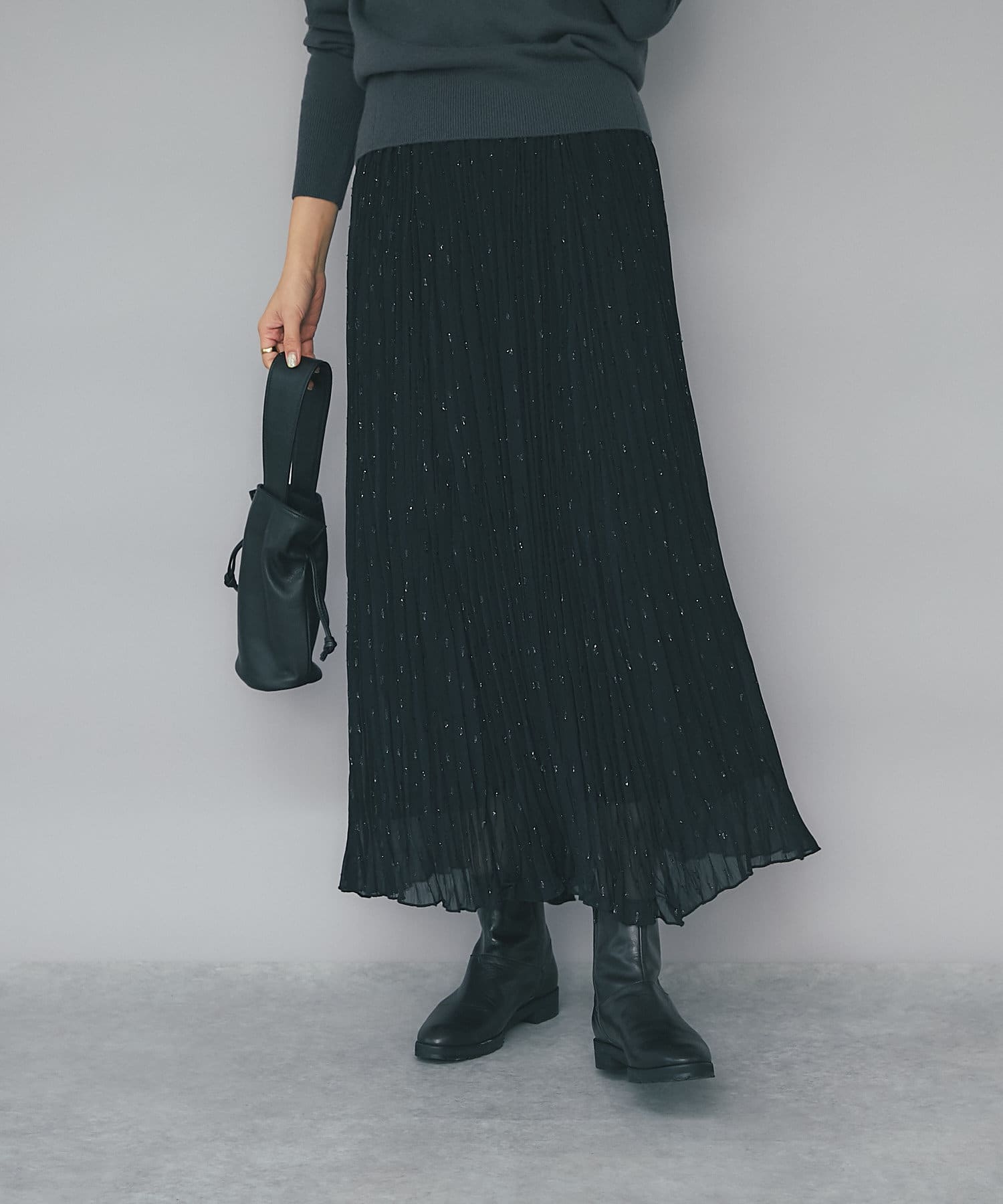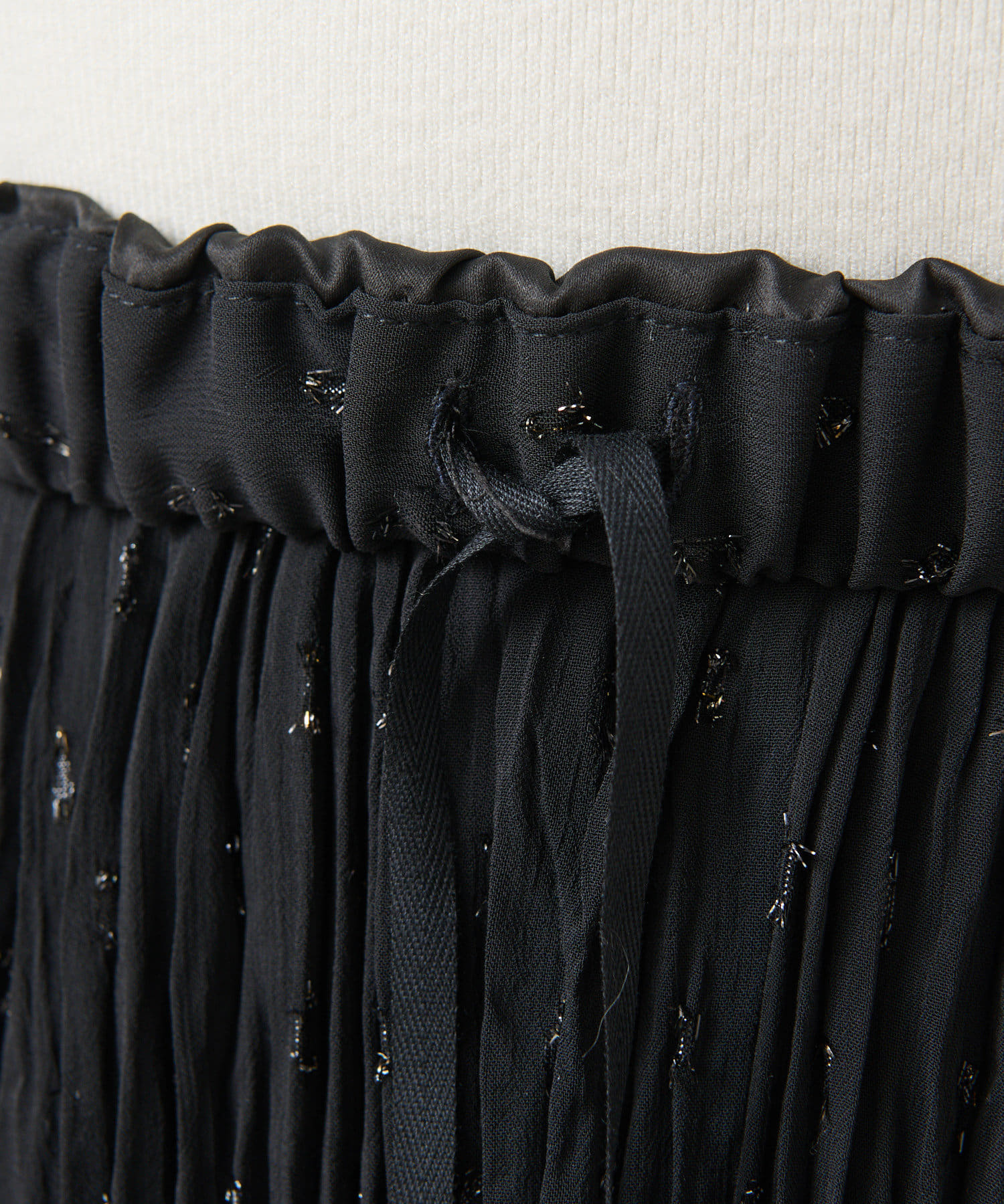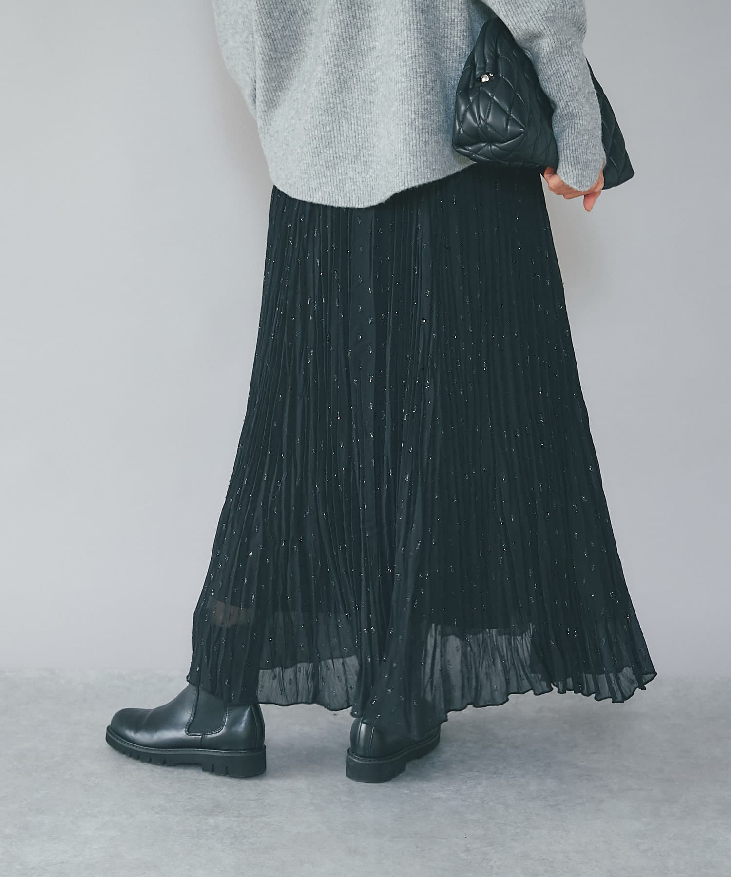 キラキラ輝くラメ糸が織り込まれた着映えスカート。                                                                                                        シアー素材全体にワッシャープリーツを施したリラックスムードと華やかさを兼ねたデザインで、幅広いスタイルにマッチする1枚です。